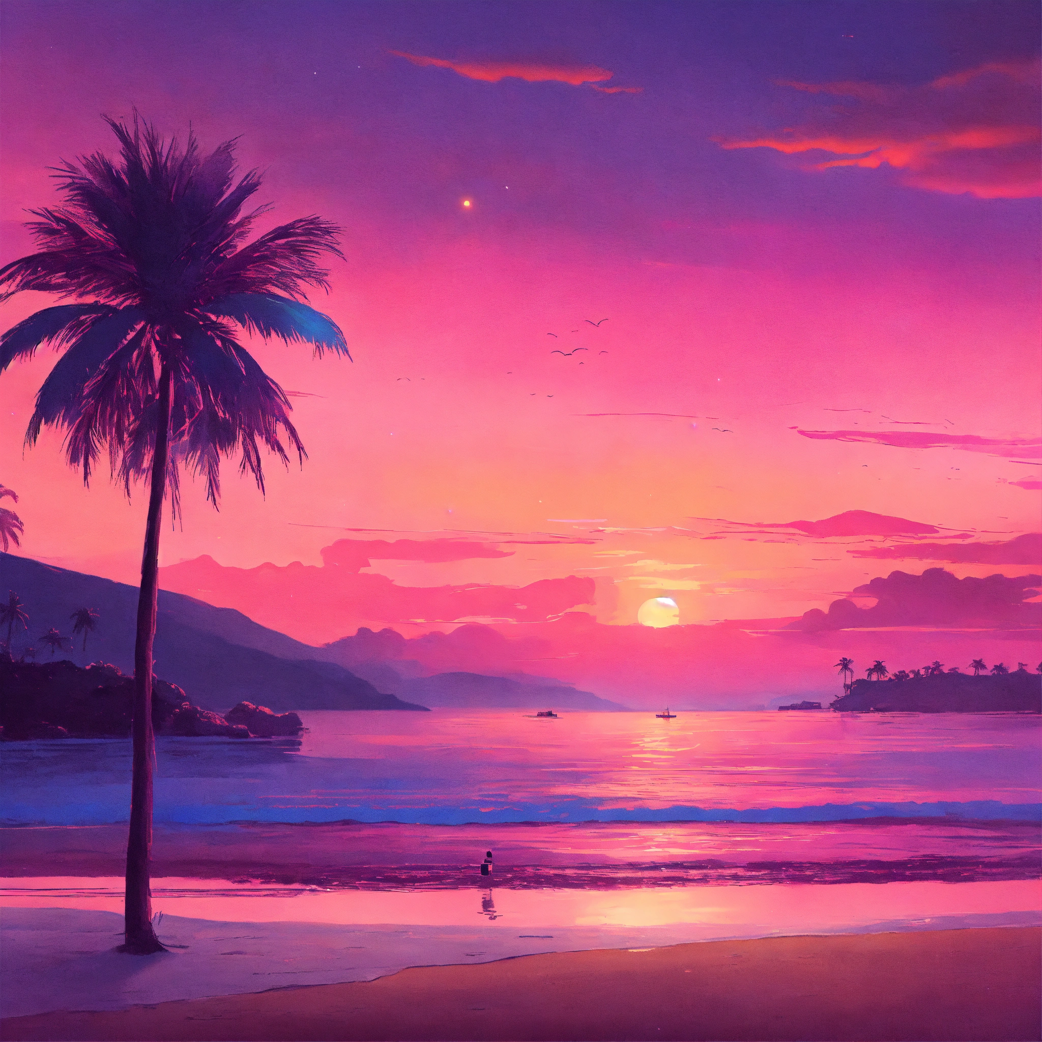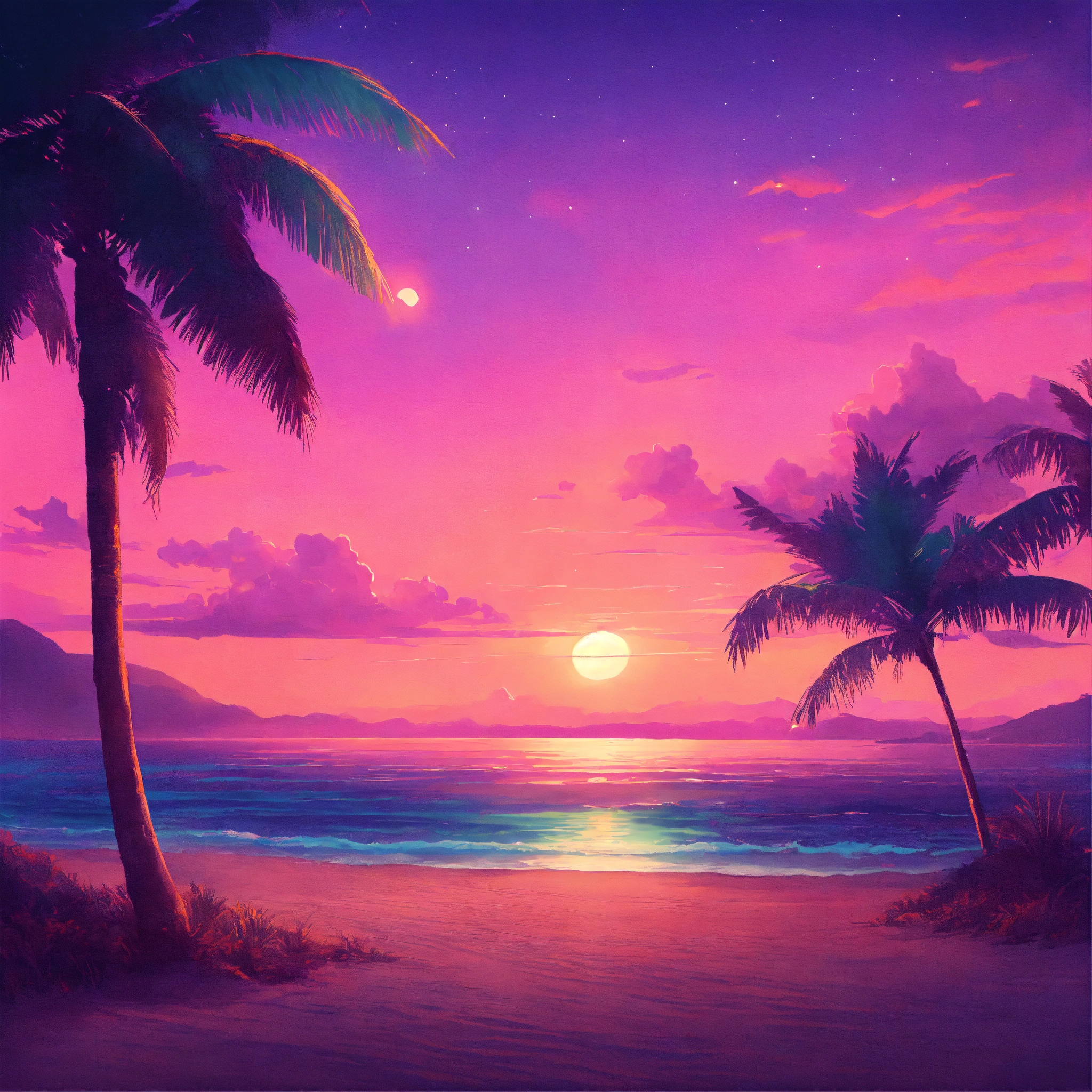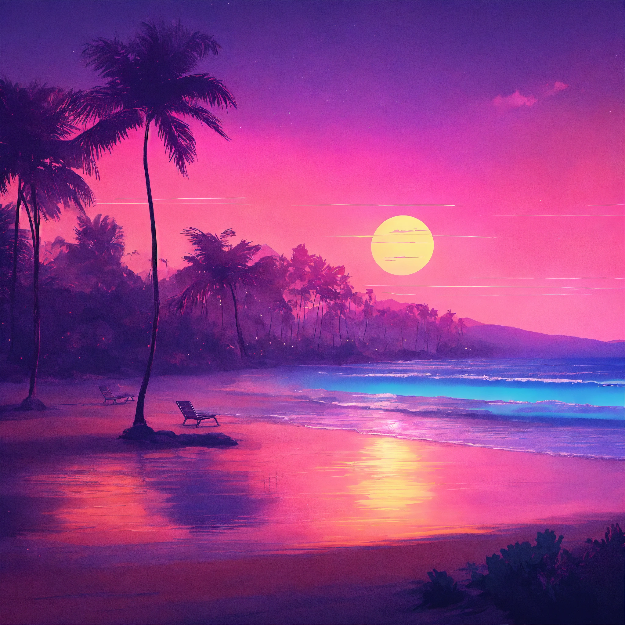 Create an artwork showcasing a serene beach at twilight. the sky should be filled with soft pastel hues, and there should be subtle neon glows, hinting at the blend of ambient and synthwave music.
