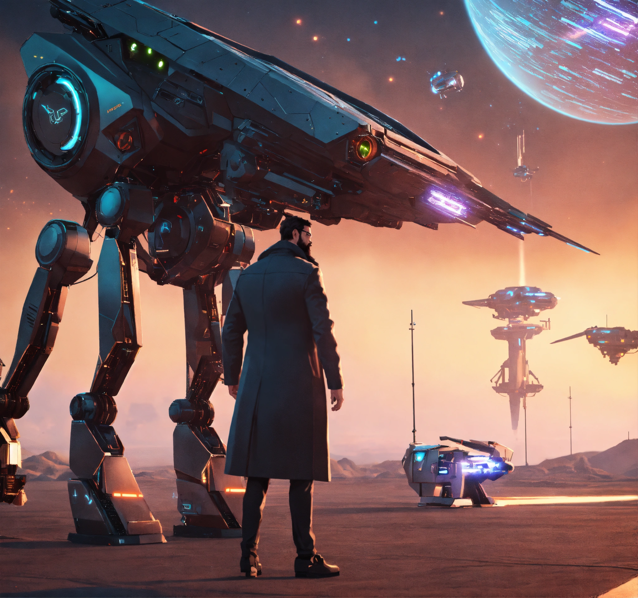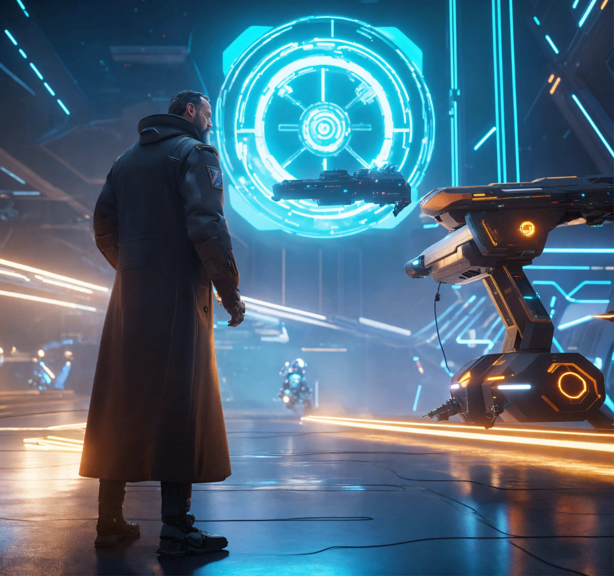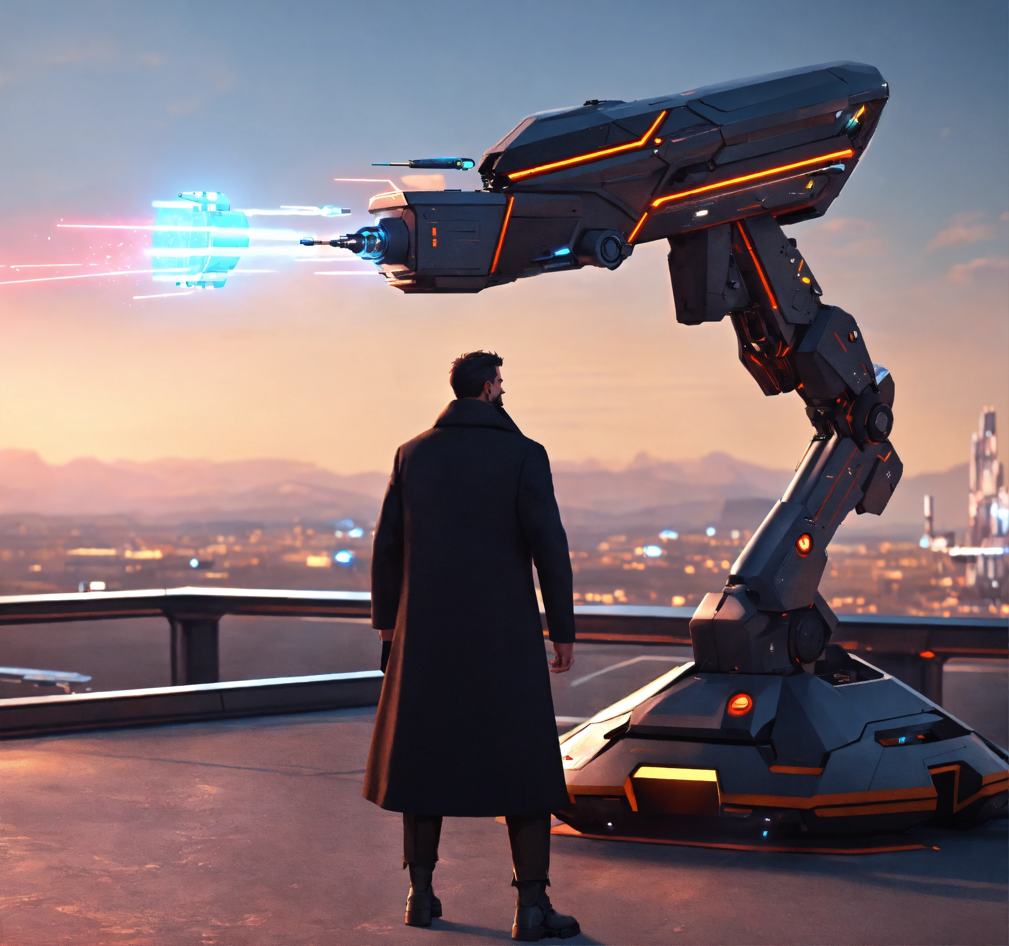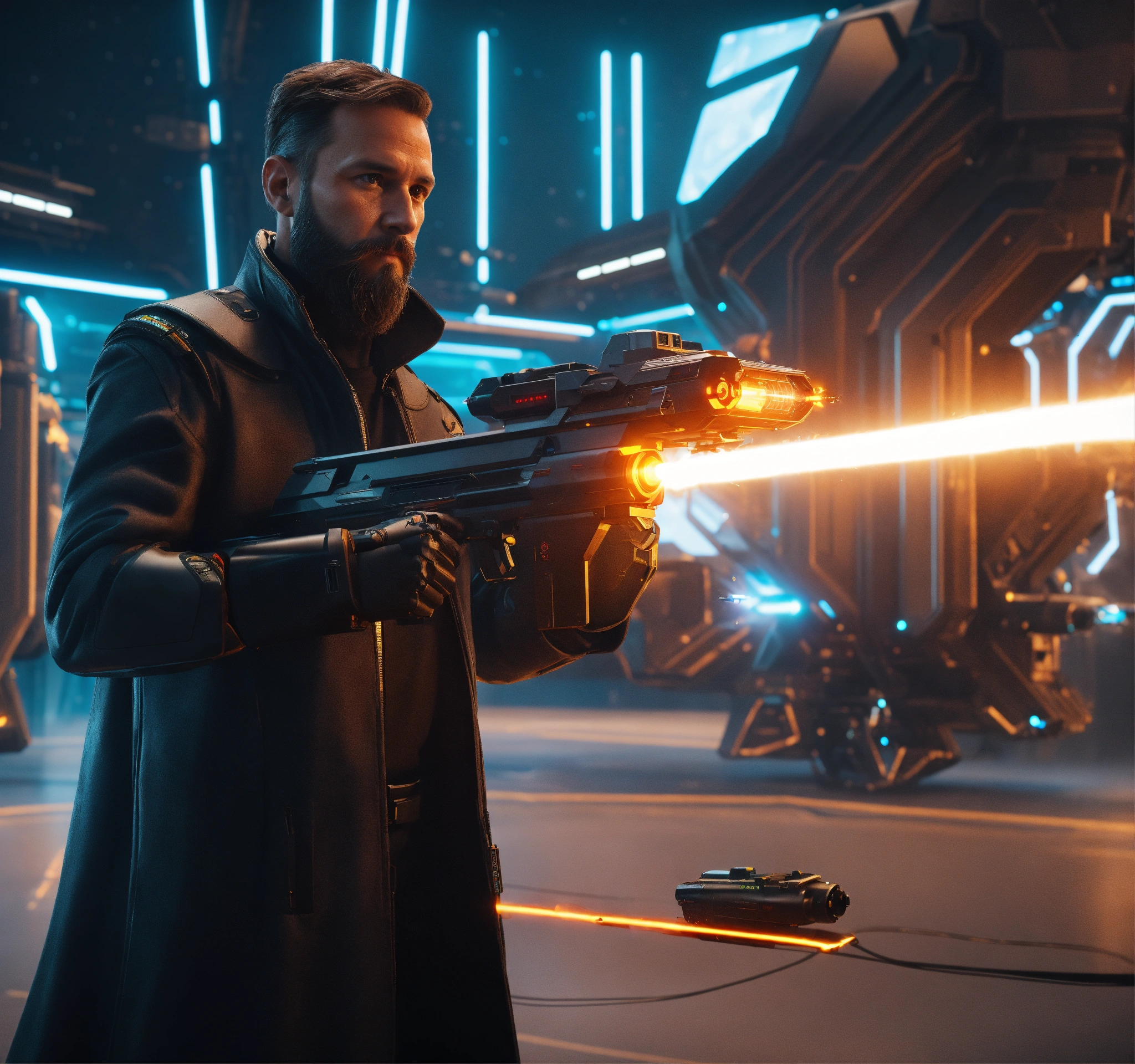 A 45 year old masculine man with trim beard in futuristic long coat shoots a sleek pulse frequency energy gun at a small flying black robotic patrol bot with claws at a space port, realistic, futuristic, sci-fi, 8k, unreal engine, pixar