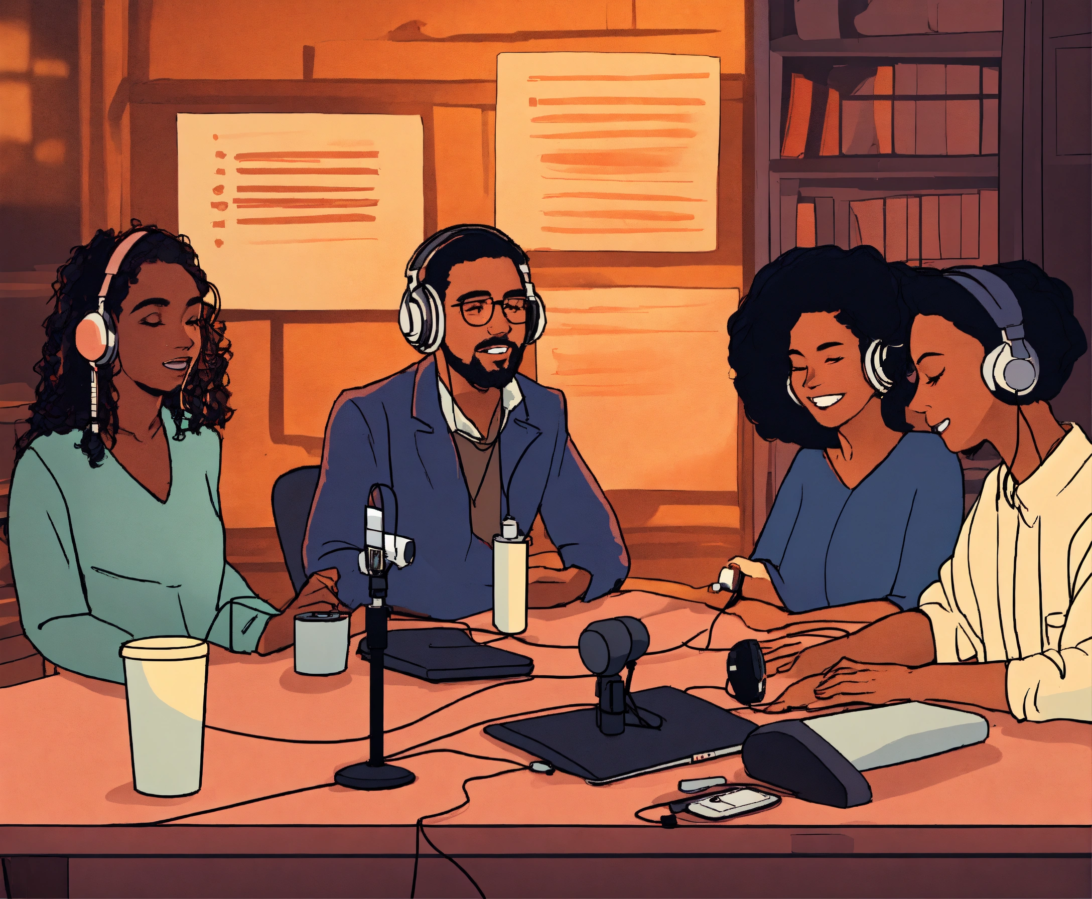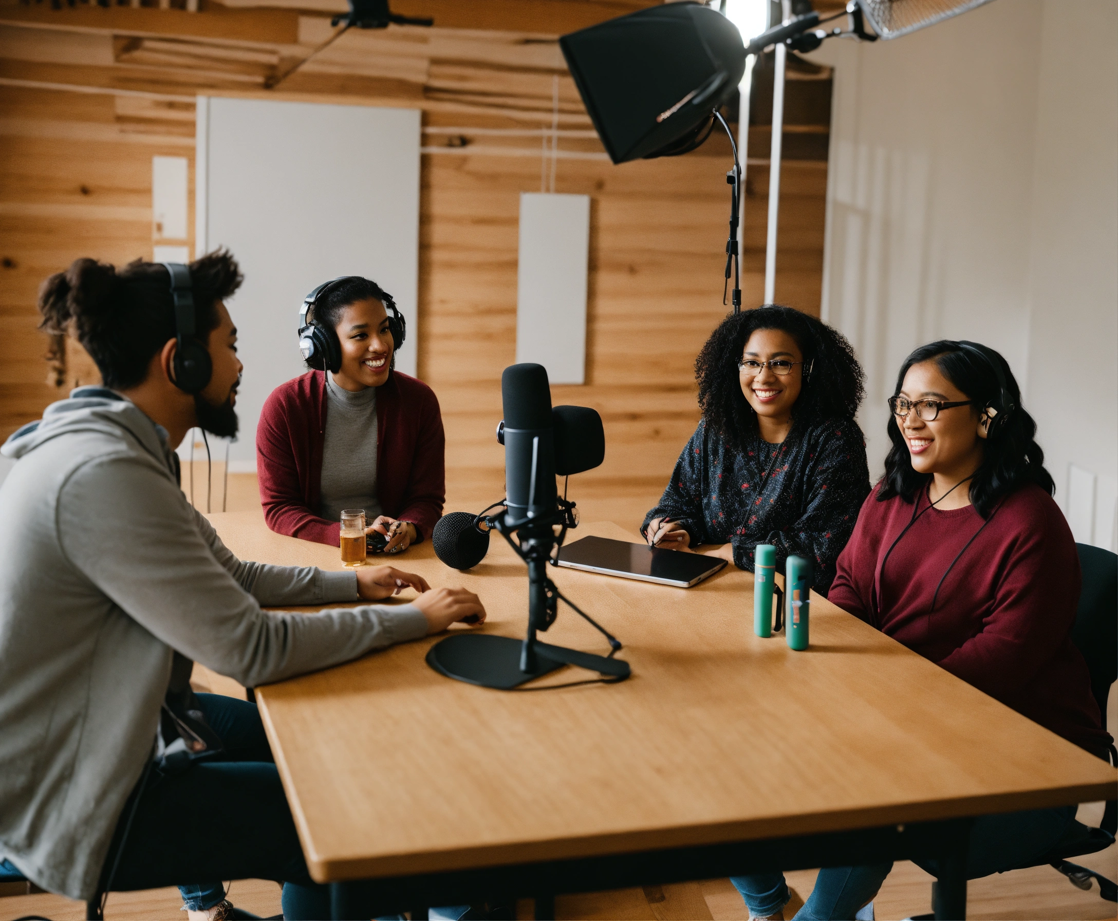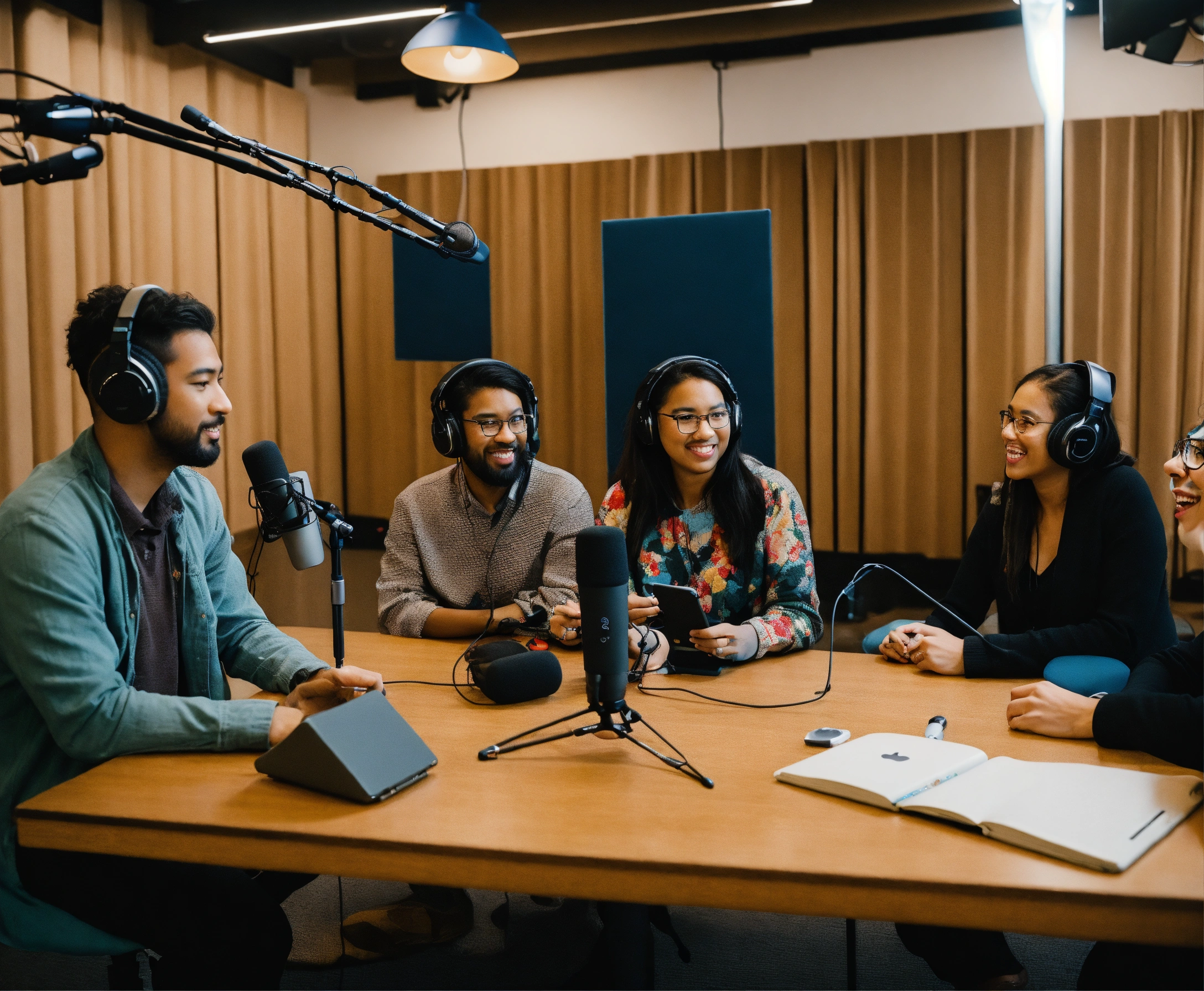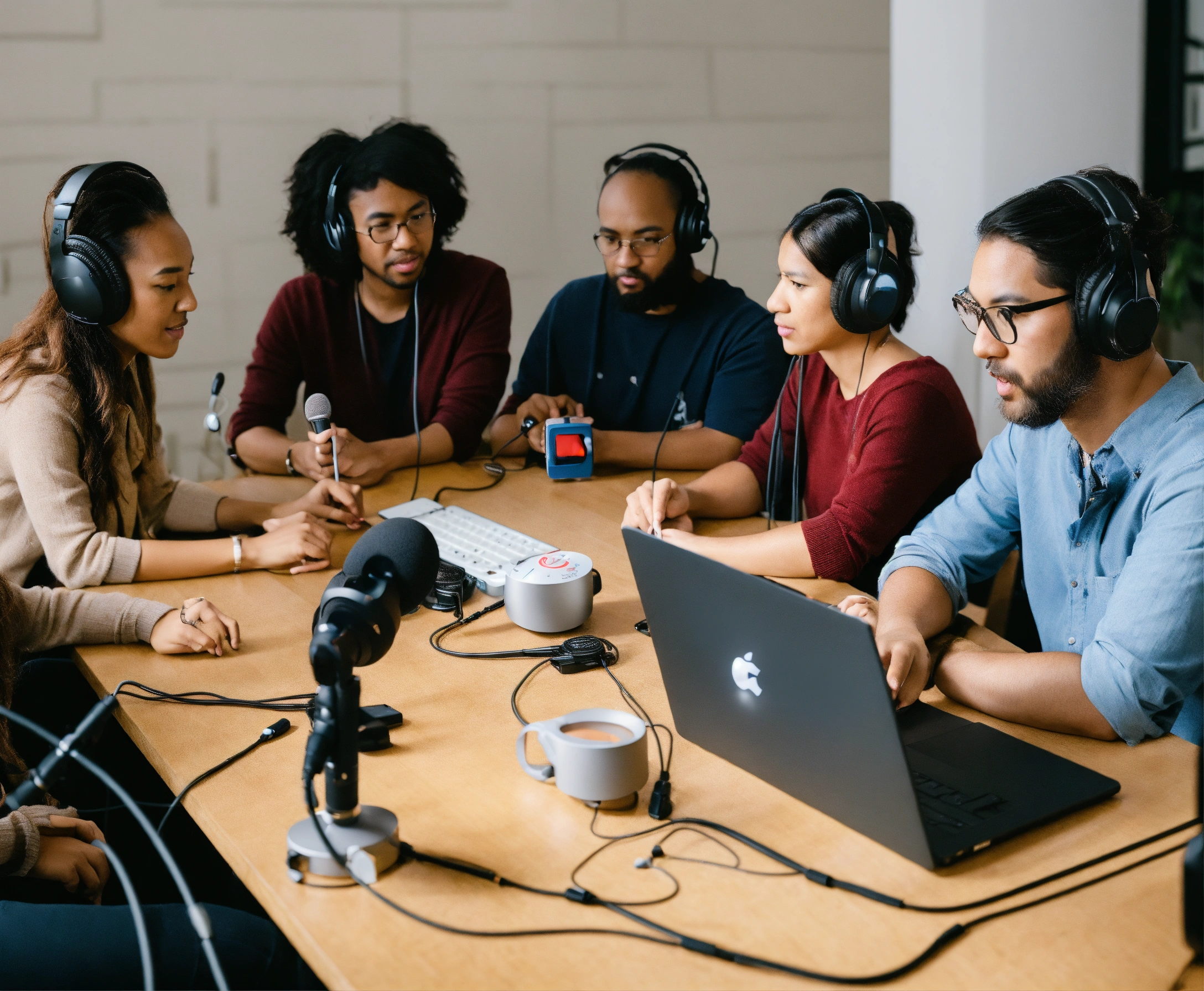 A group of people with different ethnic background making a podcast, with podcasting equipmemt on a table, with two teachers