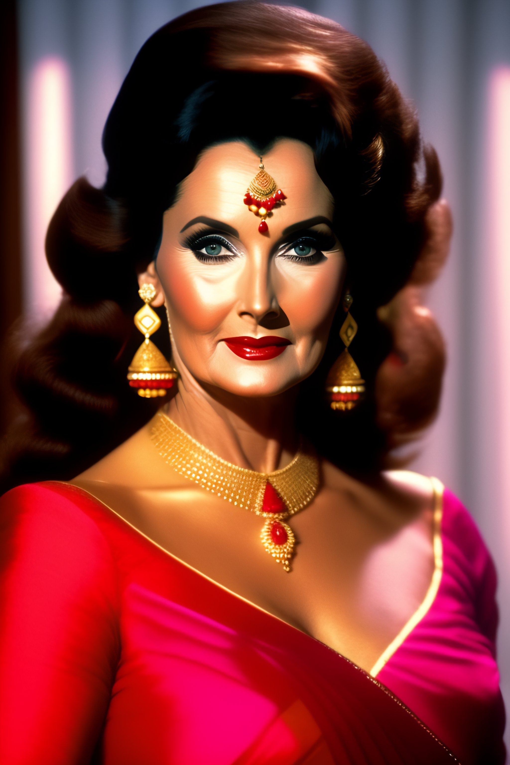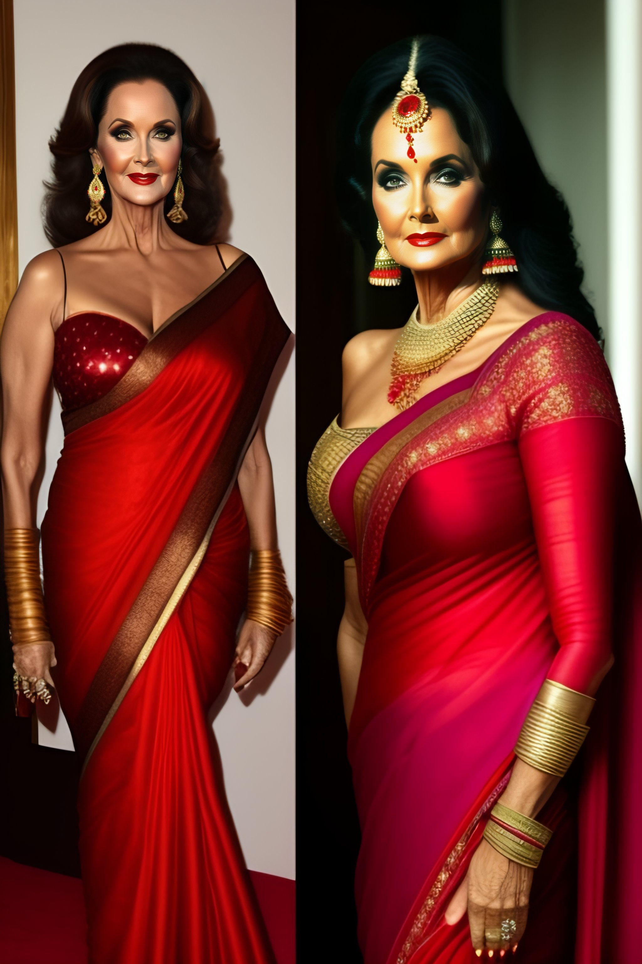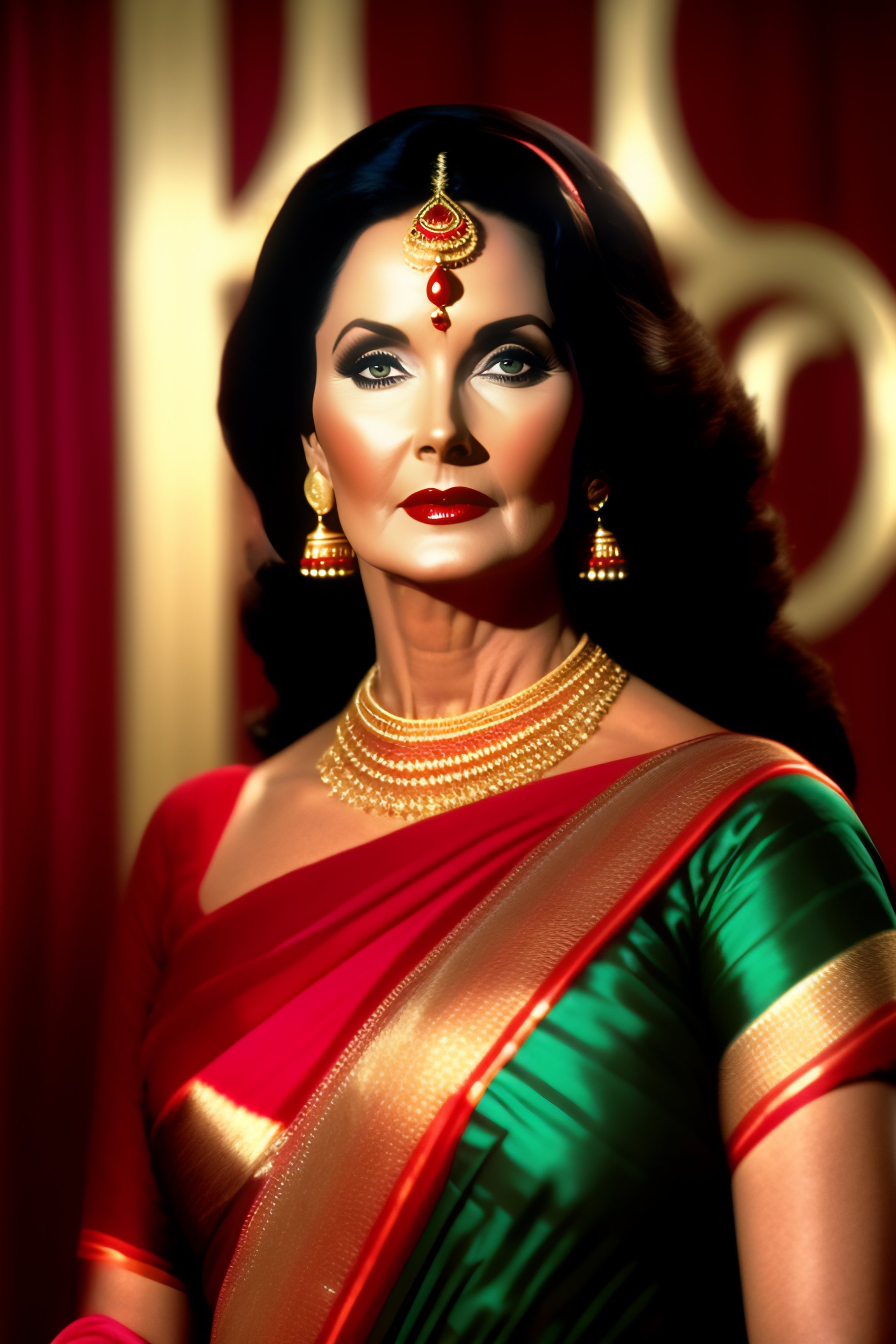Lynda carter, wearing saree, navel and abs visible, very tall, hour glass waist, red lipstick, wearing jewellery, serious face