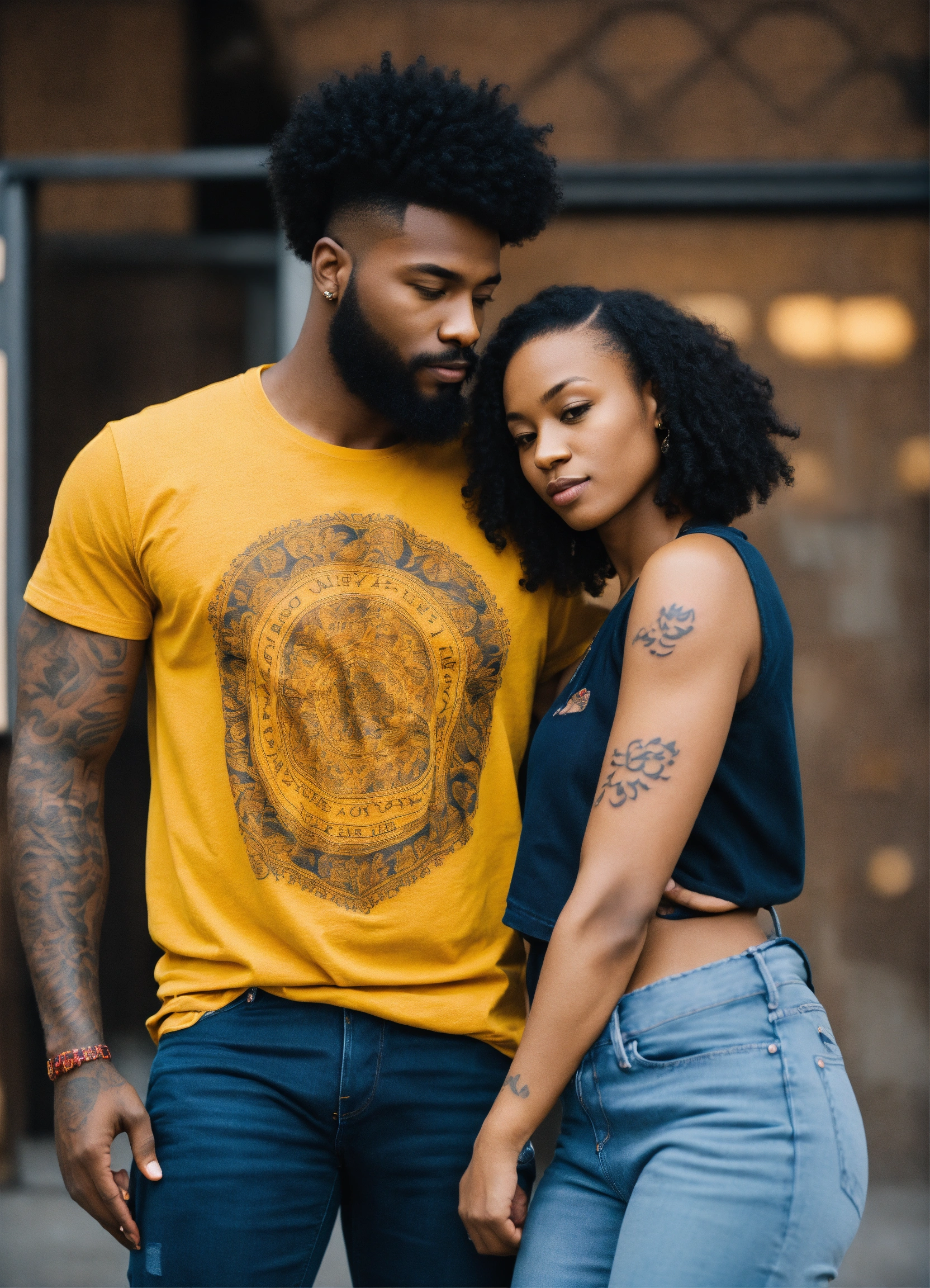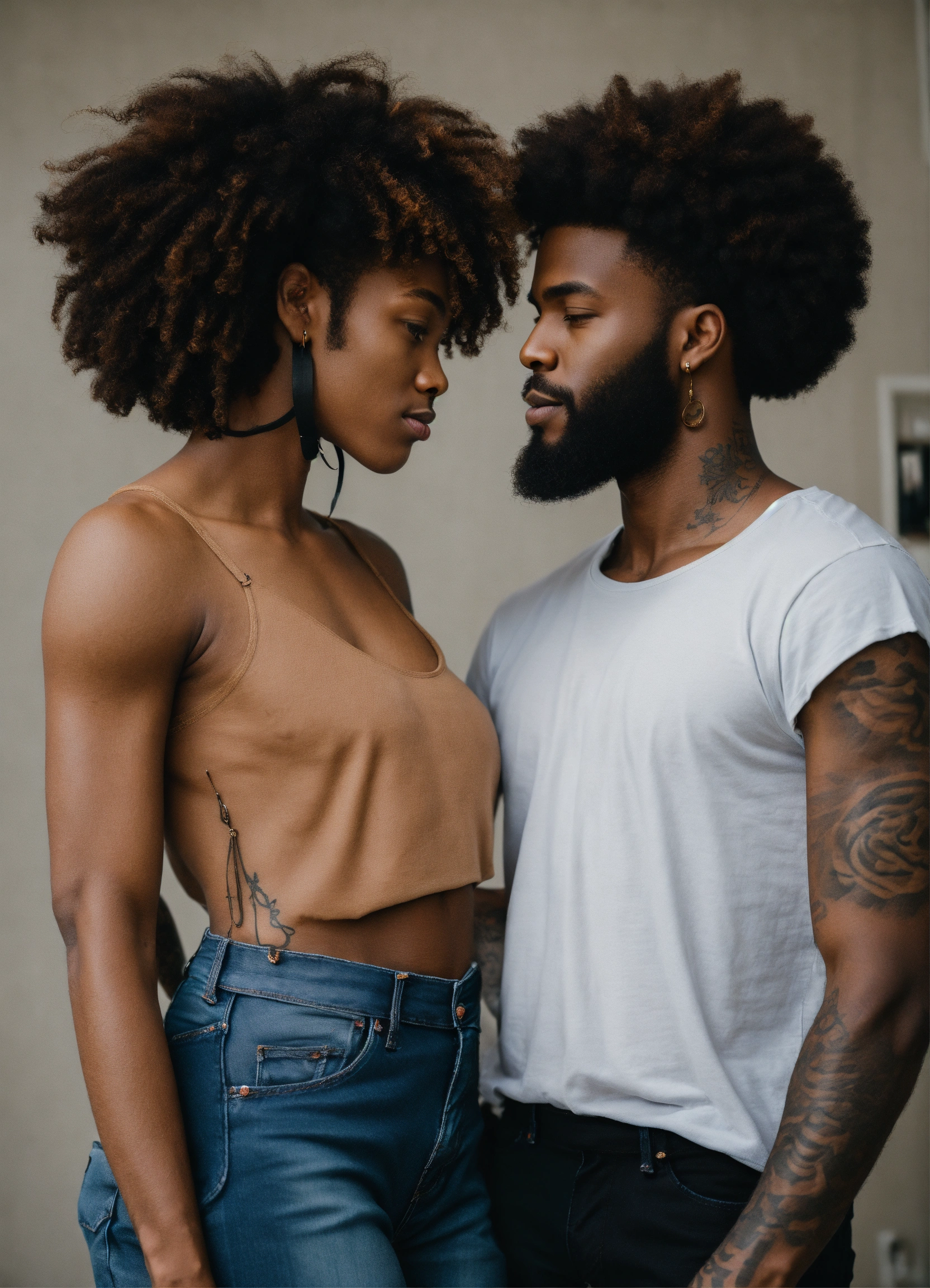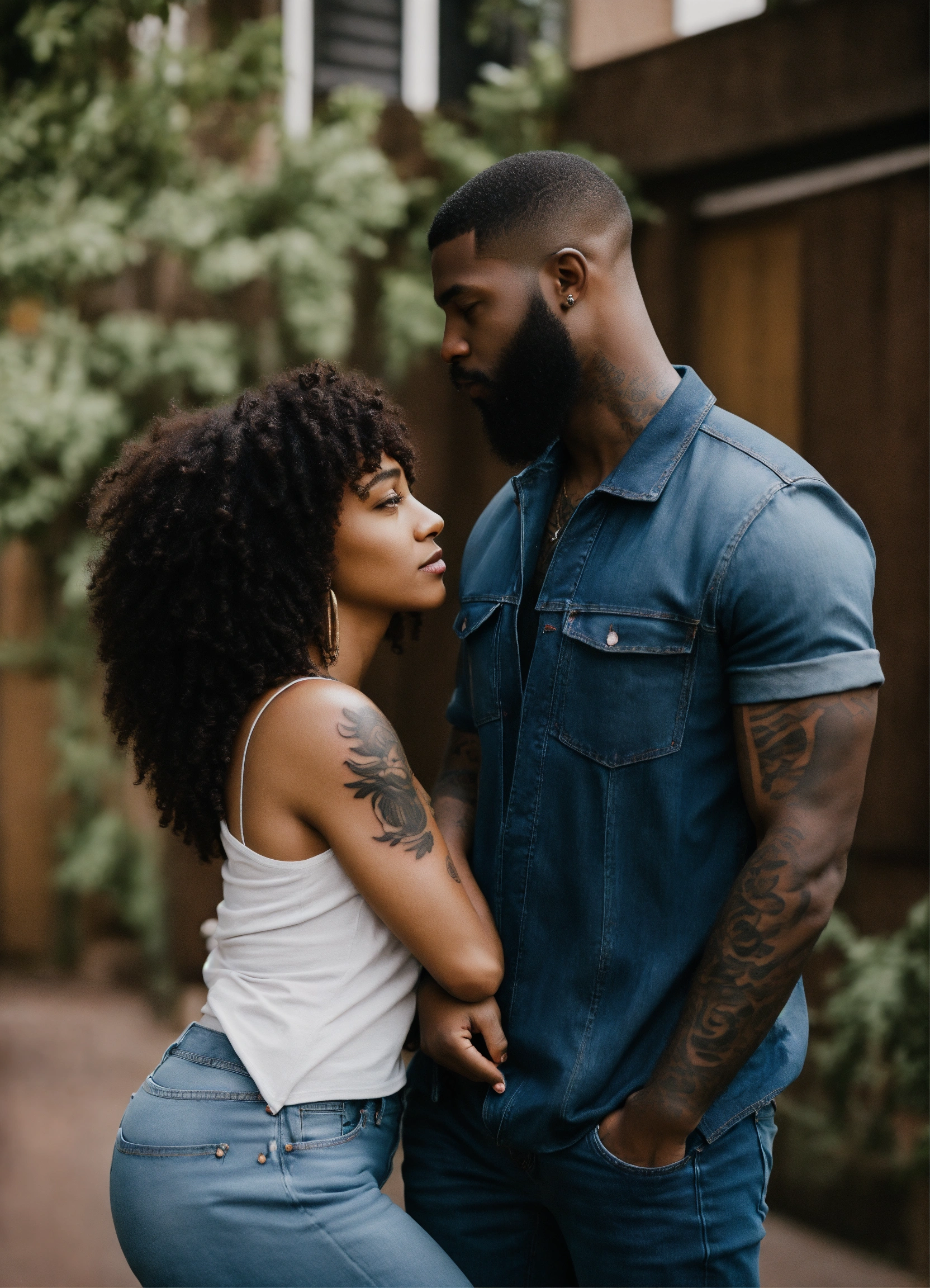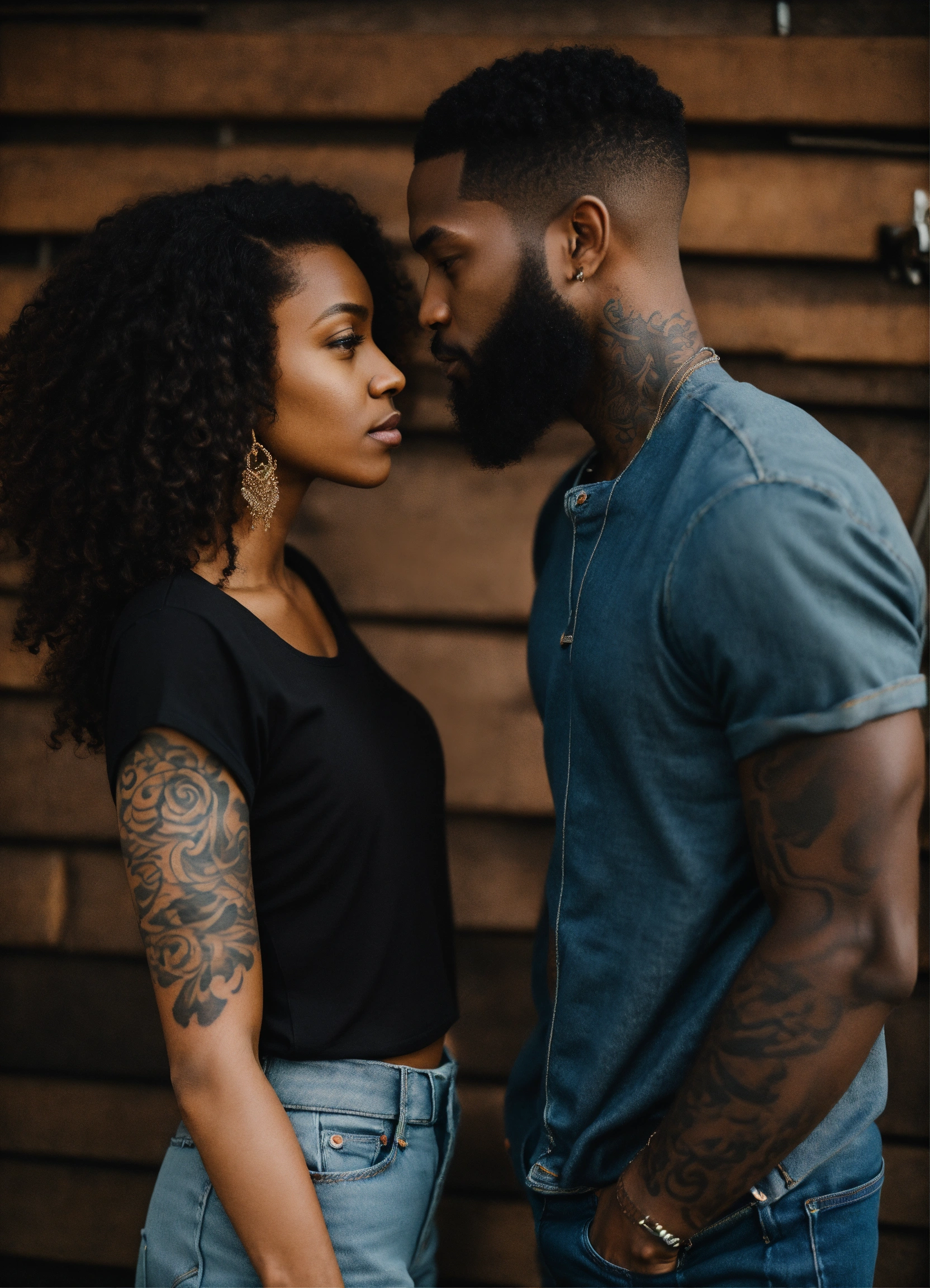 Black couple staring at each other, male handsome, dark skin, tattoo, beard, low hair, jeans and tee, female natural curly hair, jeans and tee no tattoos