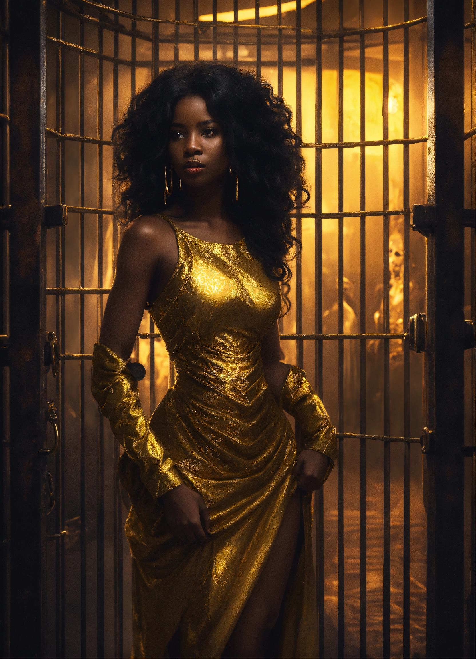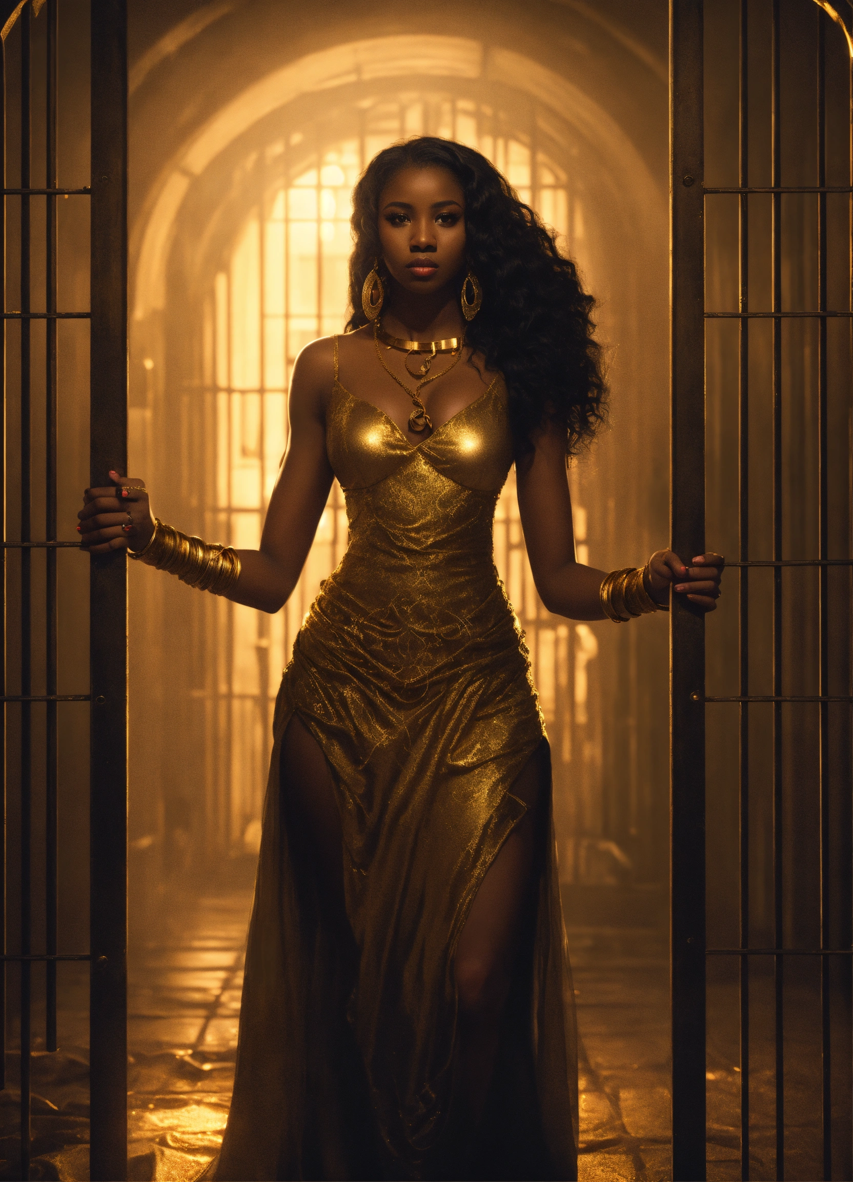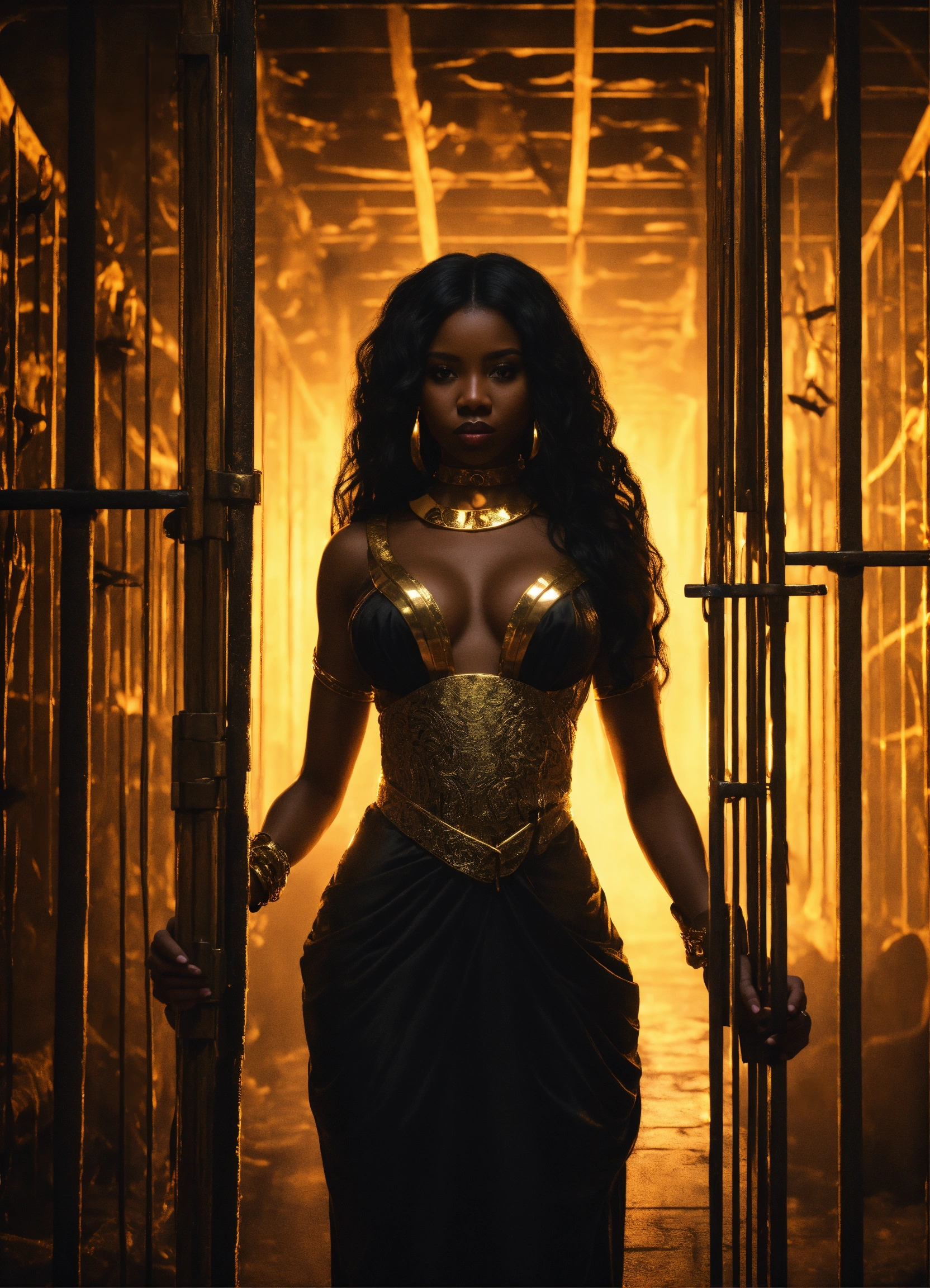Handcuffed, a beautiful black girl goddess, a beautiful prisoner with long dark hair wearing a gold dress, held captive in a spooky dark cell with monstrous guards in the backgroundl, resolution 8k, insanely detailed
