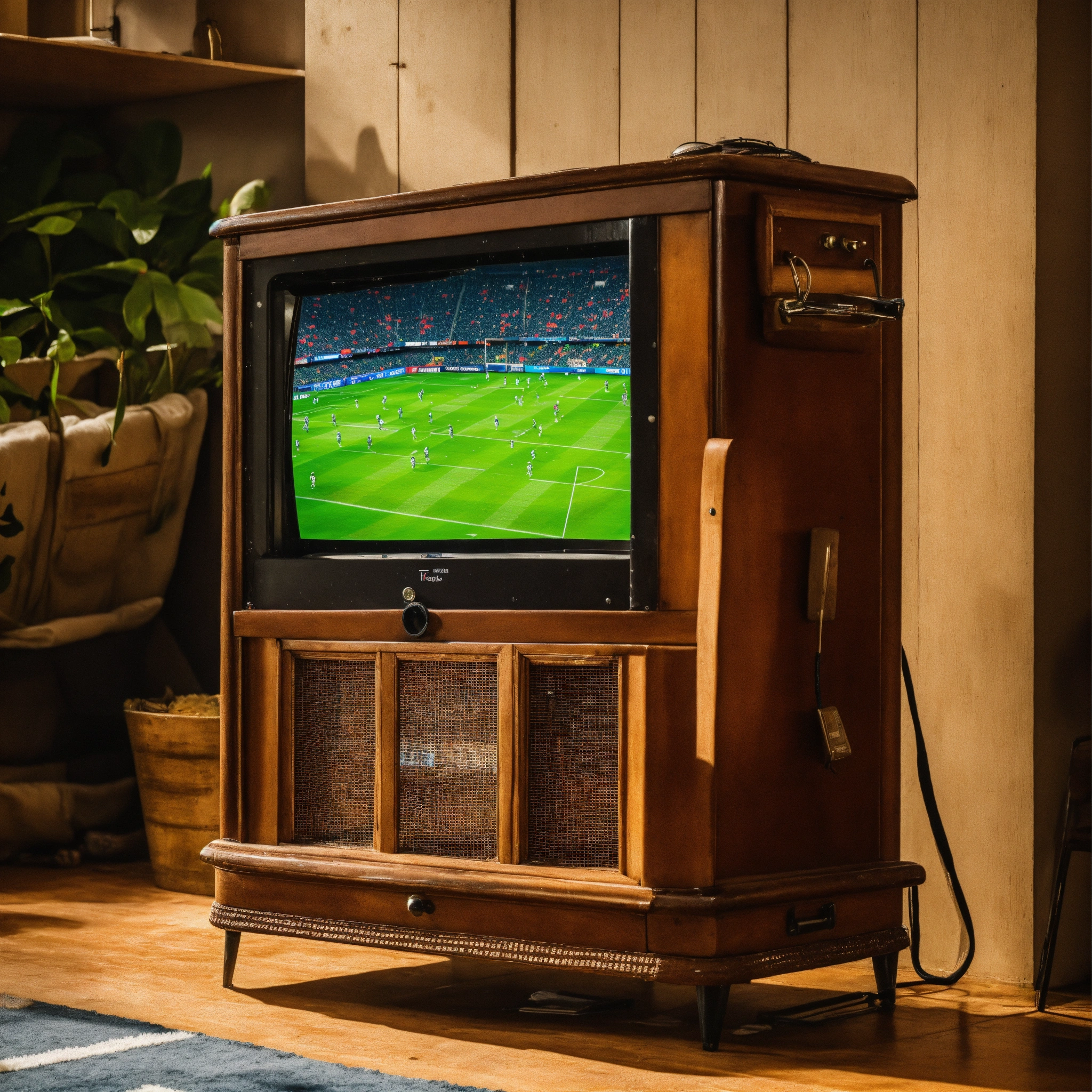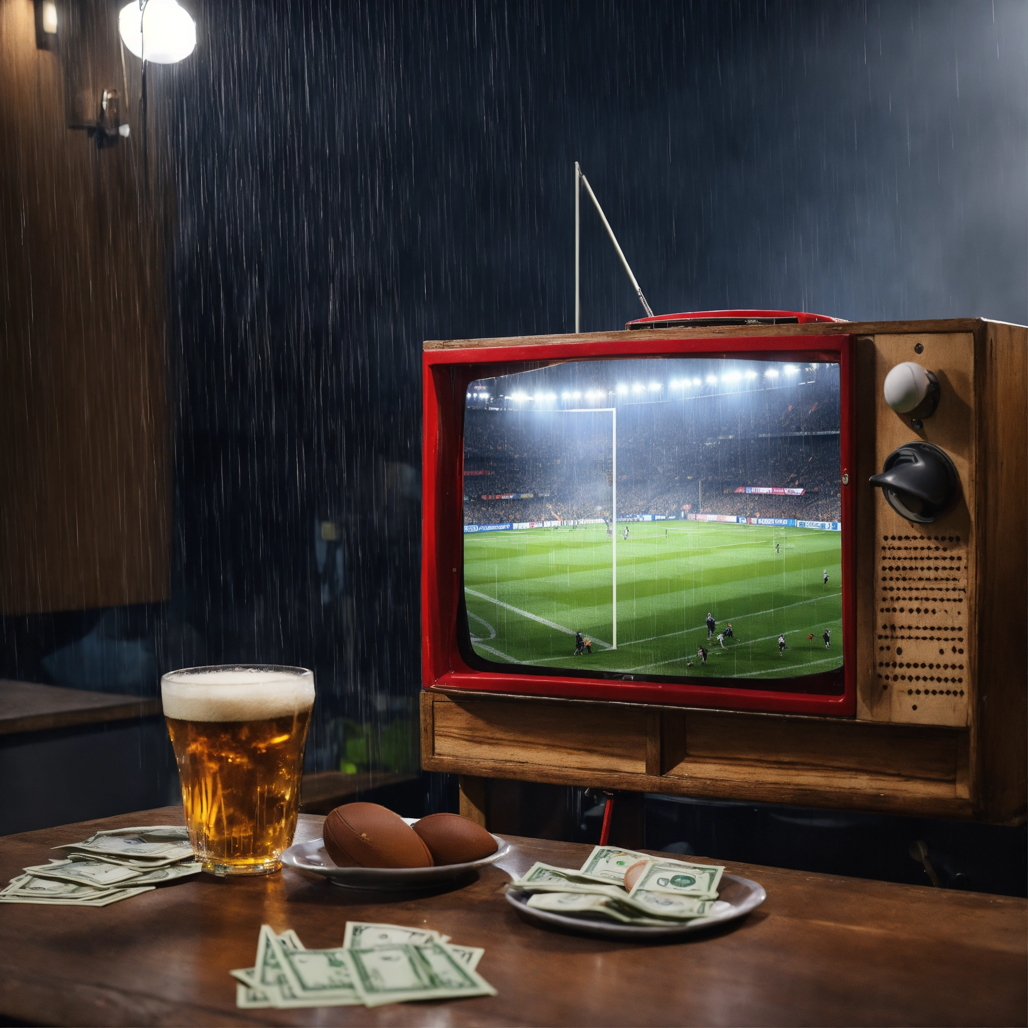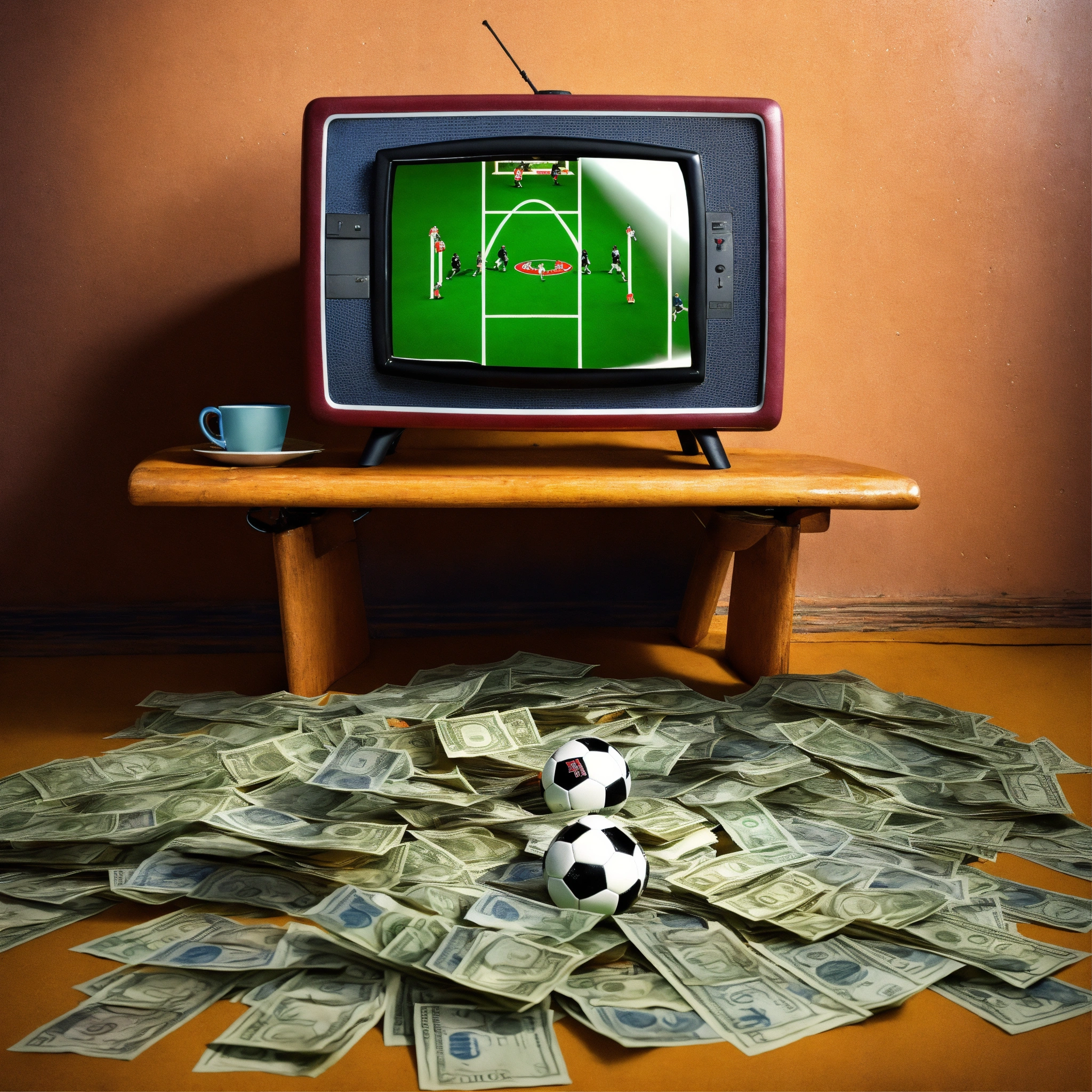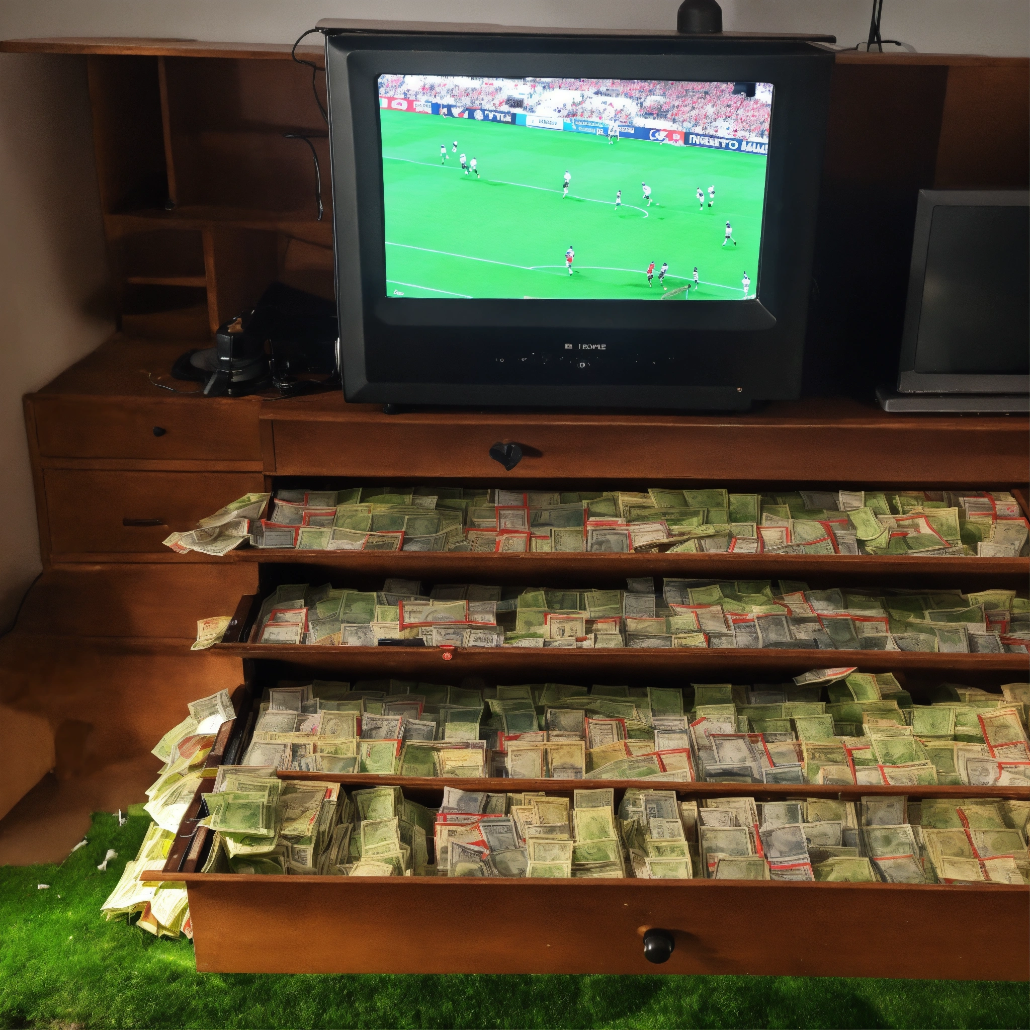 Télévision en forme de coffre-fort qui diffuse un match de football, une pluie de billets tout autour