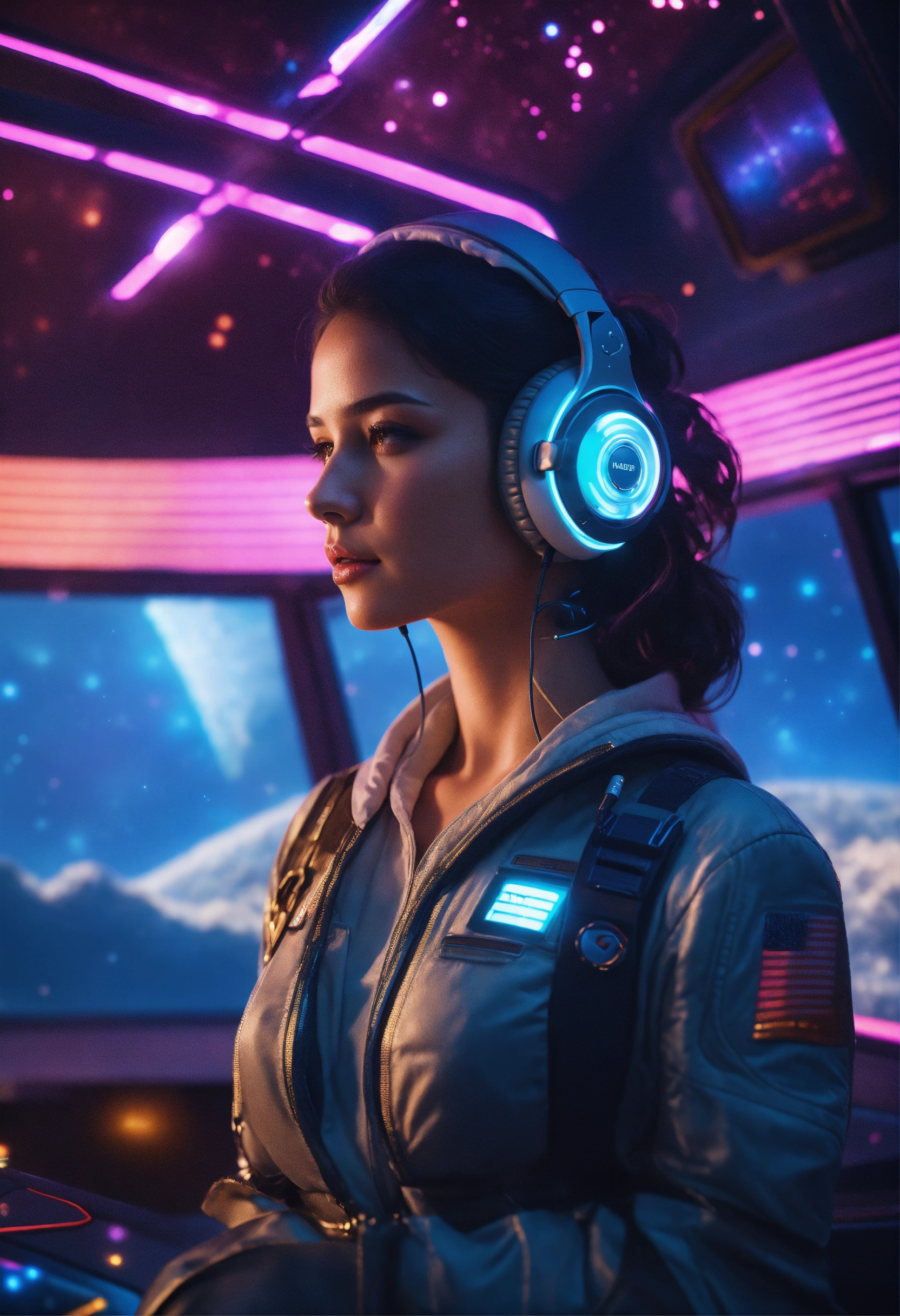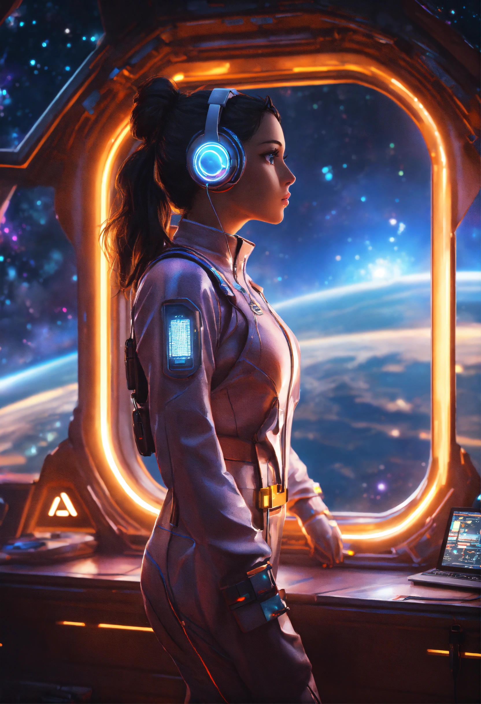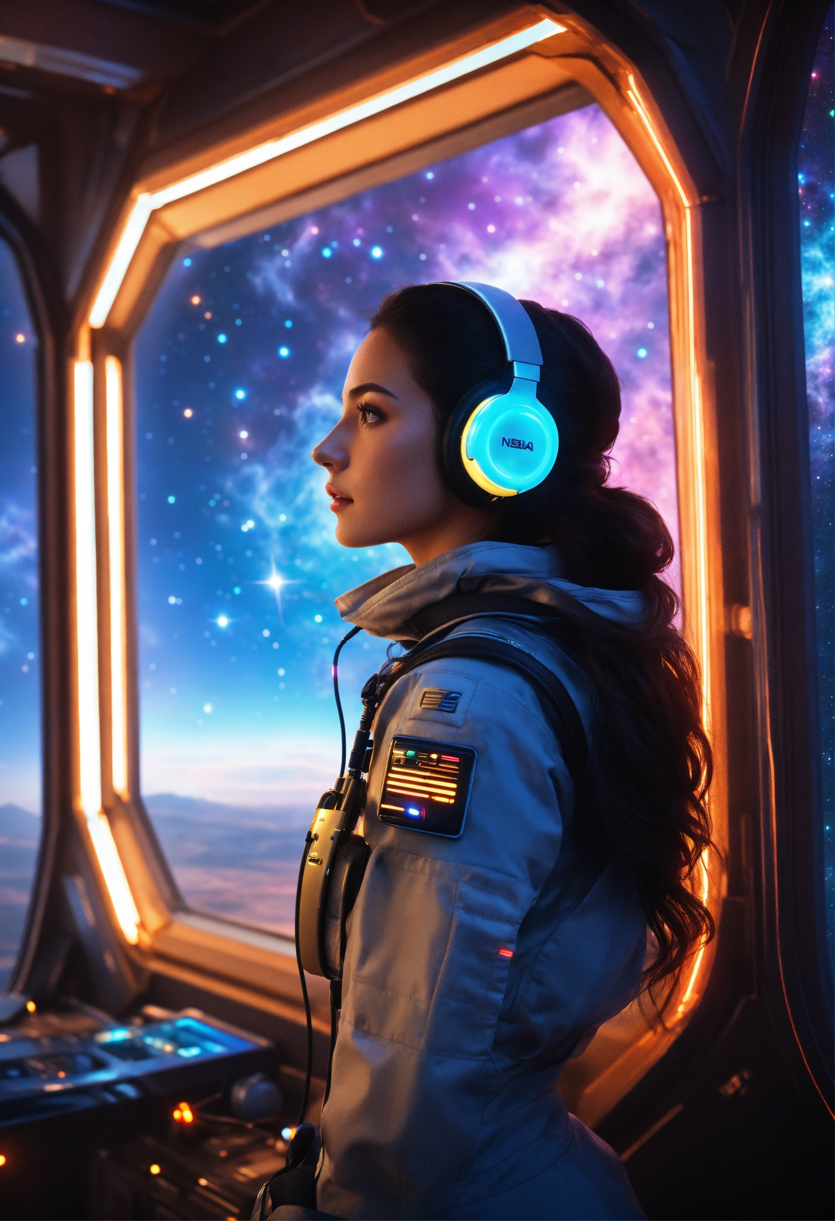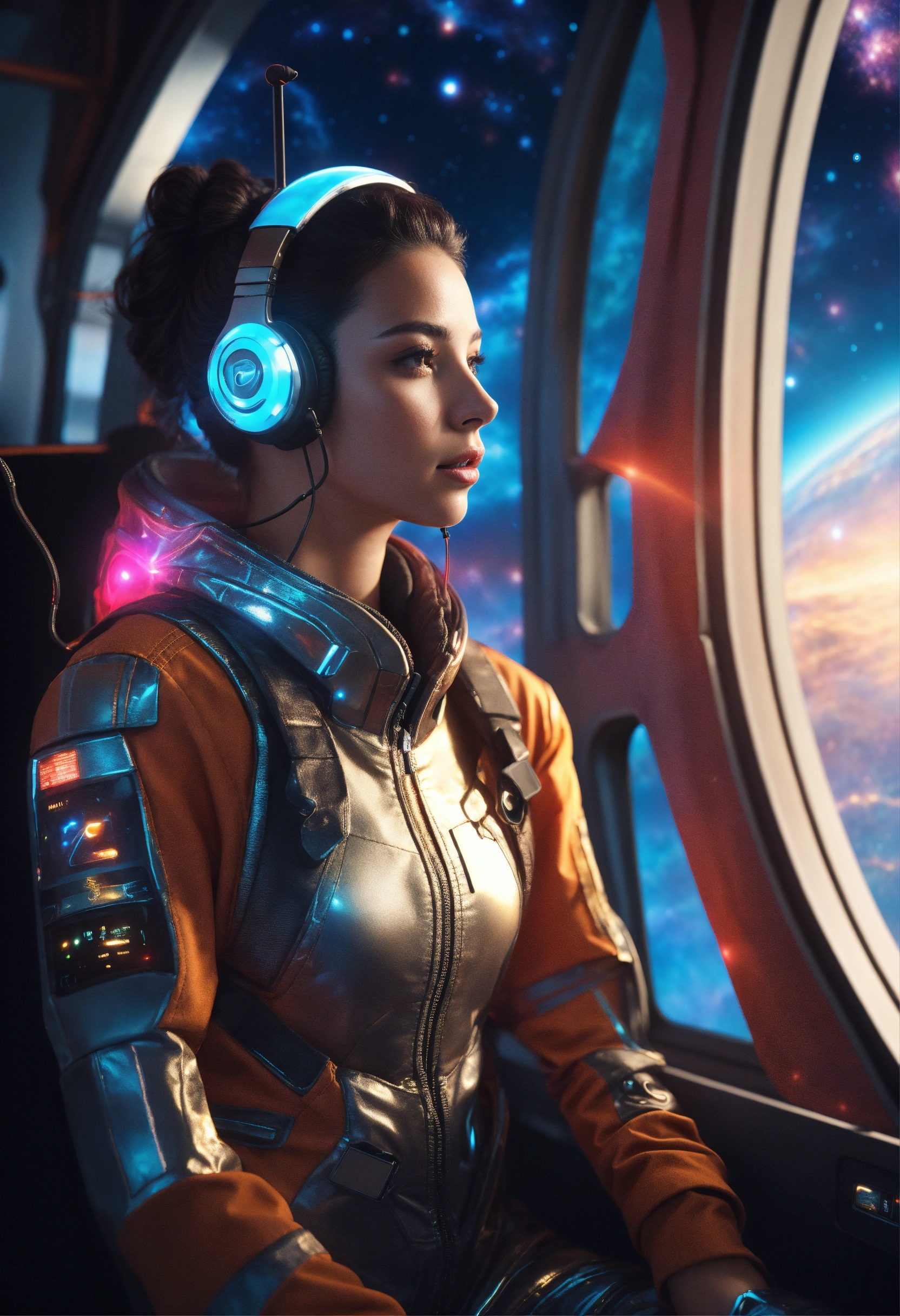 Ultra realistic beautiful brunette girl wearing advanced ear phones with antenna and a tight futuristic space clothes standis looking out a bay window with colorful stars and nebula on a space port, 8k, realistic, sci-fi, unreal engine
