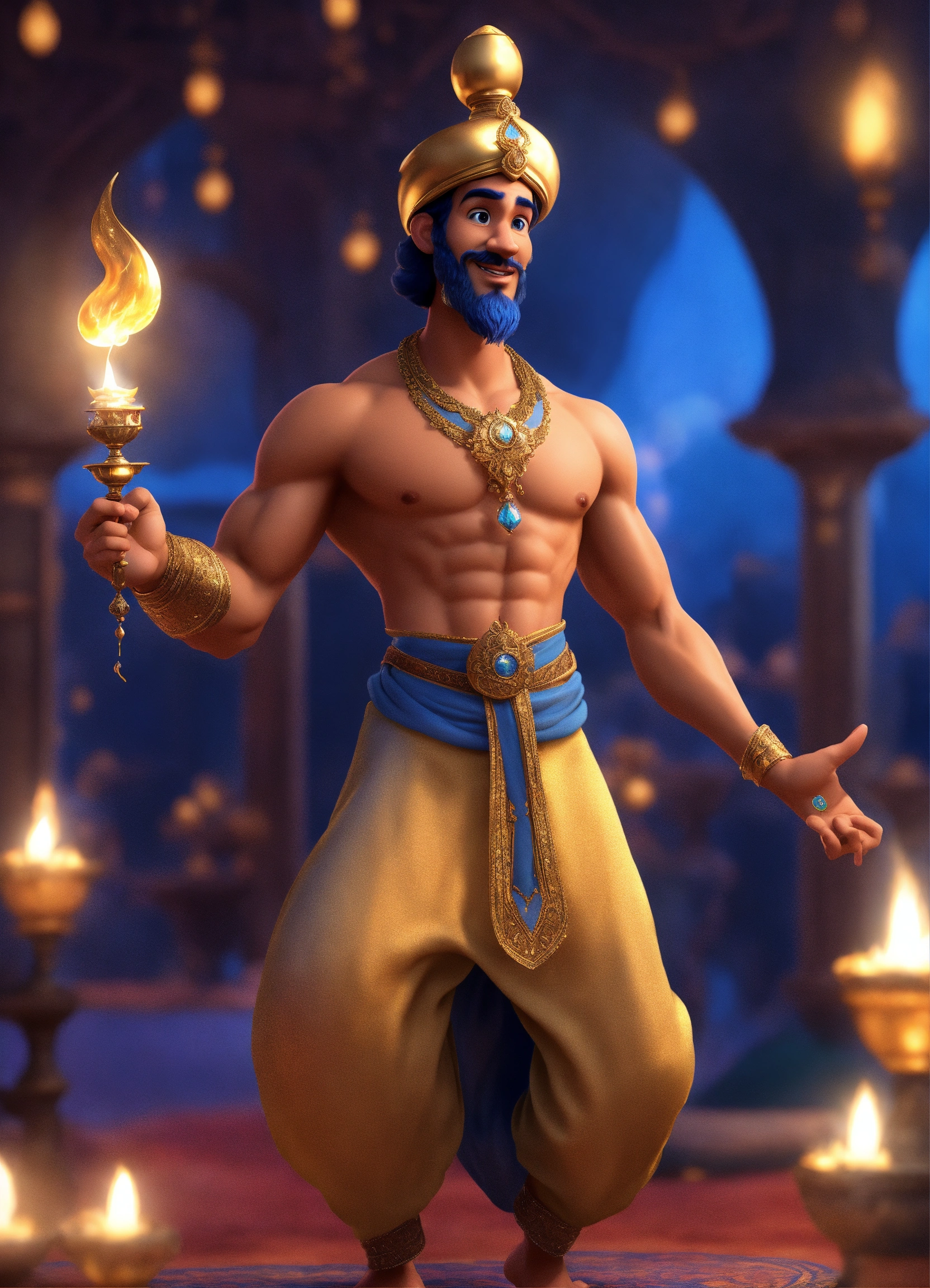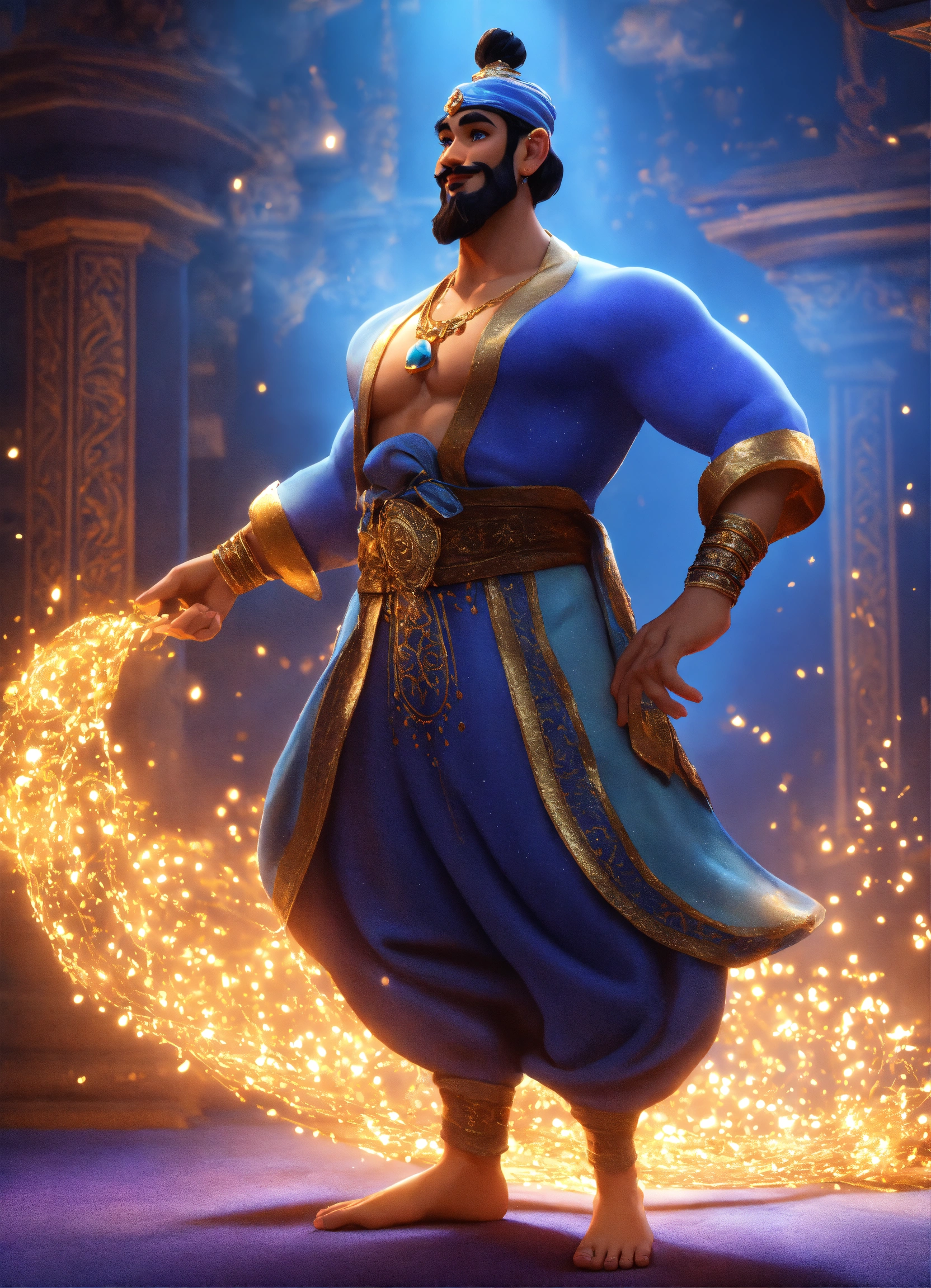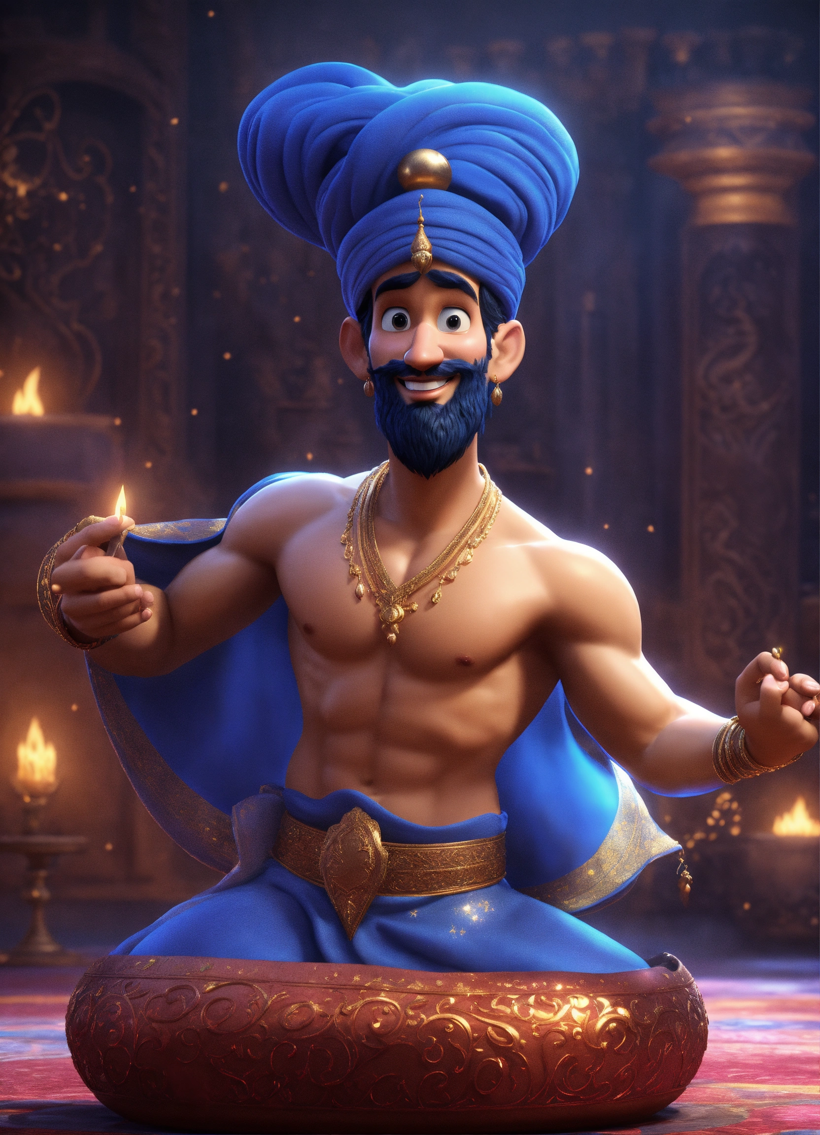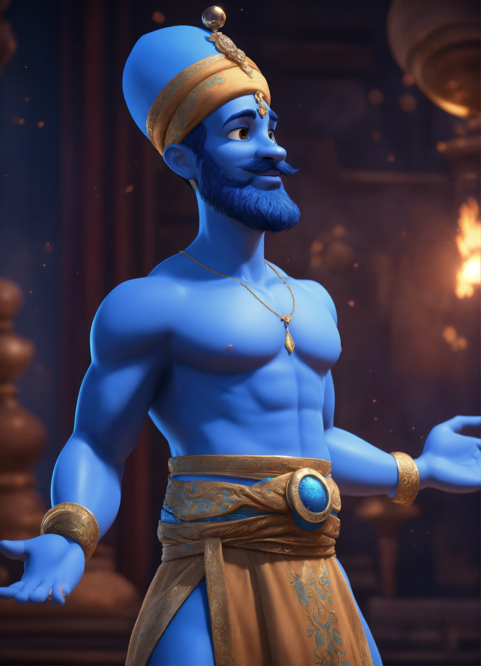 Create a 3d rendering of a magical blue arabian male genie inspired by the disney animation style. the genie must have blue skin, a playful but wise personality, and the ability to float or fly. place your character in the atmosphere of arabian nights and aladdin. the image must be in high resolution format. dynamic pose from the waist up, the genie casts a spell with his hands, below the waist he is like smoke (pixar art style)++ highly detailed digital painting, art stations, concept art, soft focus, hard focus, illustrations. cinematic, visual effects, hdr, unreal engine 5, ray tracing, soft light, 8k, high detail, sparkling backlighting, luxury gem, game art, 3d, cartoon, colorful, magical, mysterious
