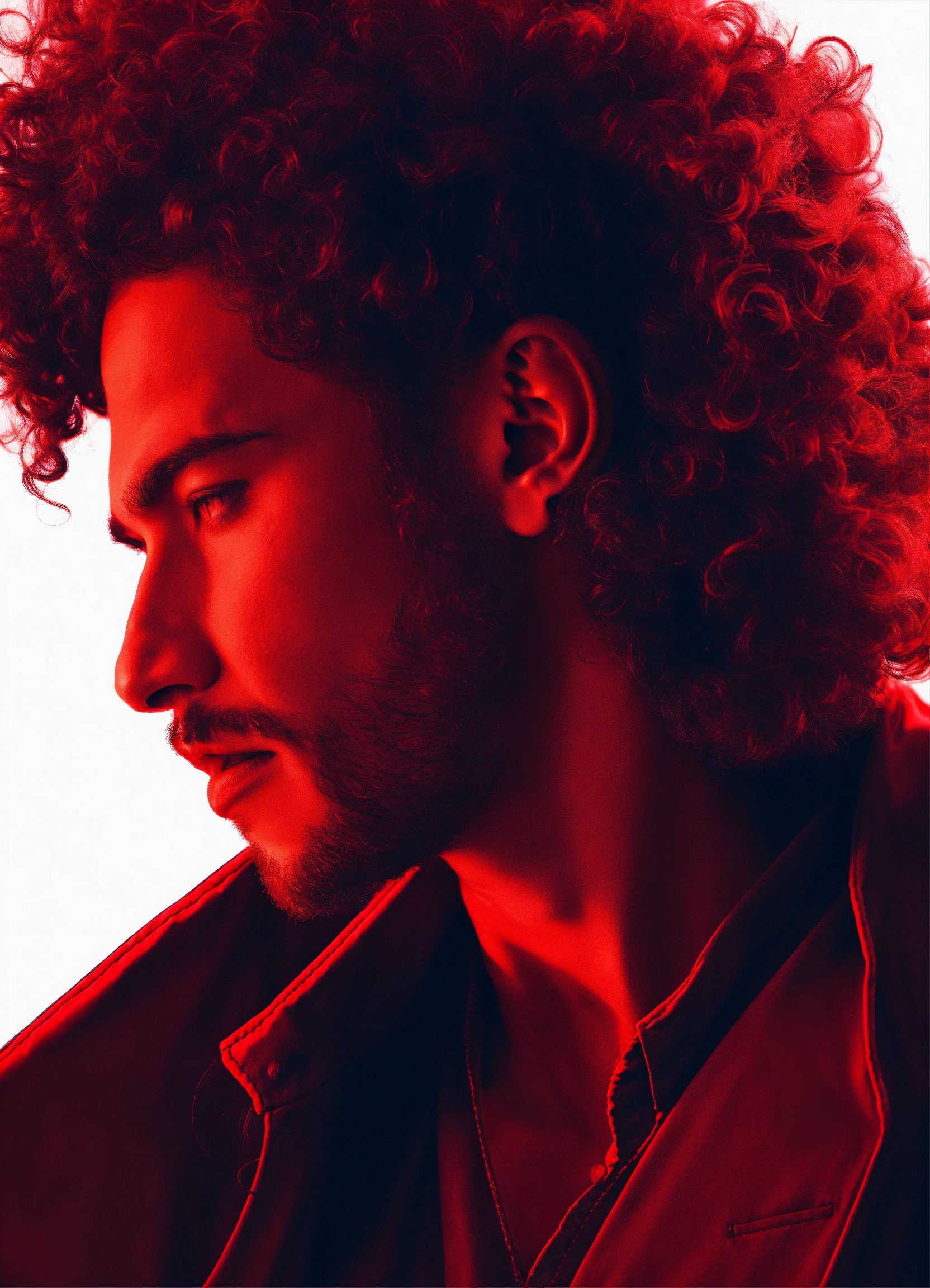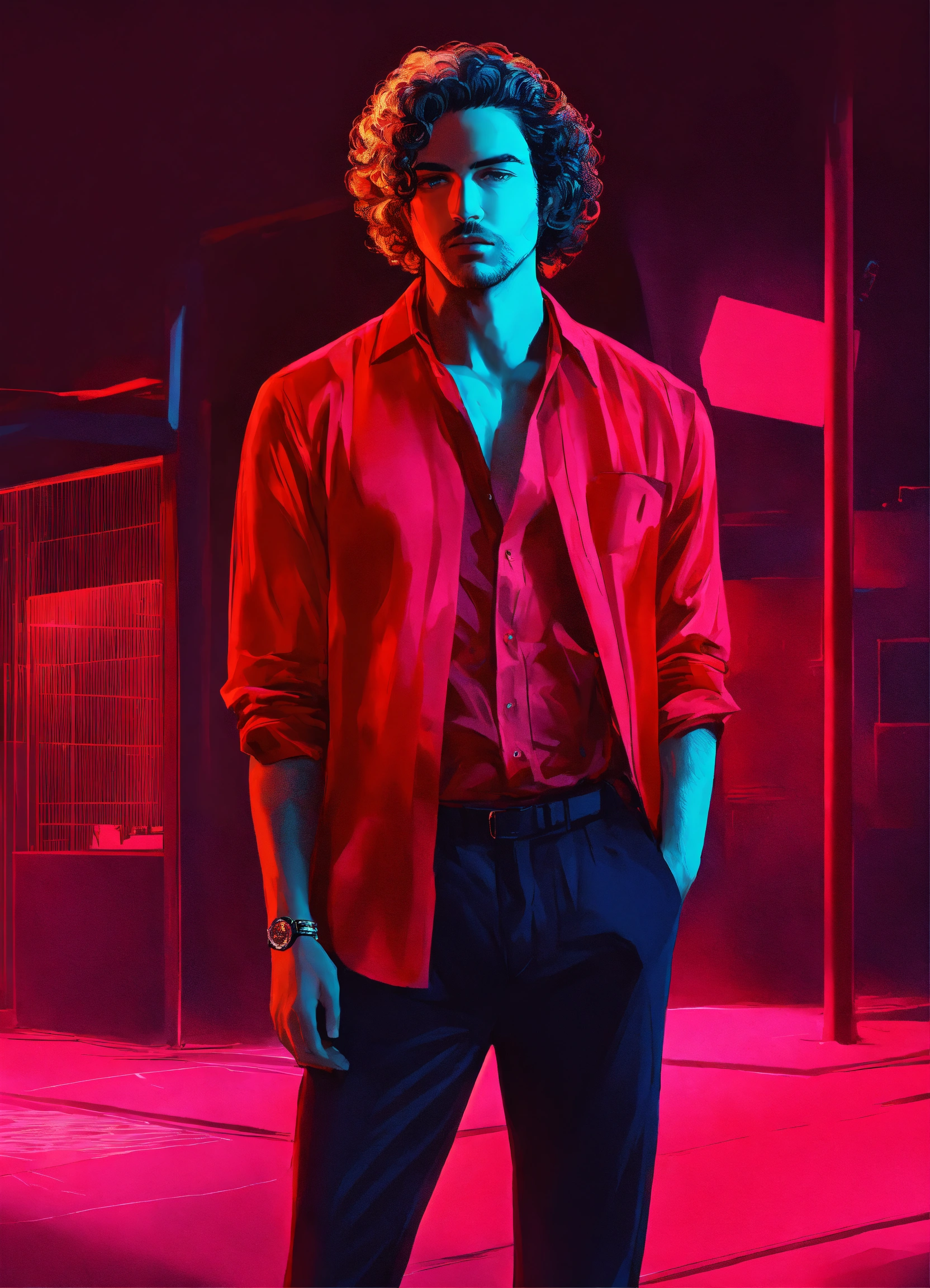 Creates a neon noir style image of a man who wears a red shirt and long pants, the man has curly hair.