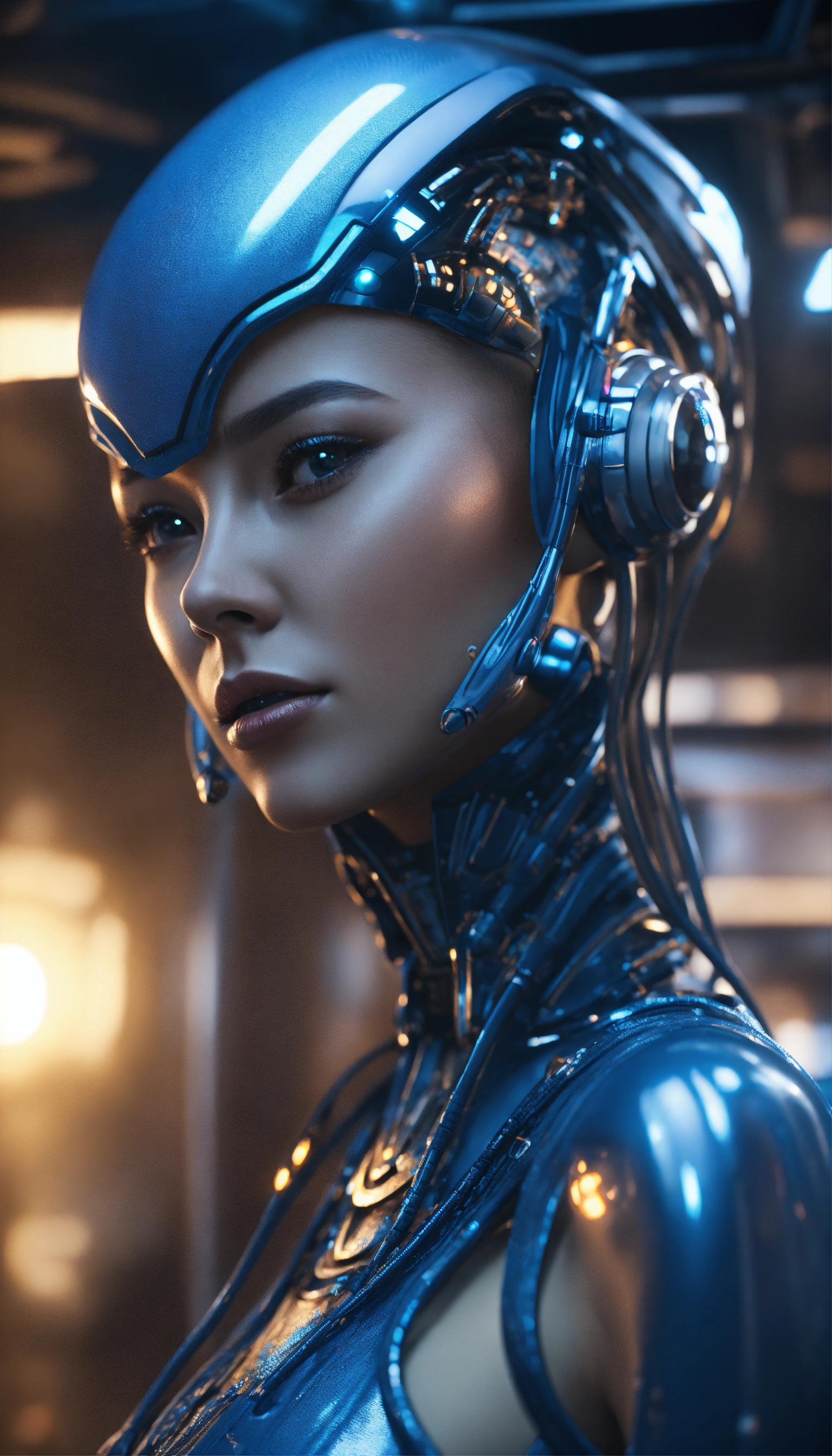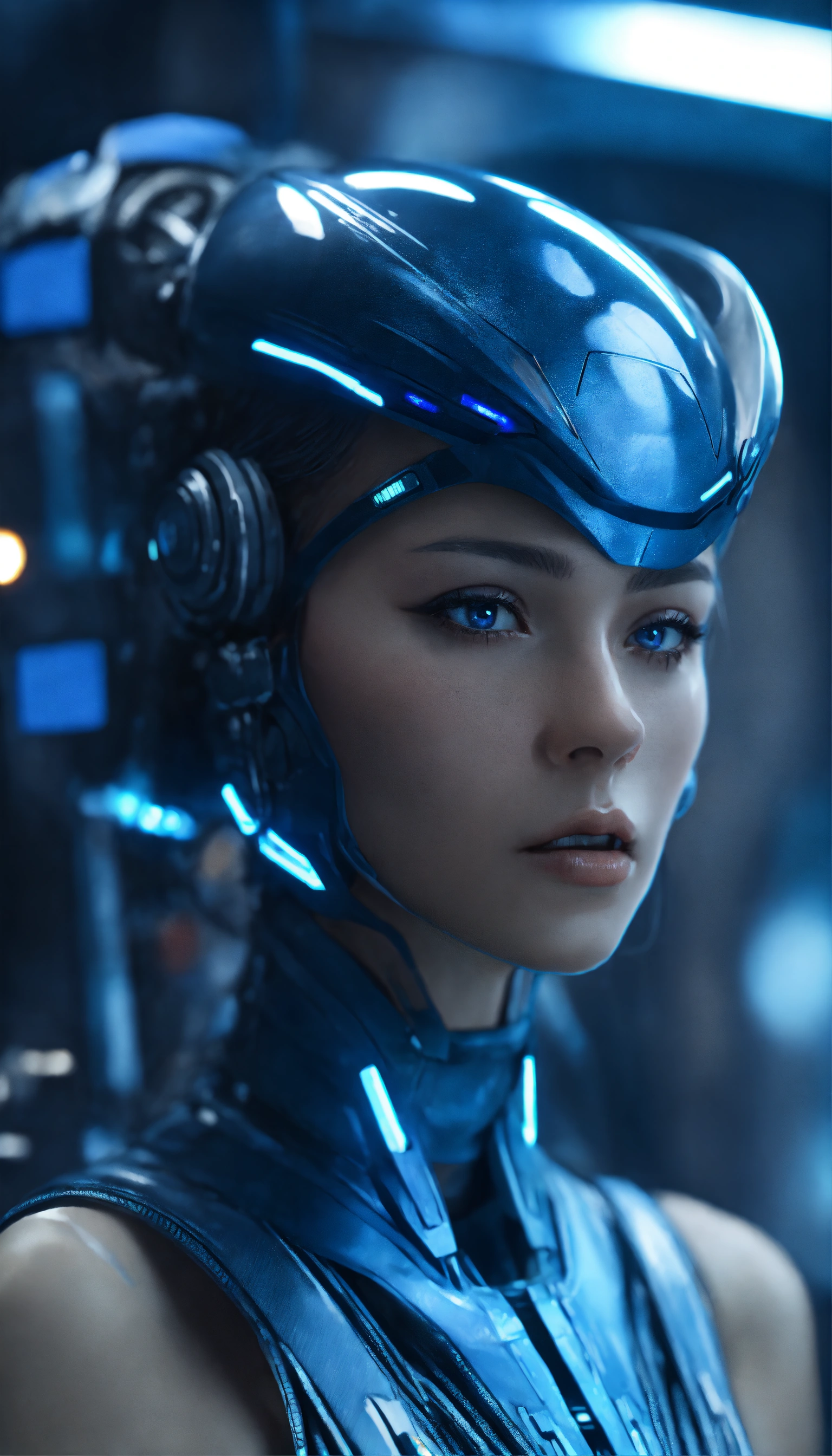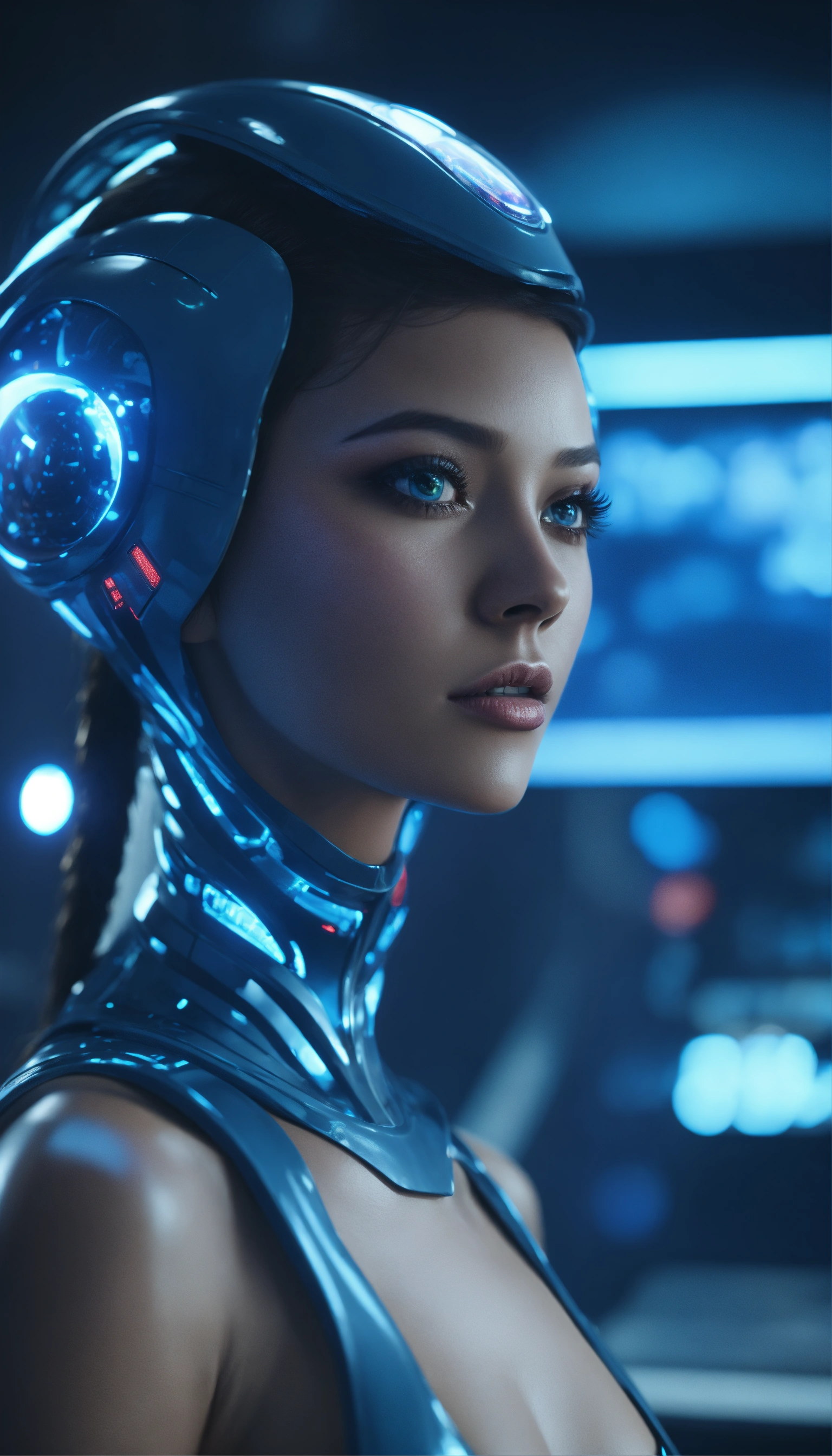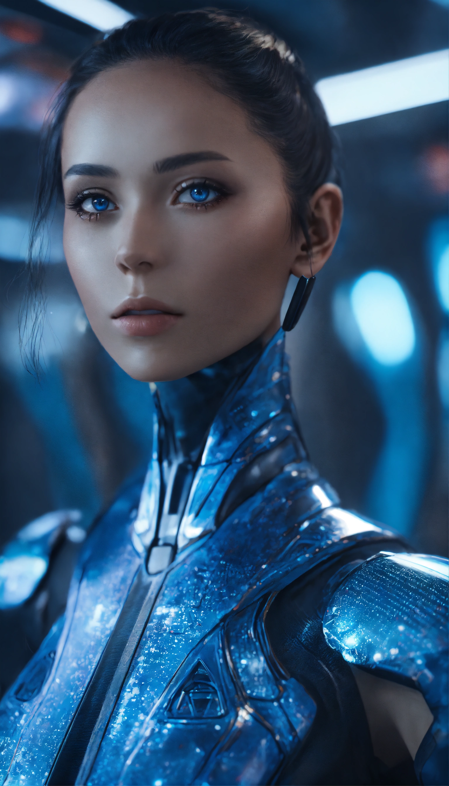 Zoom out shot of a beautiful blue skin alien girl on hi tech mother ship, realistic, futuristic, sci-fi, 8k, unreal engine