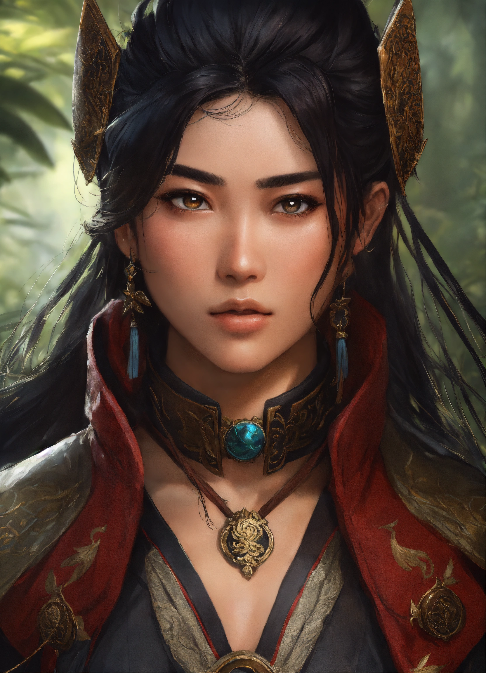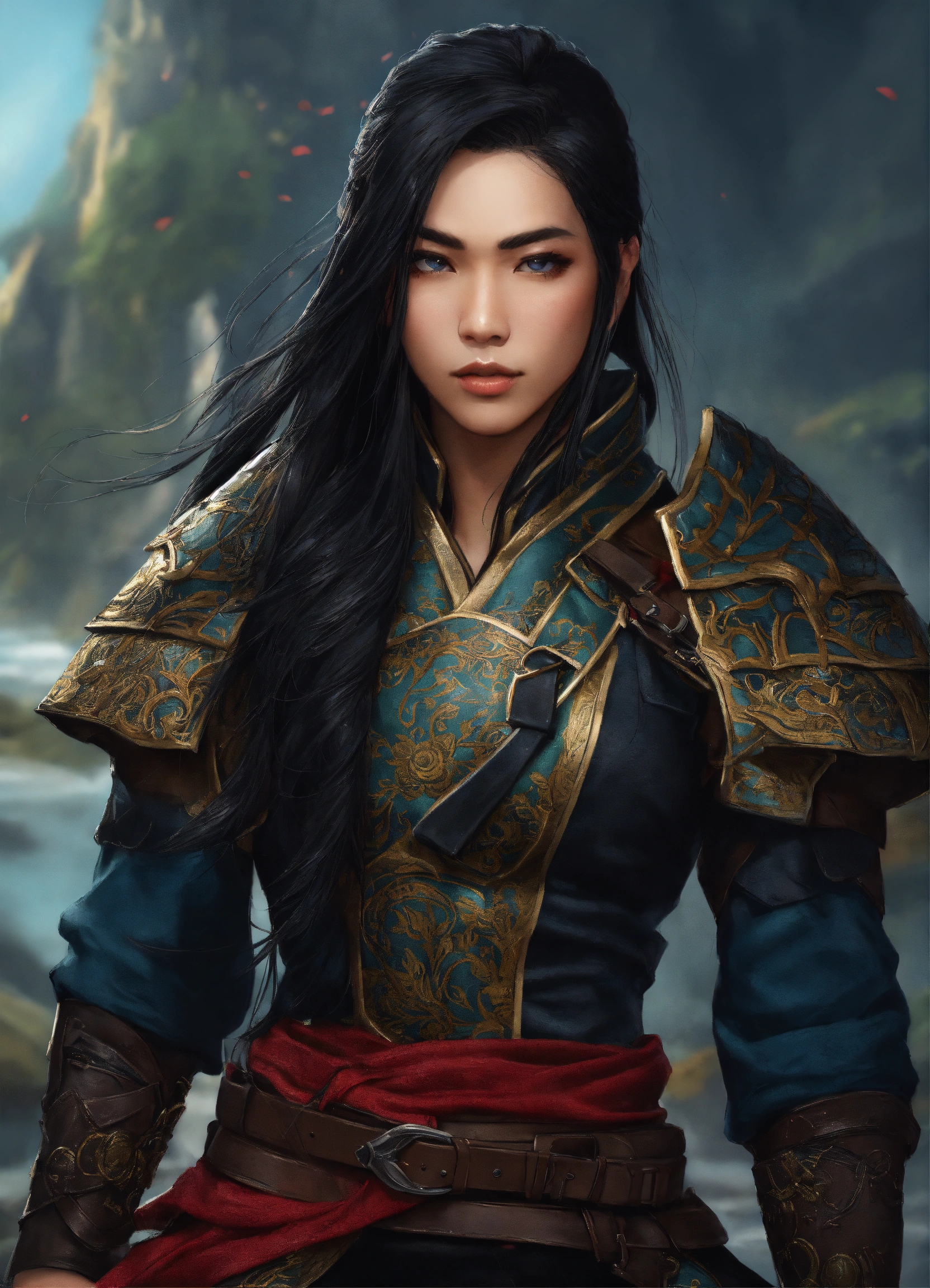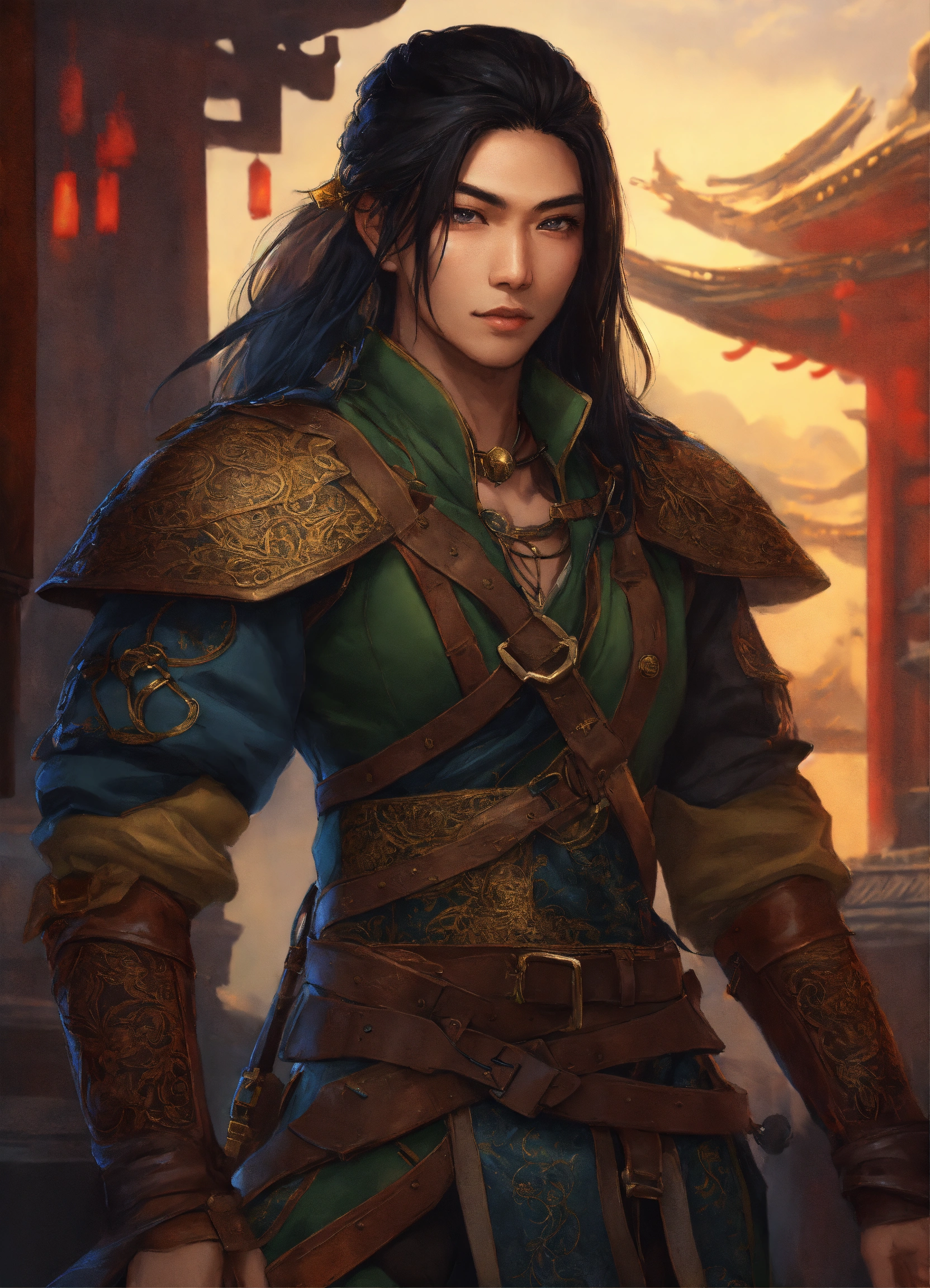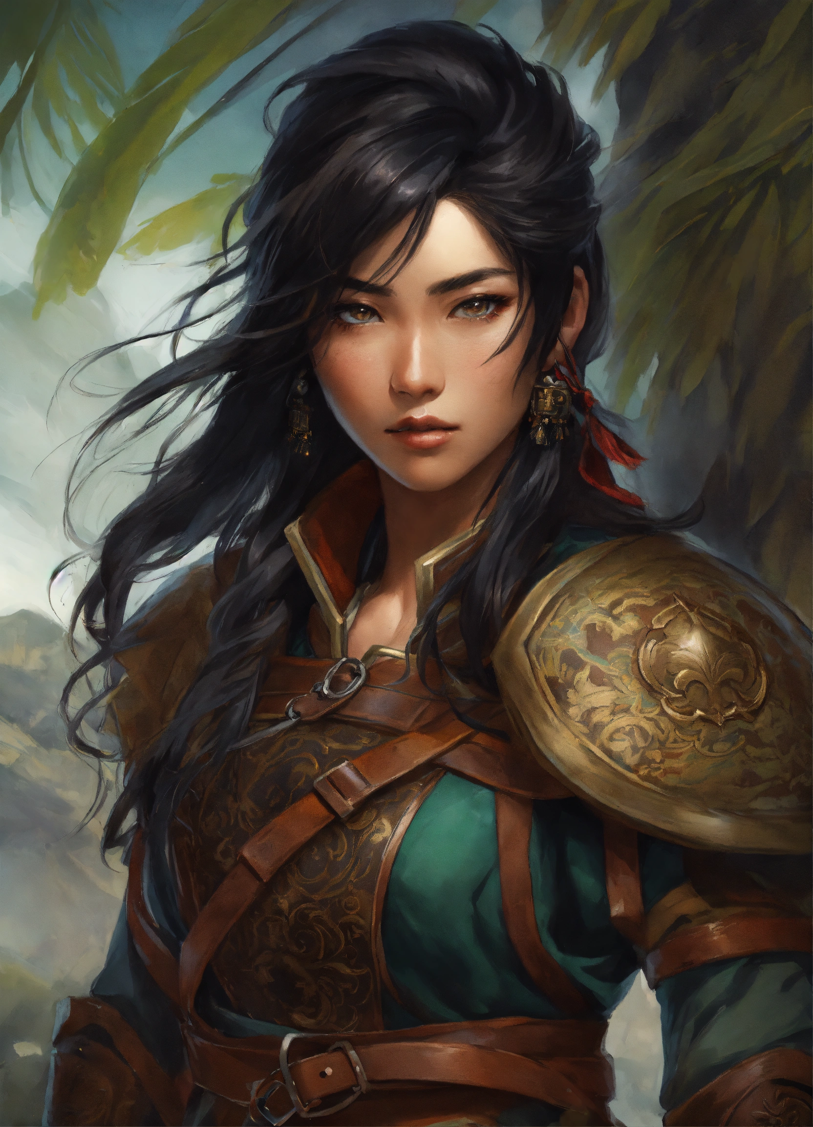 "heroic asian fantasy rogue", black hair, leather travel clothes, head and shoulders portrait, intricately detailed eyes