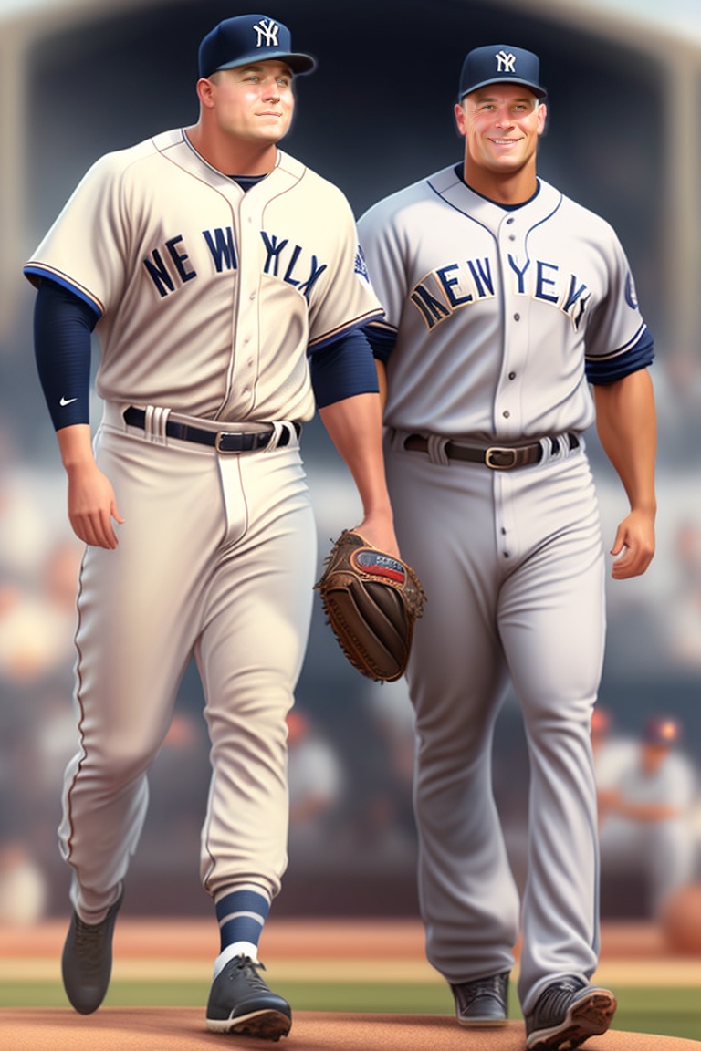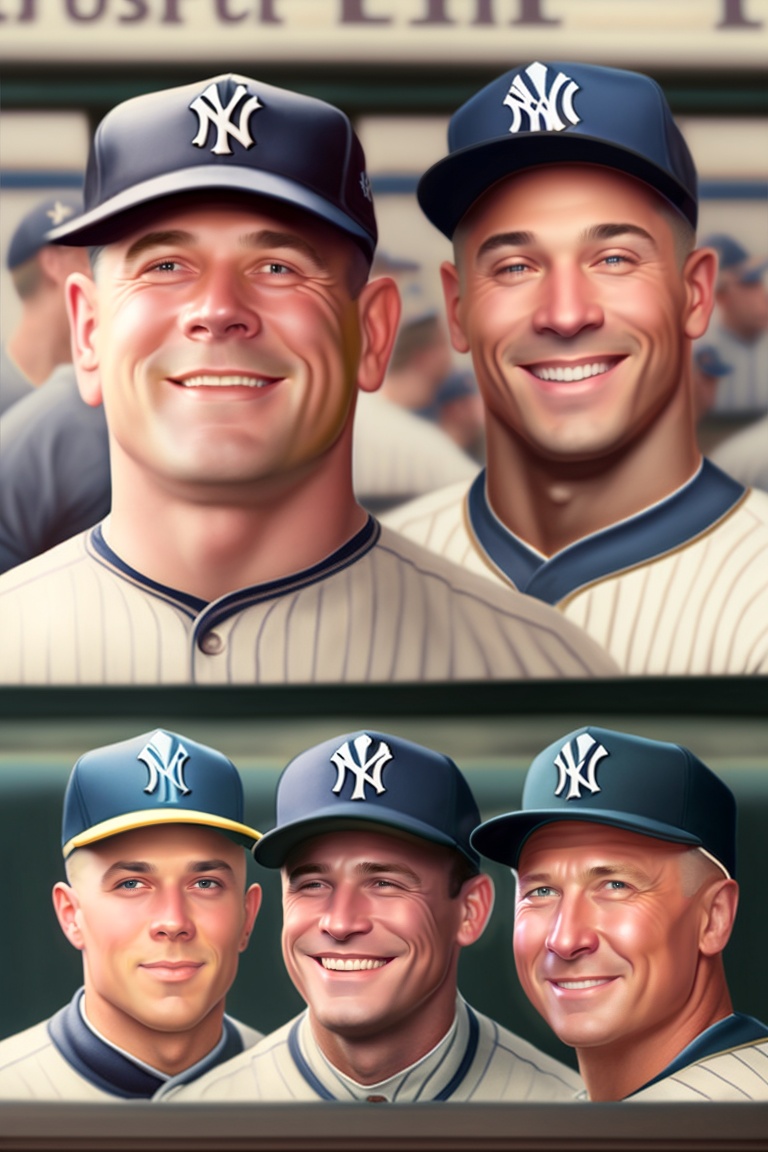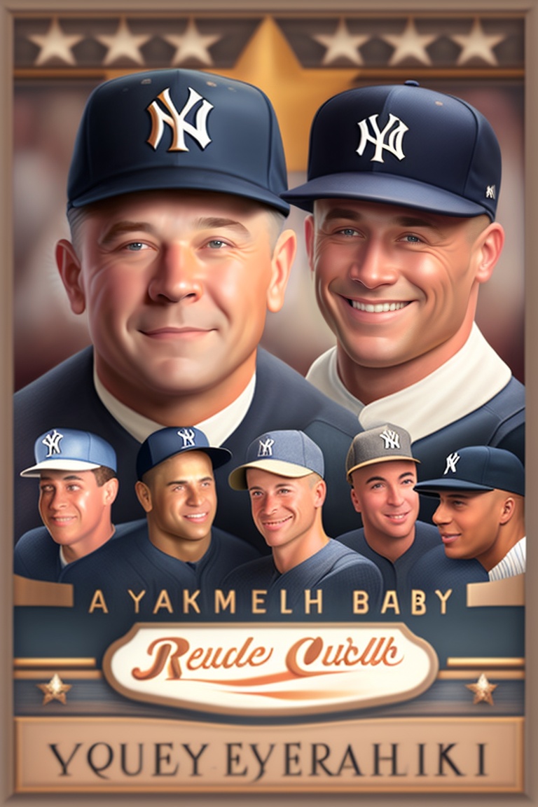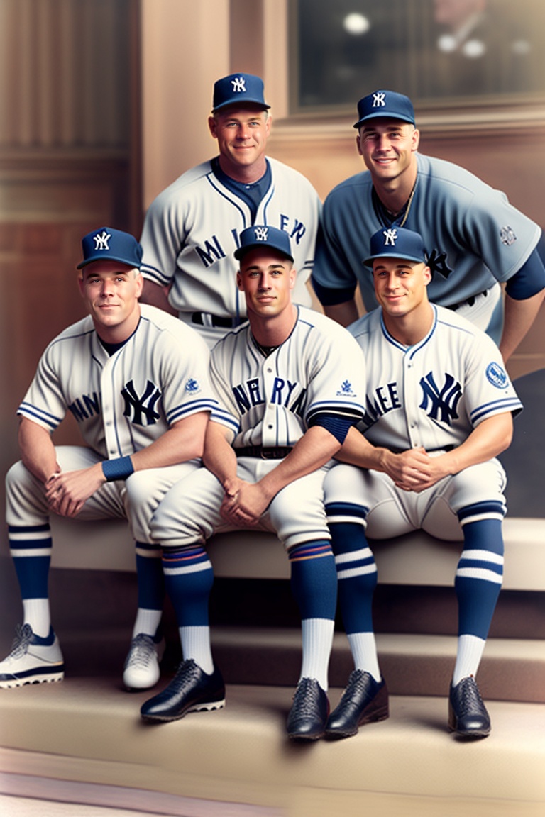 A group picture of babe ruth, lou gehrig, mickey mantle, joe dimaggio, and derek jeter wearing new yourk yankees jersy