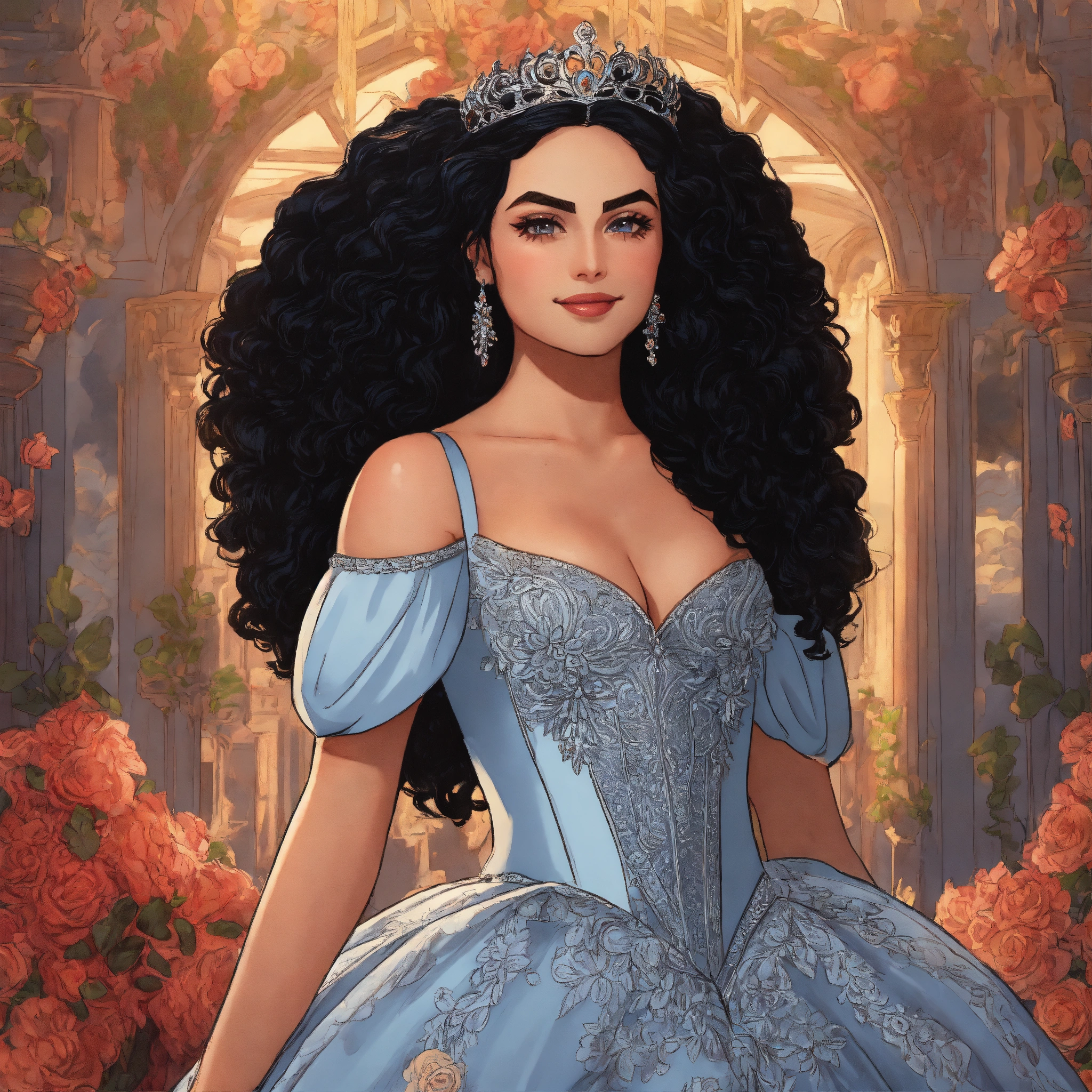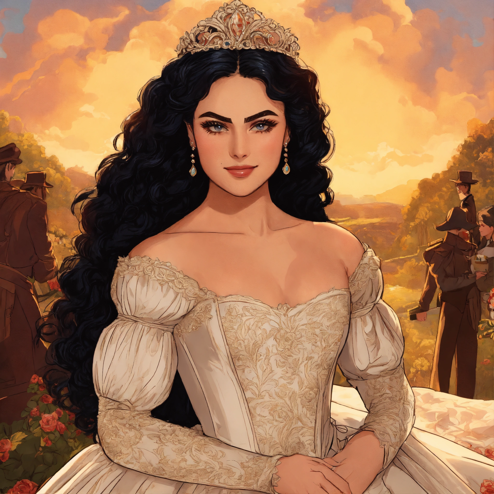 "camila mendes as legendary princess bride", huge curly hair, smirk, big elaborate wedding dress, intricately detailed eyes, bustle, petticoats, historical, fantasy art, line art