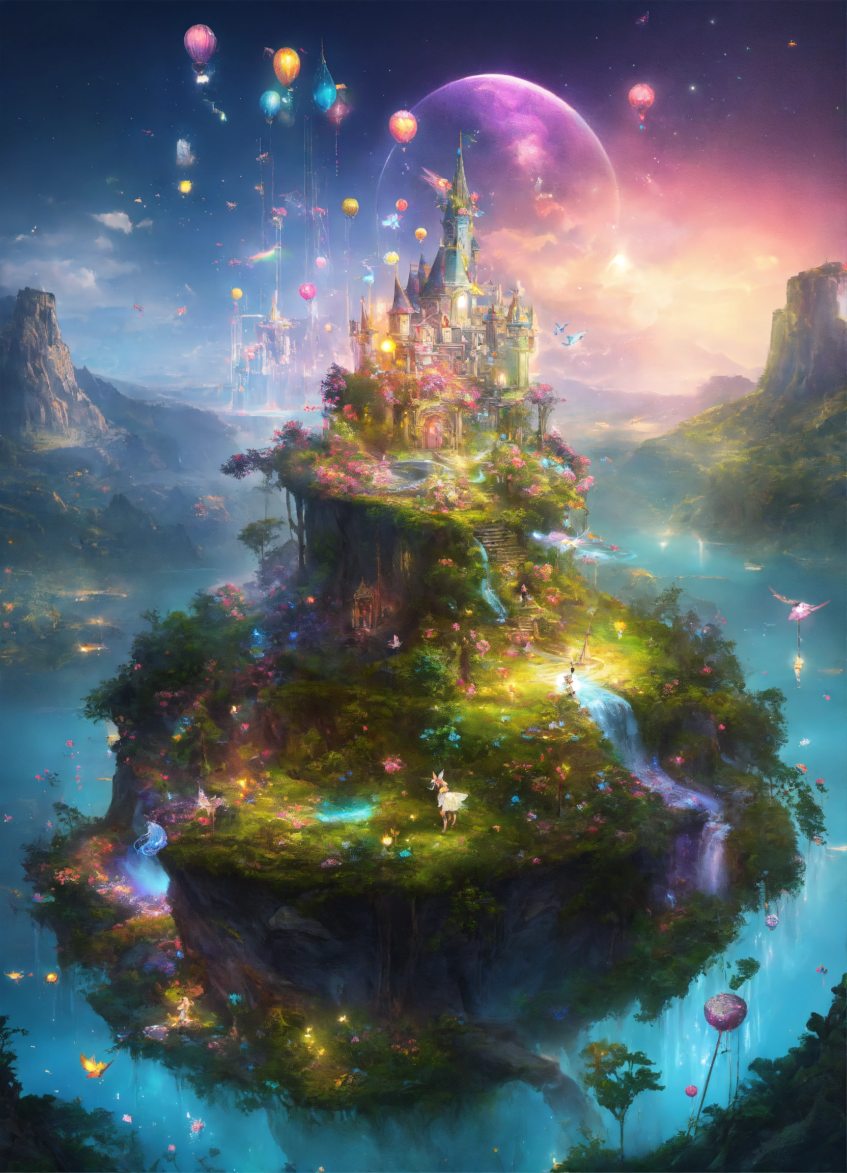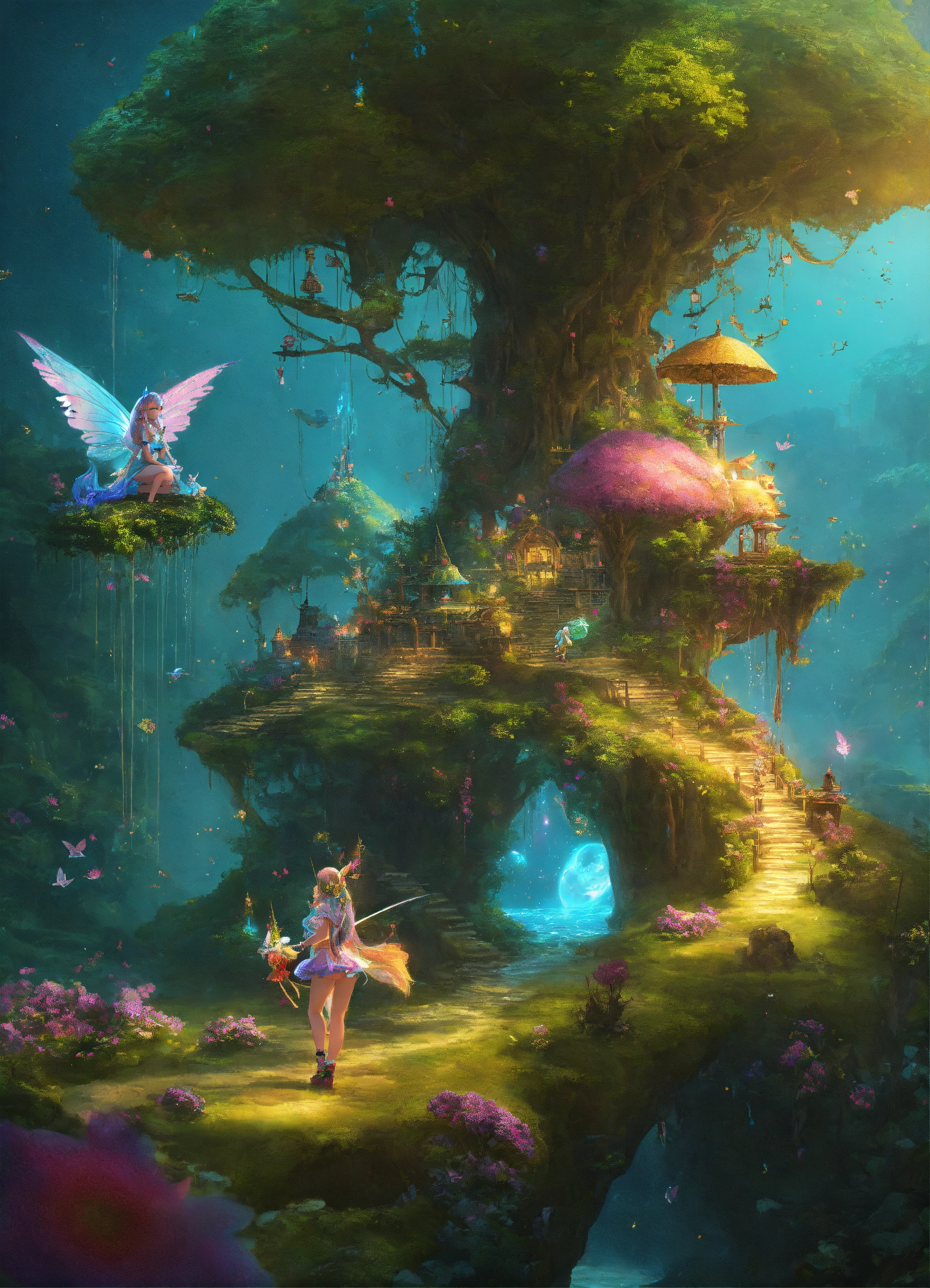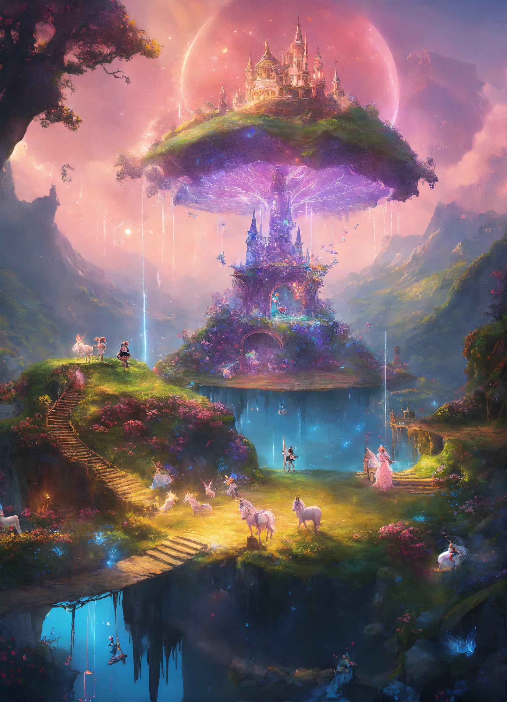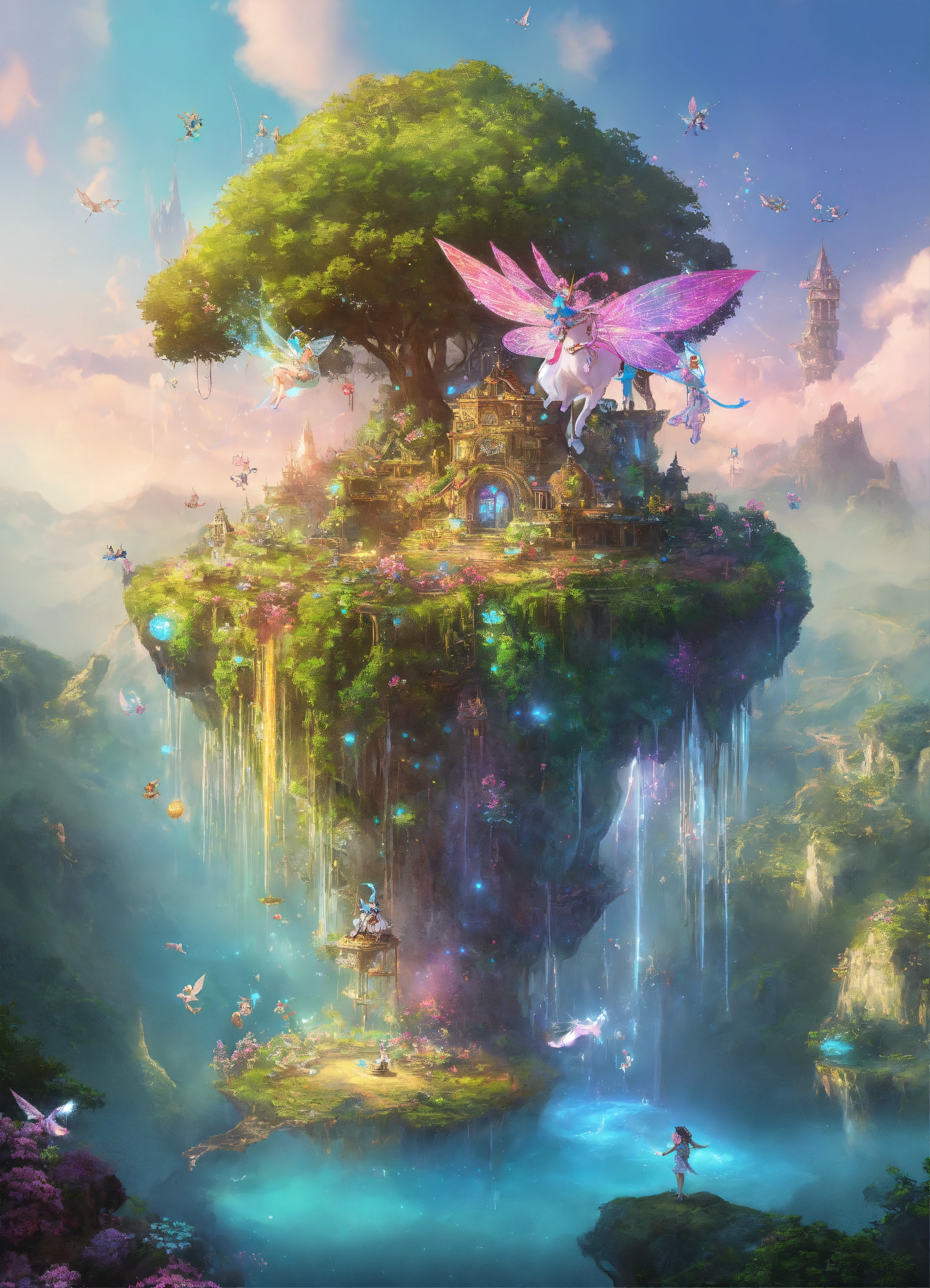 Fairies evolve on a floating island with unicorns in the cyberworld