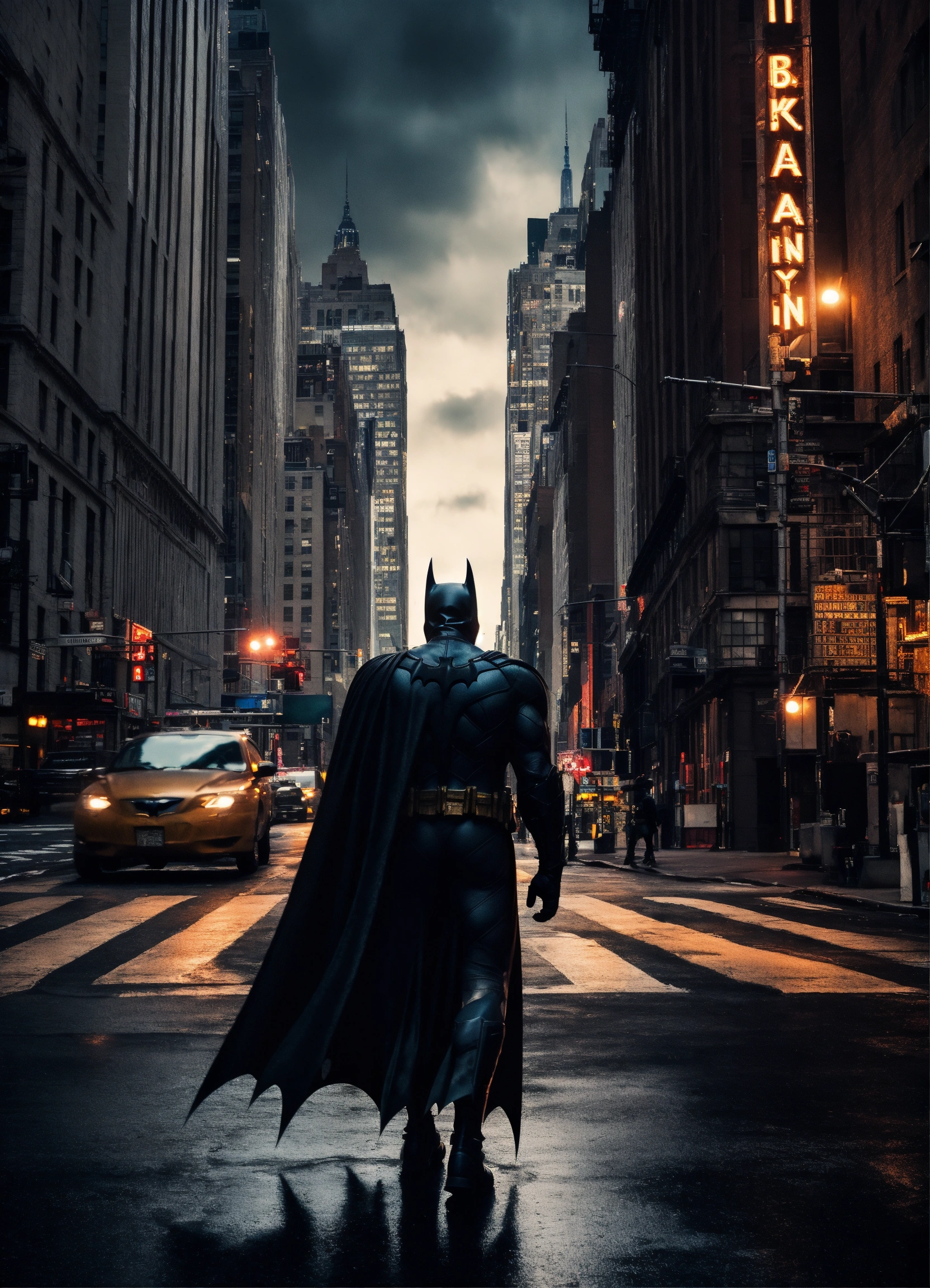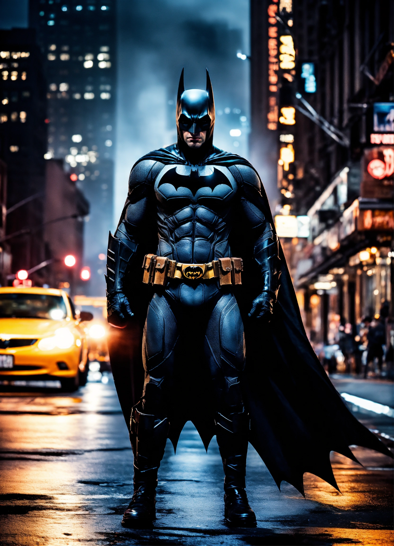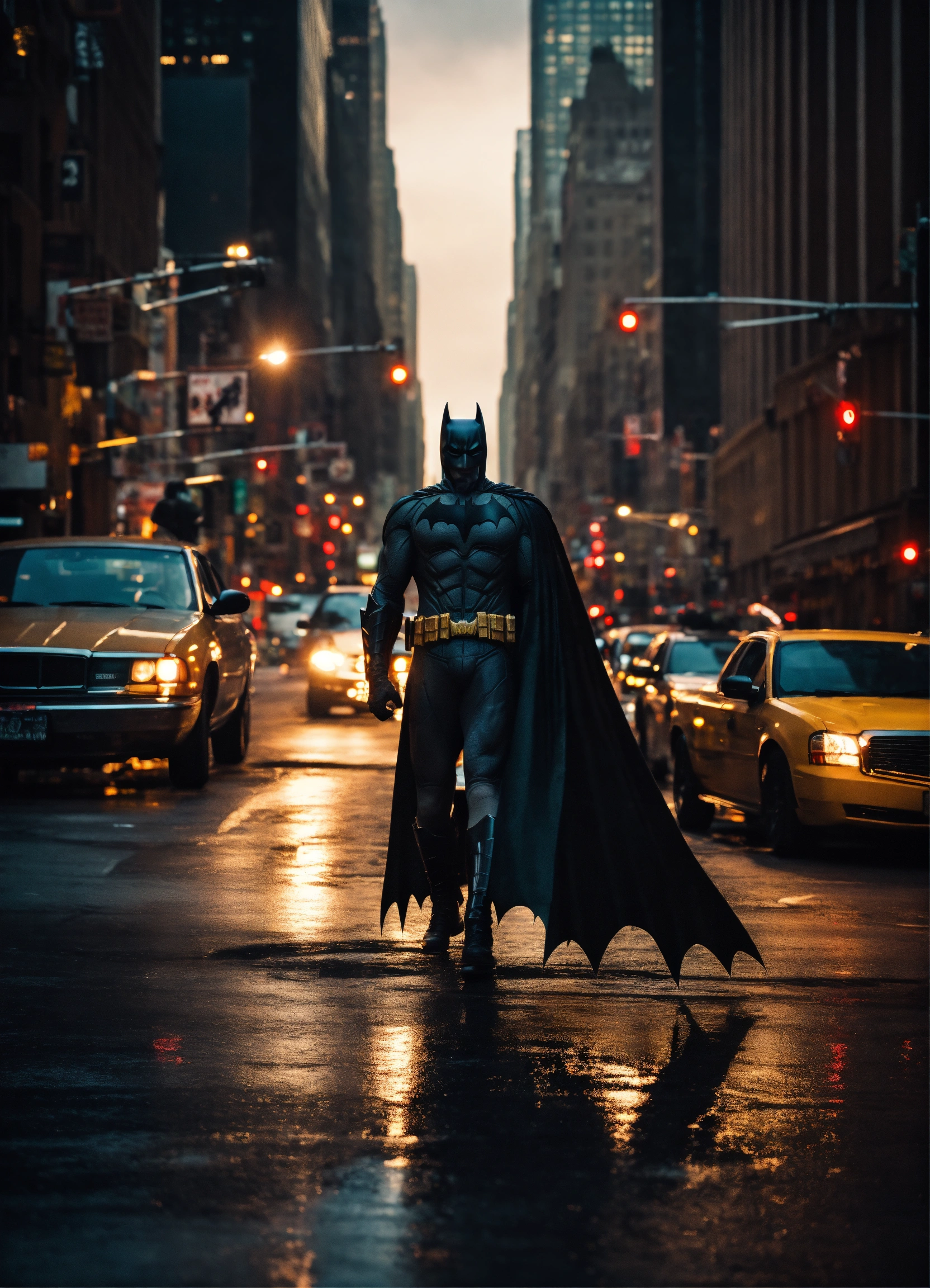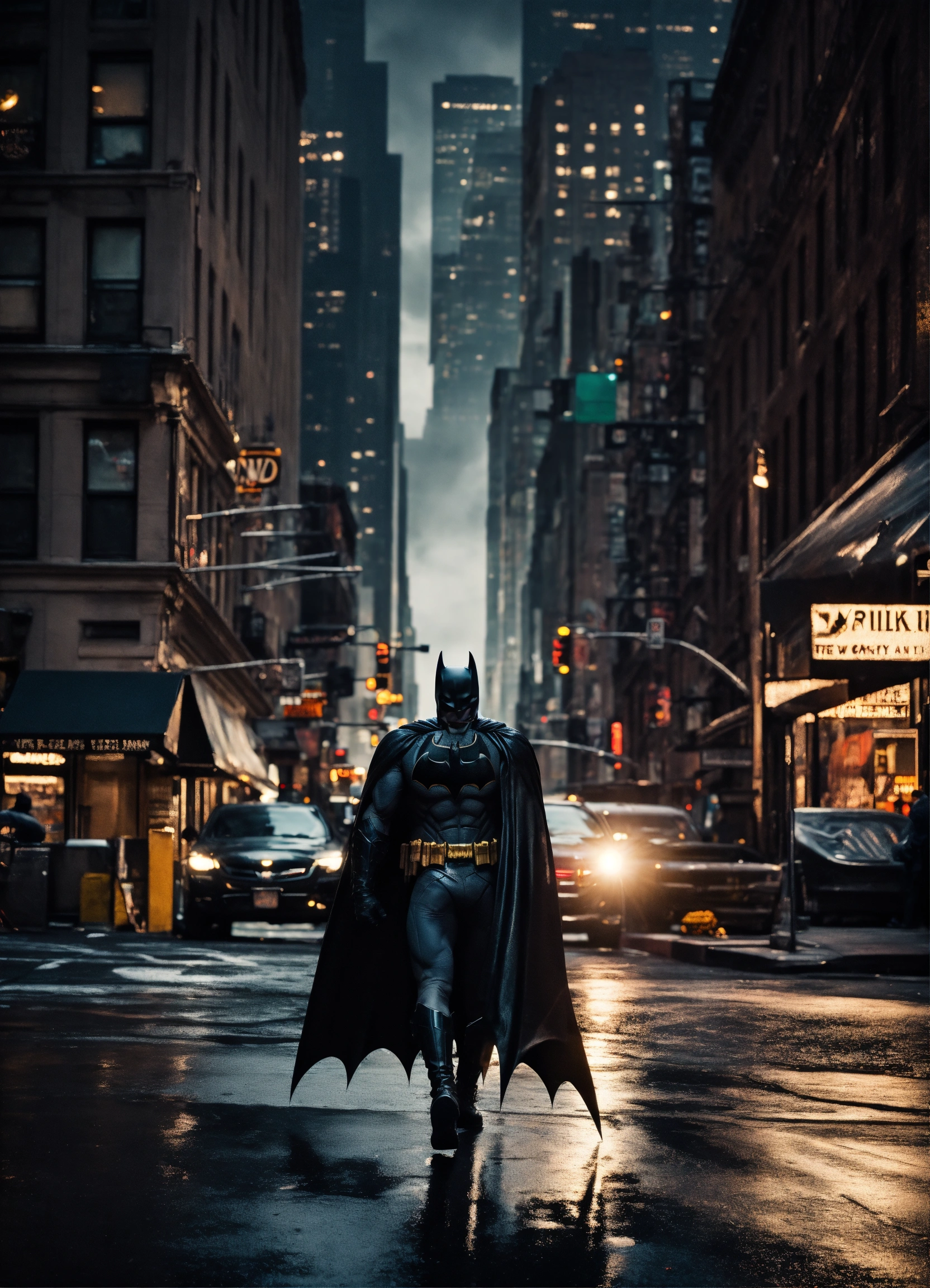 Batman walking through streets of new york, stunning photo, dark moody aesthetic, at night, city lights in background. surreal, 8k