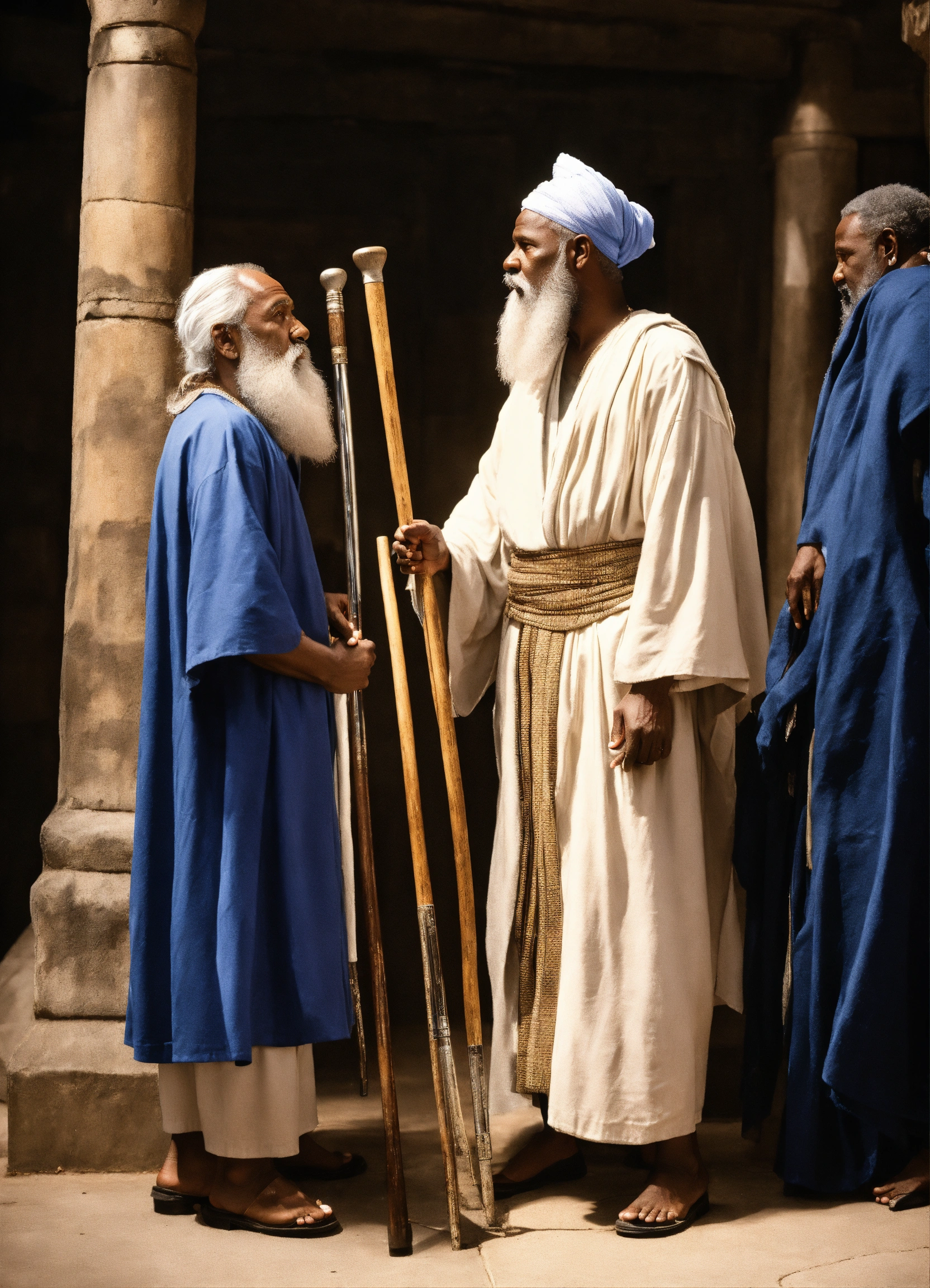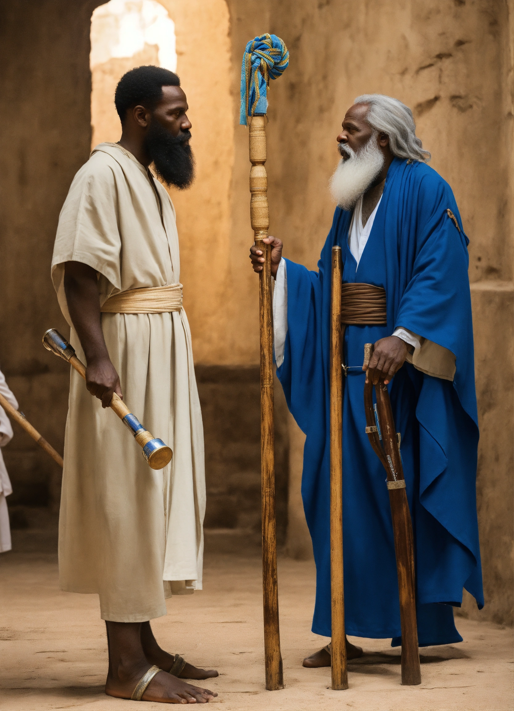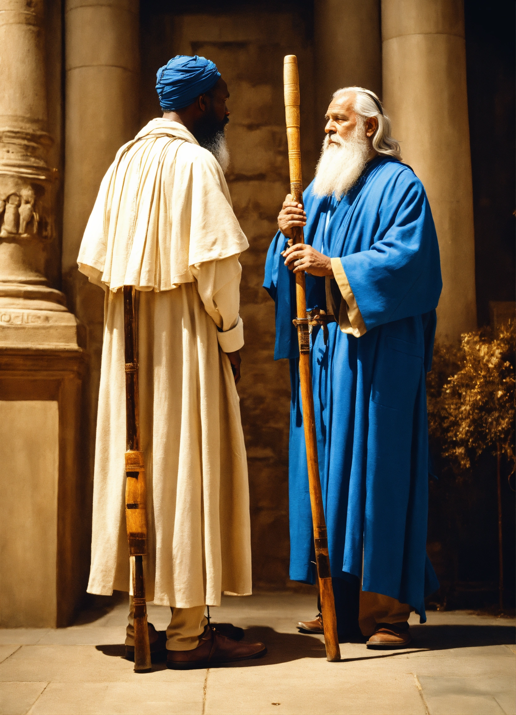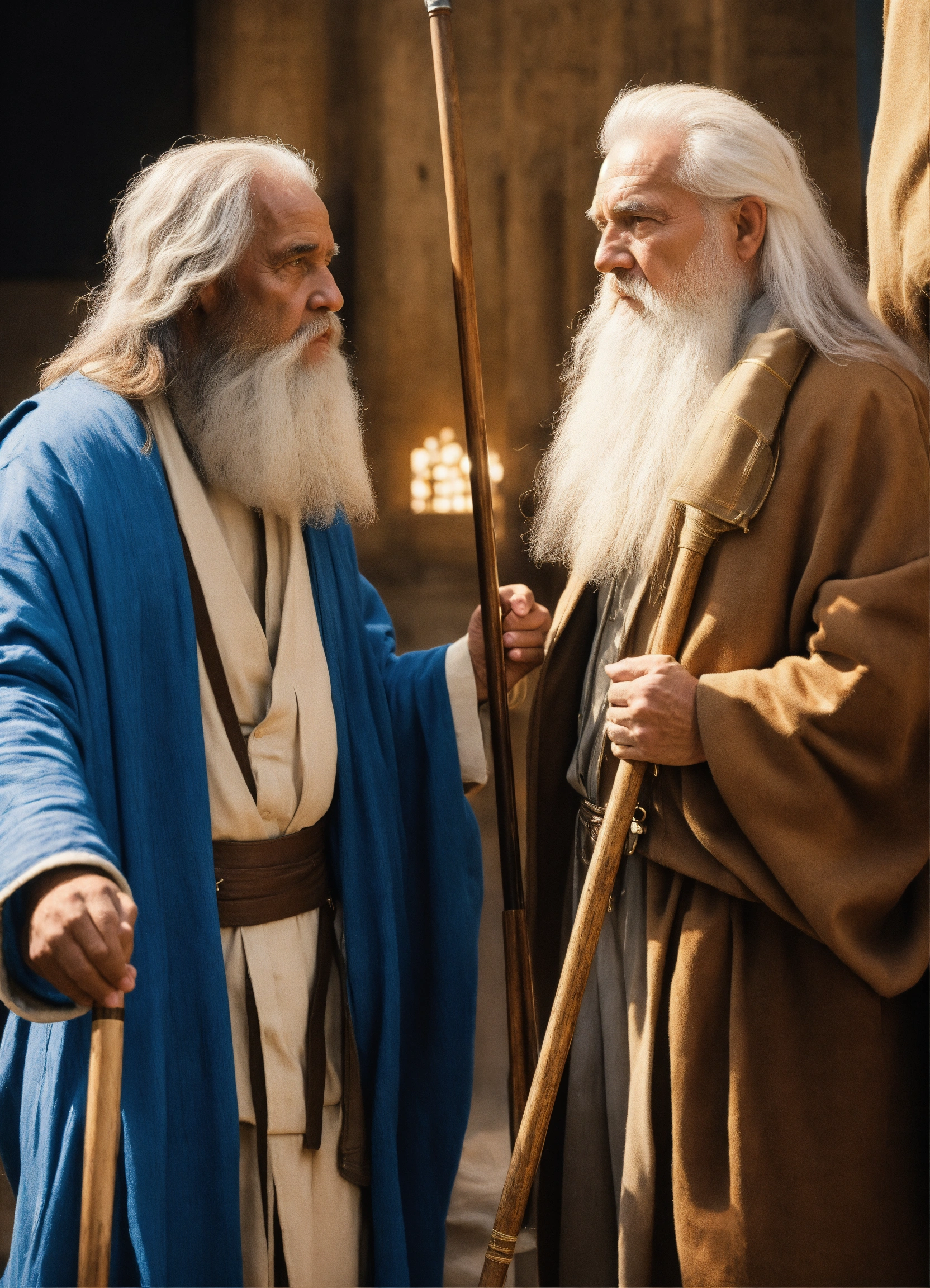 Cinmatic, view from the back, moses prophet meet another prophet, standing in front of each other talking, both are white and has white beard, both of them holding old canes, moses is wearing blue, other wearing white, there is a young boy following them