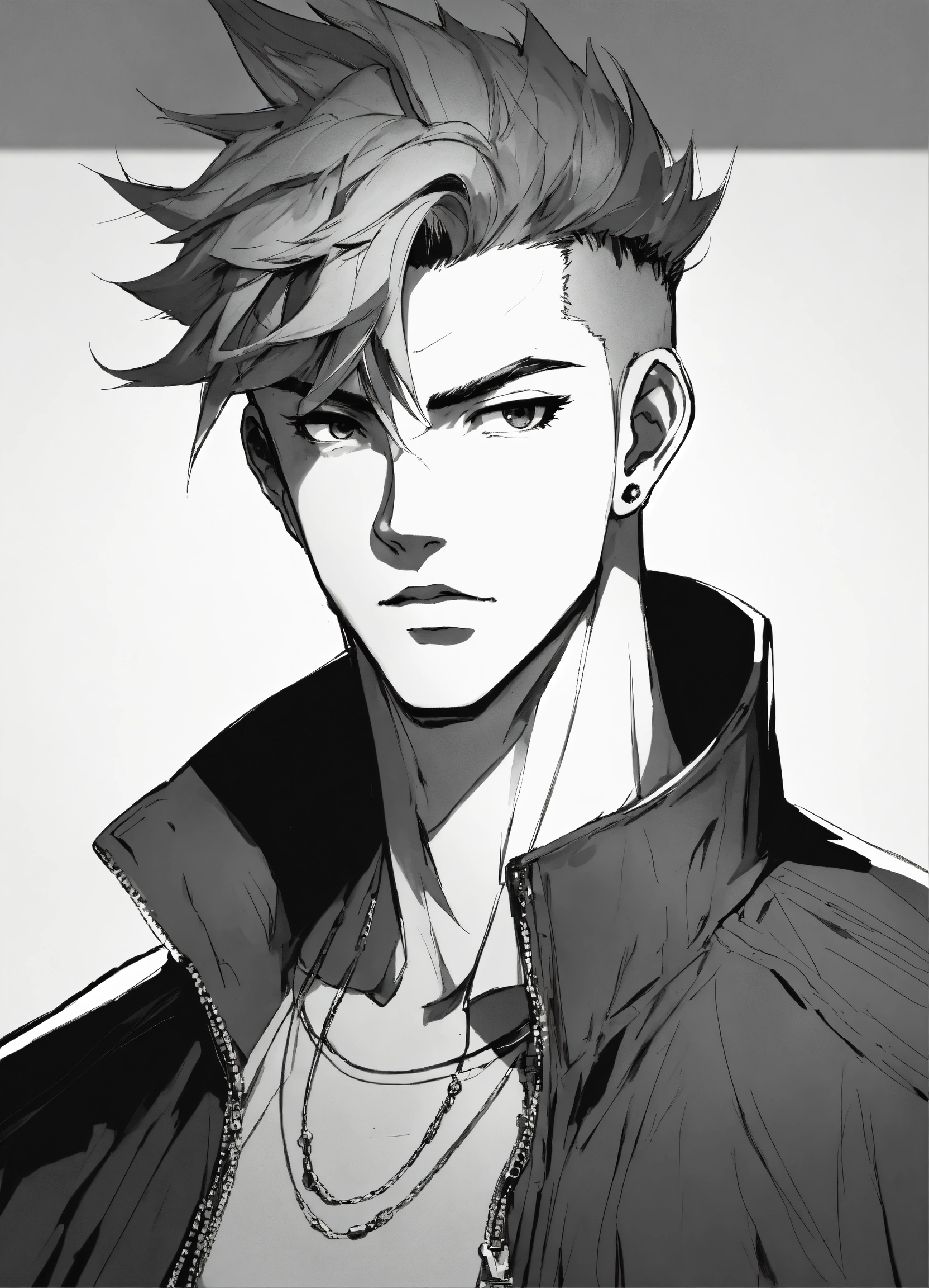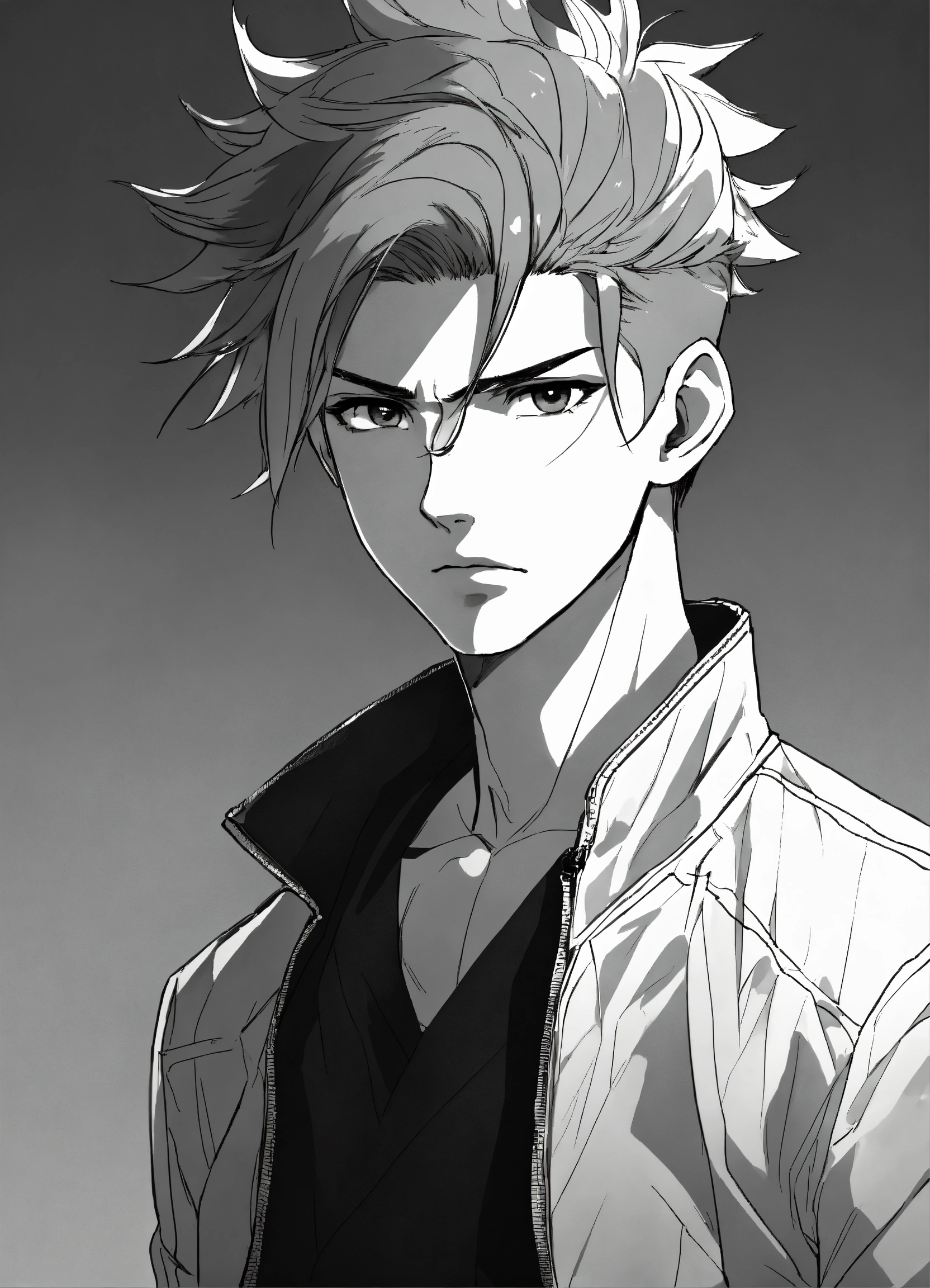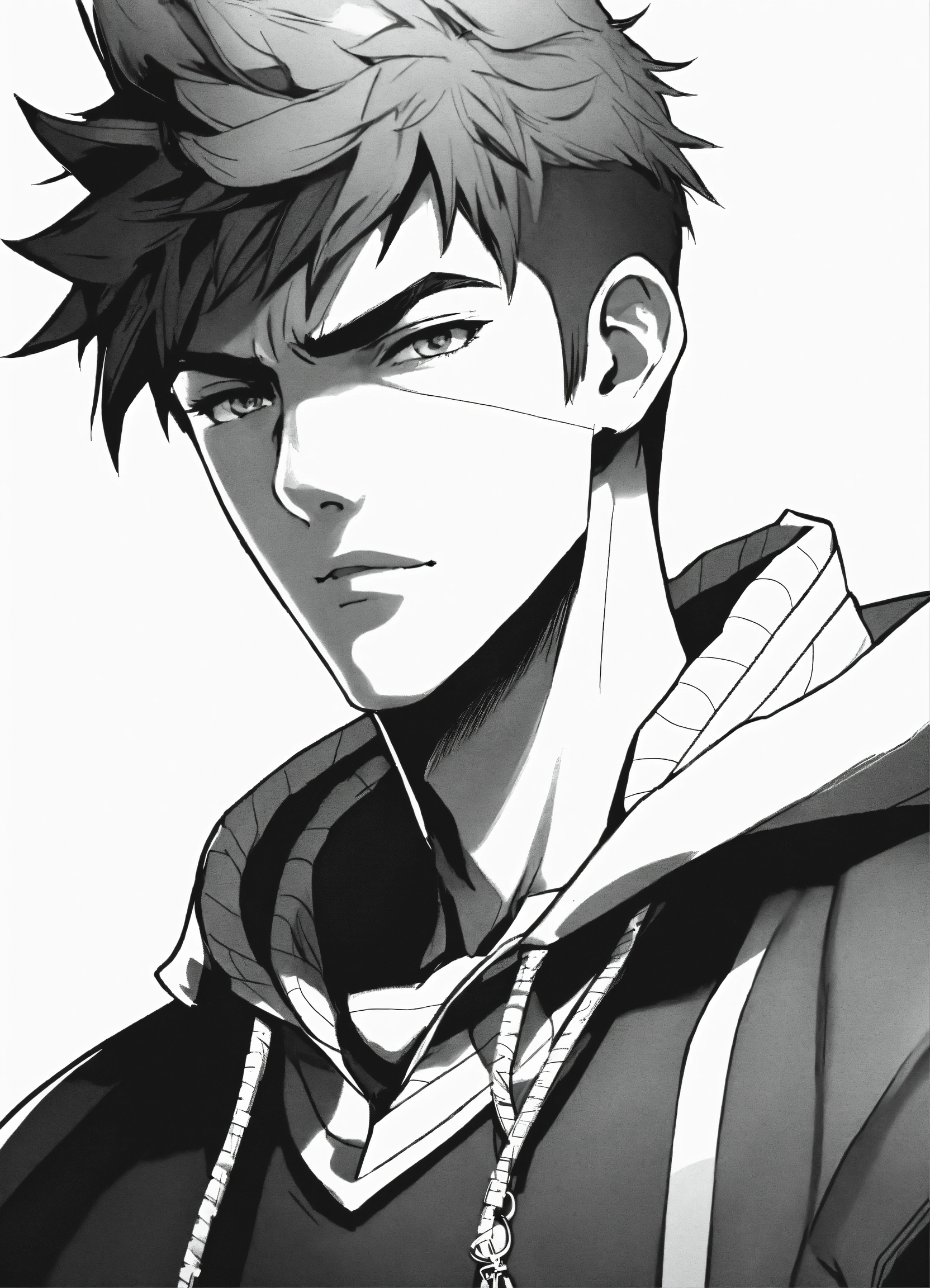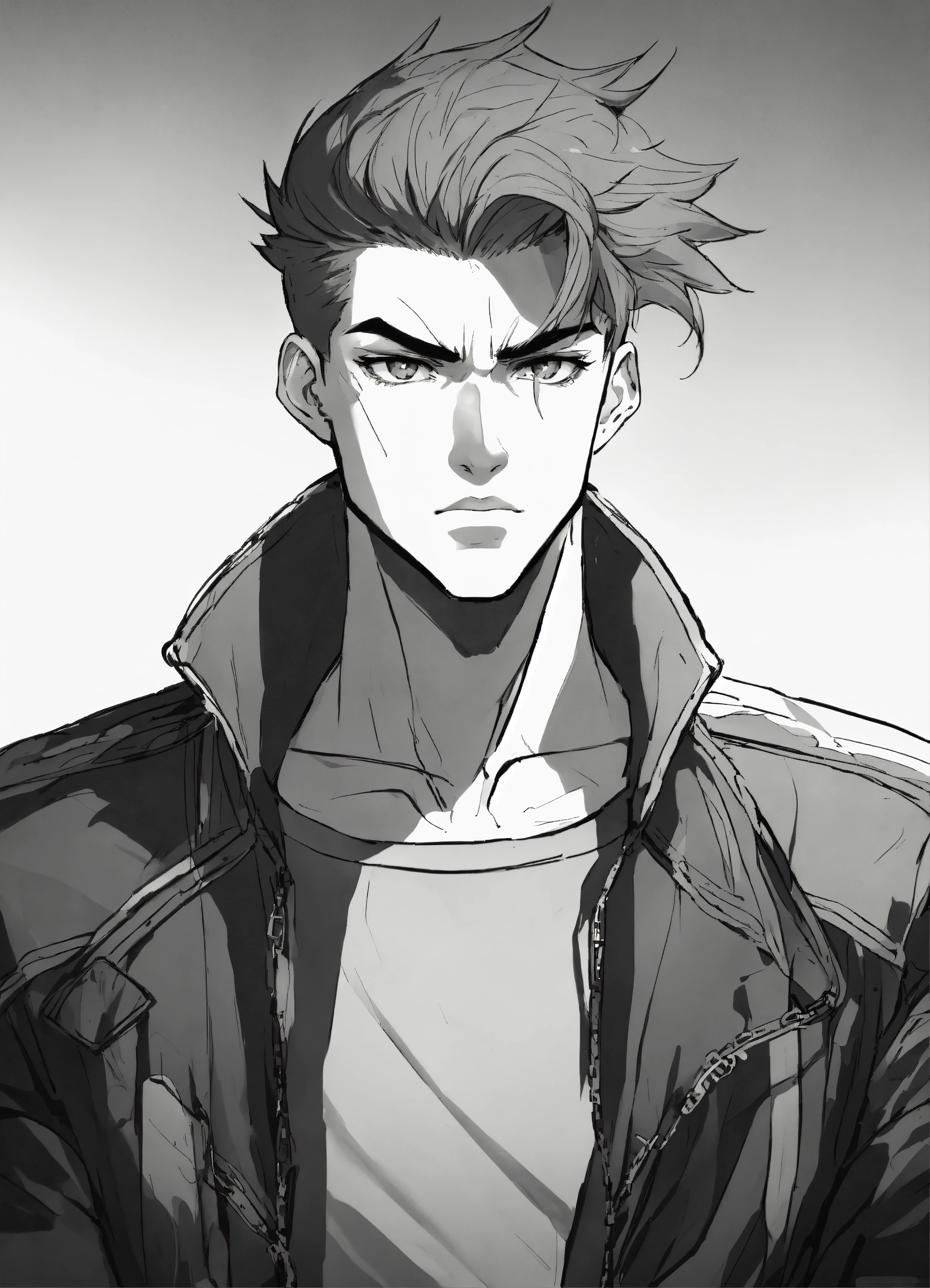 A black and white illustration of a 23-year-old man, masculine, super confident, starring at camera, strong jawline, death stare, anime hair