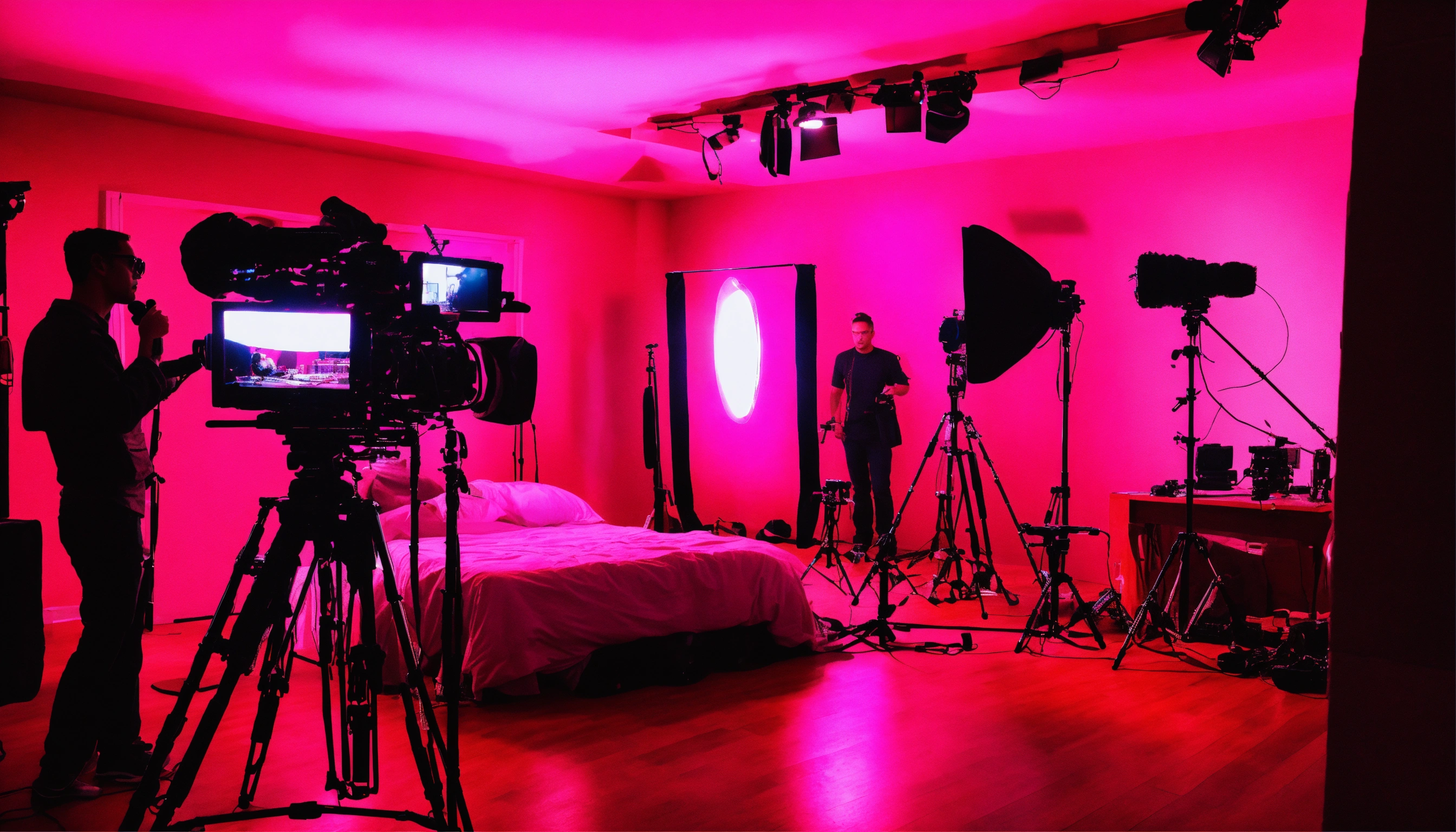Bedroom music video shoot, lights, cameras, music video cameras, film gear, brightly lit, hot pink, film crew, wide shot