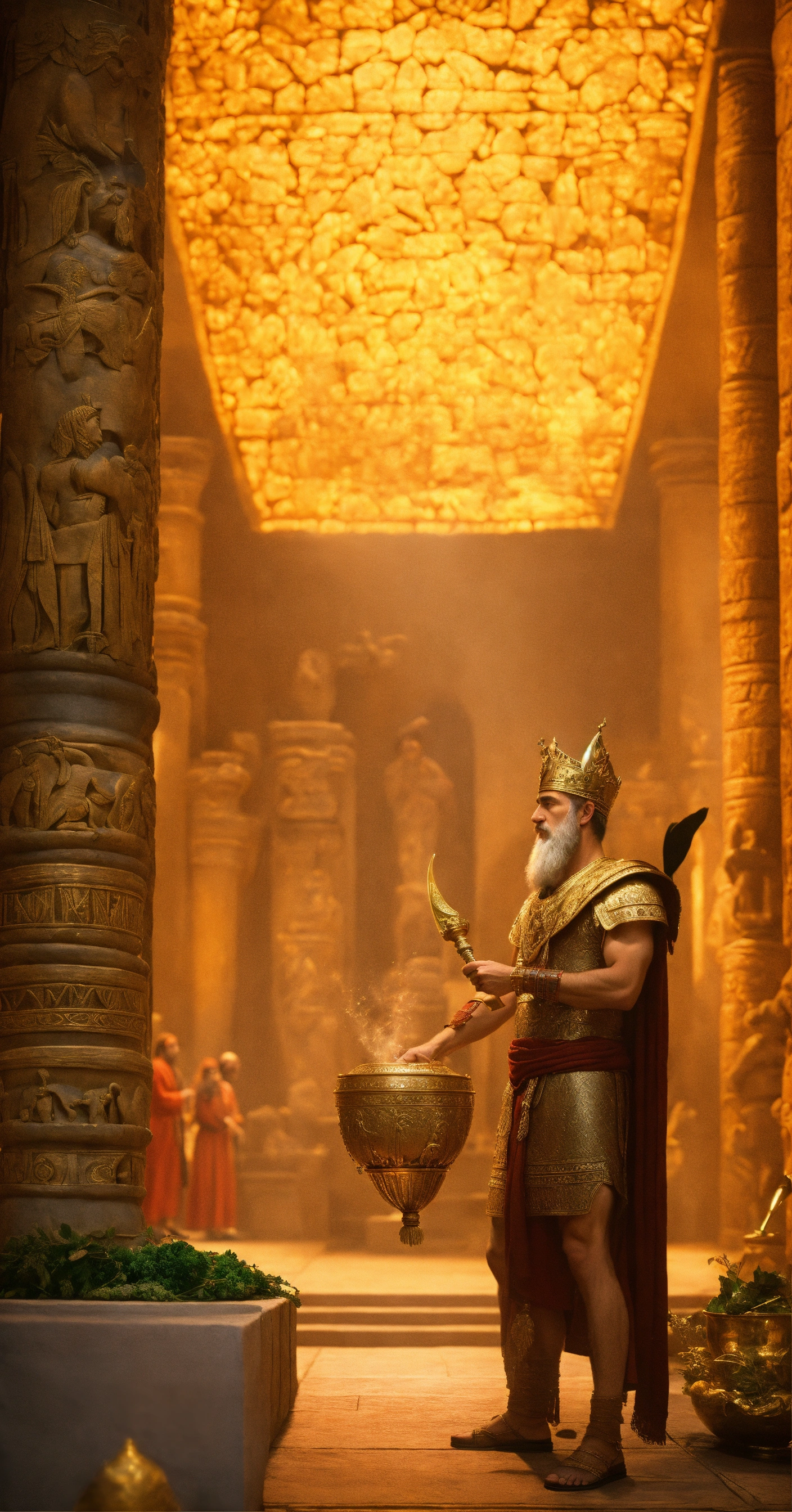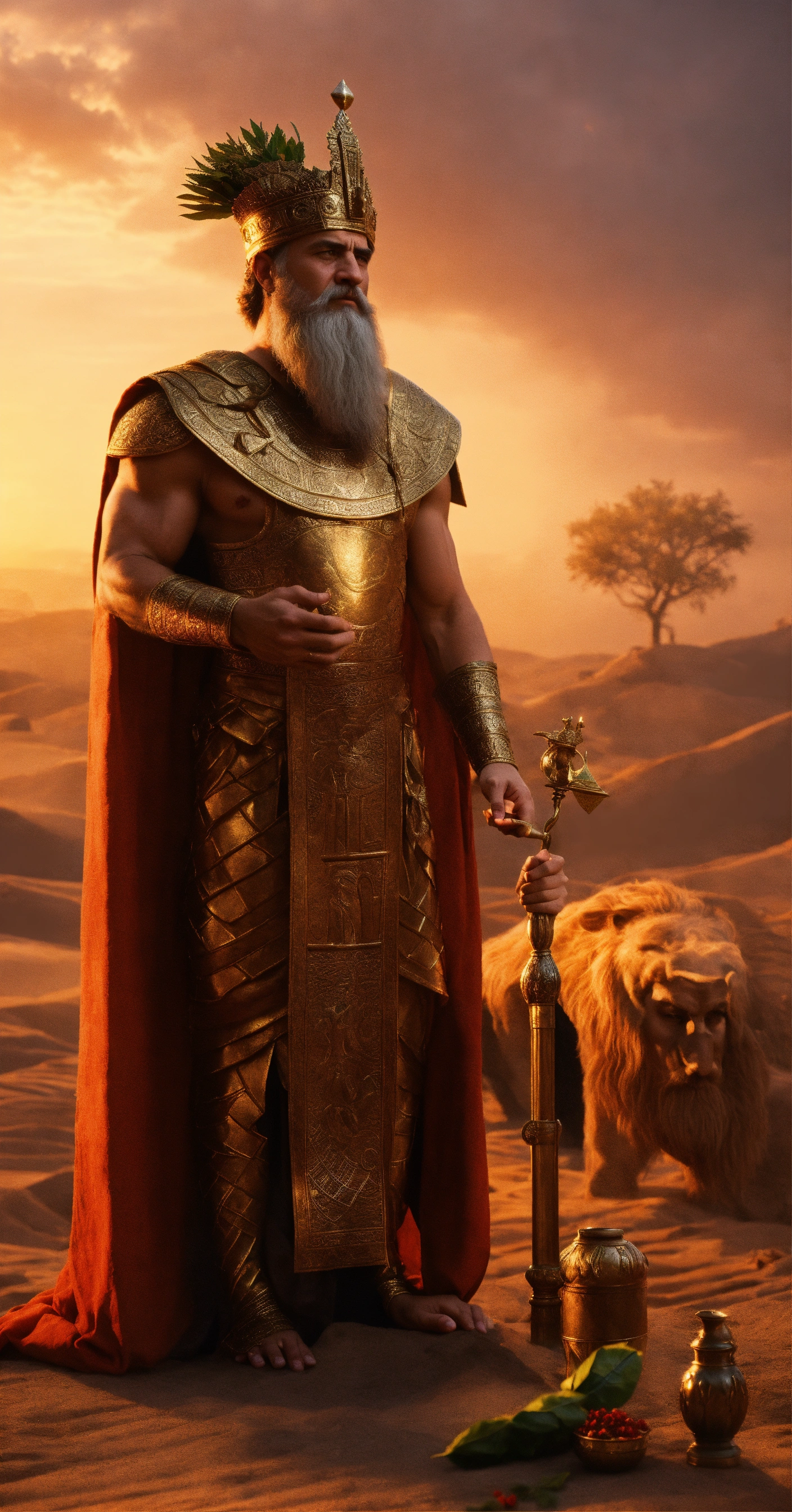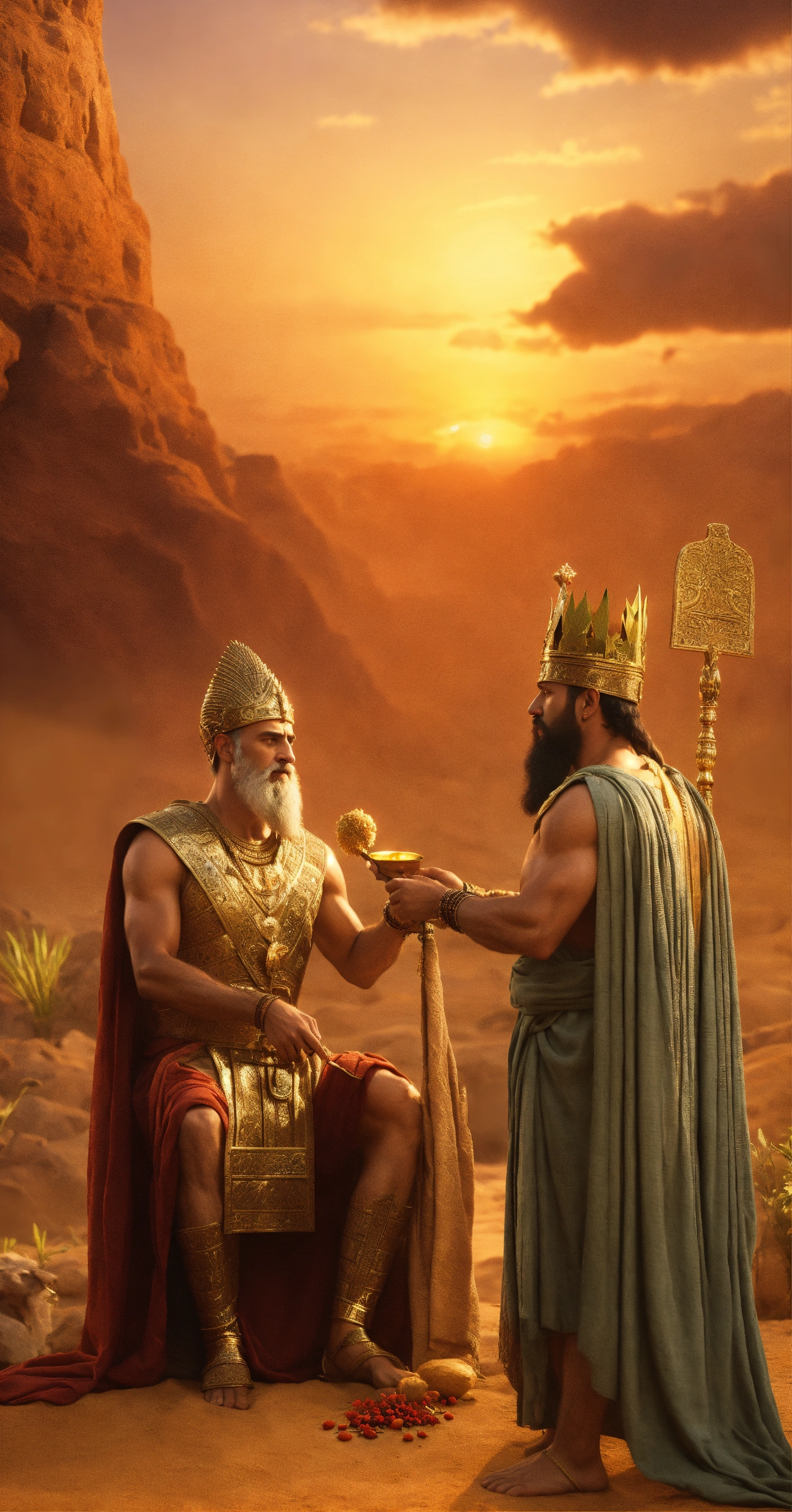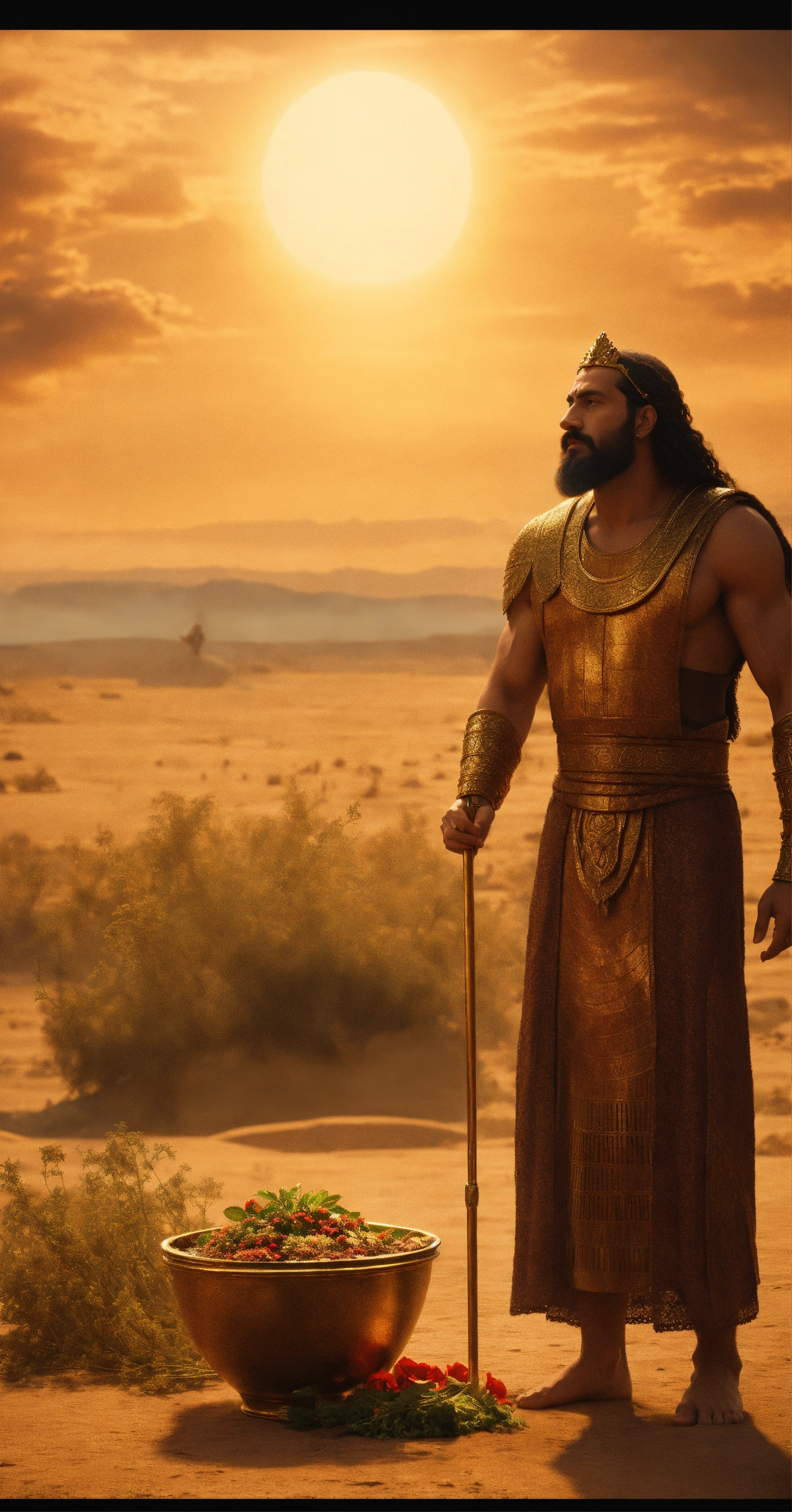 Sumerian king gilgamesh receives the herb of immortality from the prophet noah at dawn, cinematic, 8k