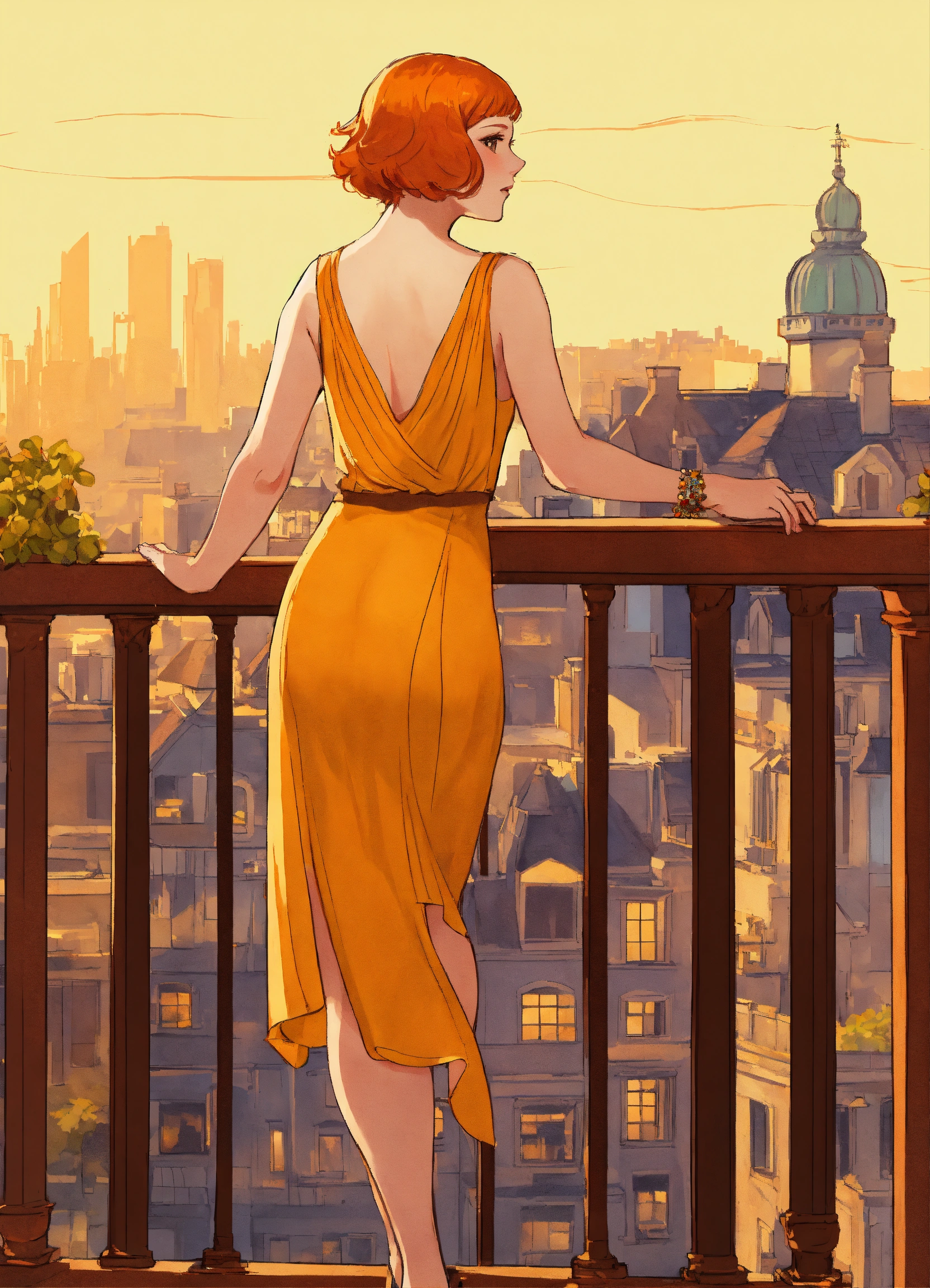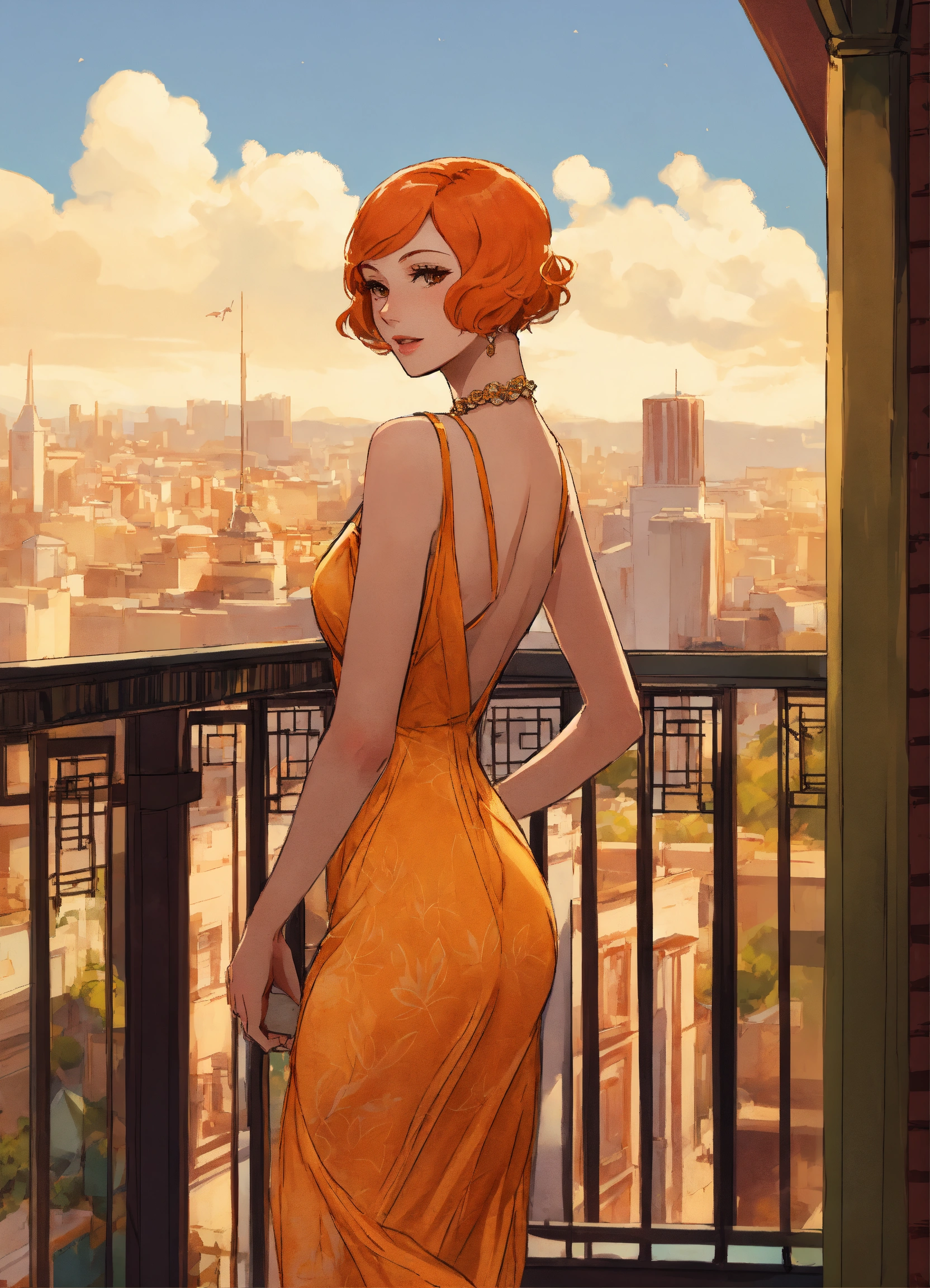 Character art of a woman in a yellow-orange flapper dress with a deep, plunging neckline and short ginger hair, standing on a balcony overlooking a city.