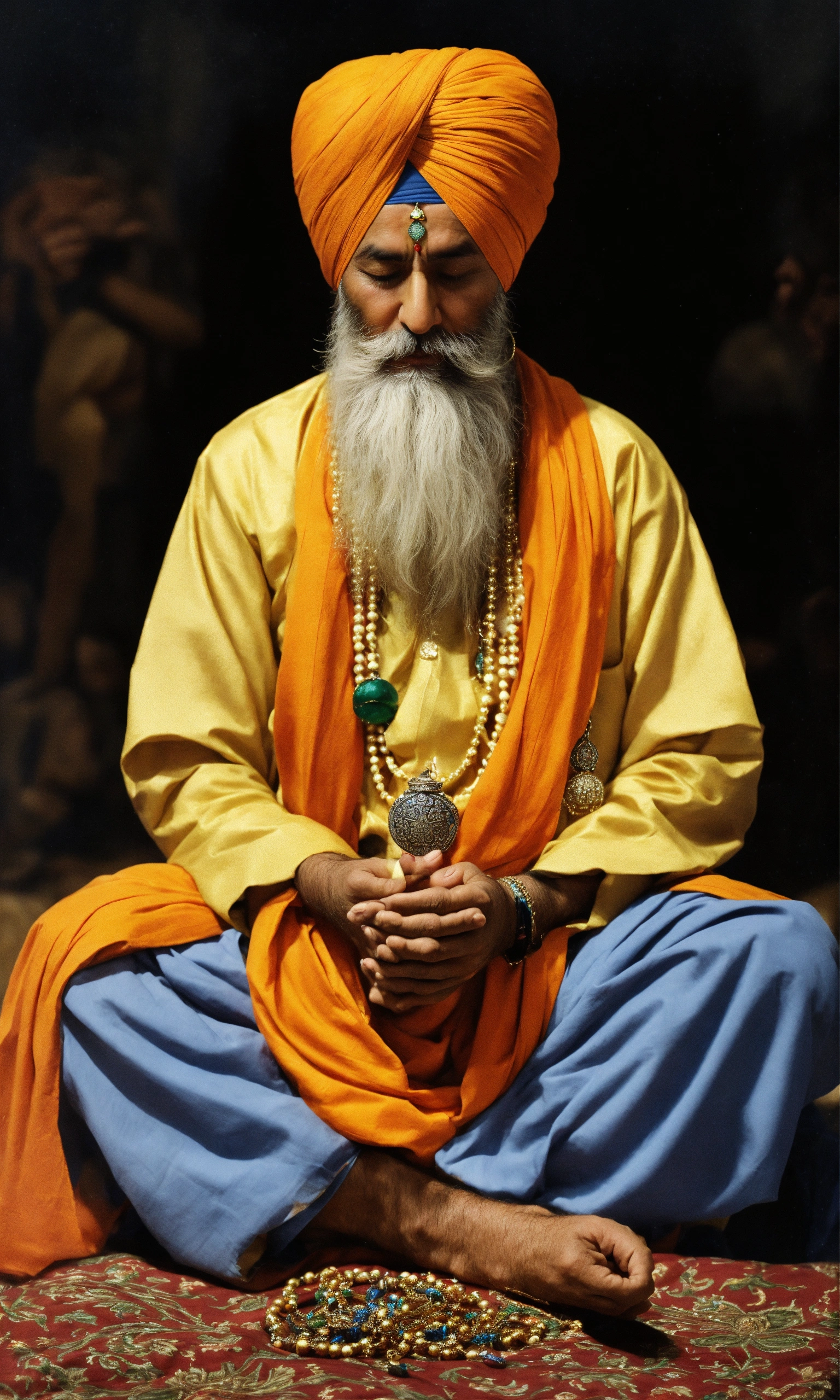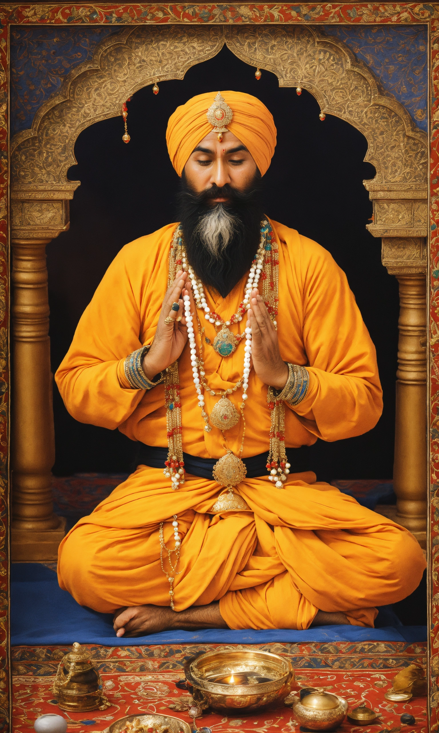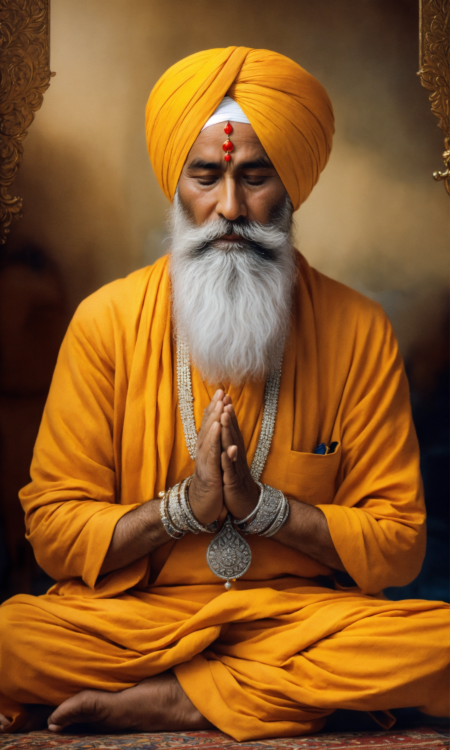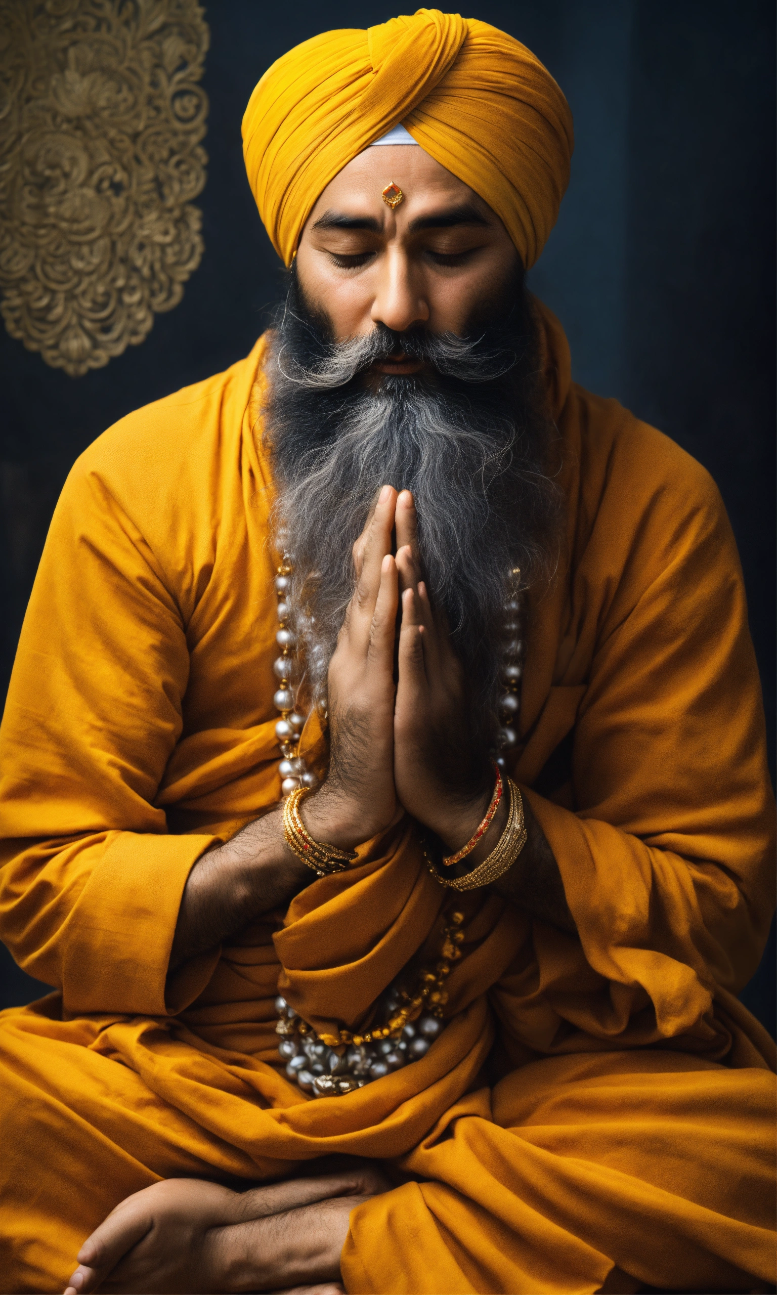 Gur sikh, khalsa, not wearing any jewelryornaments- no ornaments, without -decoration, not wearing any thing on finger, not wearing any thing on wrist, not wearing any thing on finger, wrist, forehead, wrist, turbaned sikh guru praying, folded hands, closed eyes