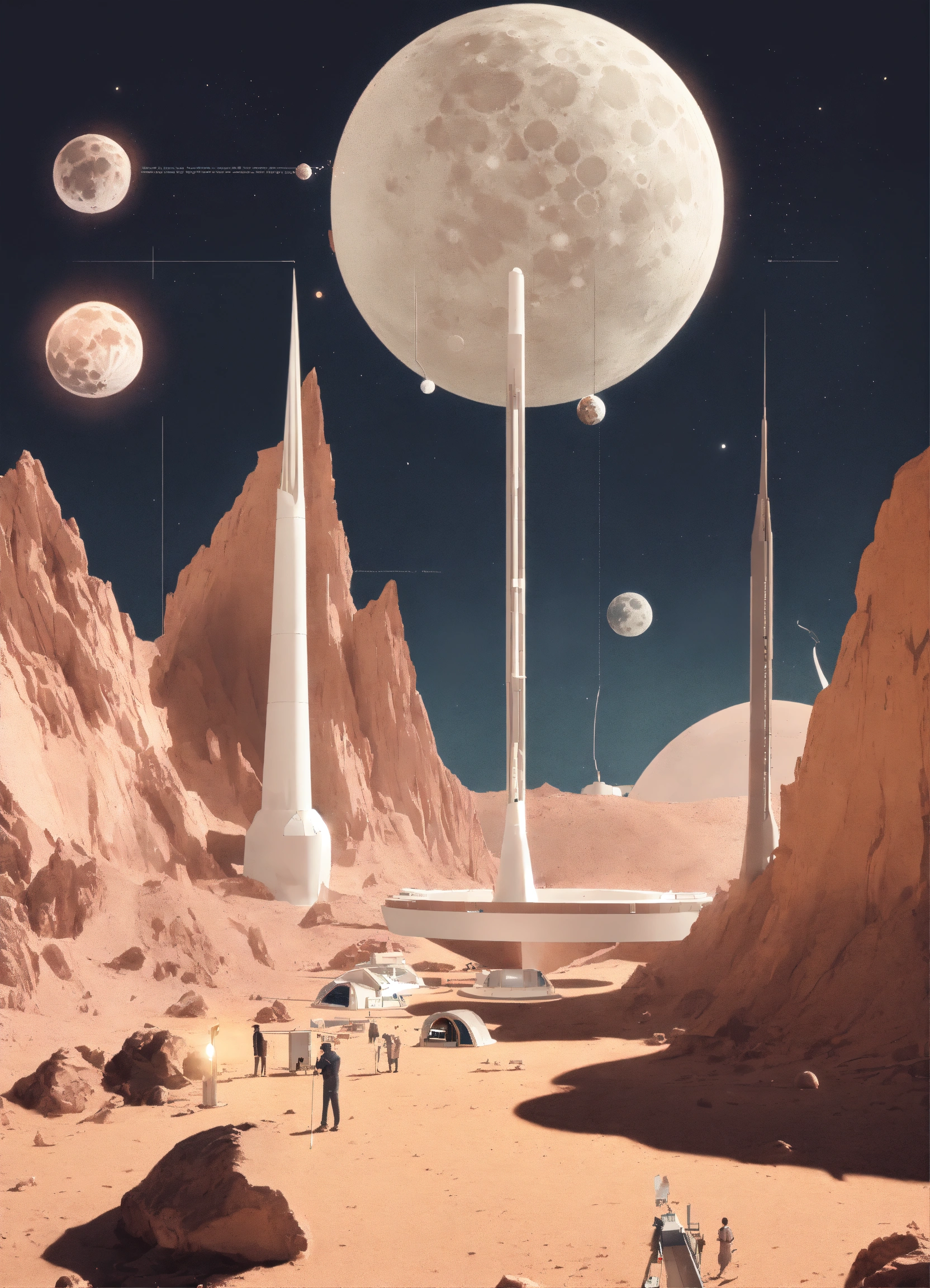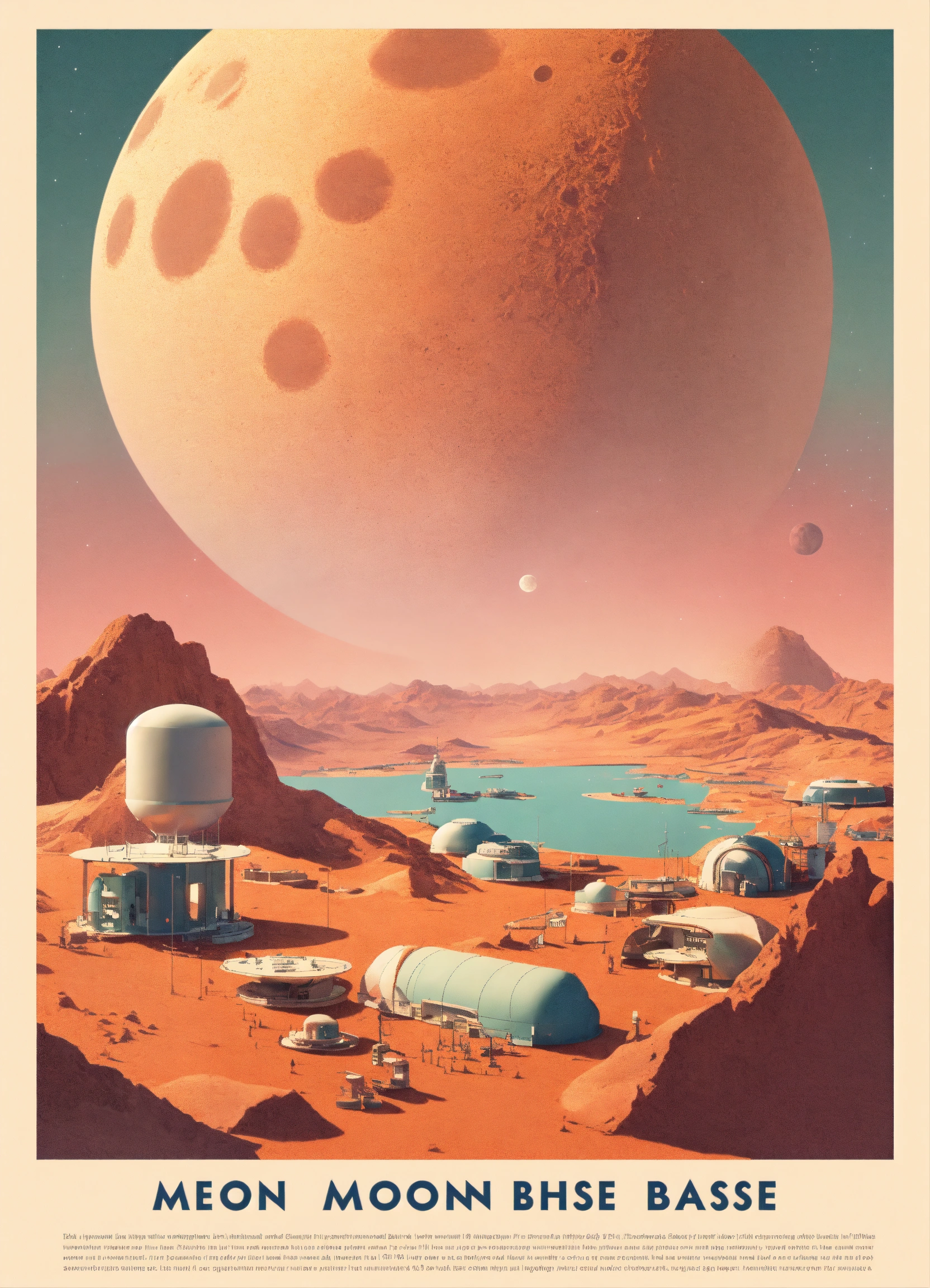 Beautiful award winning 1950s simple flat 3d art editorial infographics of a moon base, pale colors, perfect focus, neutral white background, epic angle, epic composition, hyper maximalist