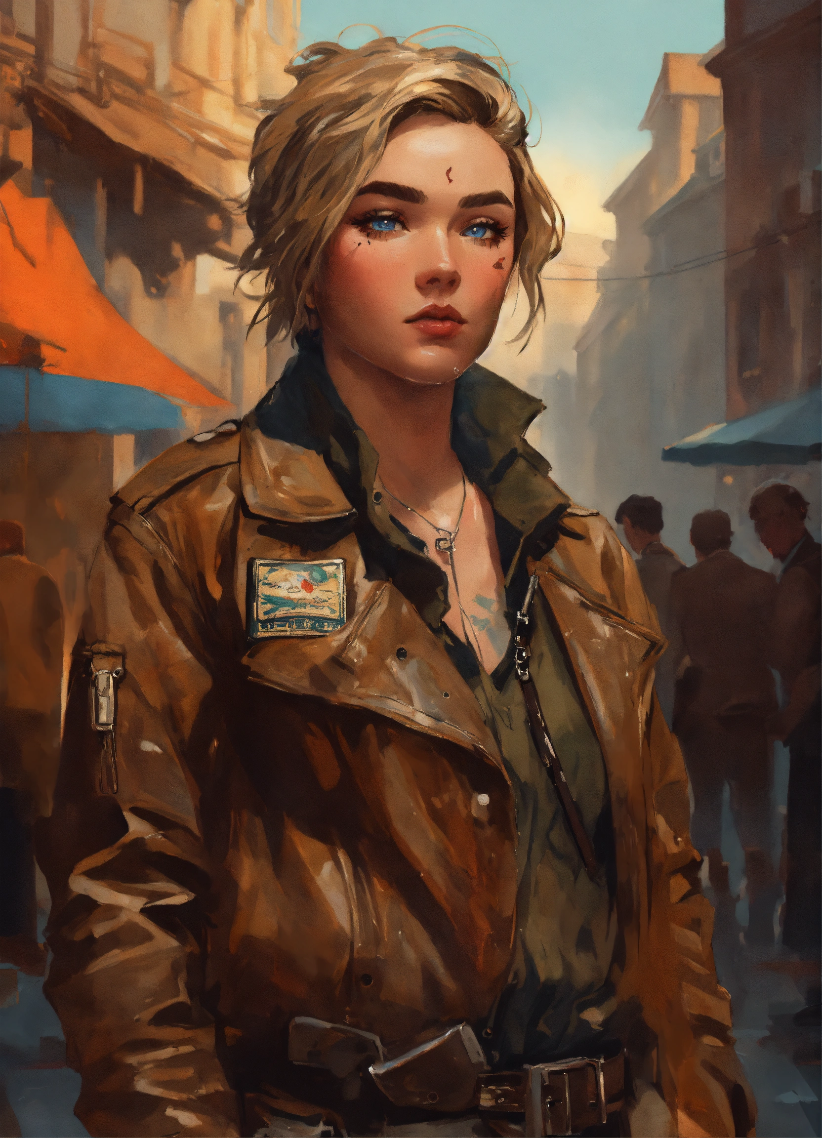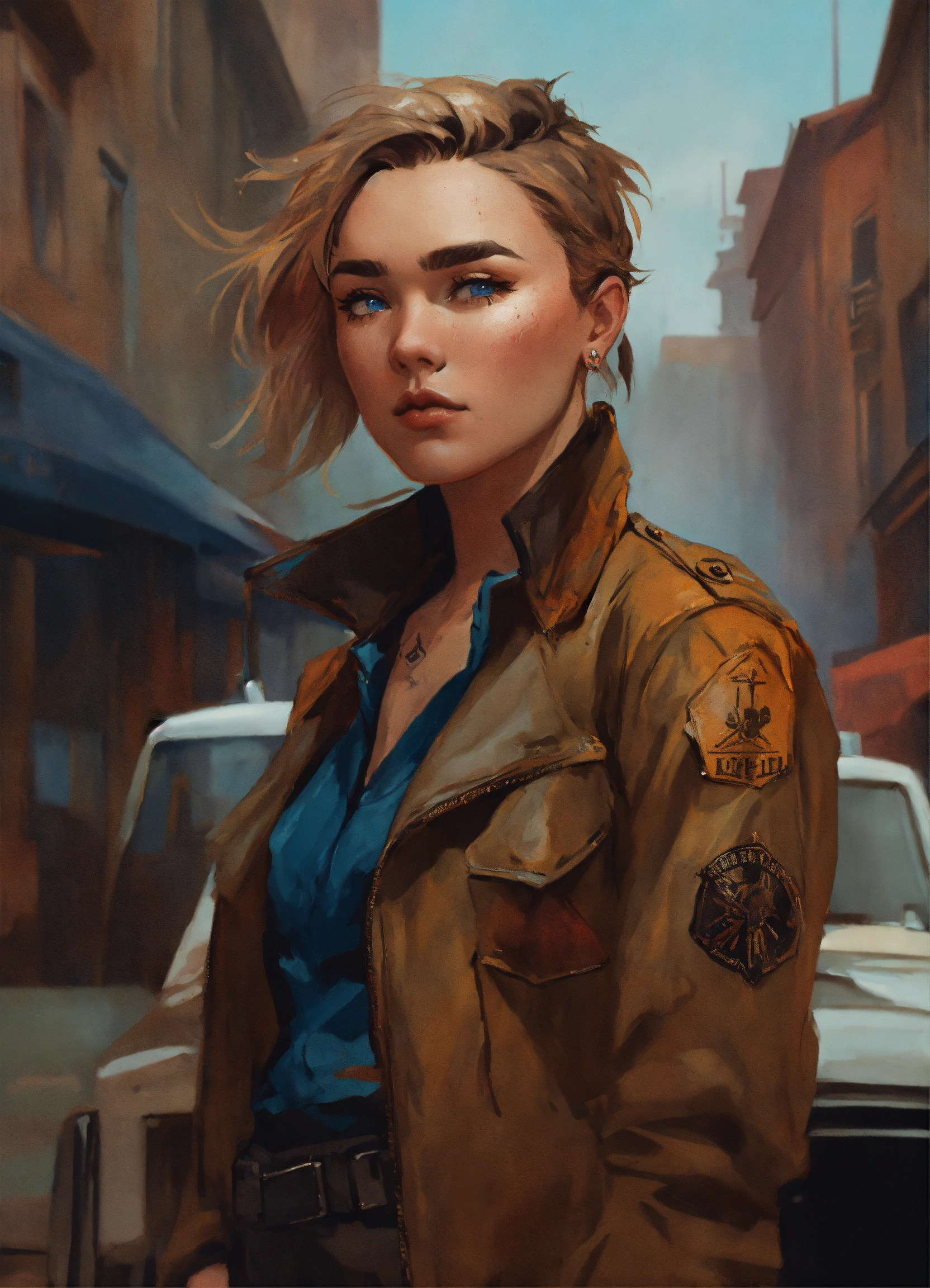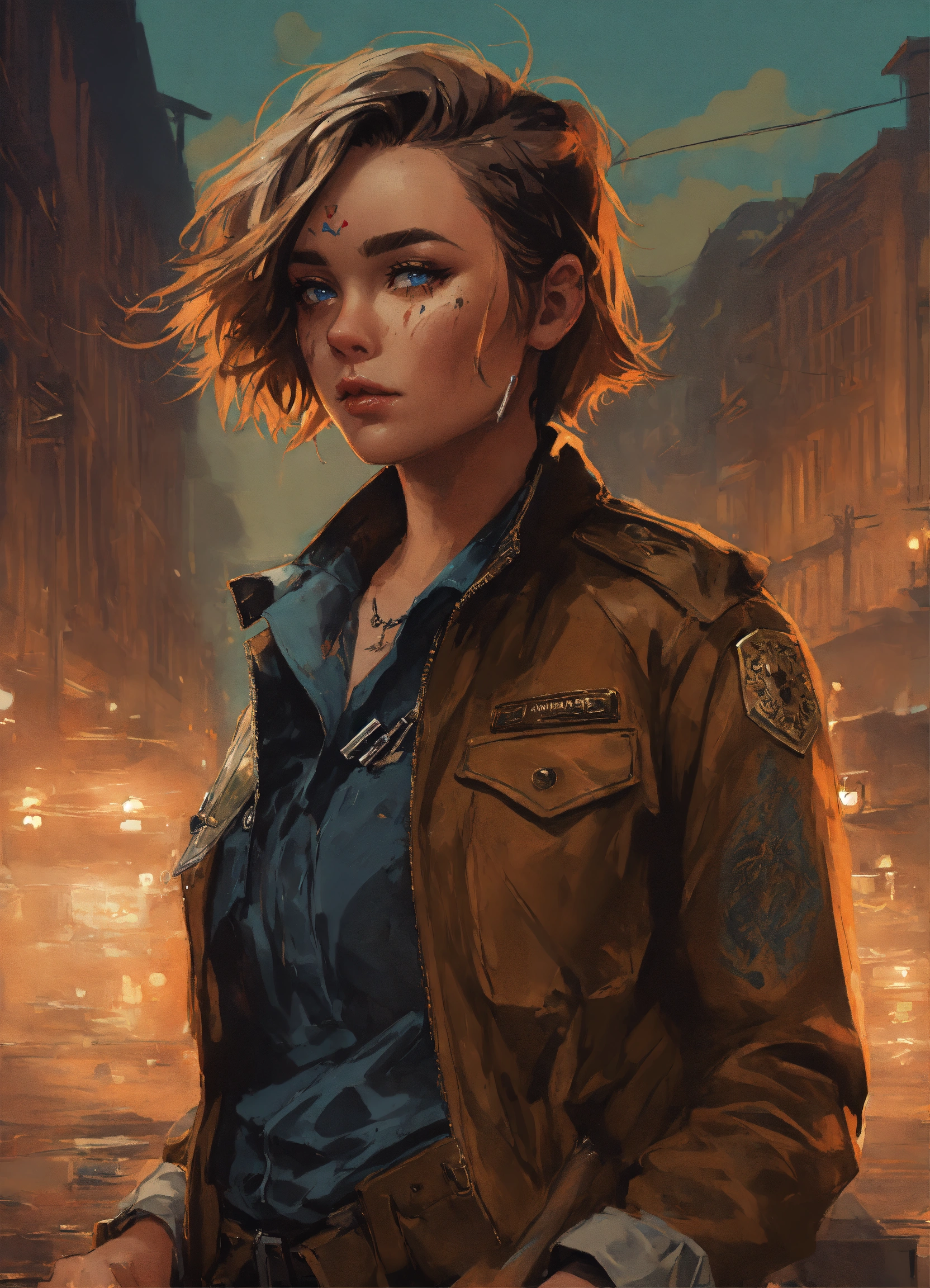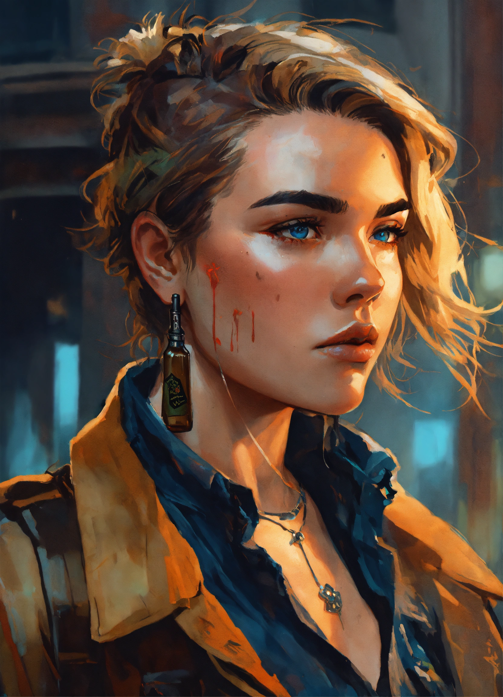 Highly detailed portrait of a dirty lady mercenary, florence pugh, smoking cigarette, glass bottle of whiskey, neck tattoo knife, faded leather worker jacket, white undershirt, black tactical trousers, black combat boots, blue eyes, smeared mascara, brown hair, messy bob haircut, bandaged knuckles, by atey ghailan, by greg rutkowski, by greg tocchini, by james gilleard, by joe fenton, by kathe butcher, gradient brown, black, and umber color scheme. raining 1920s city background