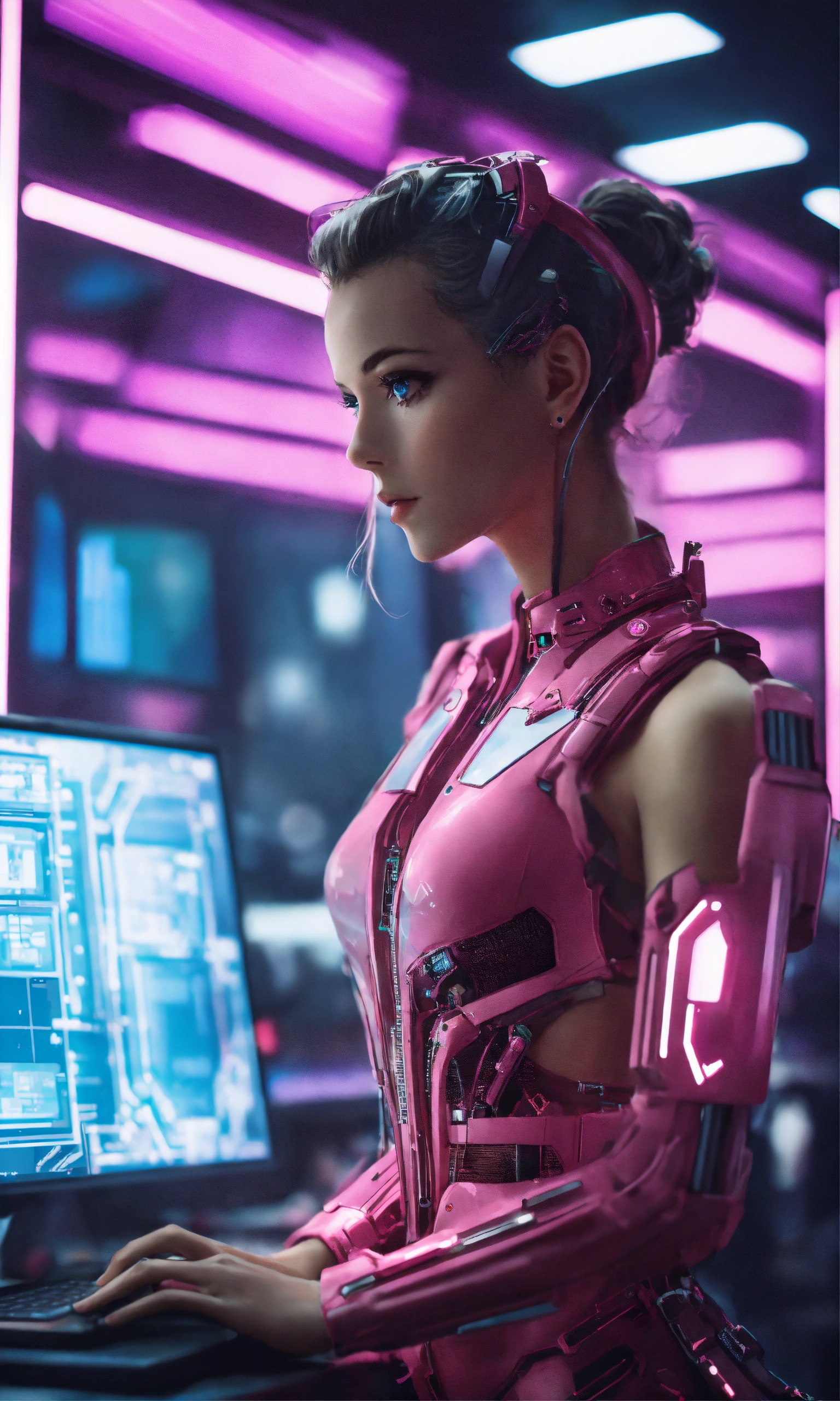 Woman in pink dress, futuristic laboratory with computer screens, portrait, cyberpunk style, ultra detailed, 4k