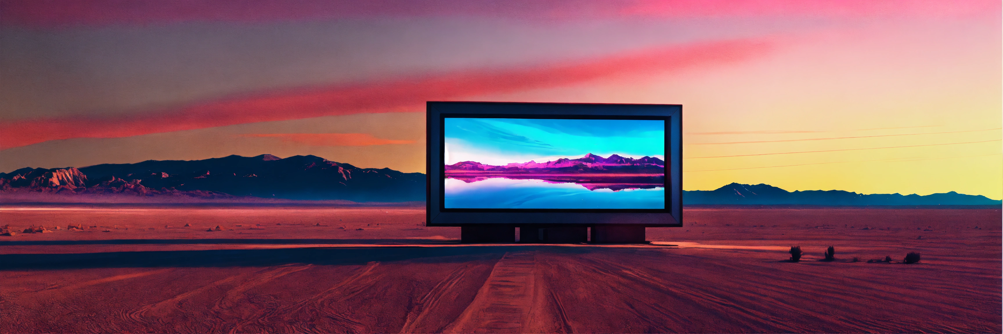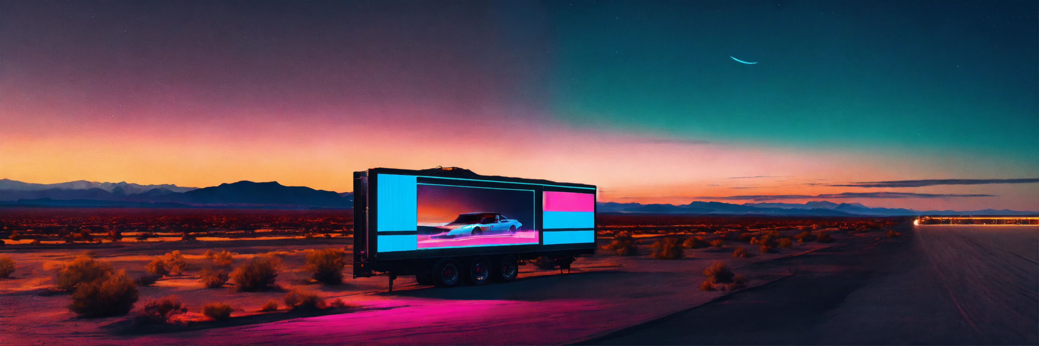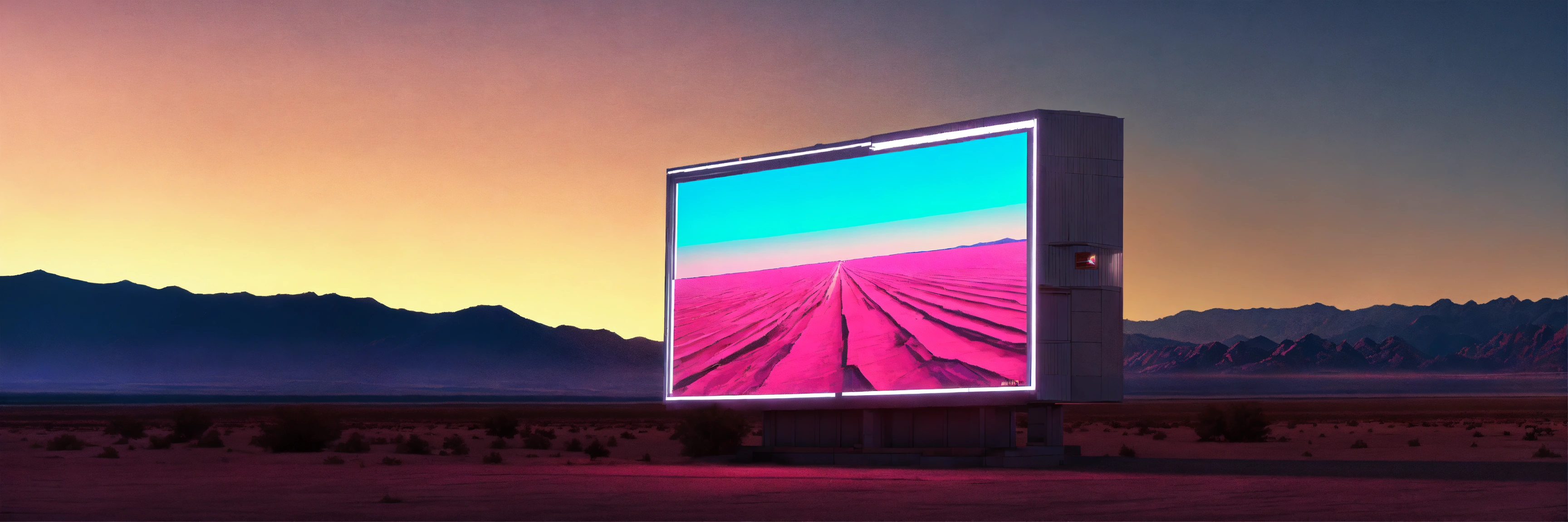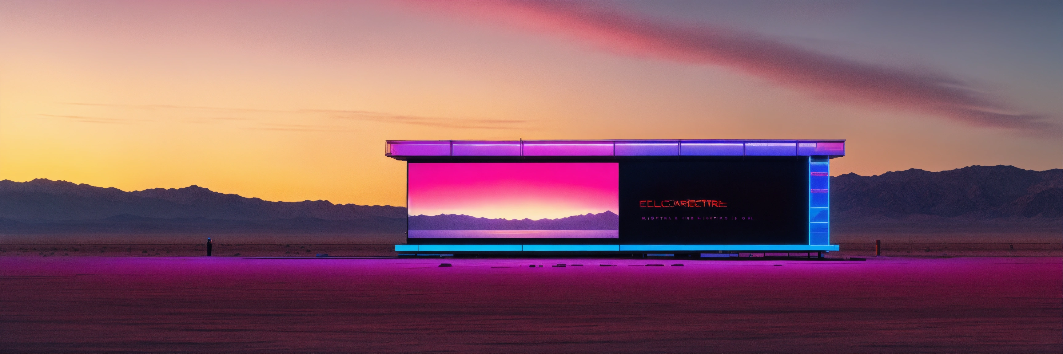 A beautiful, sharp focus, massive square electric advertising board. in the middle of black rock desert. it is night time and dark. wide angle. vaporwave ombre rendering. outrun style. by chris moore. by edward hopper. beeple colors. ambient occlusion. digital matte painting. metropolis filmic.