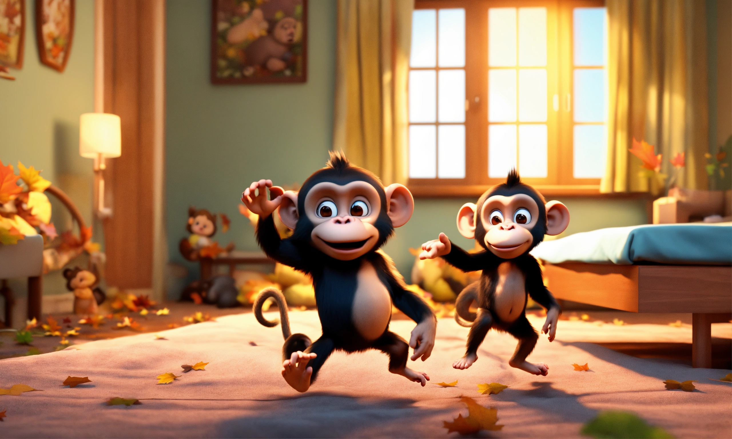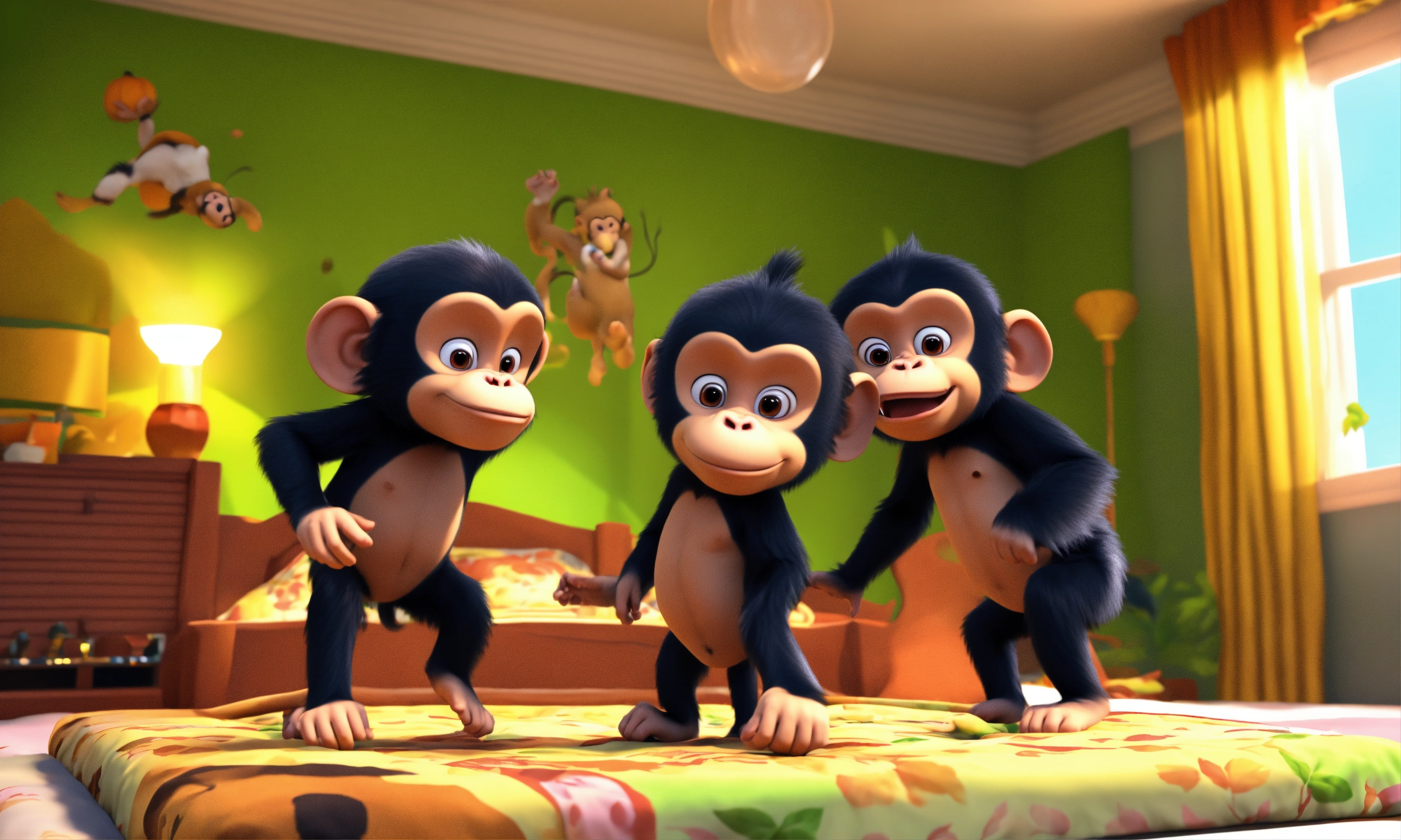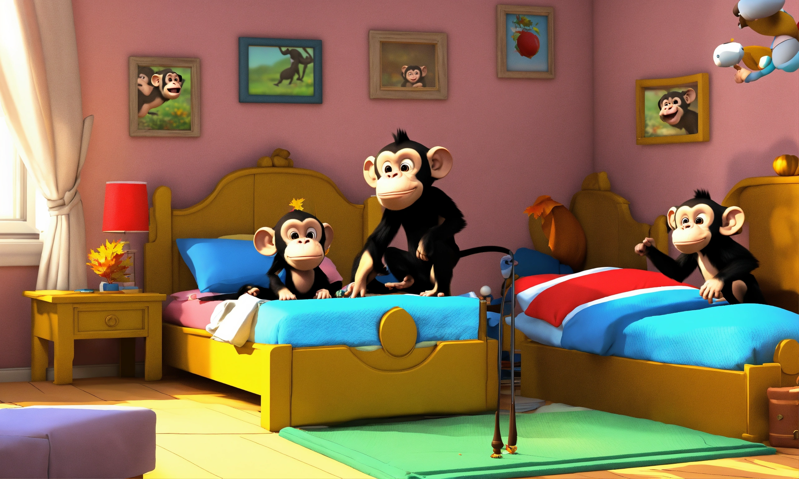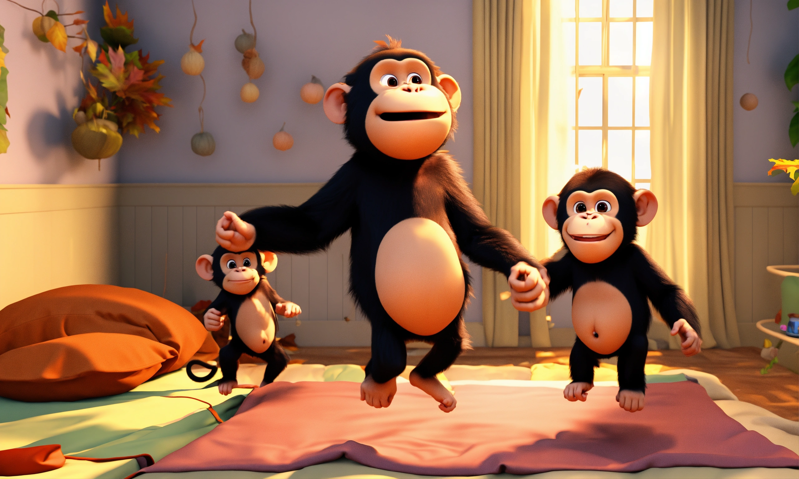 Two little monkeys jumping on the bed, and one chimpanzee is fall down on his head. 3d cartoon animation.