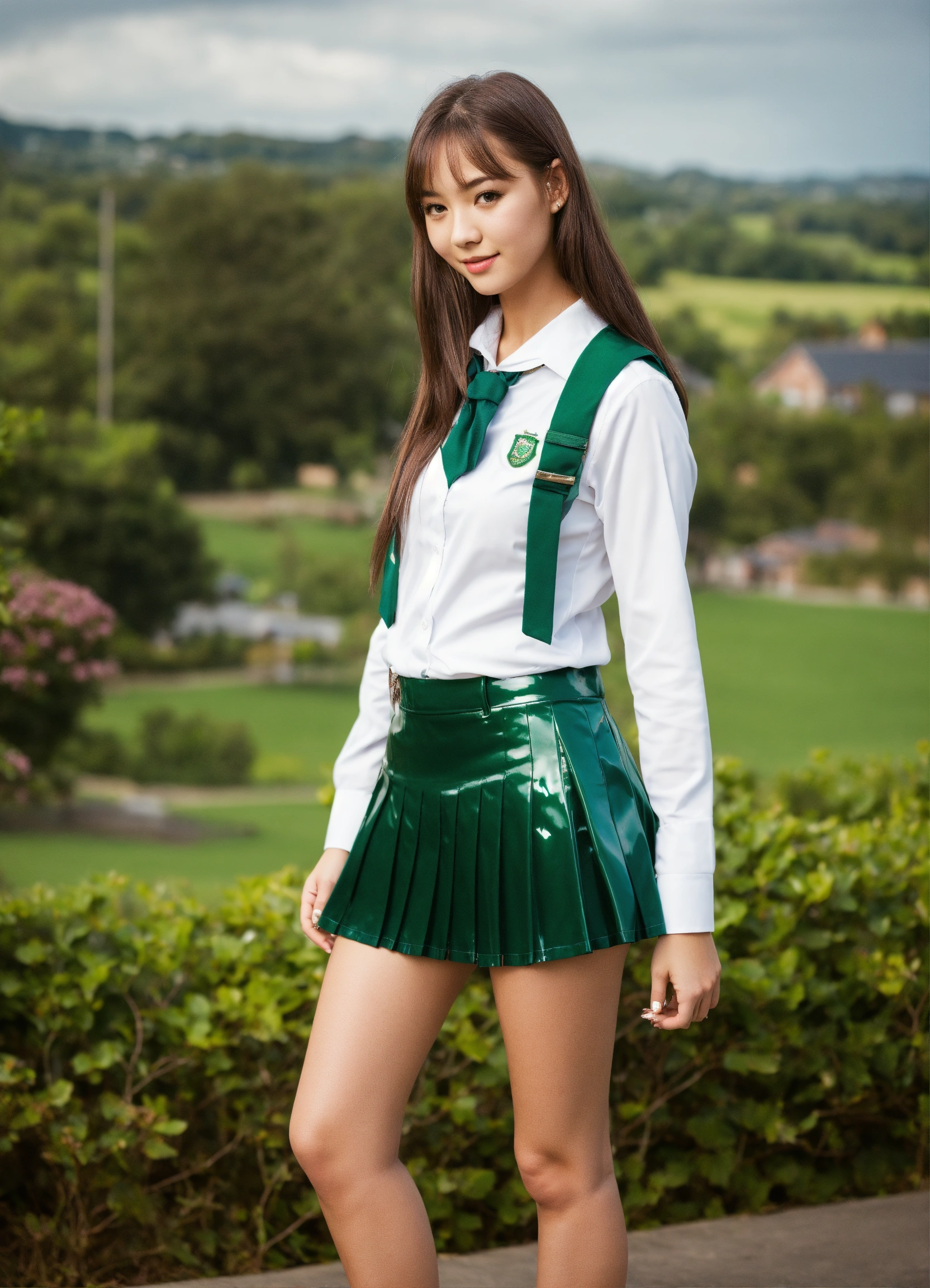 Girl in glossy green school uniform miniskirt
