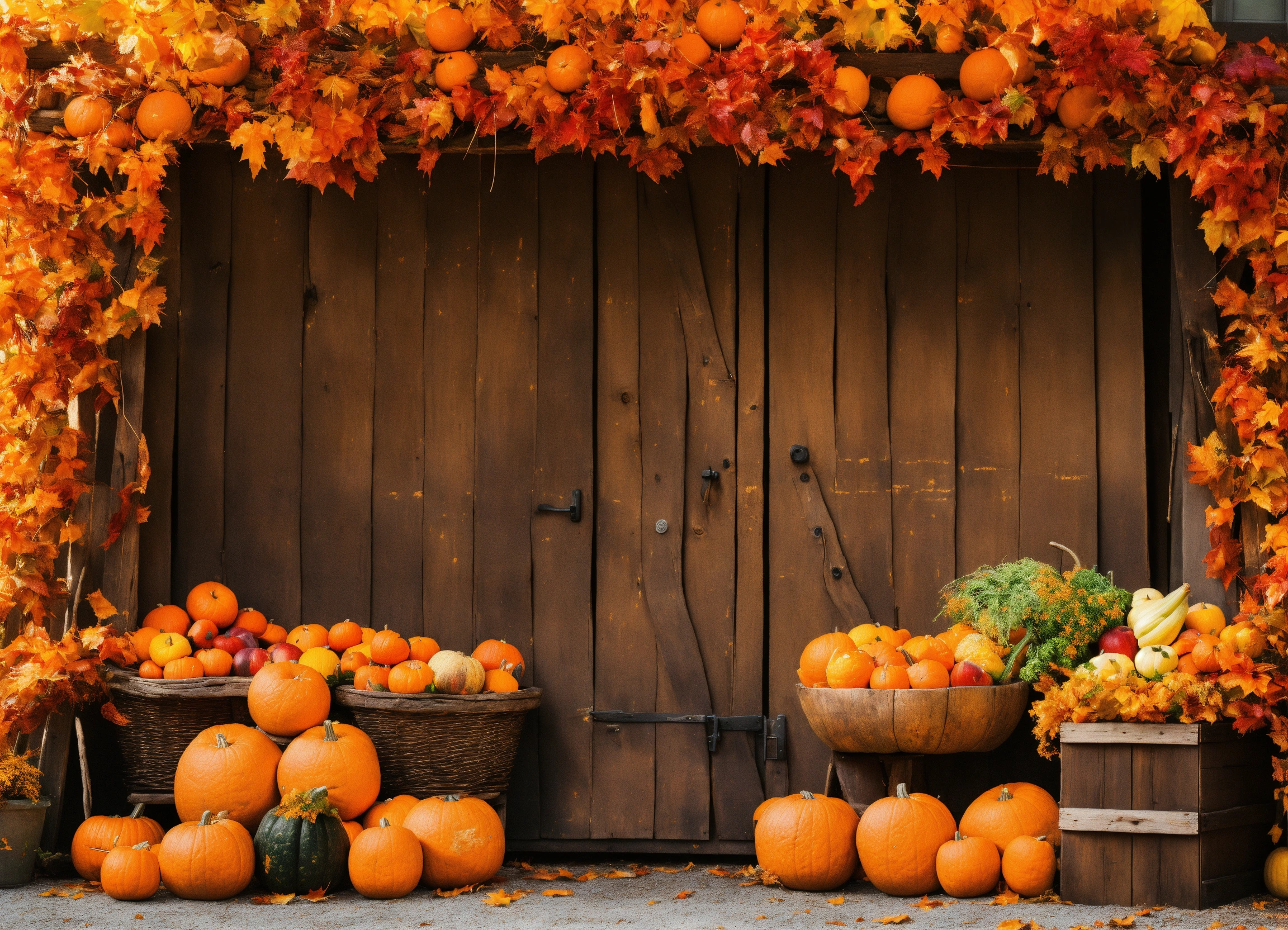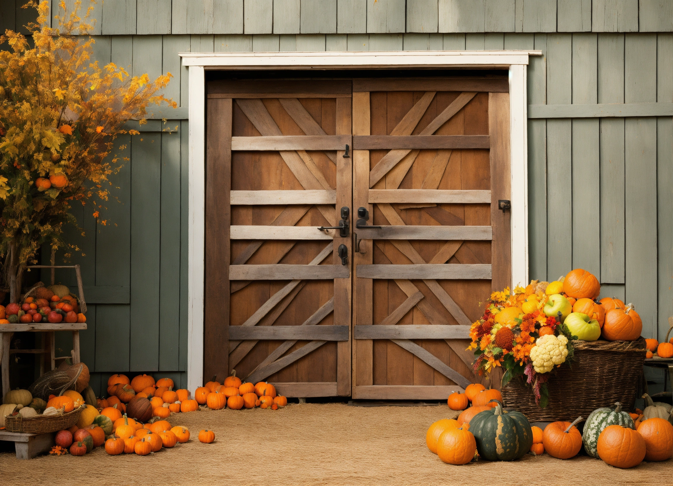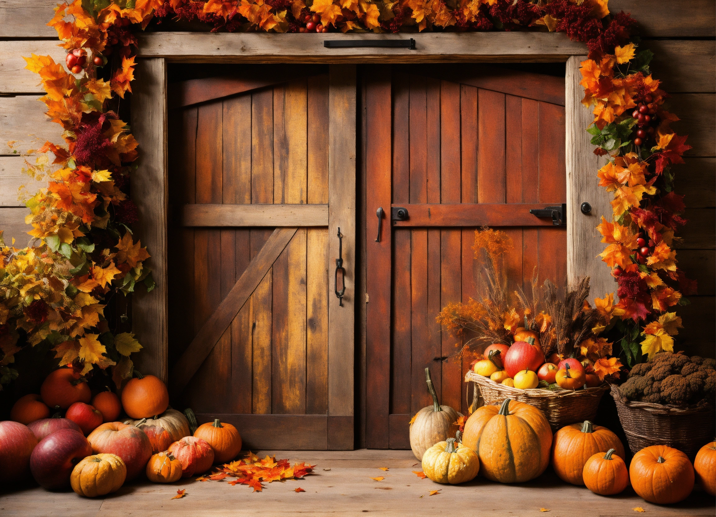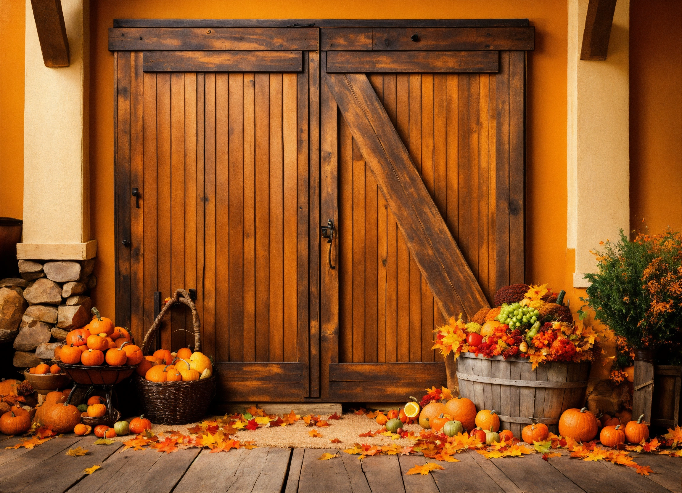 Create a large, detailed painting of a rustic barn door with a wooden frame, adorned with autumn decorations. the door should be surrounded by a variety of fruits, vegetables, and flowers, including apples, oranges, pumpkins, and squash. the scene should be set in a minimalist style, possibly with a wooden floor and a warm light source. the painting should capture the essence of fall and the abundance of nature's harvest.