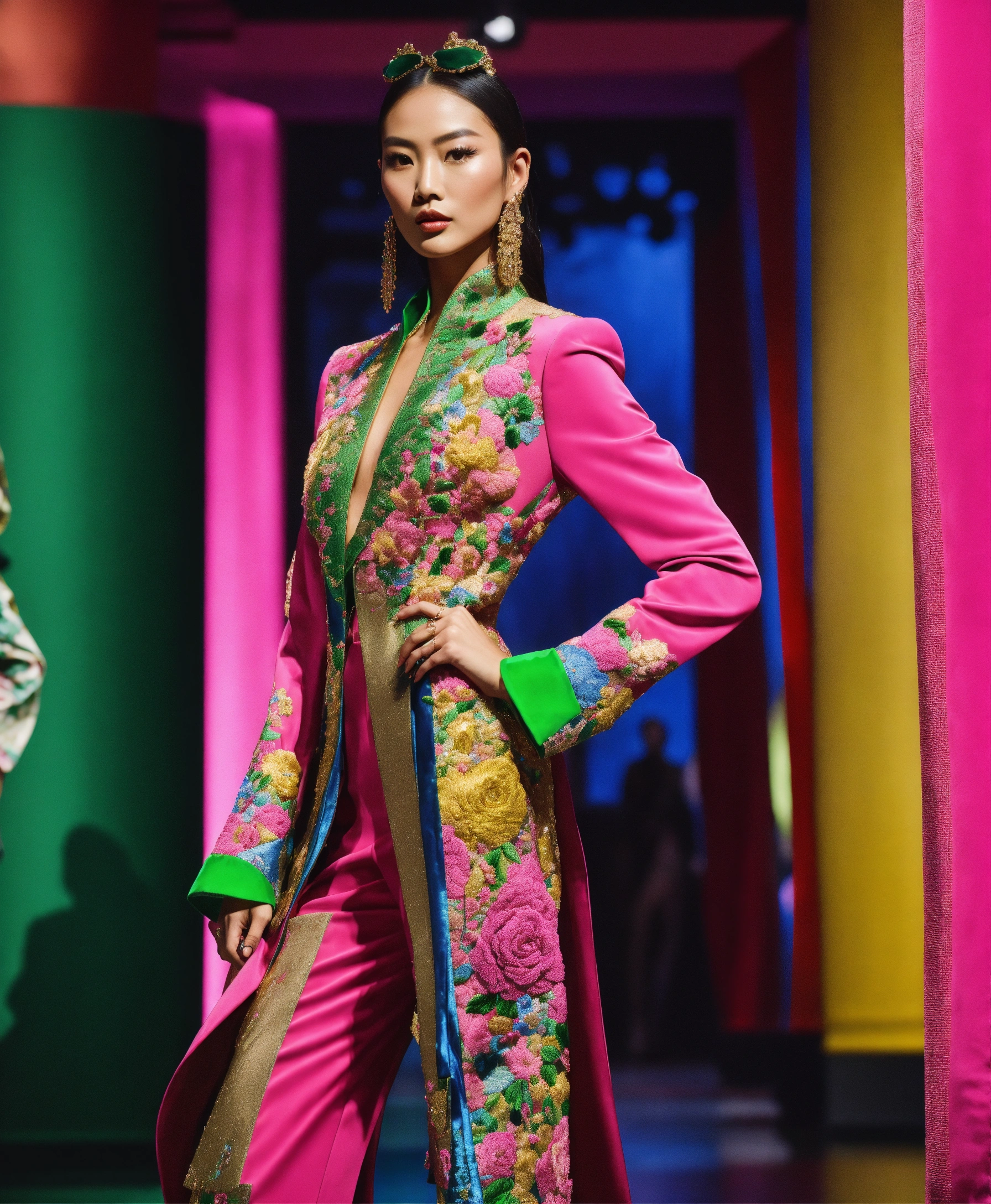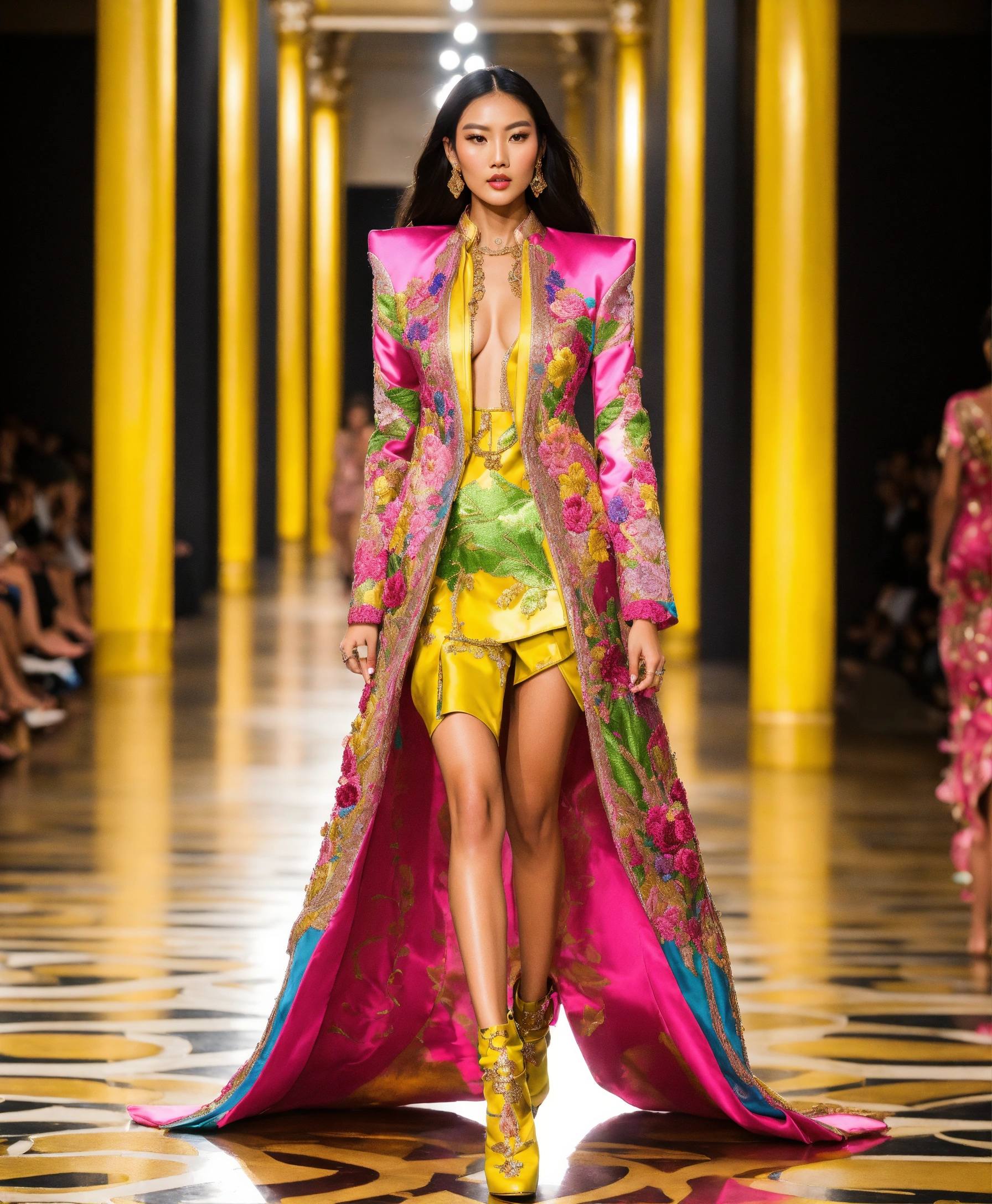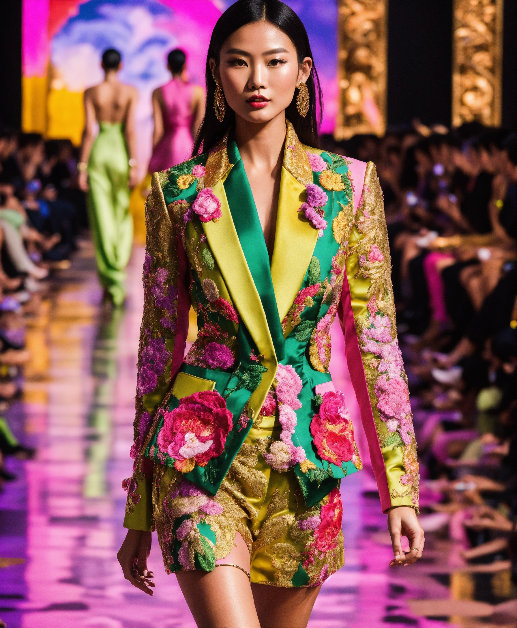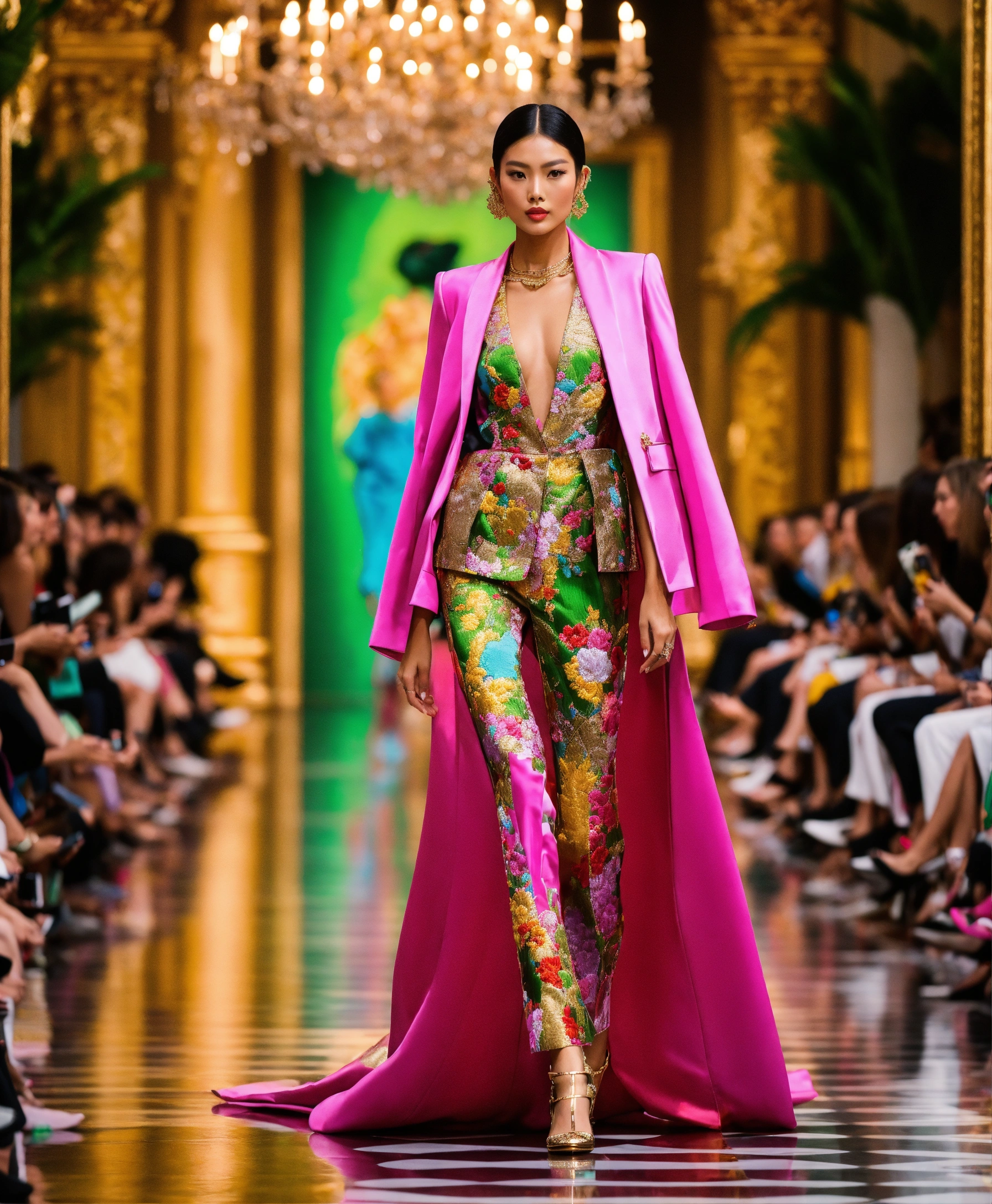 Ultra realistic full body photo of a stylish beautiful asian runway model walking the runway modeling summer cruise designer wear brave, paris versailles details cutouts and gold geometric pattern floral structured tailored jacket pink gold green lilac peridot silver magenta lime fuchsia yellow blue black gray copper mauve bronze haute couture embroidered contrasting colors vivid intricate bold vibrant glamorous ultimate elegance beautiful luxurious awesome wealthy opulent exquisite resplendent magnificent sublime 12k