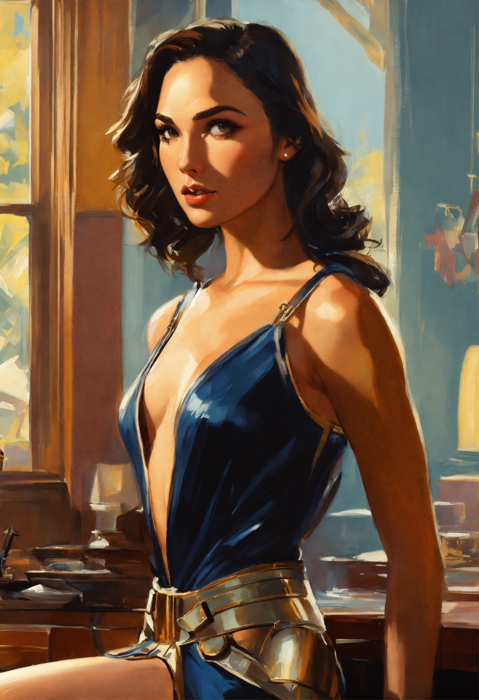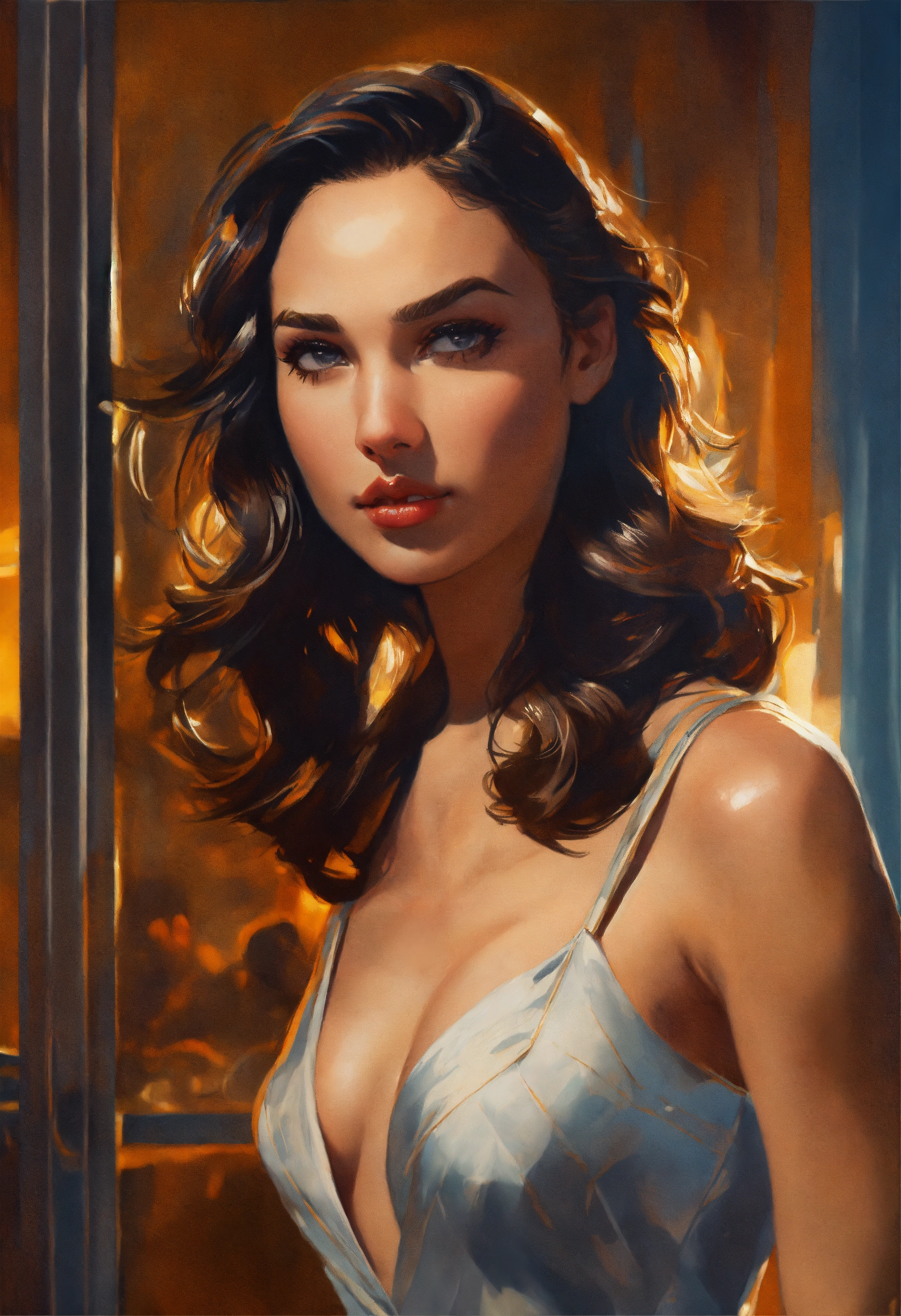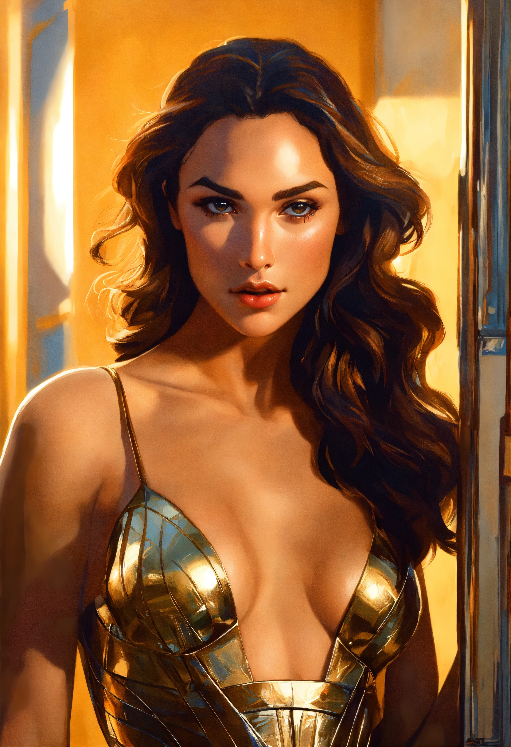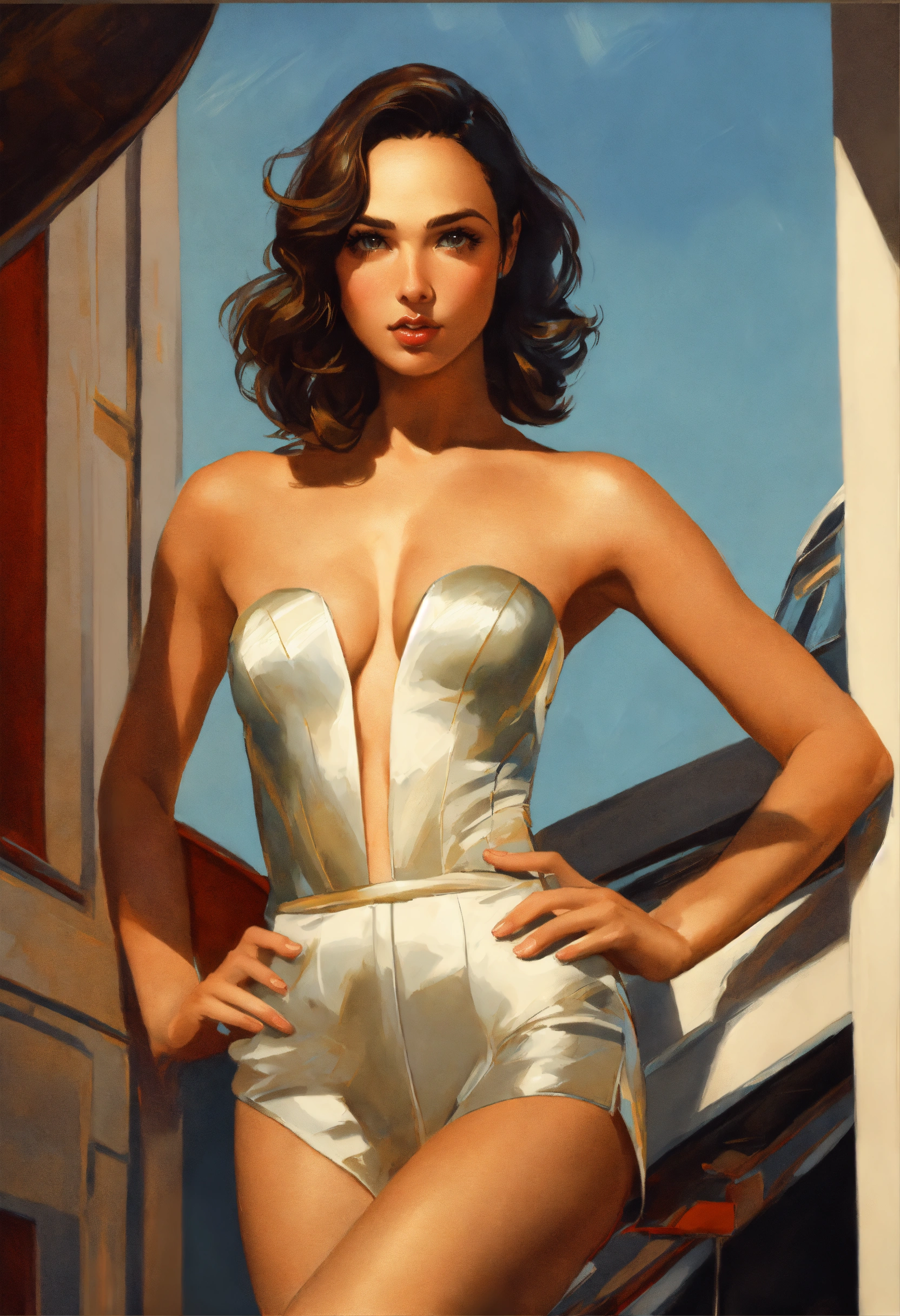 Beautiful attractive, gorgeous, gal gadot, from the front, gil elvgren, syd mead, wide portrait high detail