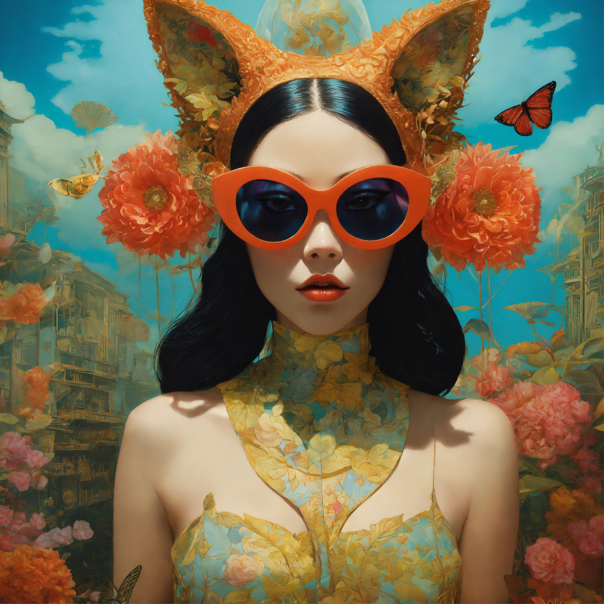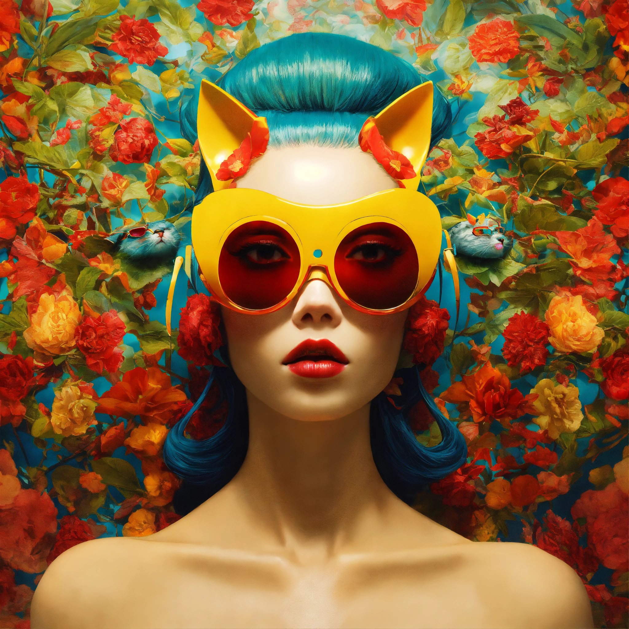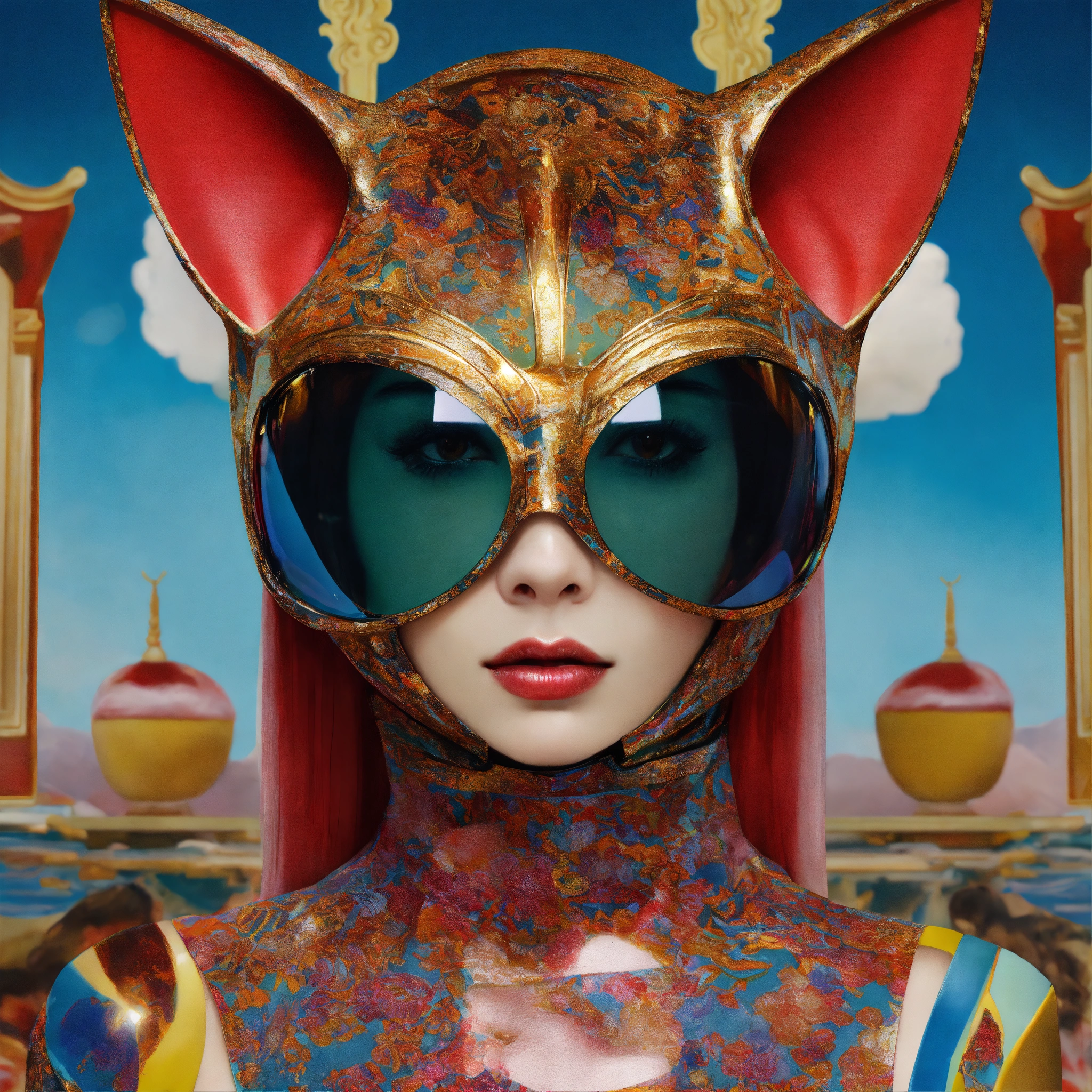 Text vibrant veneers and color front portrait photography, a woman's face in an asian american cat woman mask with sunglasses, emerges from a computer in an attractive plexiglass body, worm's eye view, art by sergio lopez, natalie shau, james jean and salvador dali