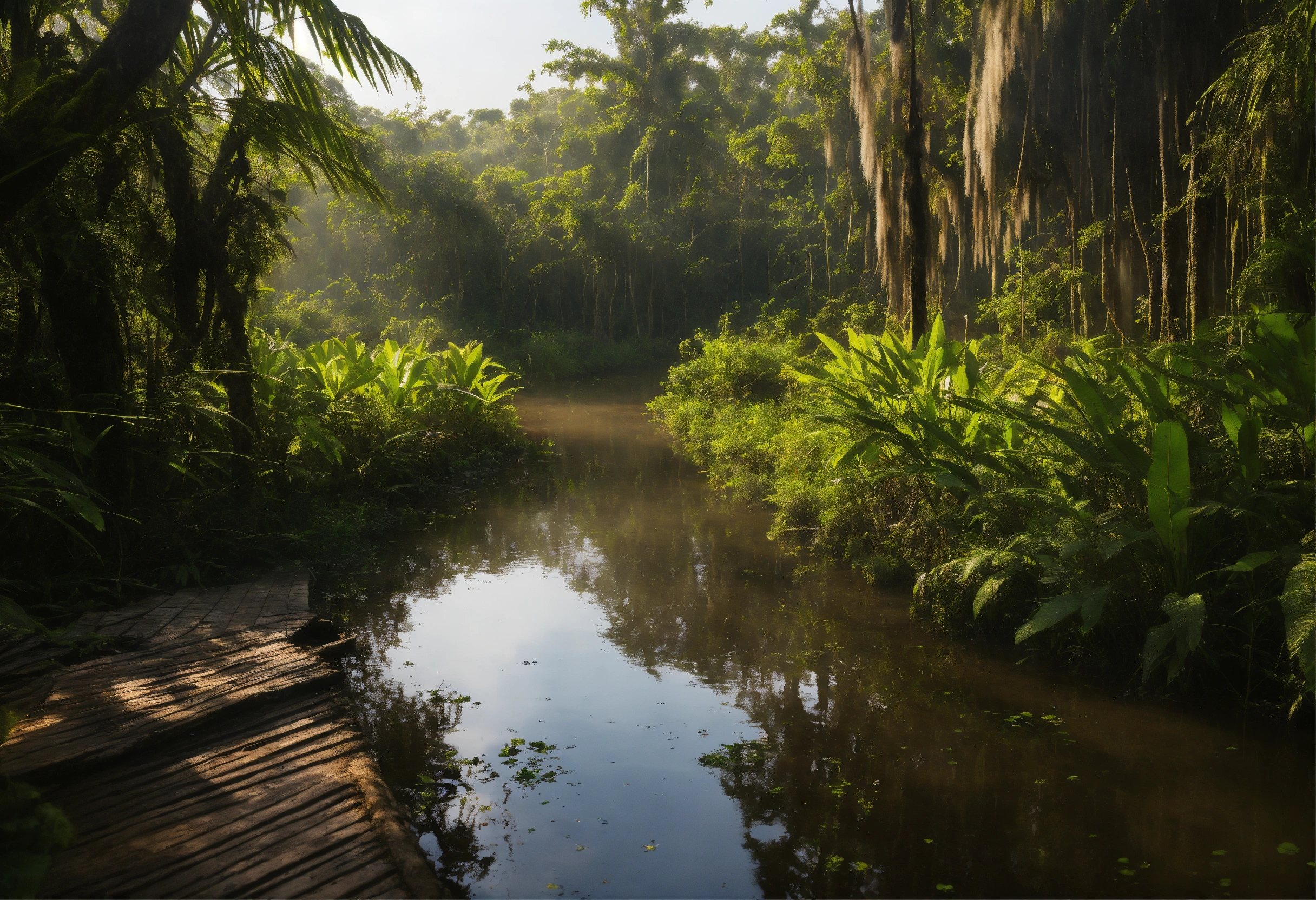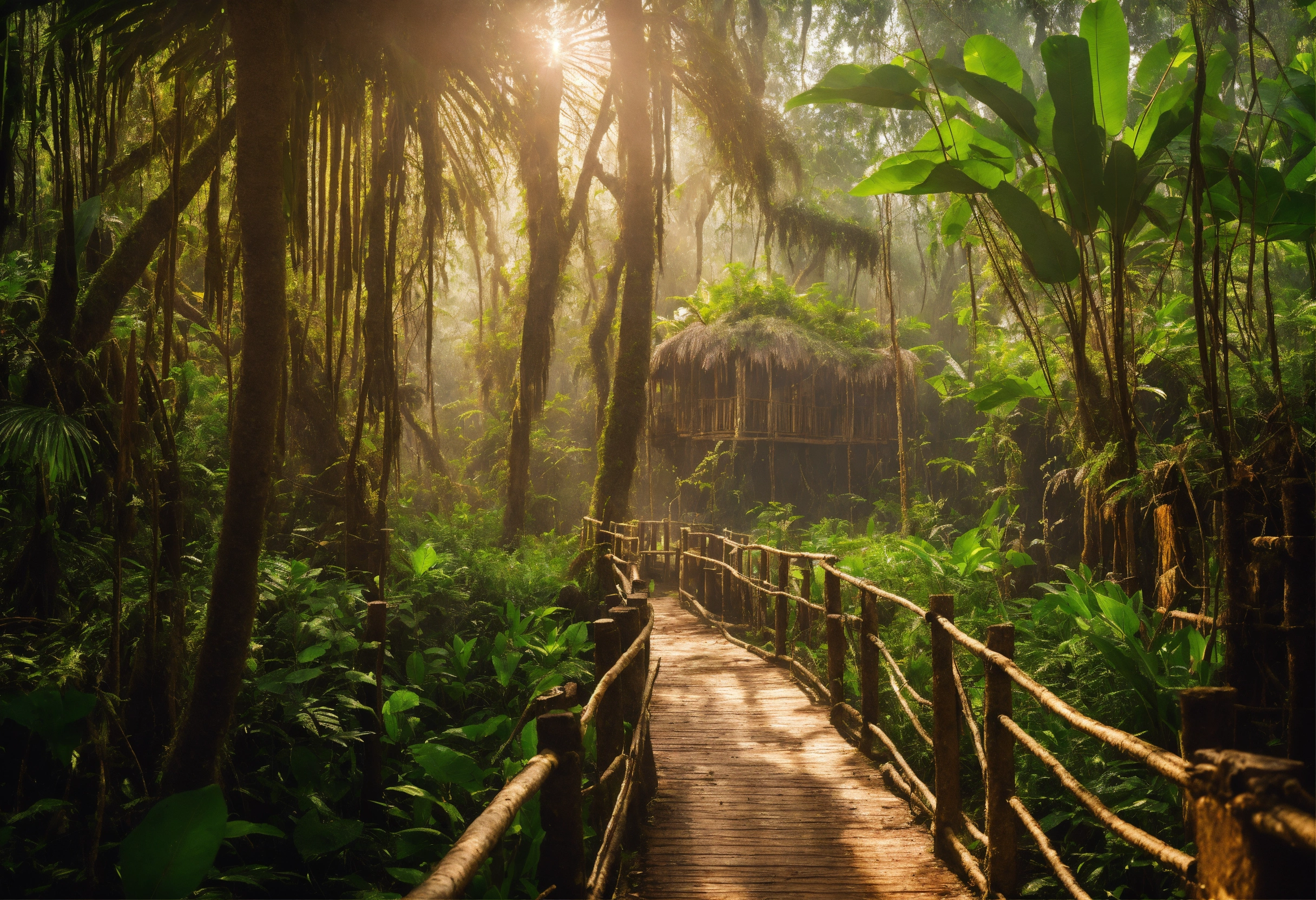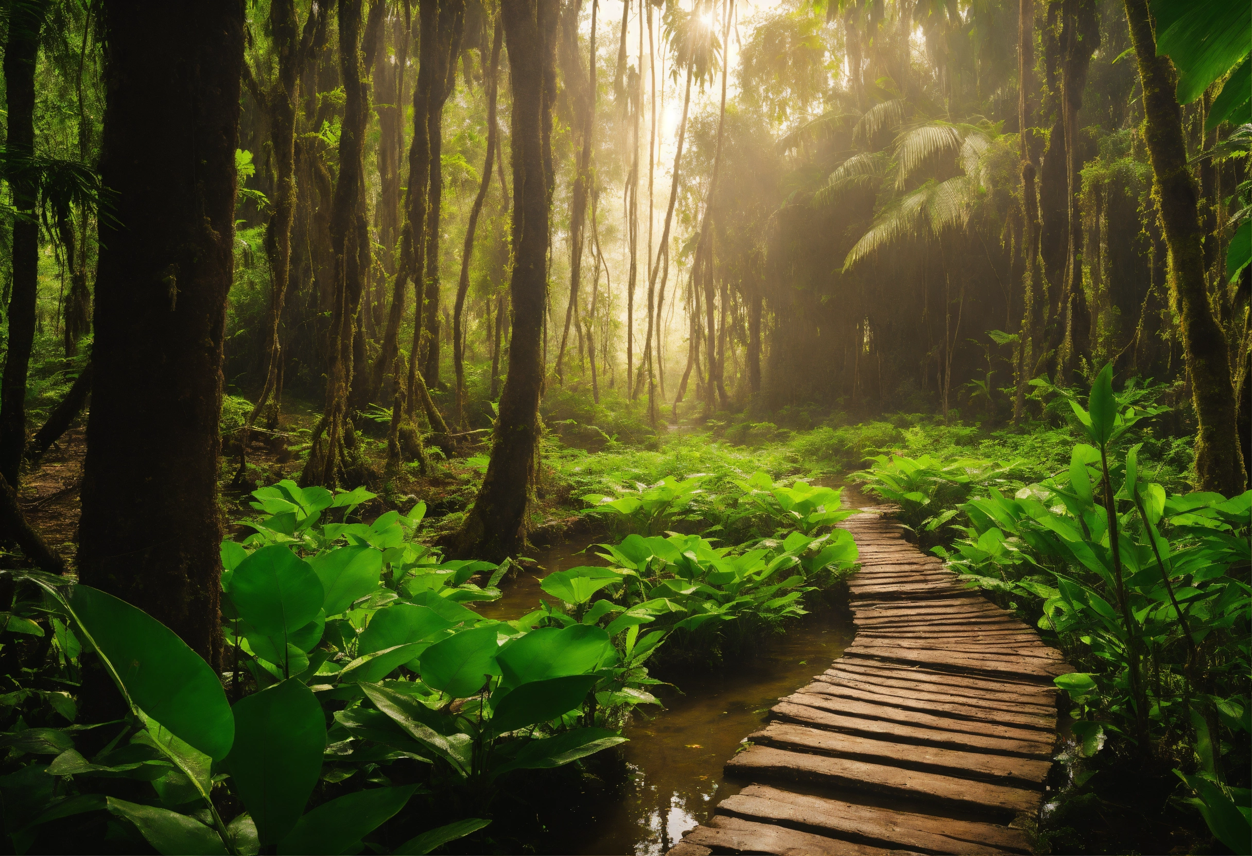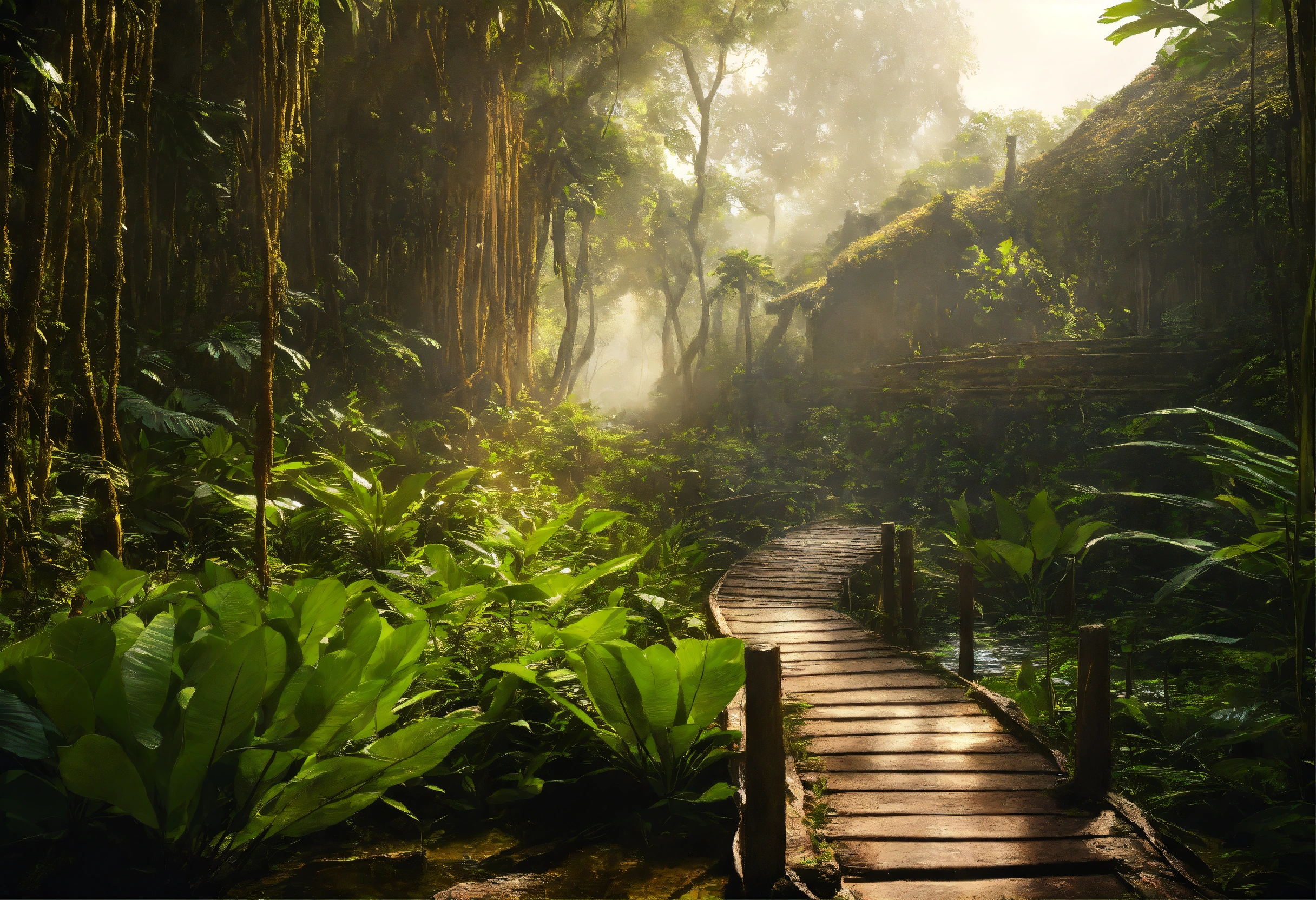 A footpath through a jungle swamp, the heat is oppressive, the air humidity is high, medieval setting