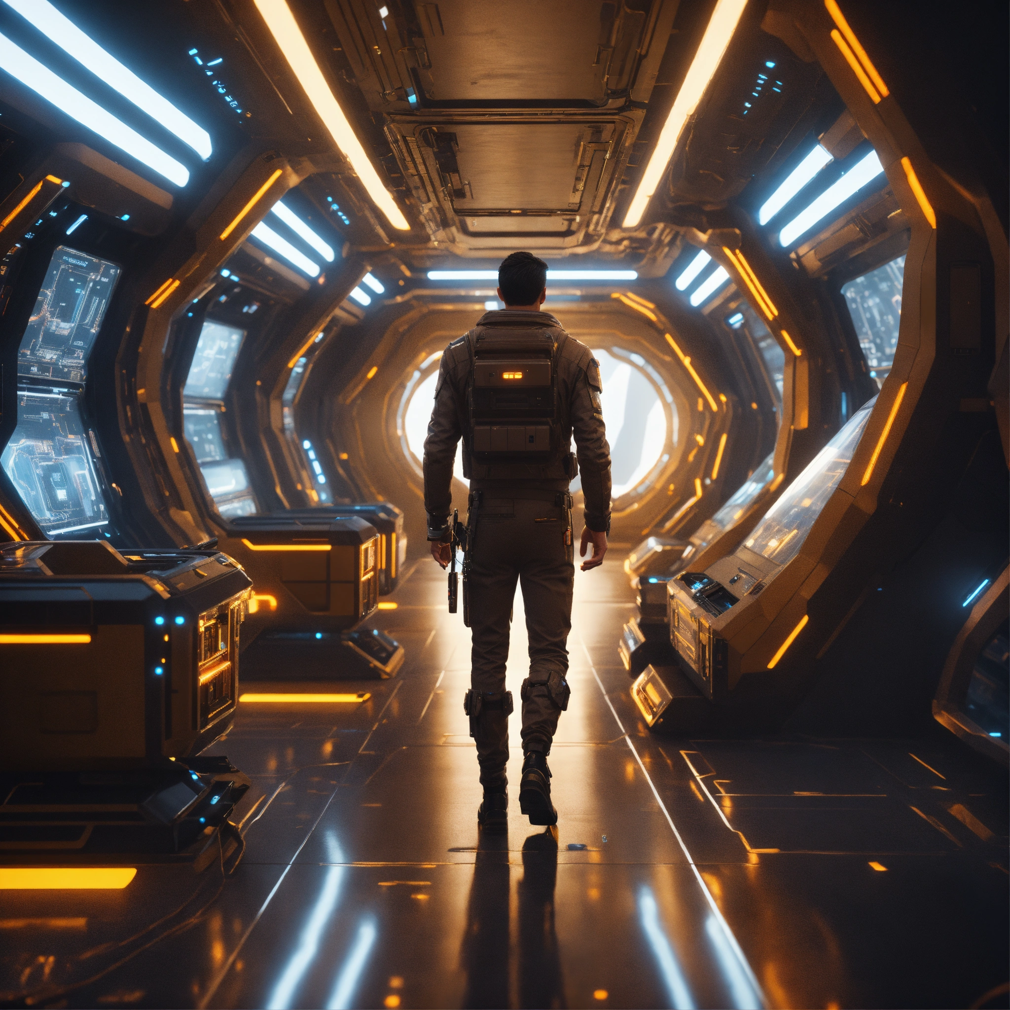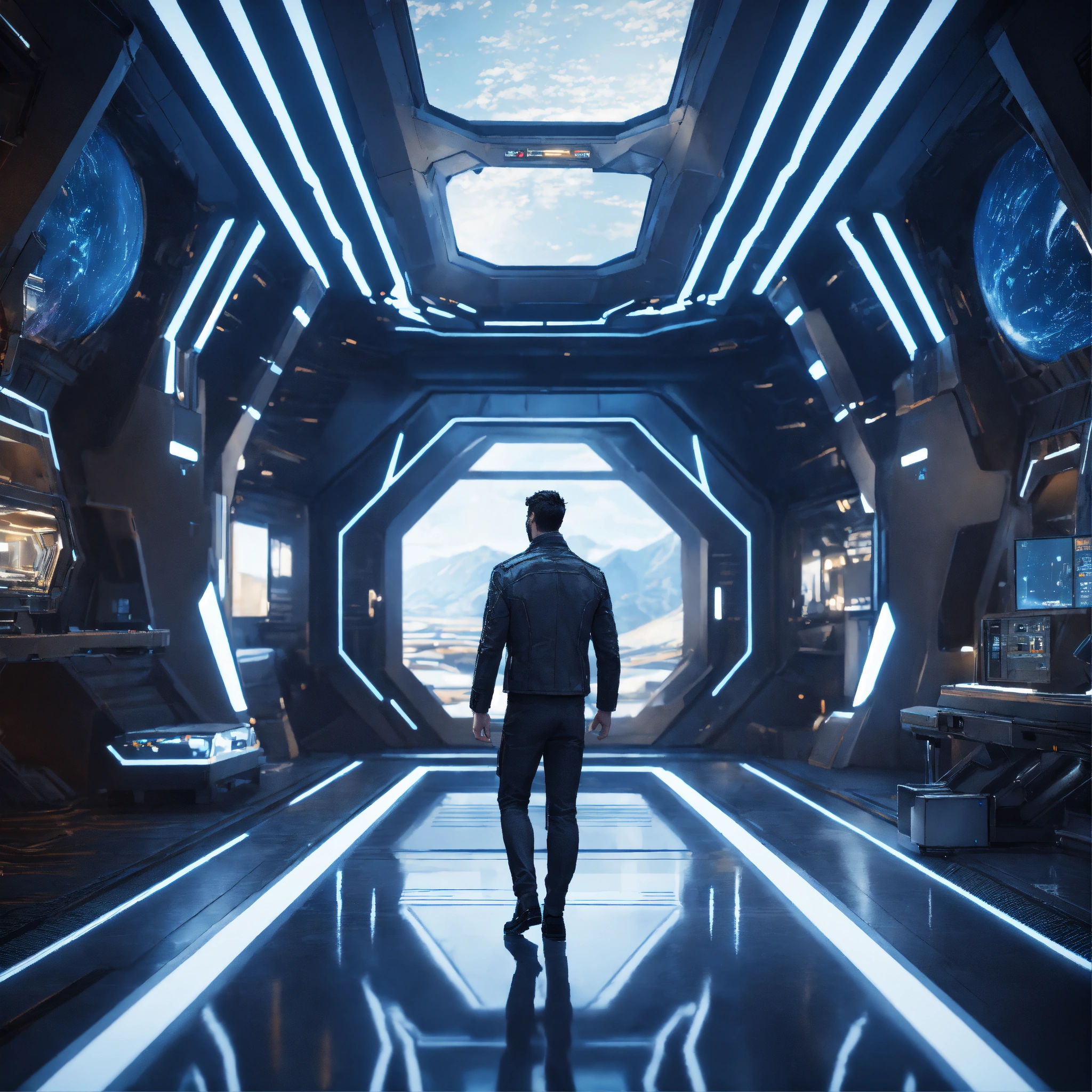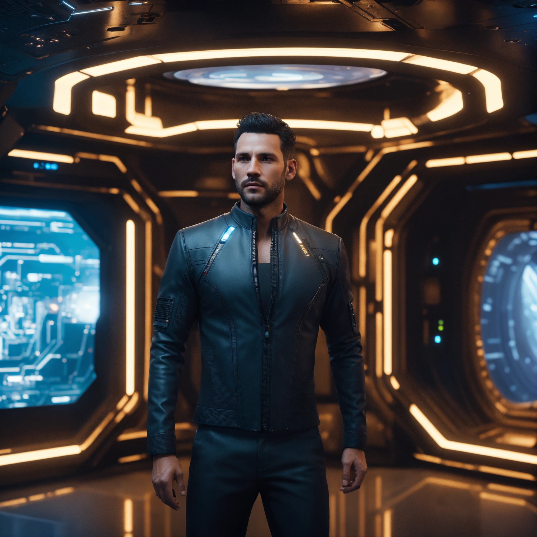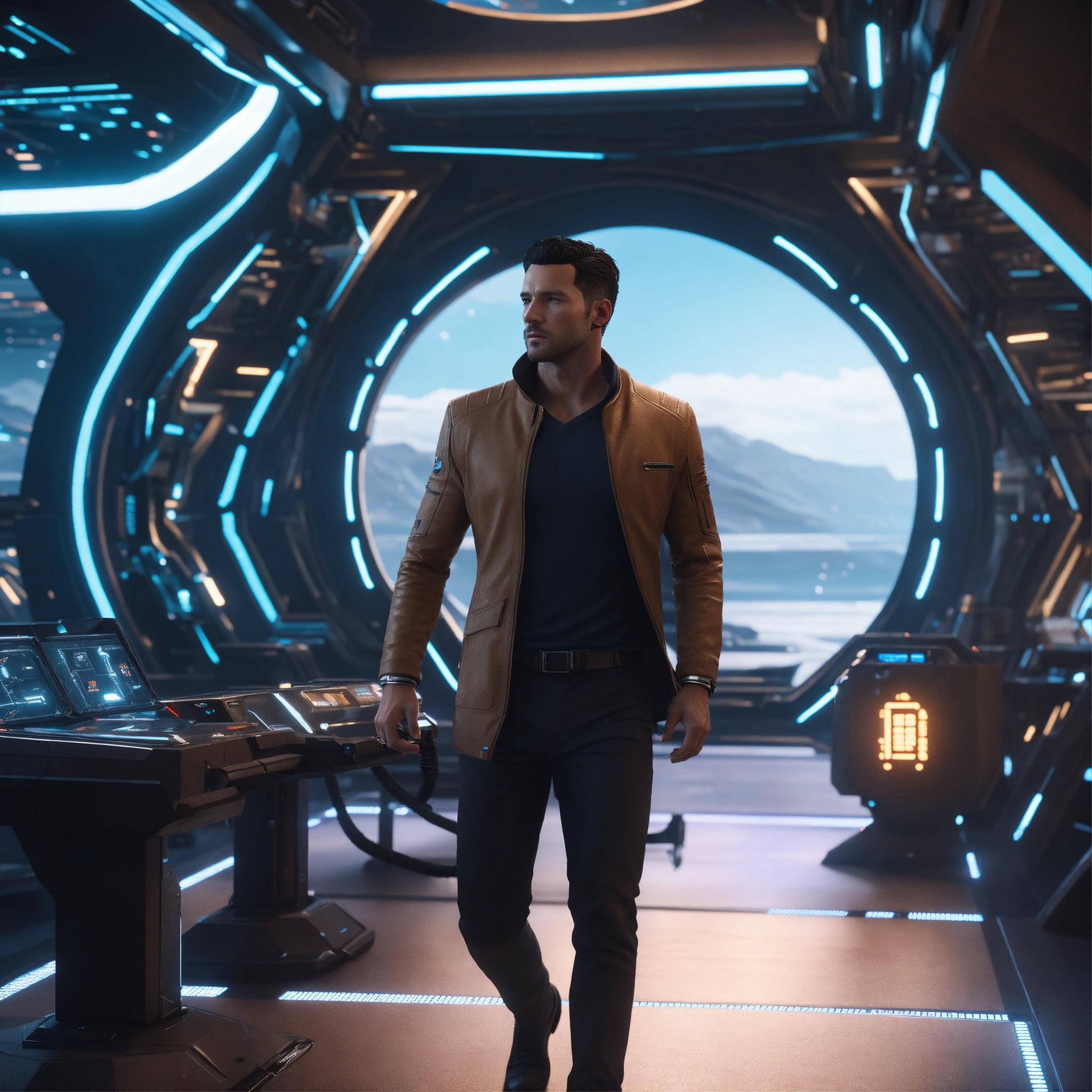 35 year old clean cut man with dark hair boarding a luxurious hi tech space port, realistic, futuristic, sci-fi, 8k, unreal engine