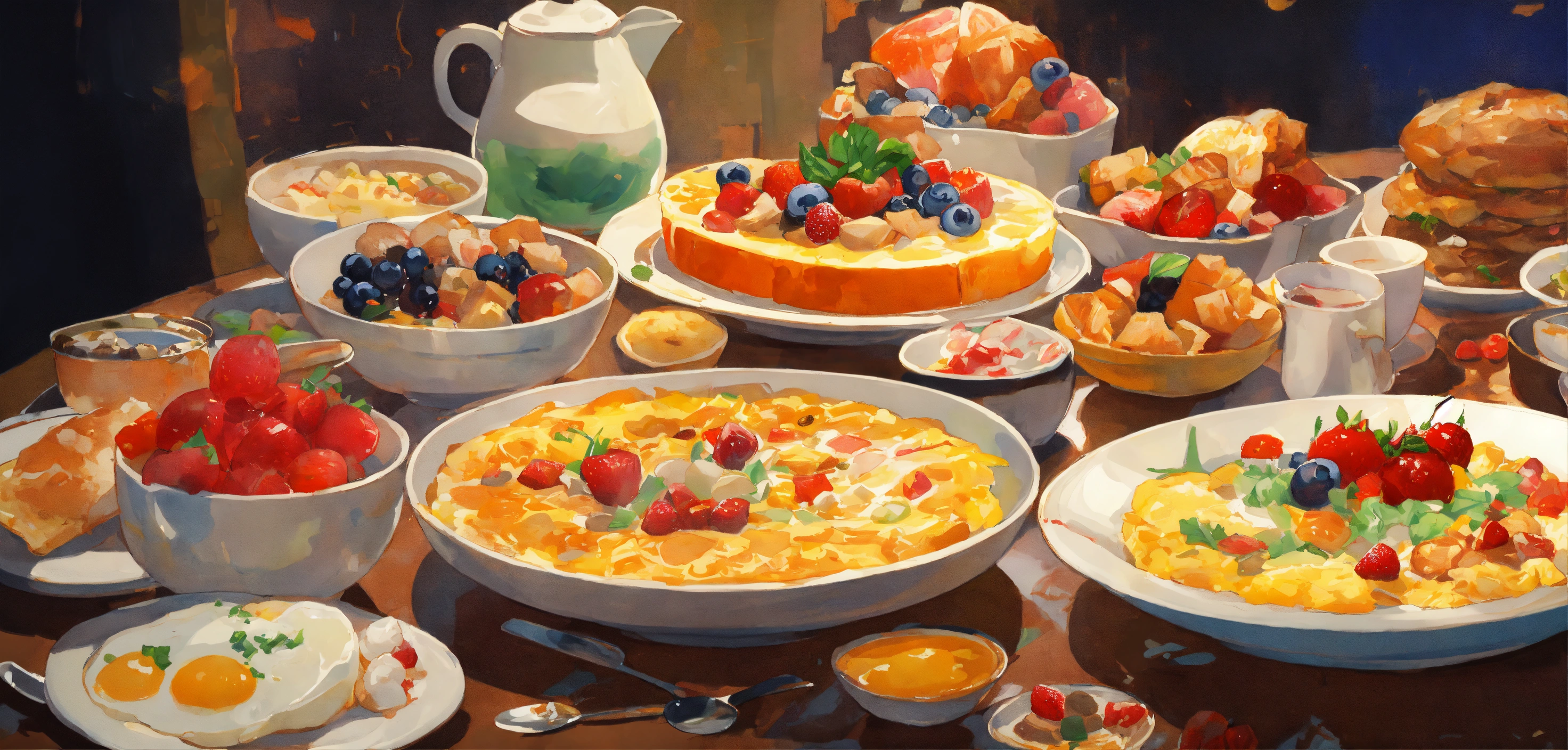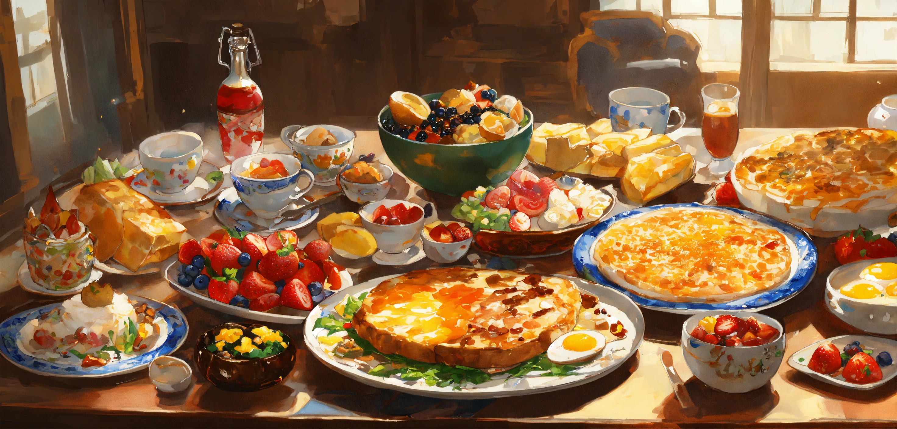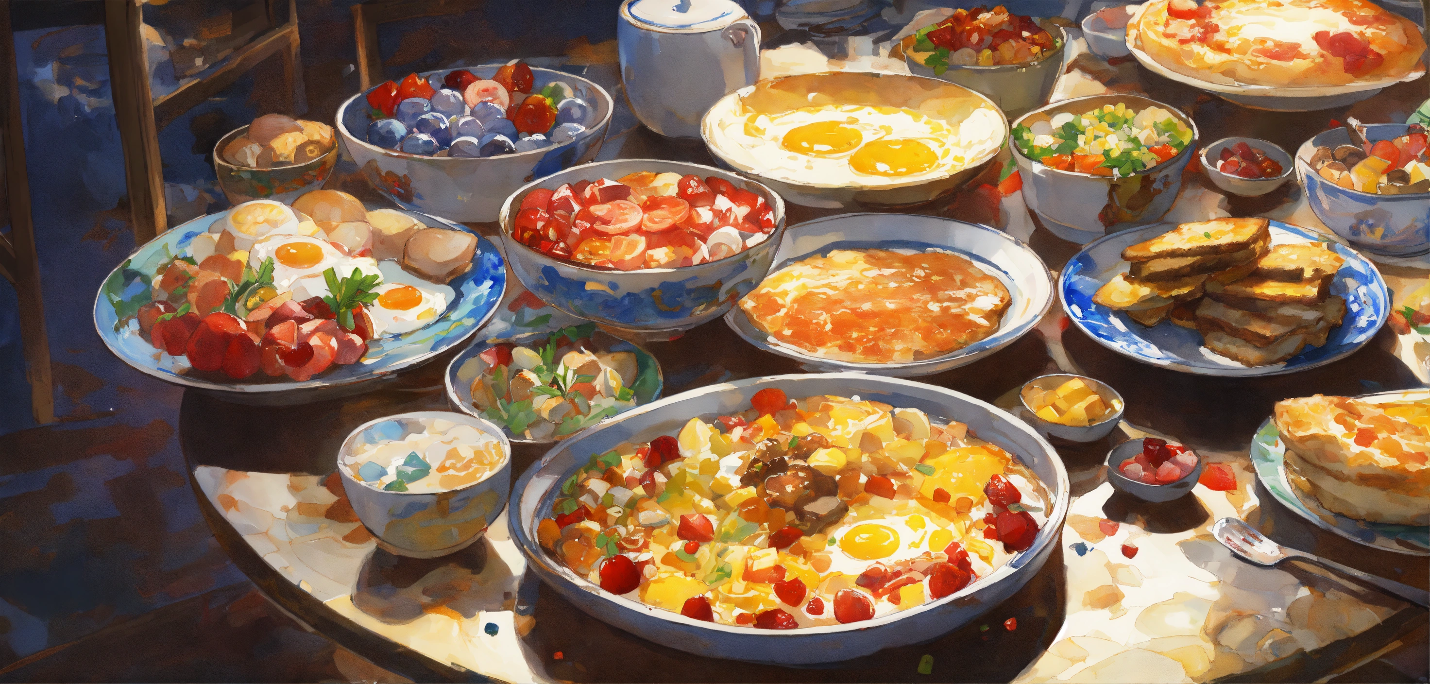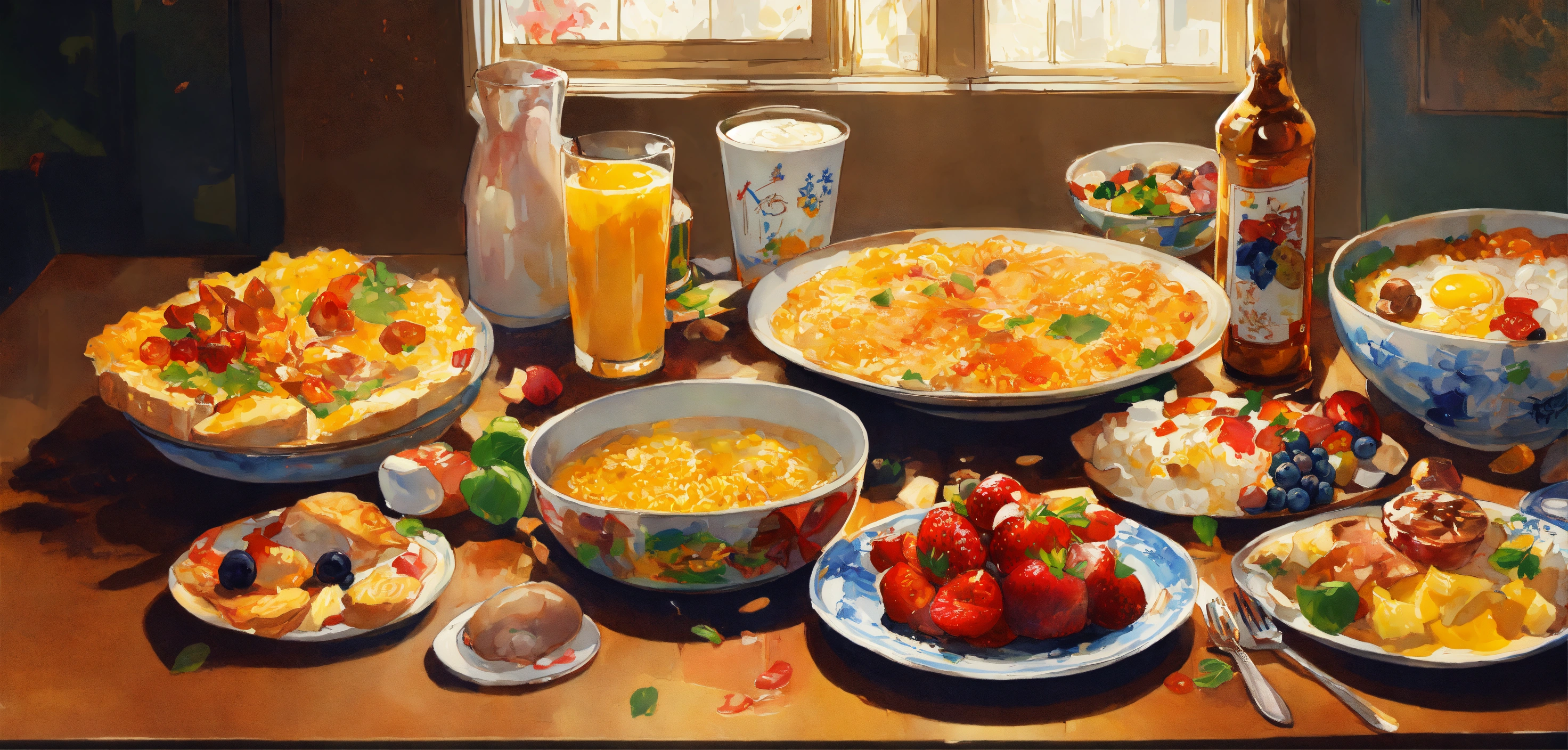 A painting of a table full of breakfast foods, concept art by taro yamamoto, pixiv contest winner, auto - destructive art, official art, concept art, pixiv