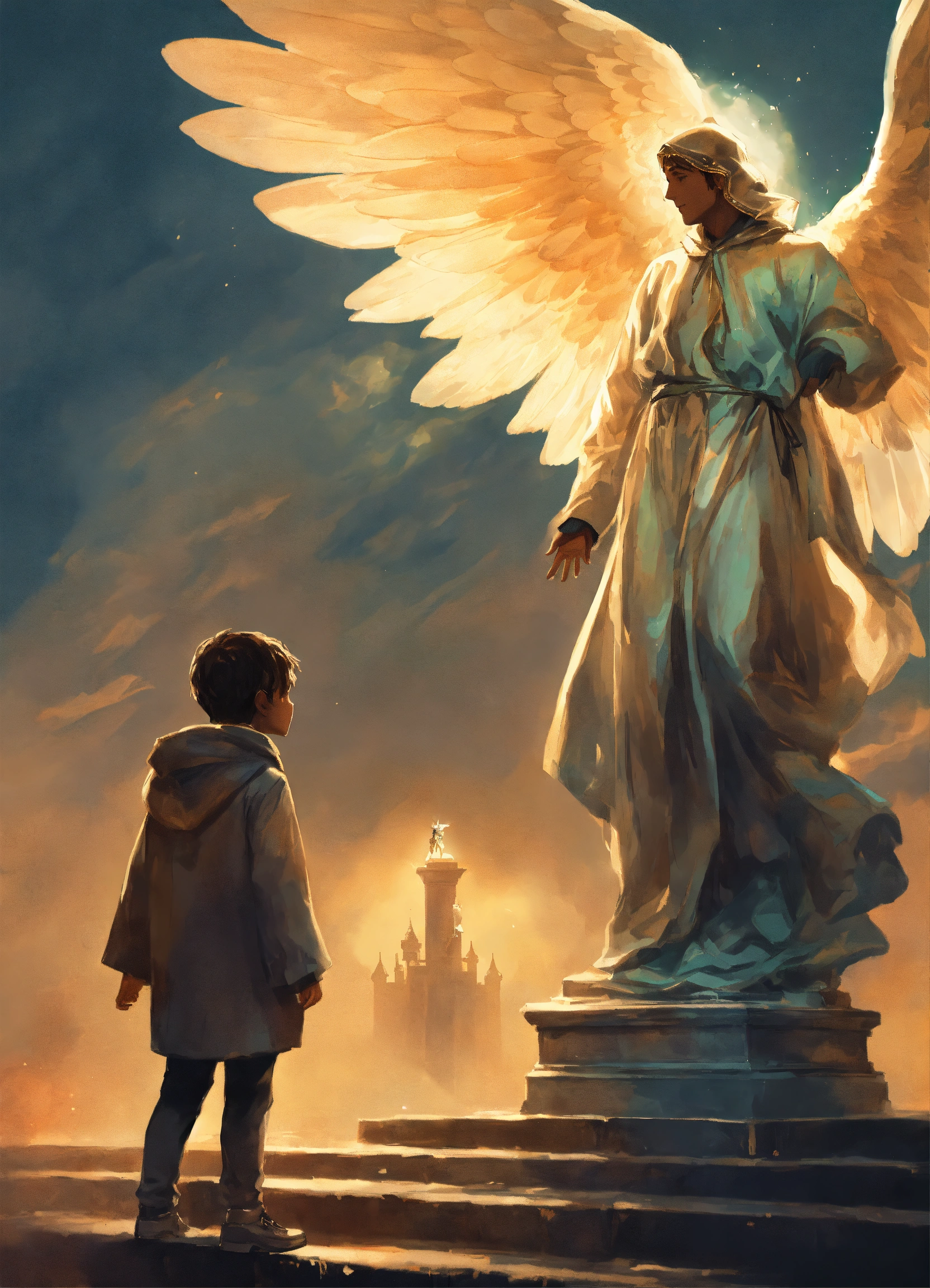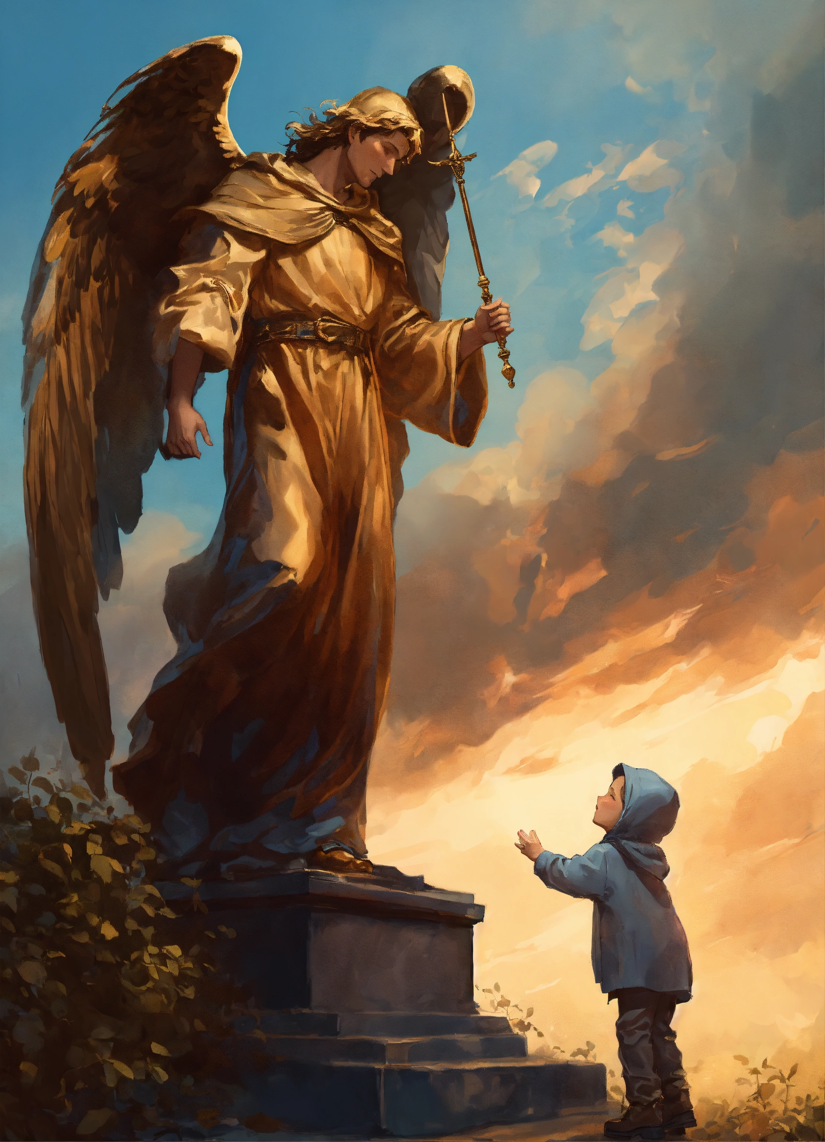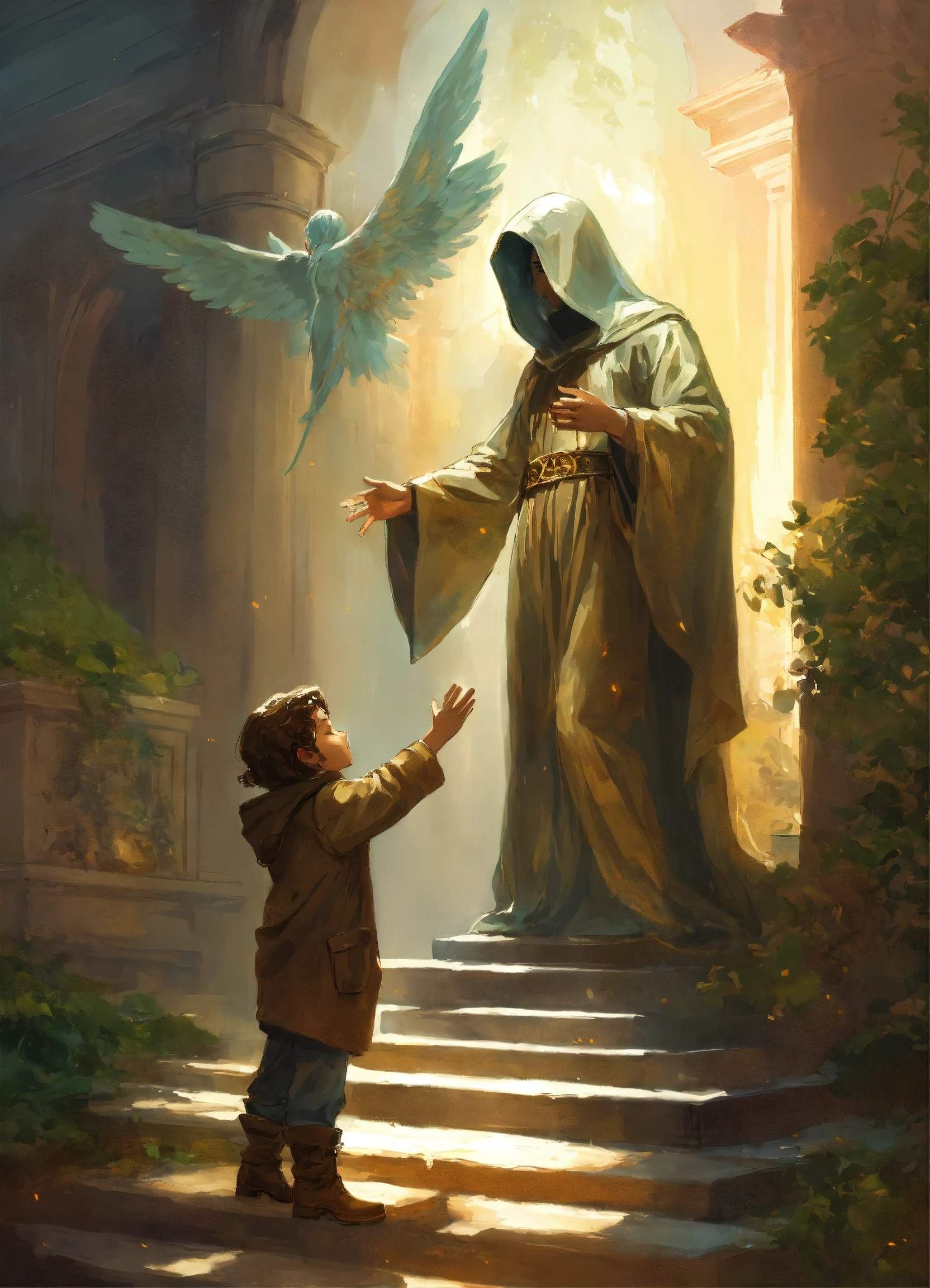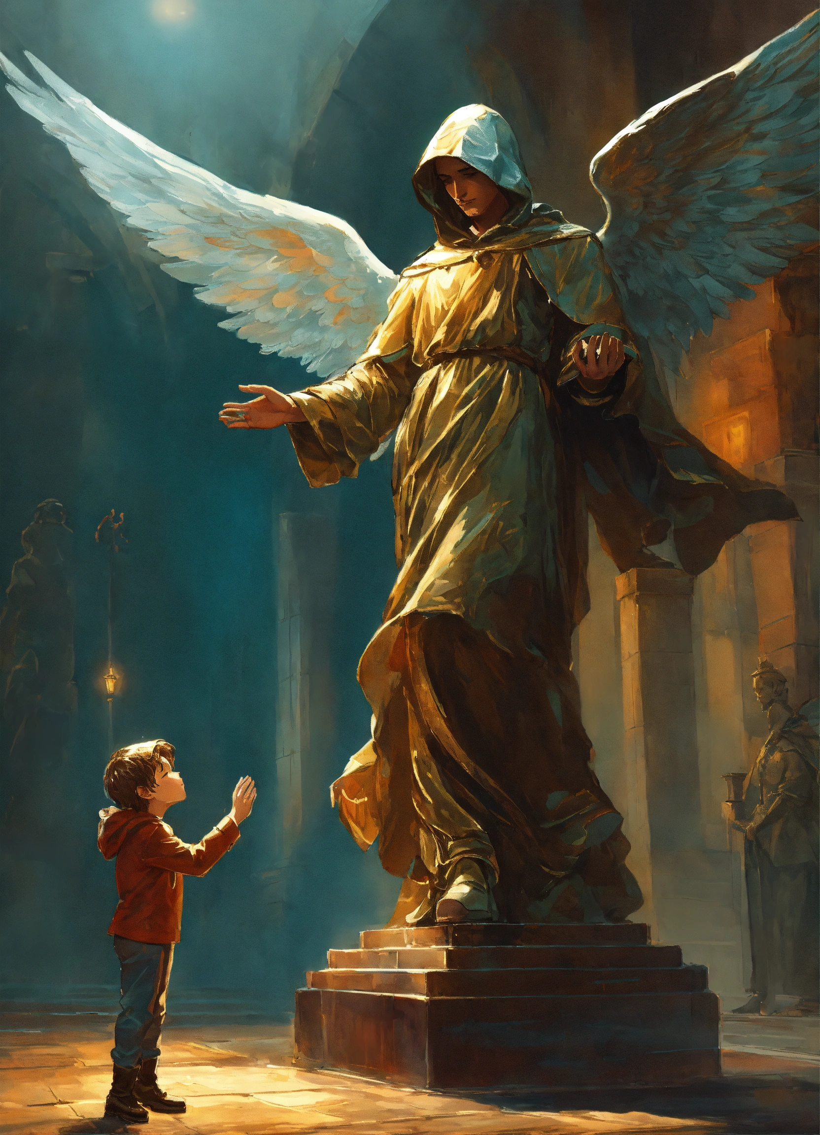 The child reaches out to the statue of an man angel whose face is covered with a hood, illustration for a book in the fantasy genre