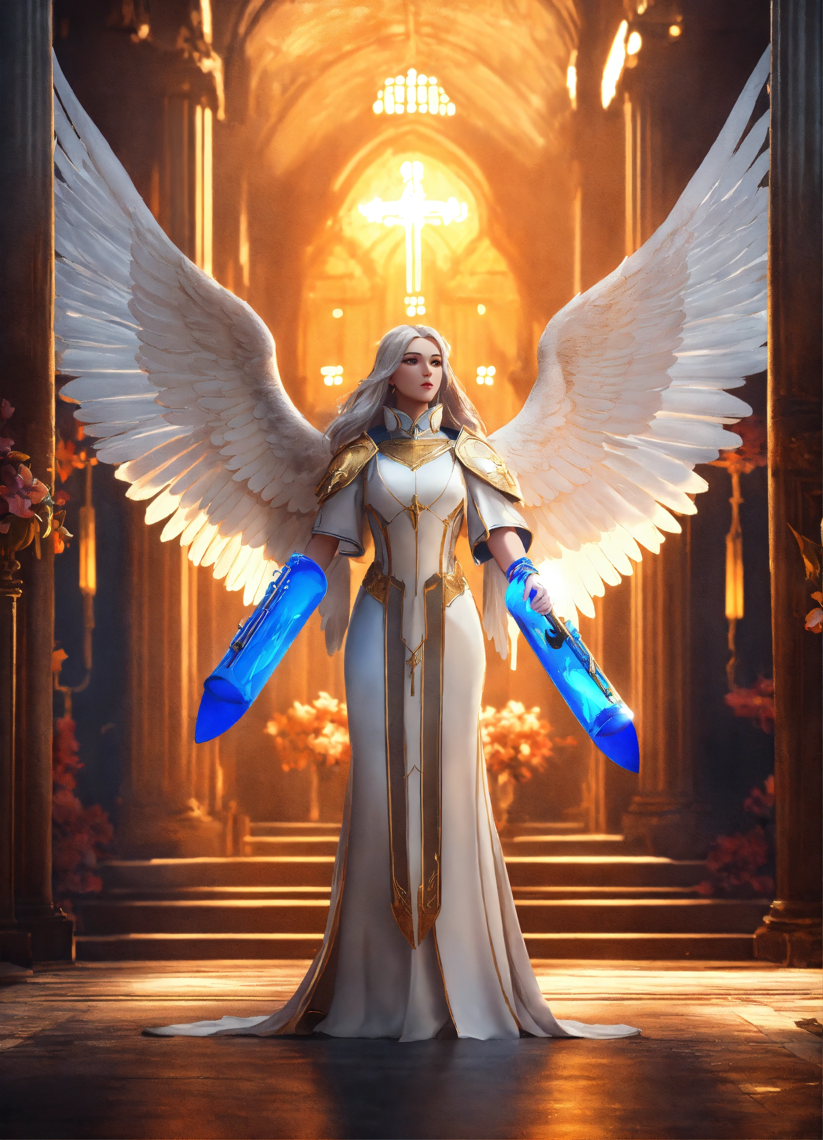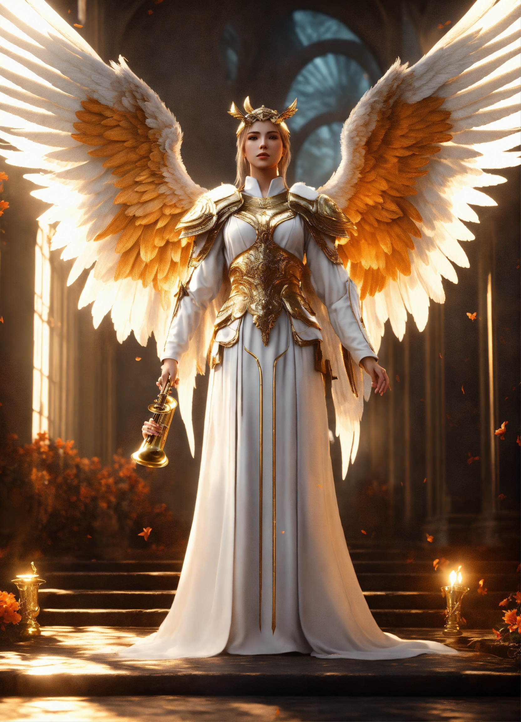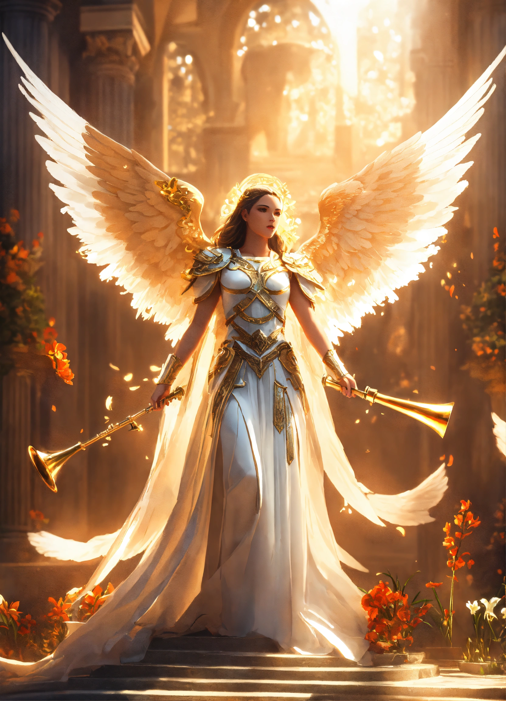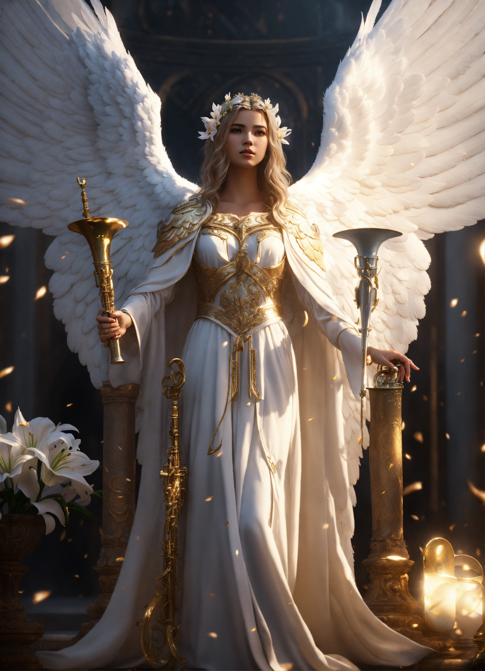 Create a beautiful archangel gabriel with white wings, a lily and a trumpet, white robes, 8k, amazing epic ancient theme, cinematic, stunning, realizing lighting and shading, vivid, vibrant, unreal engine, concept art”.