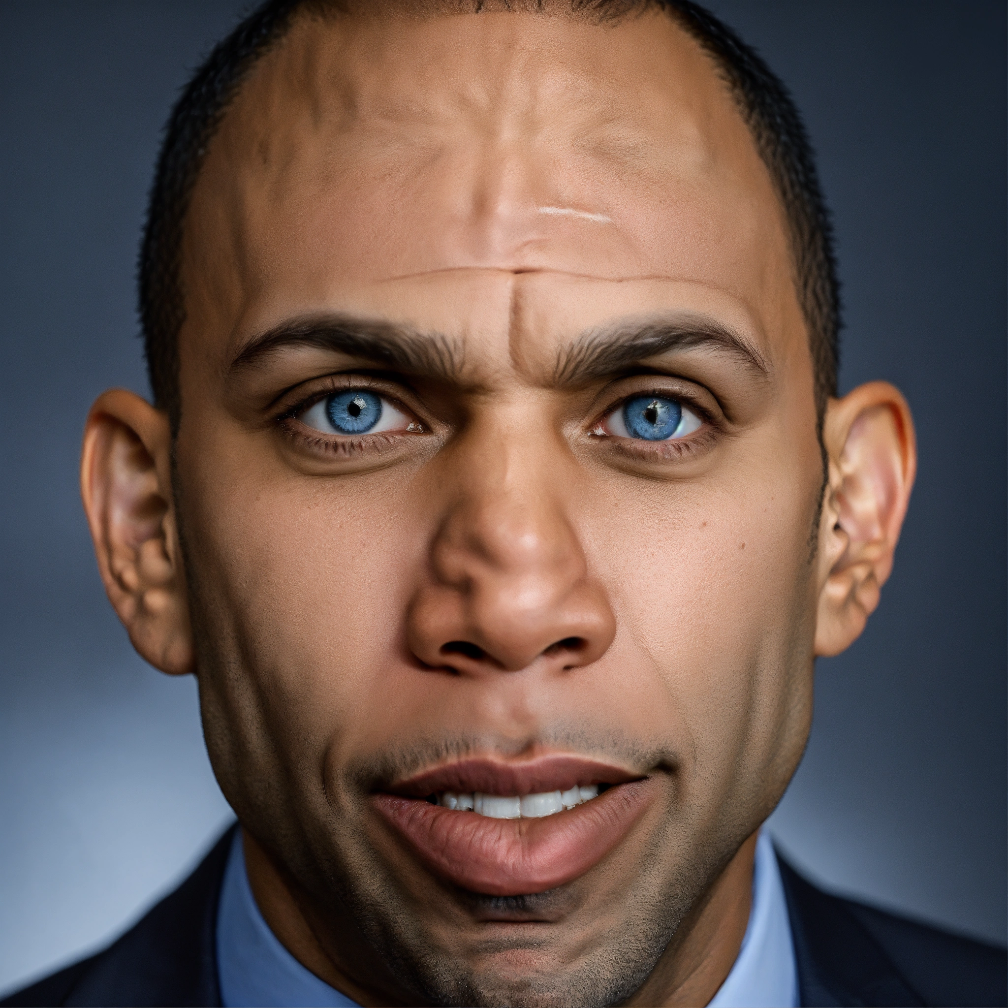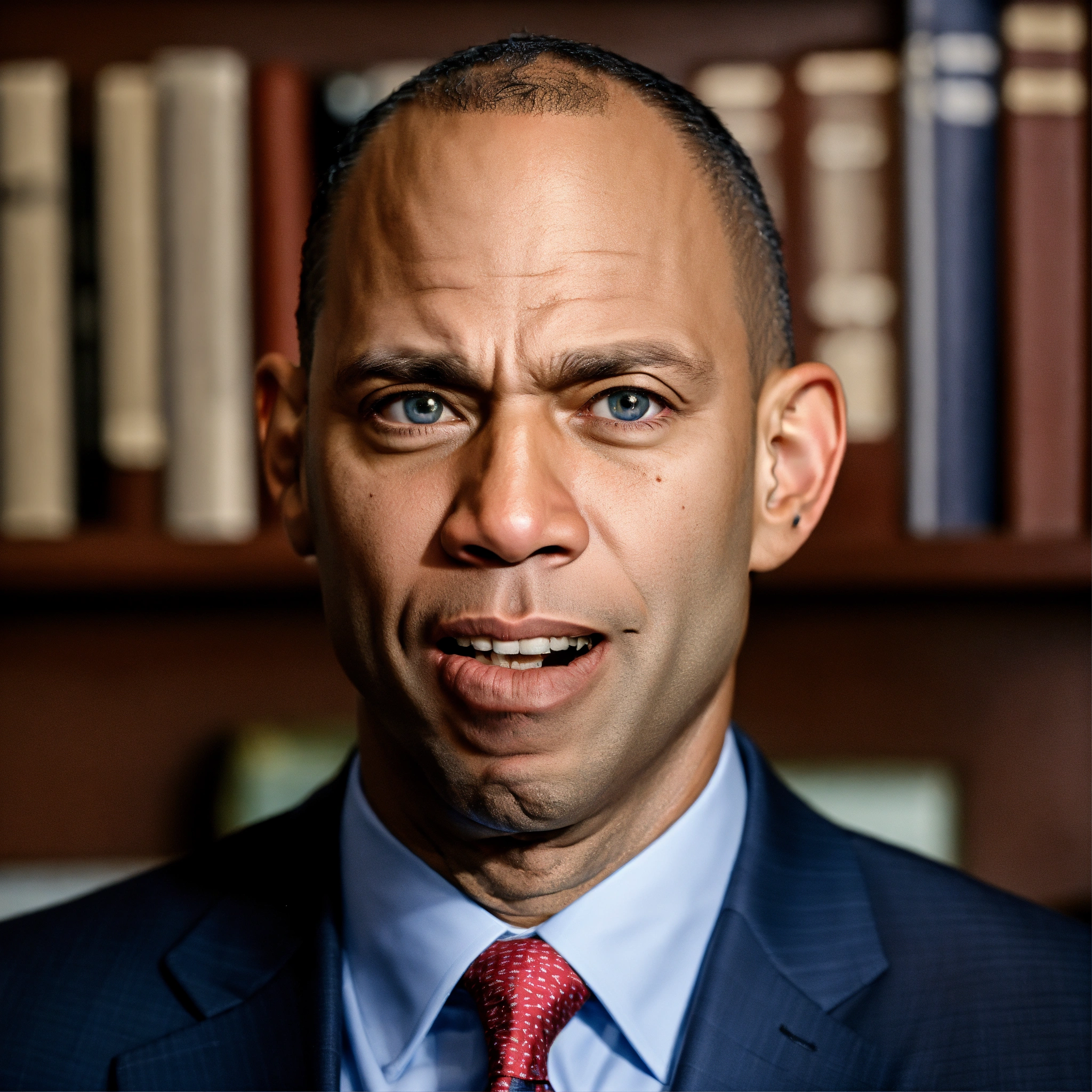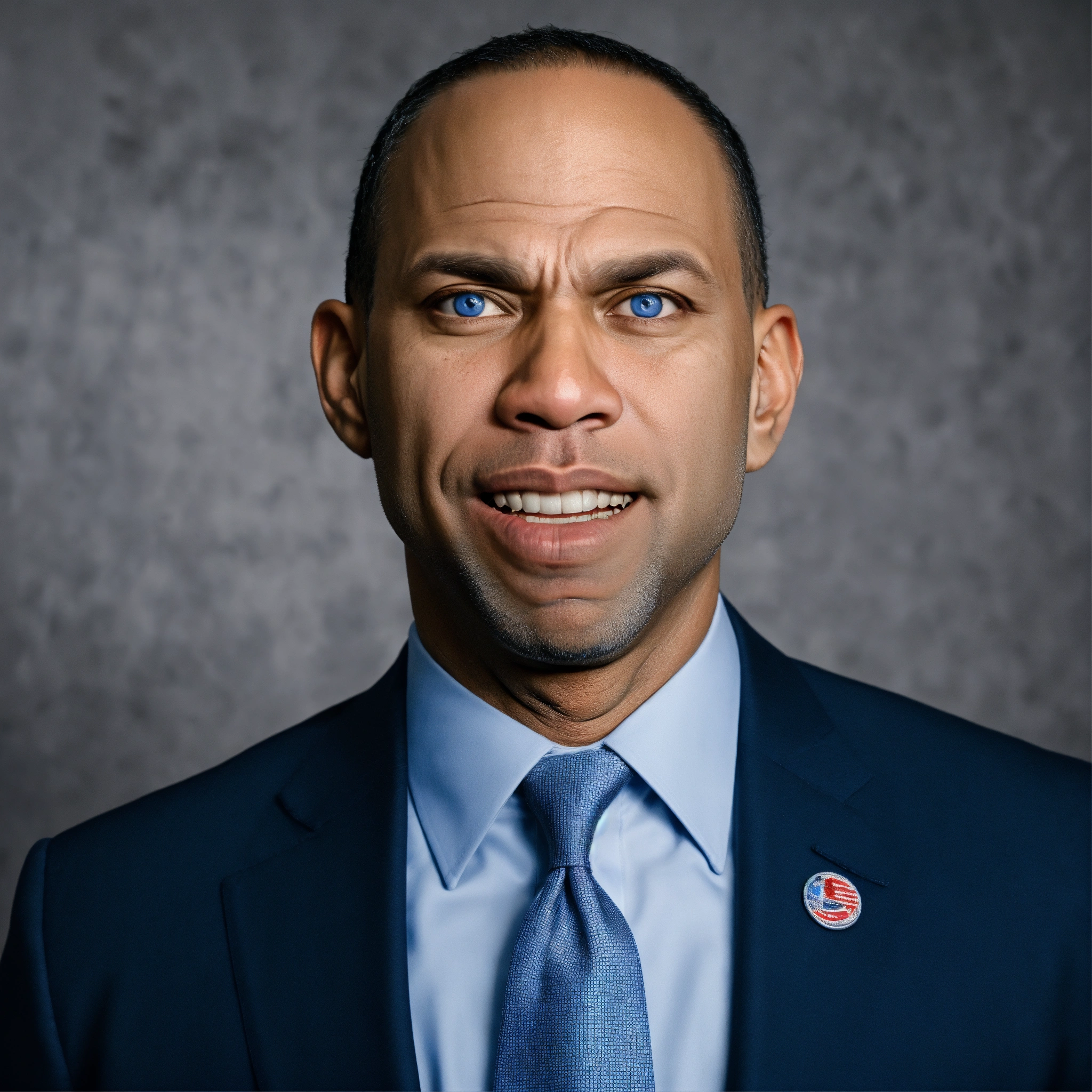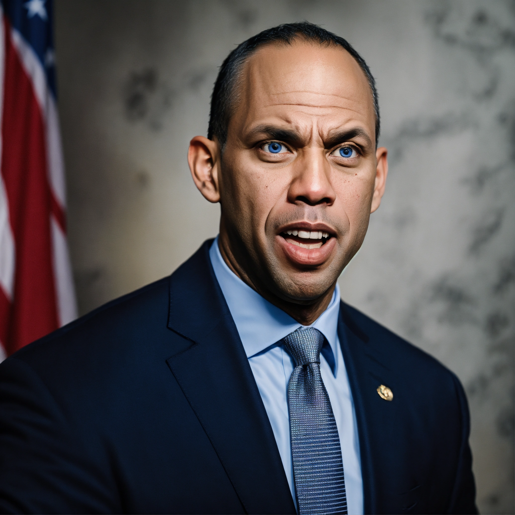 Senator hakeem jeffries light silvery blue eyes, angry, mad yelling, crooked mouth, squinting eyes, acne