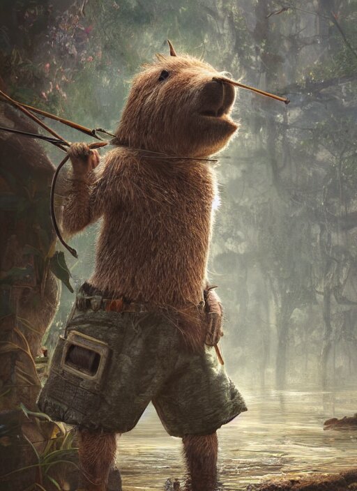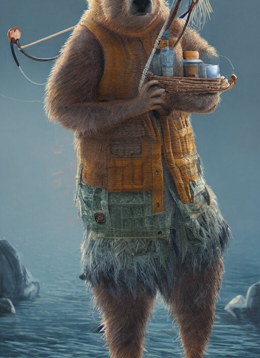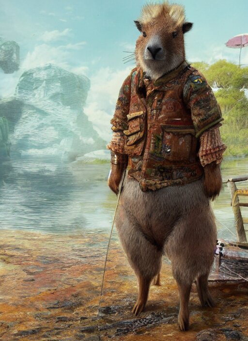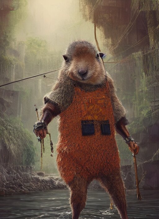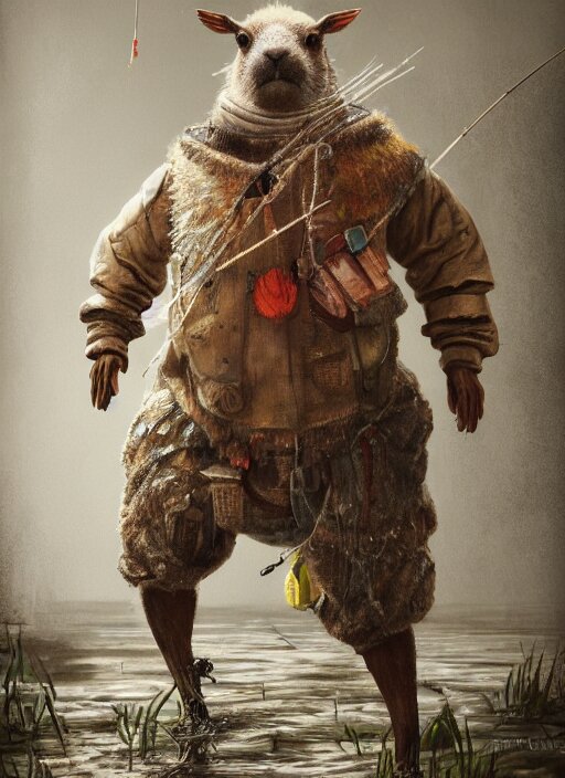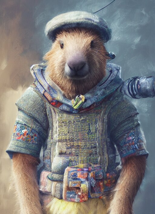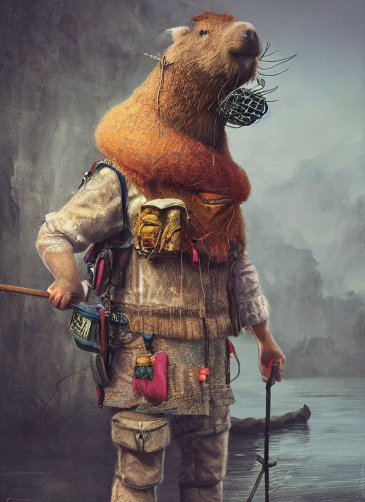 Detailed full body concept art illustration, soft focus, pastel painting on canvas of an anthropomorphic capybara fisherman in full intricate clothing, biomutant, dystopian, micro detail, octane render, 4k