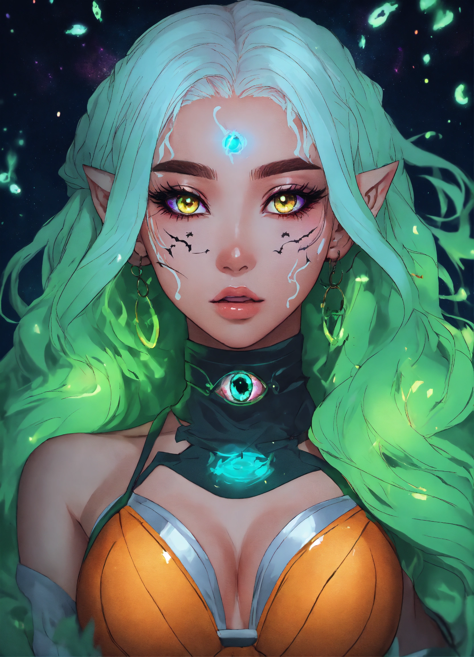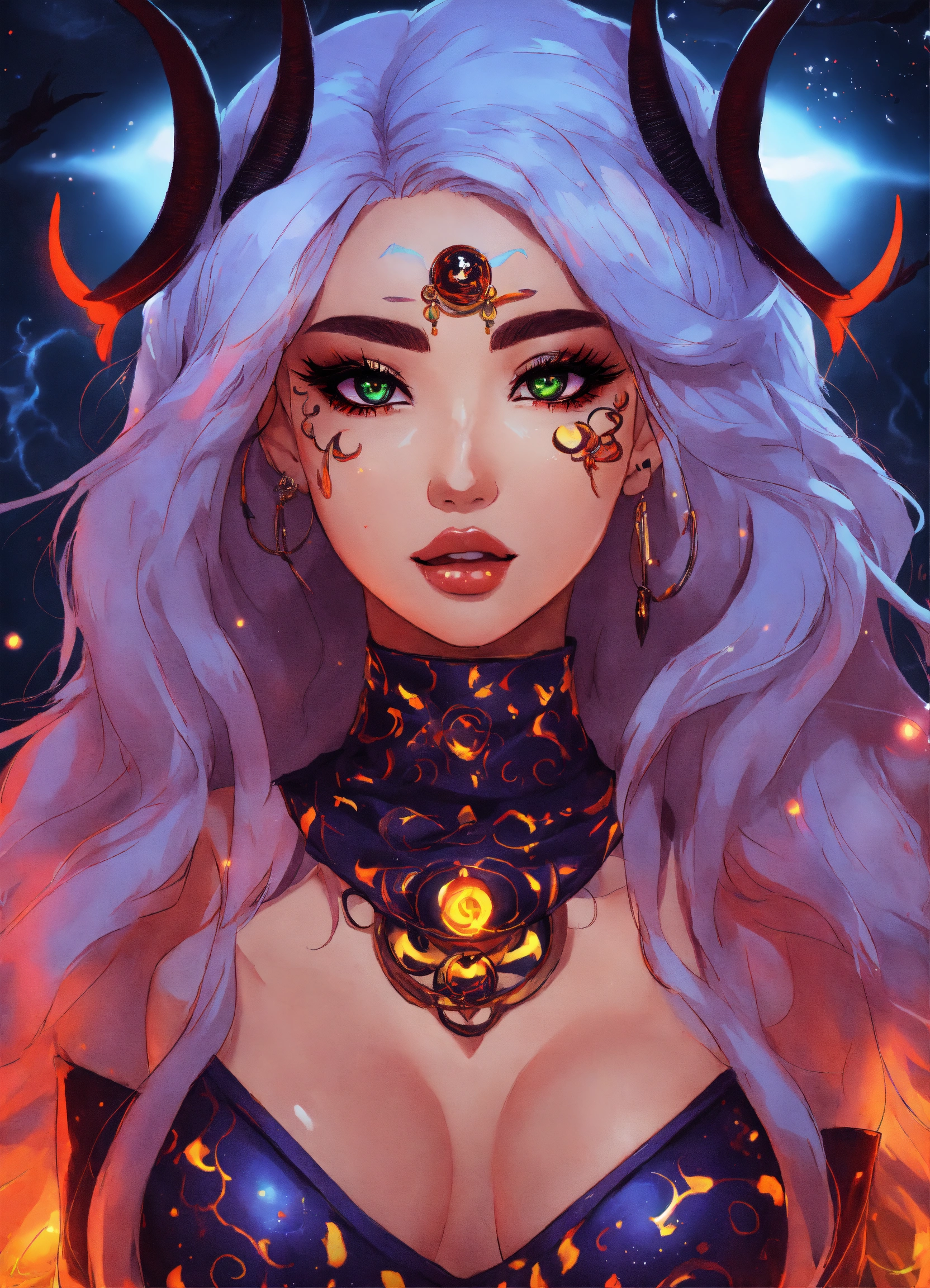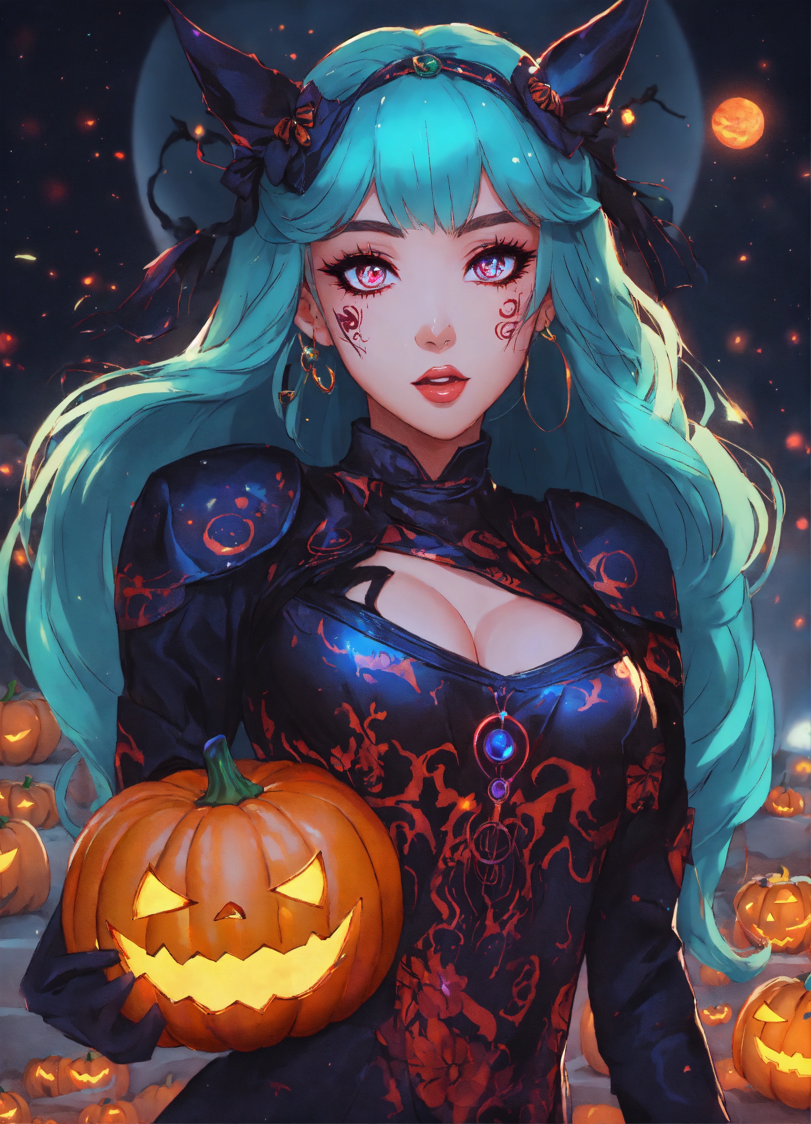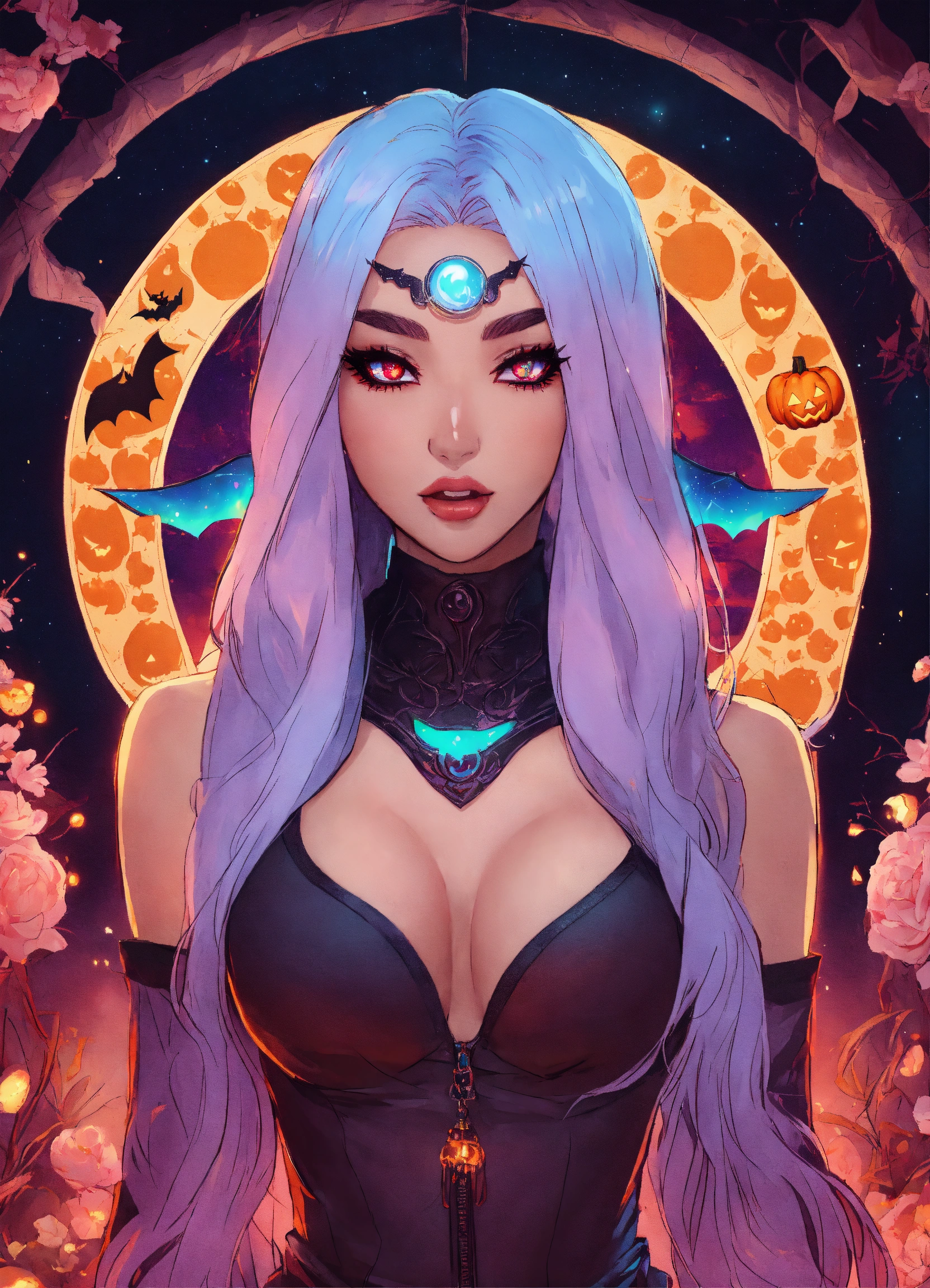 Halloween anime, nikita dragun, evil demon, cosmic enchantress, glowing sclera, hypnotic eyes, ultra detailed, top to bottom, fullbody