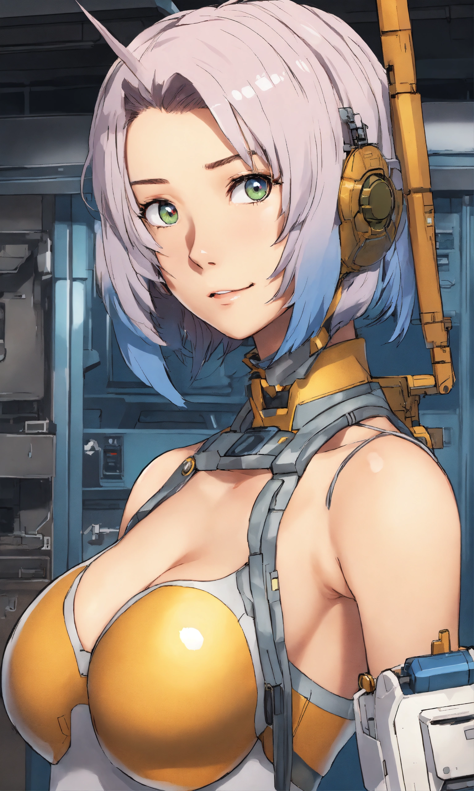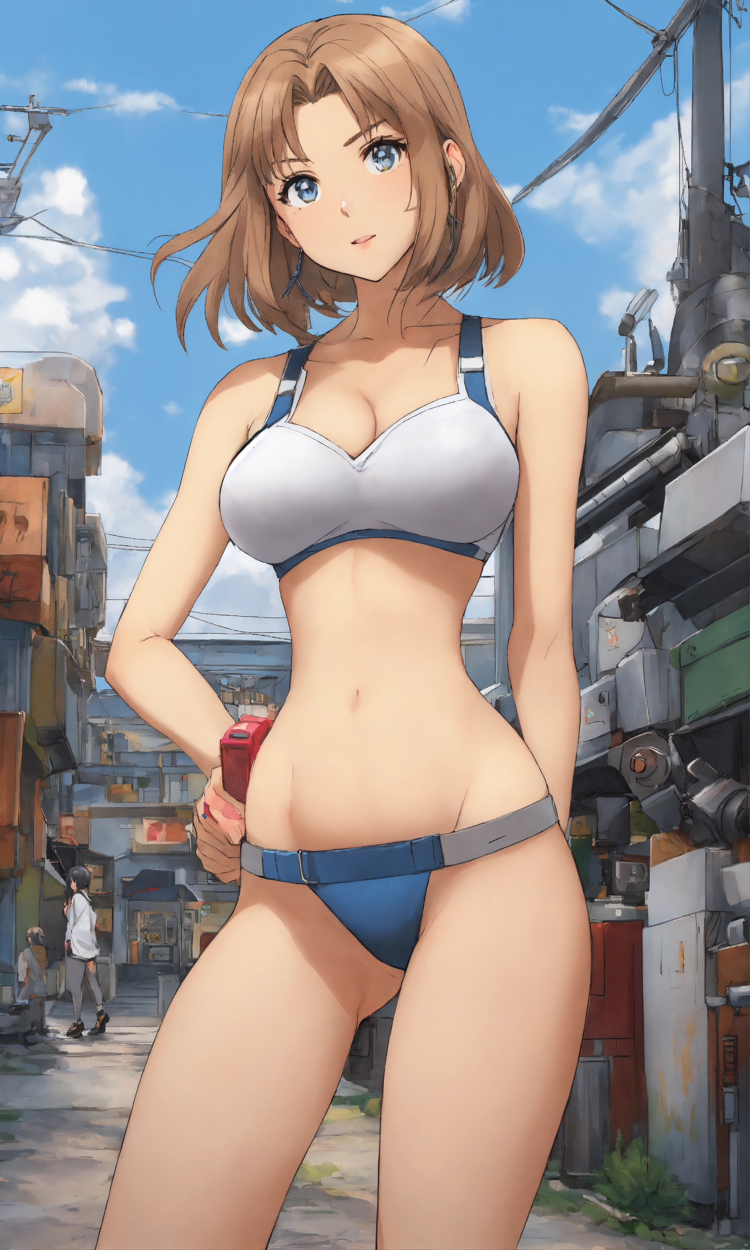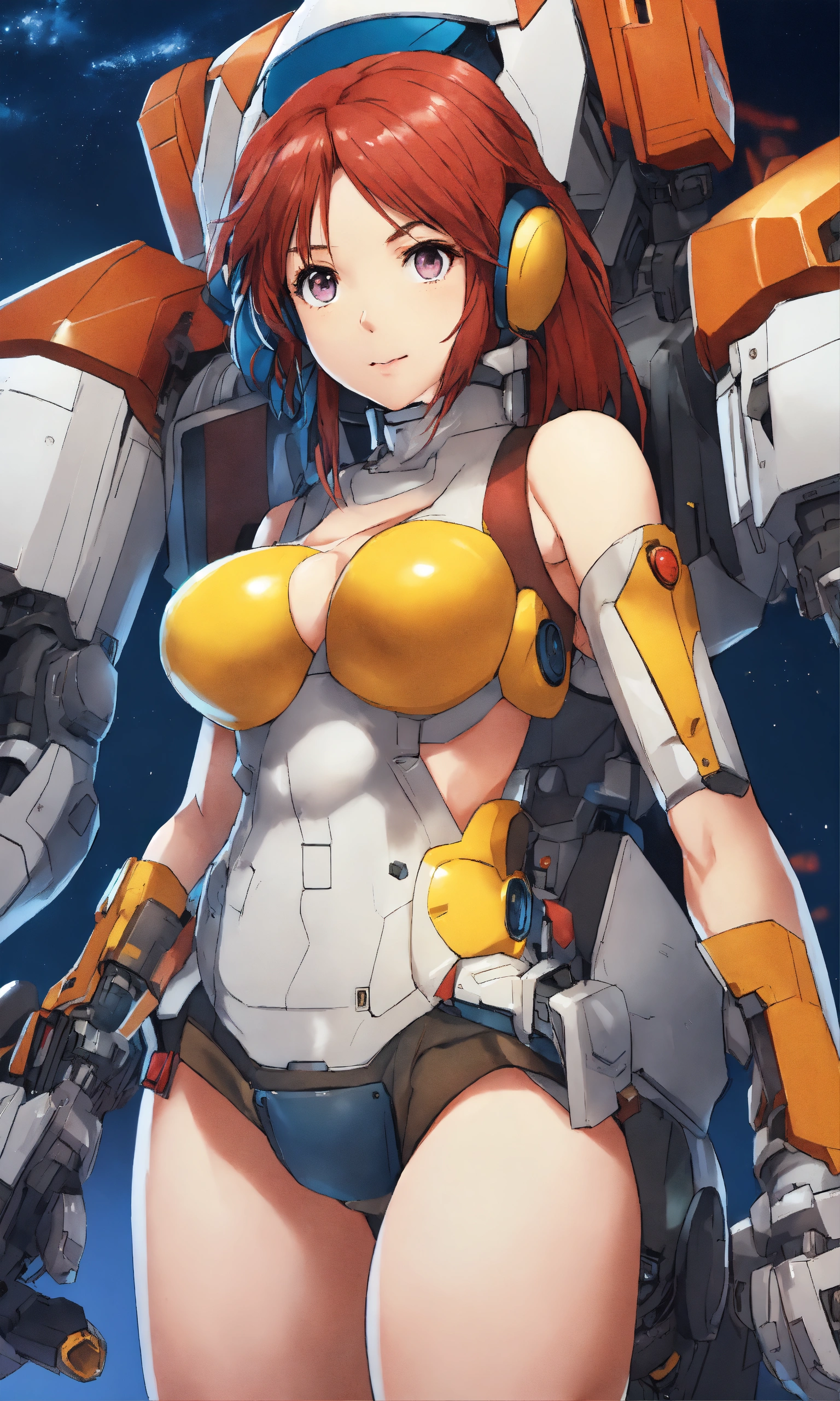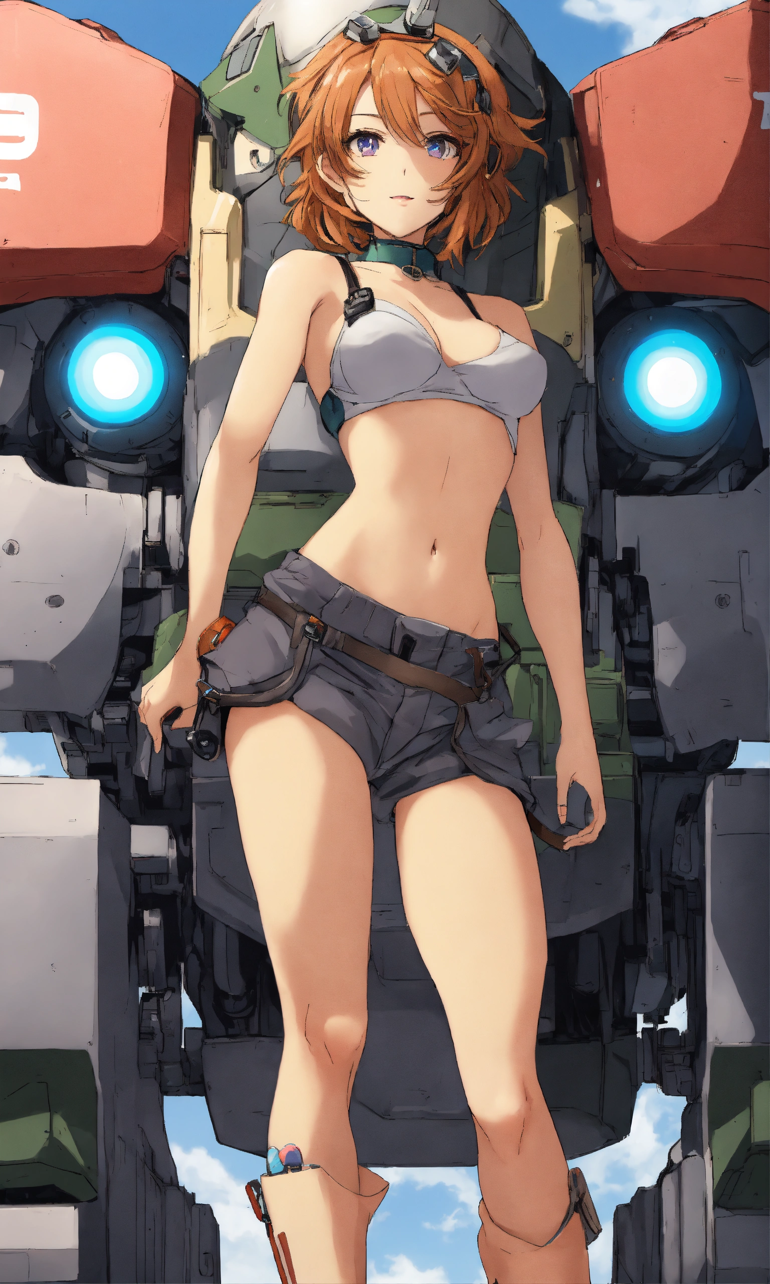 2000s mecha flirting introverted female out-clothed skin chested, full detailed eyes, full body pose, toriyama, miyazaki