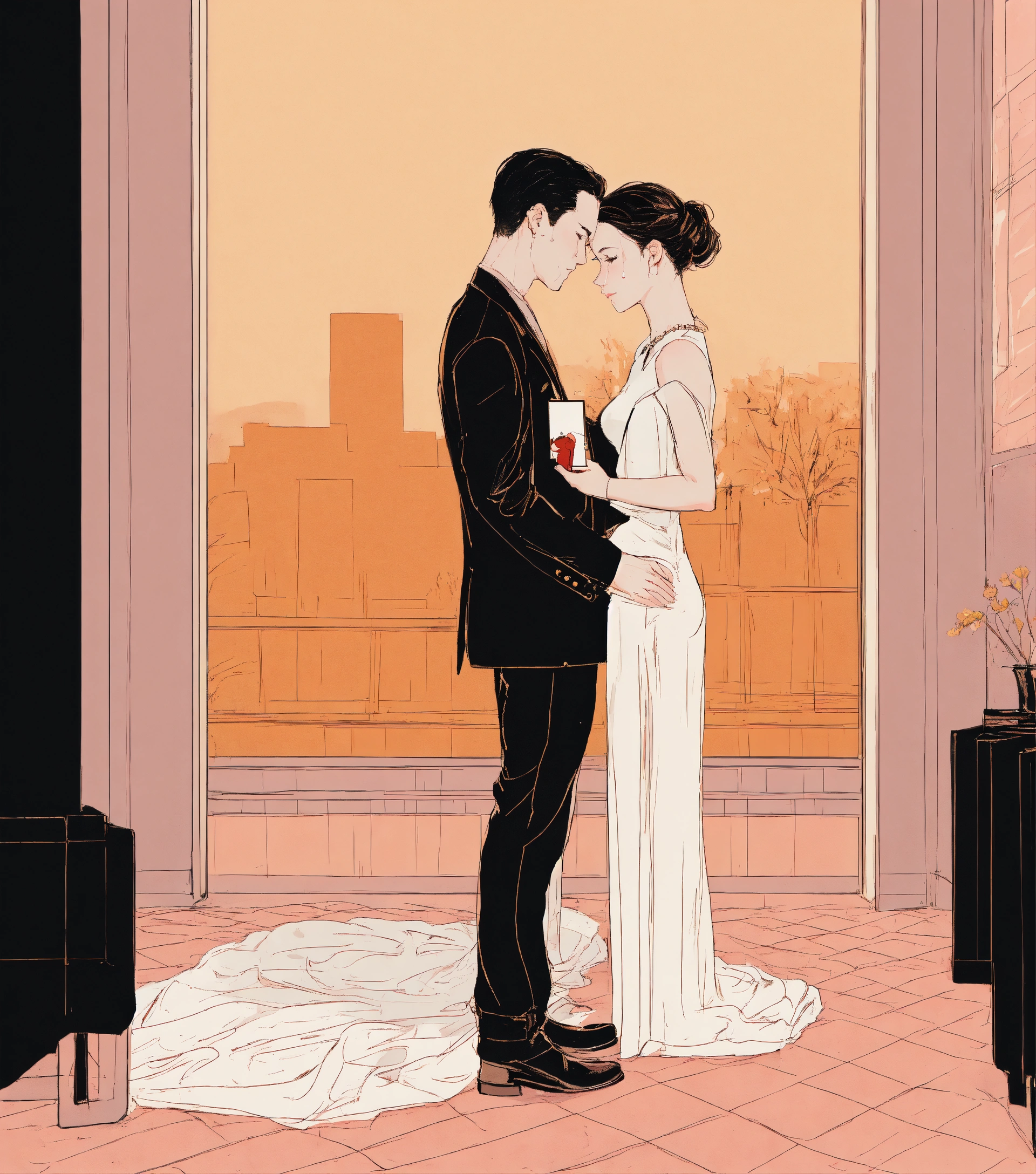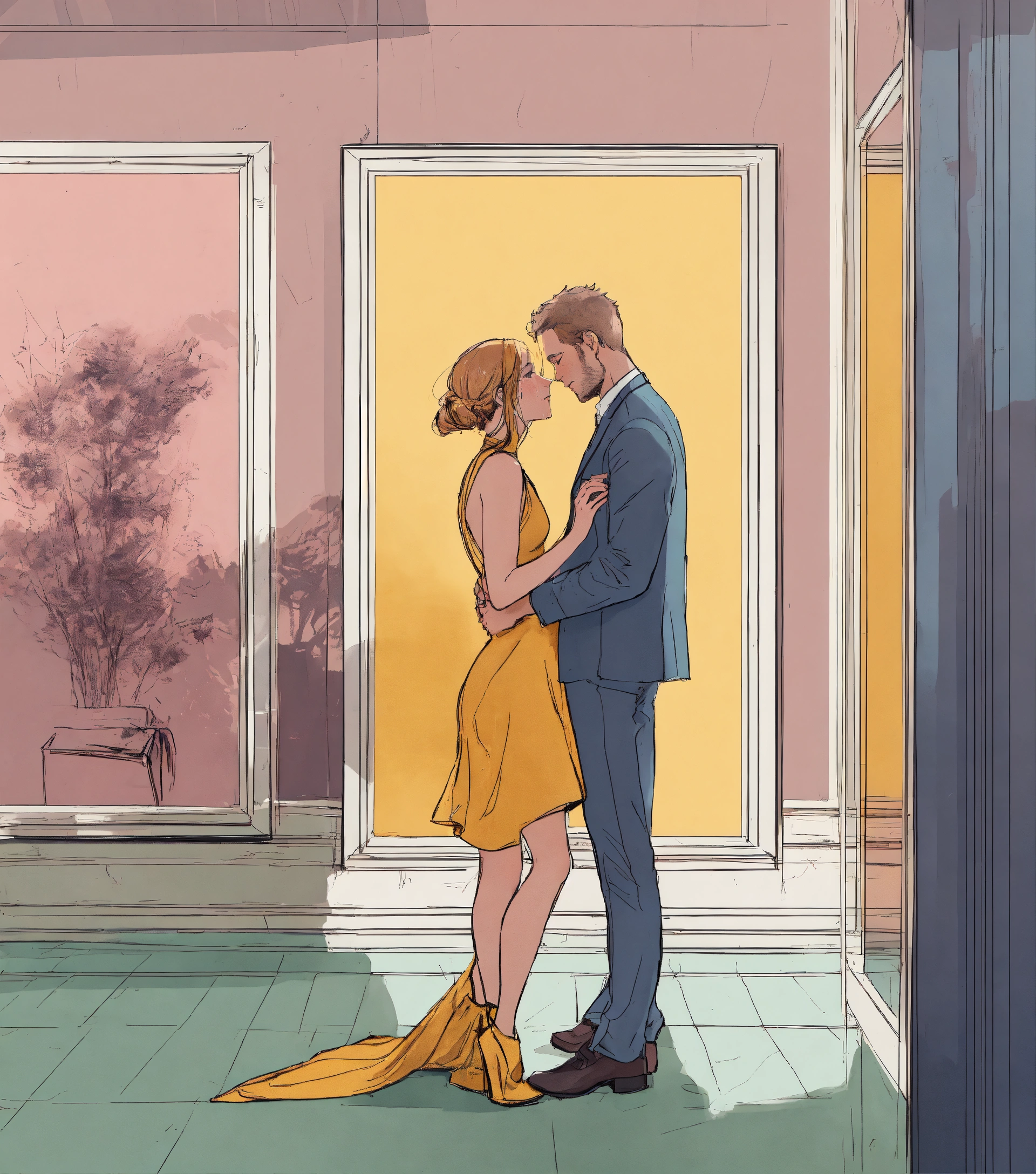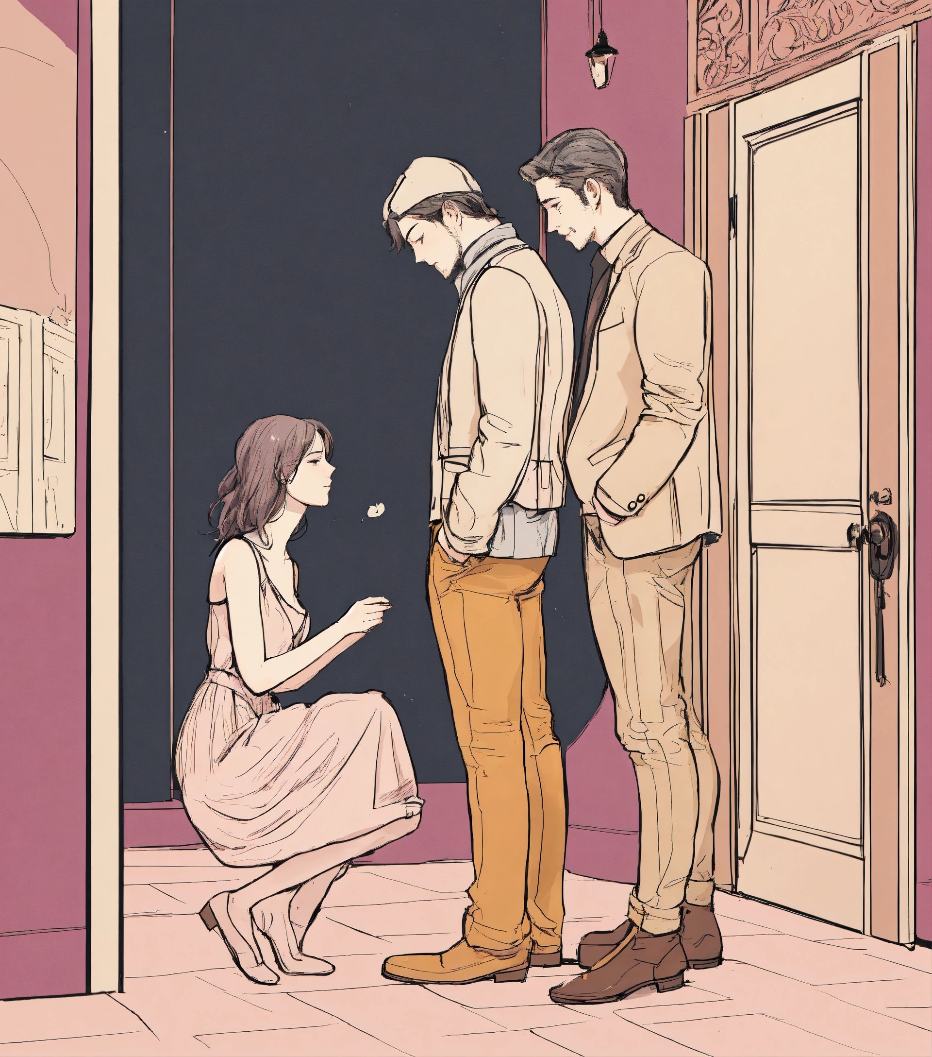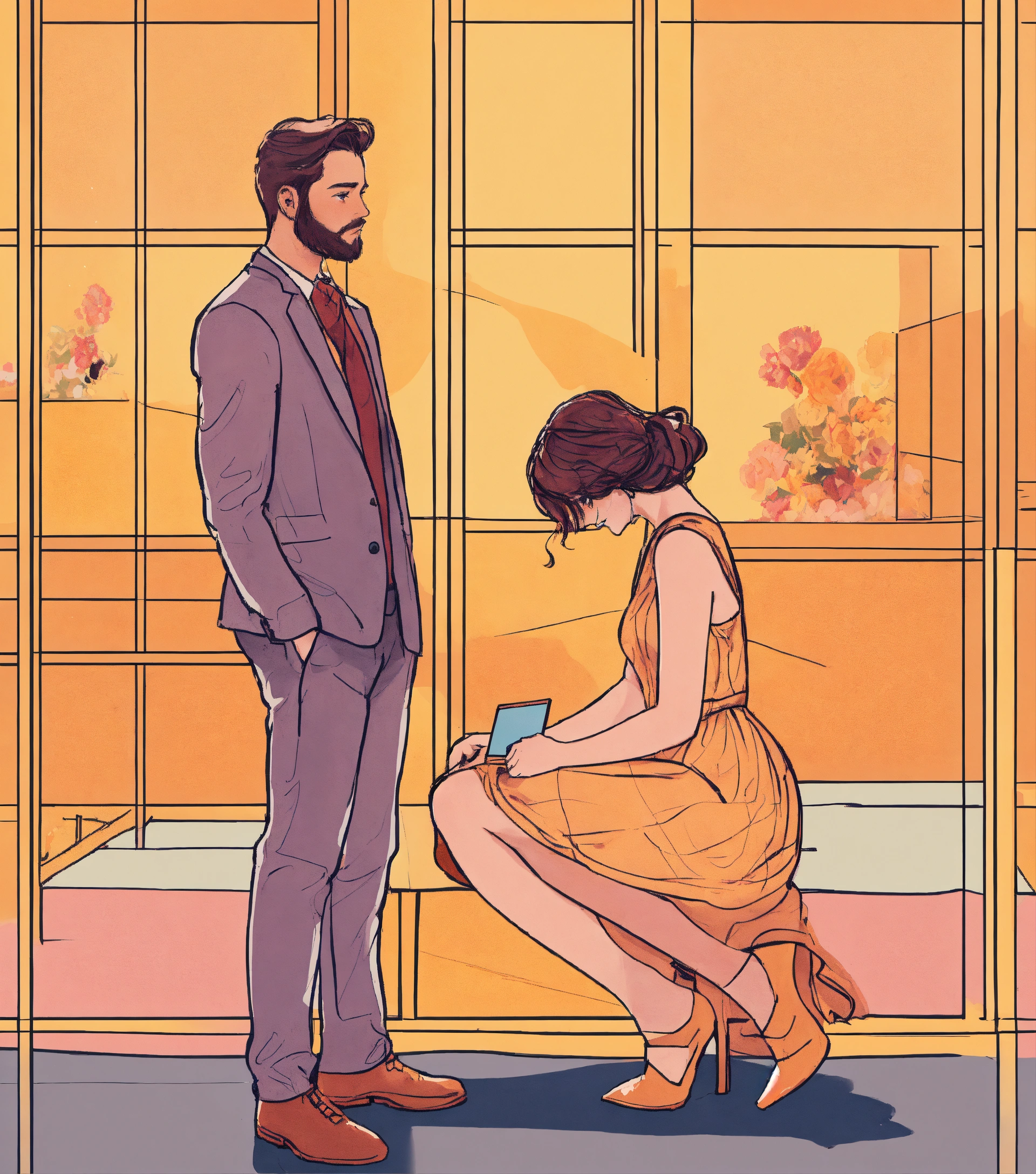 Man begging woman to stay in a relationship with him, he is down on one knee holding her hand, she is standing facing away from him holding a picture in a picture frame of them together, she is wearing a party dress, color, details, proportionate body parts of people, golden proportion grid for the composition, realistic, clean sketch, hand drawn style, woman walking away from man begging for her attention, she is holding a picture of them together, she is in an edgy outfit, she is looking down, the man is crying, line art, illustration, minimal, 2d, modern, aesthetically pleasing.