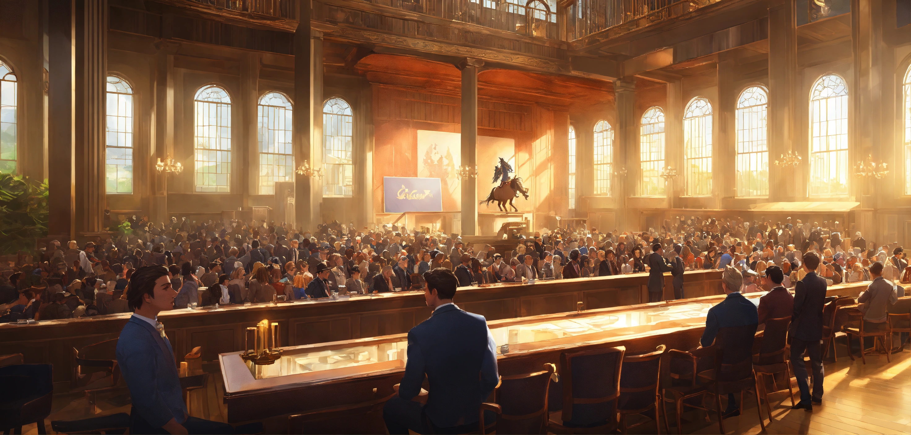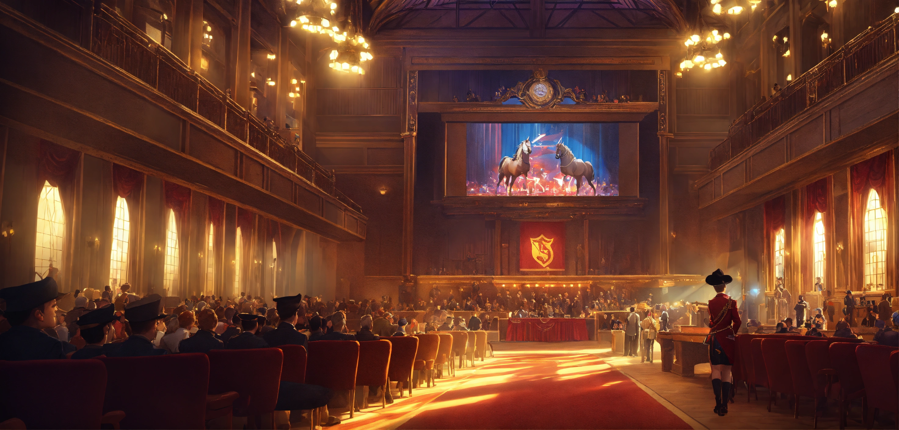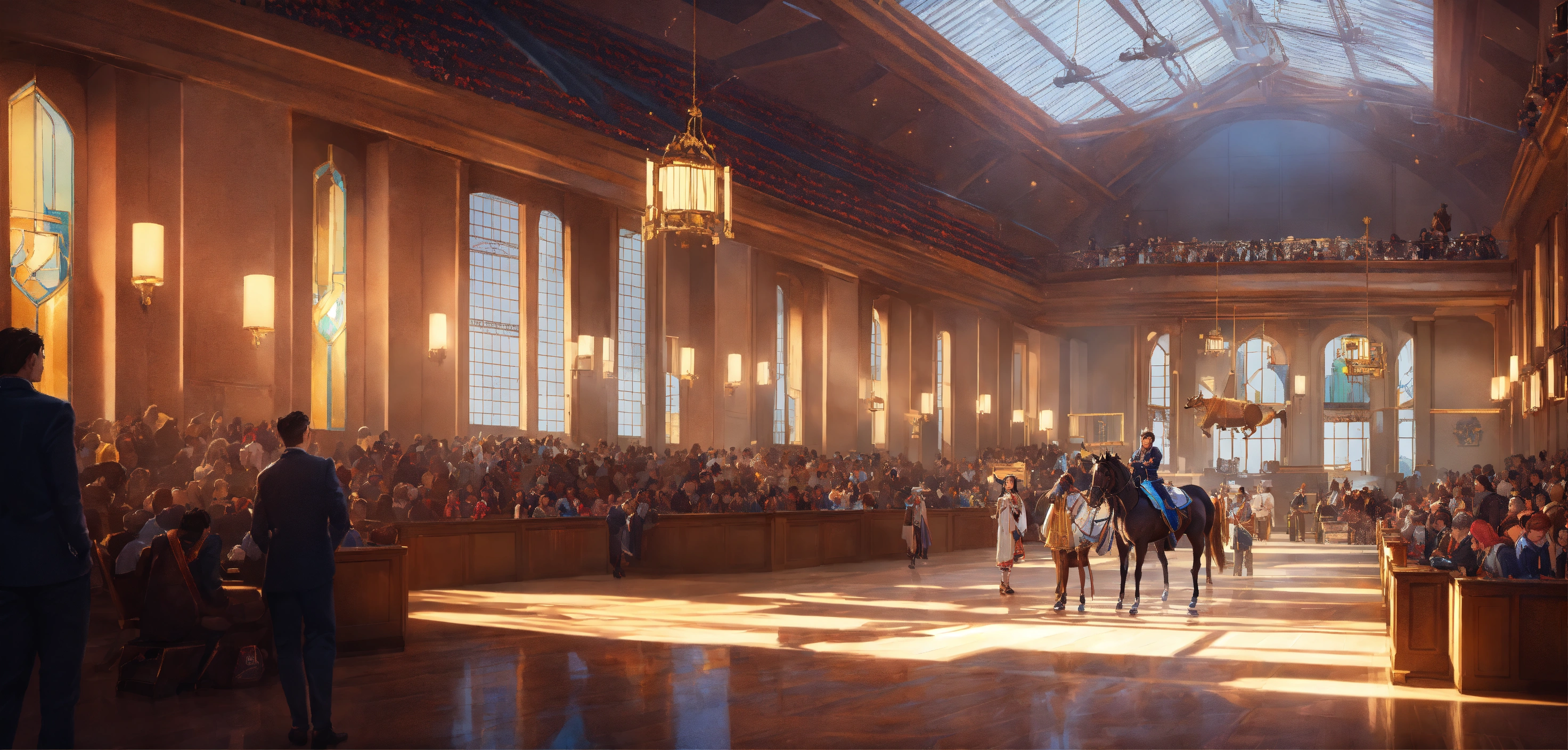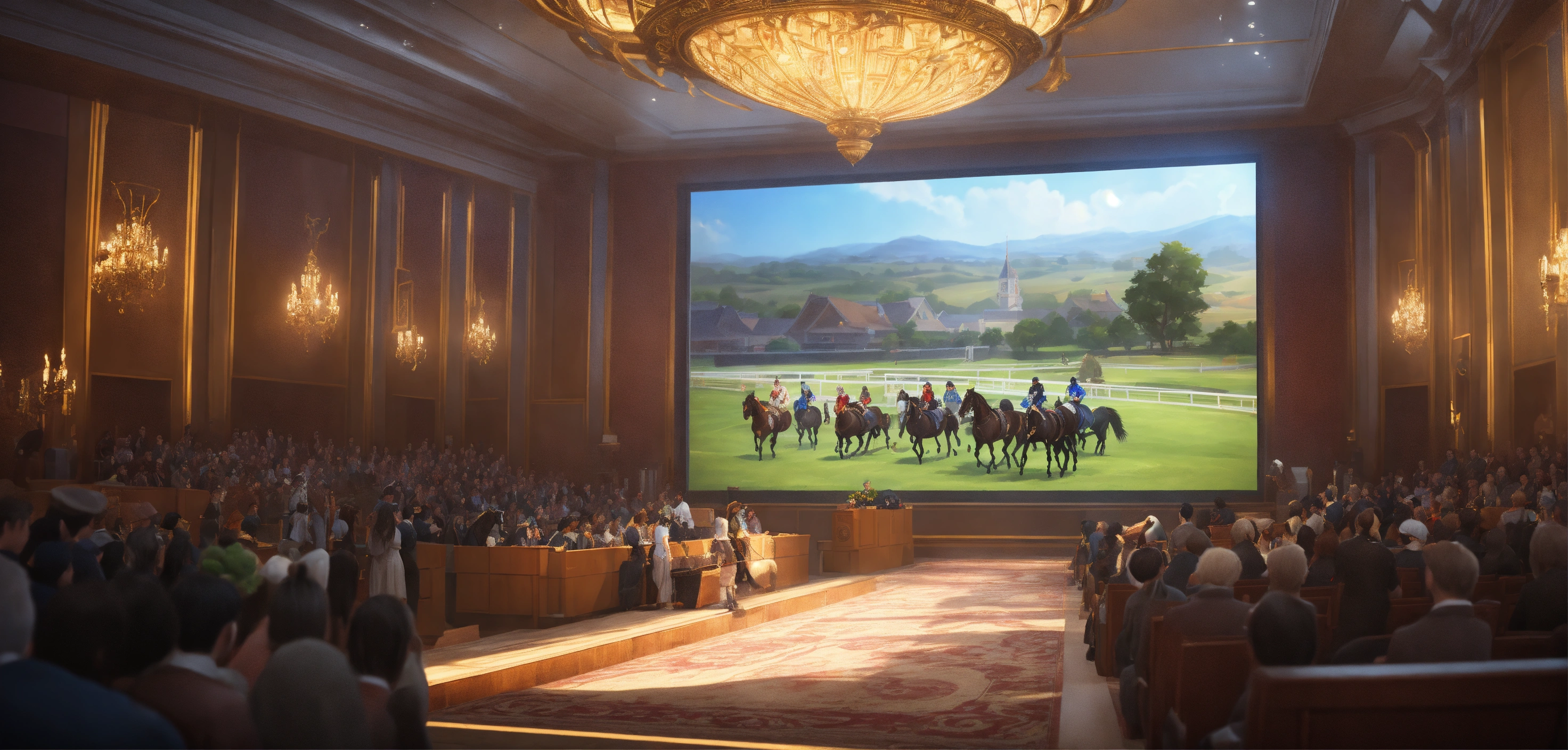 A highly detailed league of legend dynamic illustration of the horse auction in modern event hall by joshua raphael, by artgerm, by huyy nguyen, by cj xander, by jennifer wuestling, by diep duong van, by huyy nguyen, by grafit studio, volumetric lighting, 3d render, 4k resolution, trending on artstation, masterpiece, close up frame, cinematic shot, sport competition, epic, keeneland sales, inside hall with stands, lot of armchairs with people, one horse in centre only, evening, hall without windows