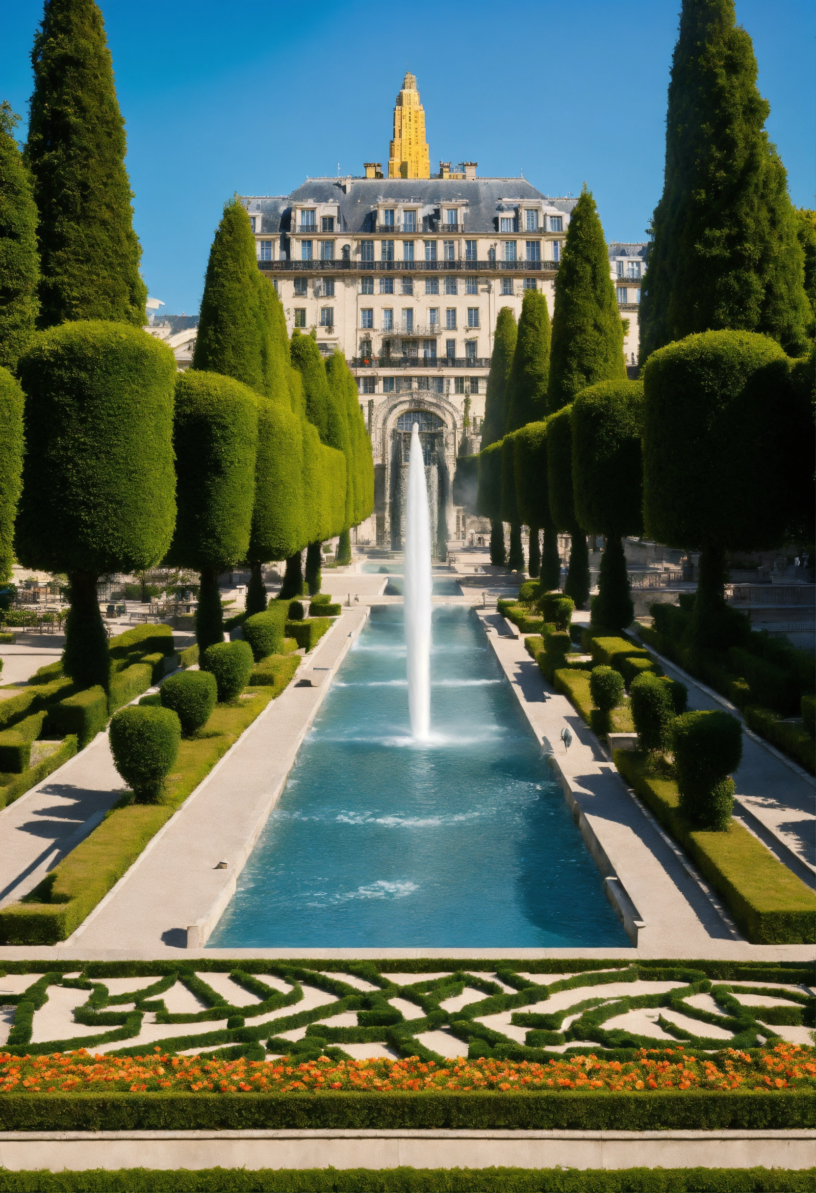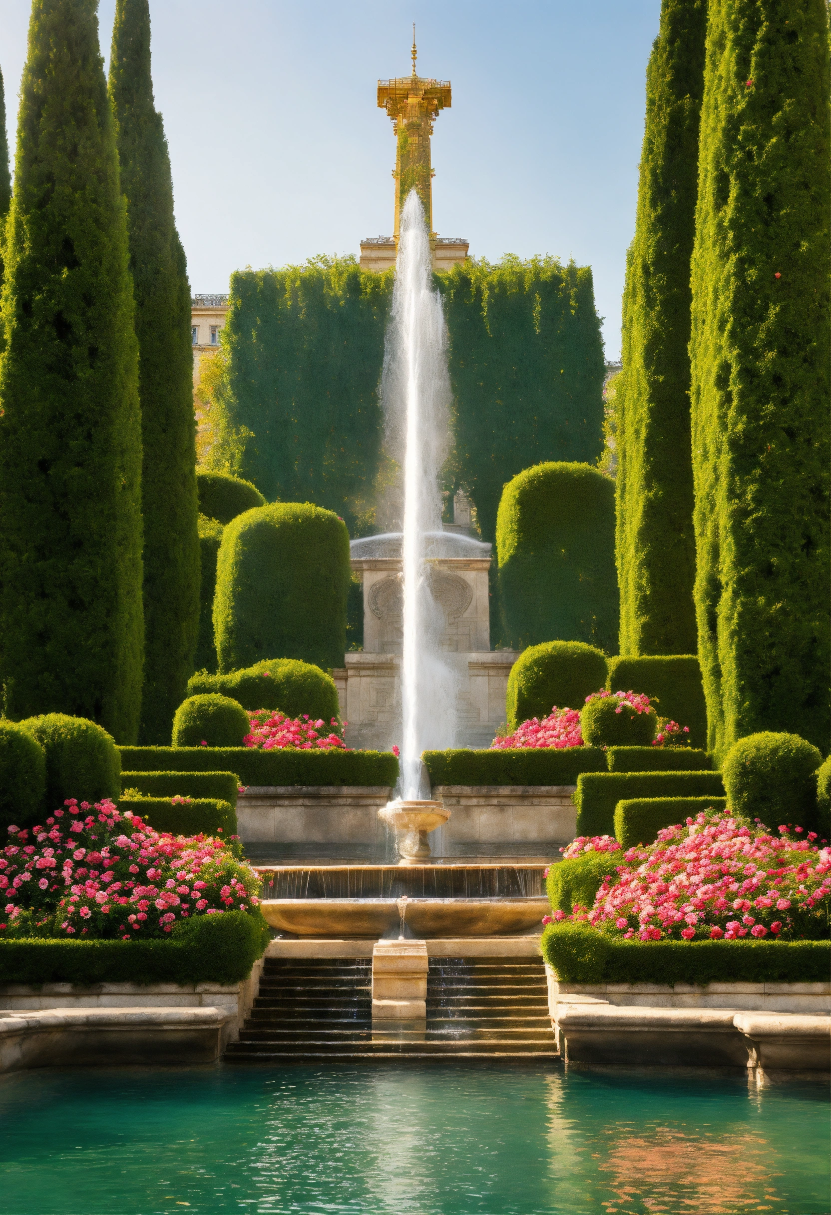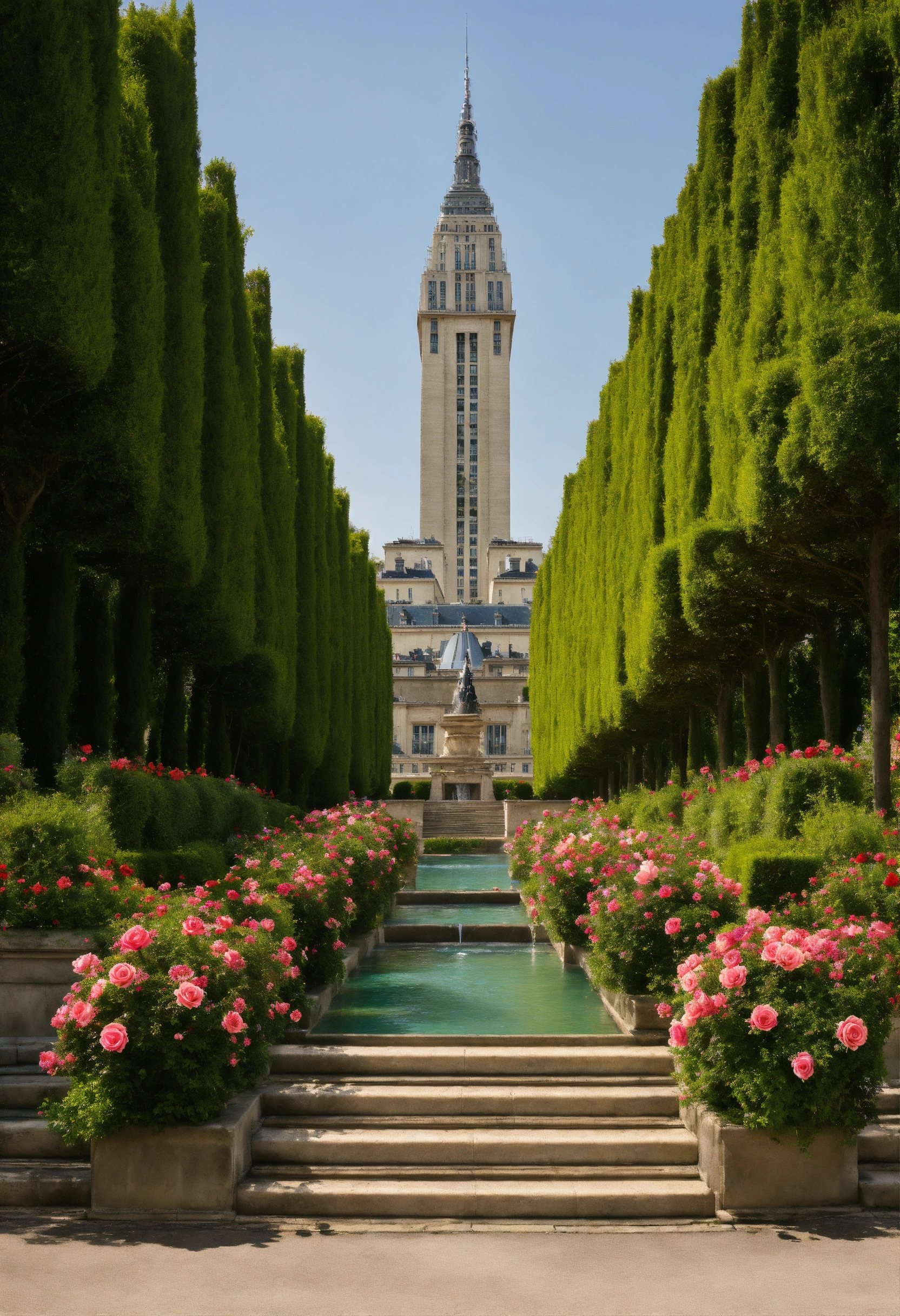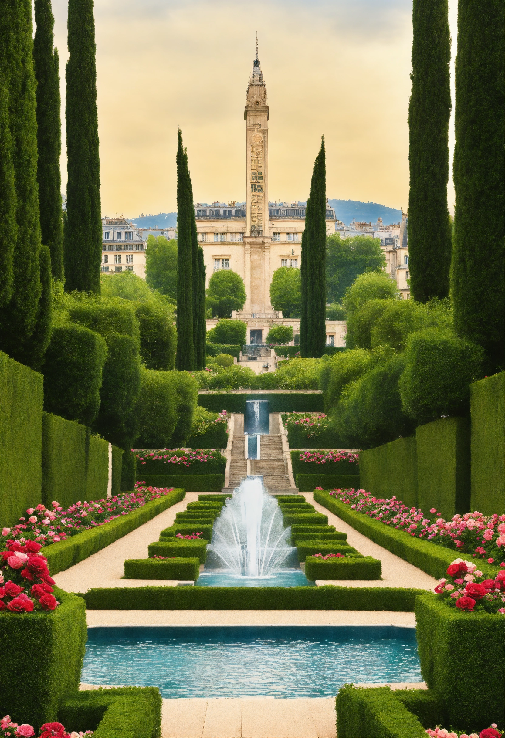 Water falls, geneva water fountain jet d’eau, cypress trees tall, roses, art deco maze hedges, pool canal, ornade sculpted stone masonry haussmannian parisian style empire state building with french roof tops, hérgé style illustration, symmetrical symmetrysteps staircase, hanging gardens