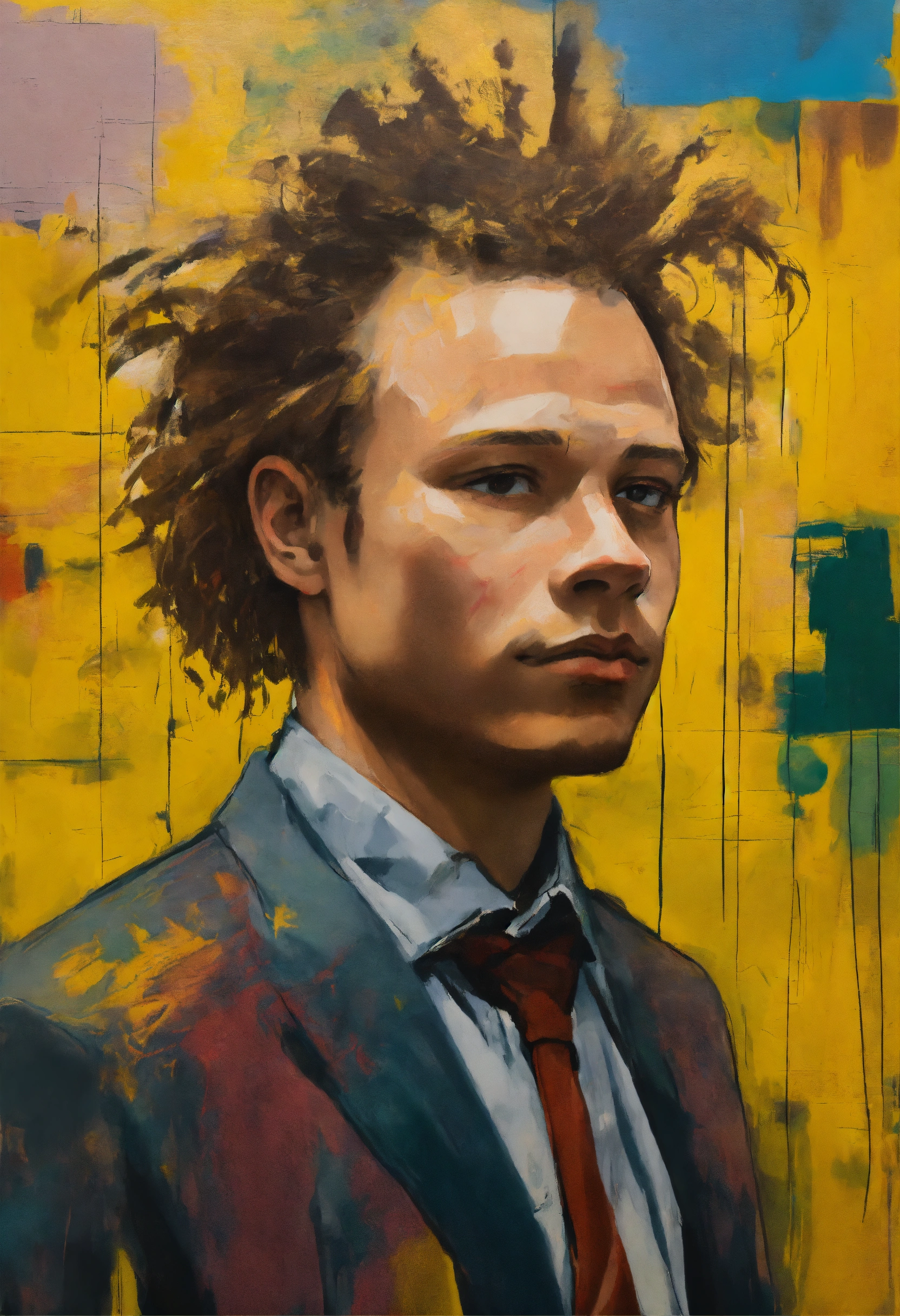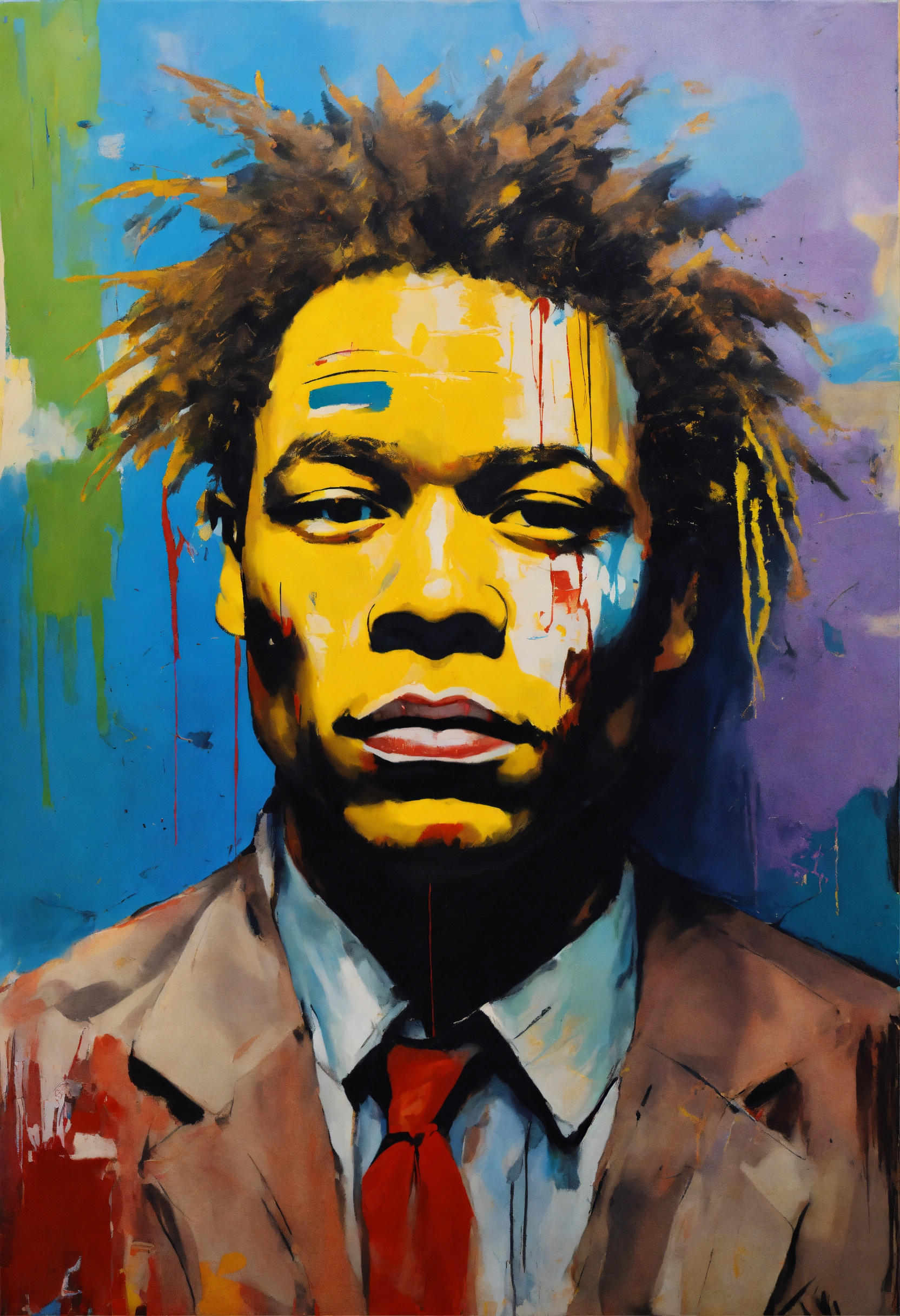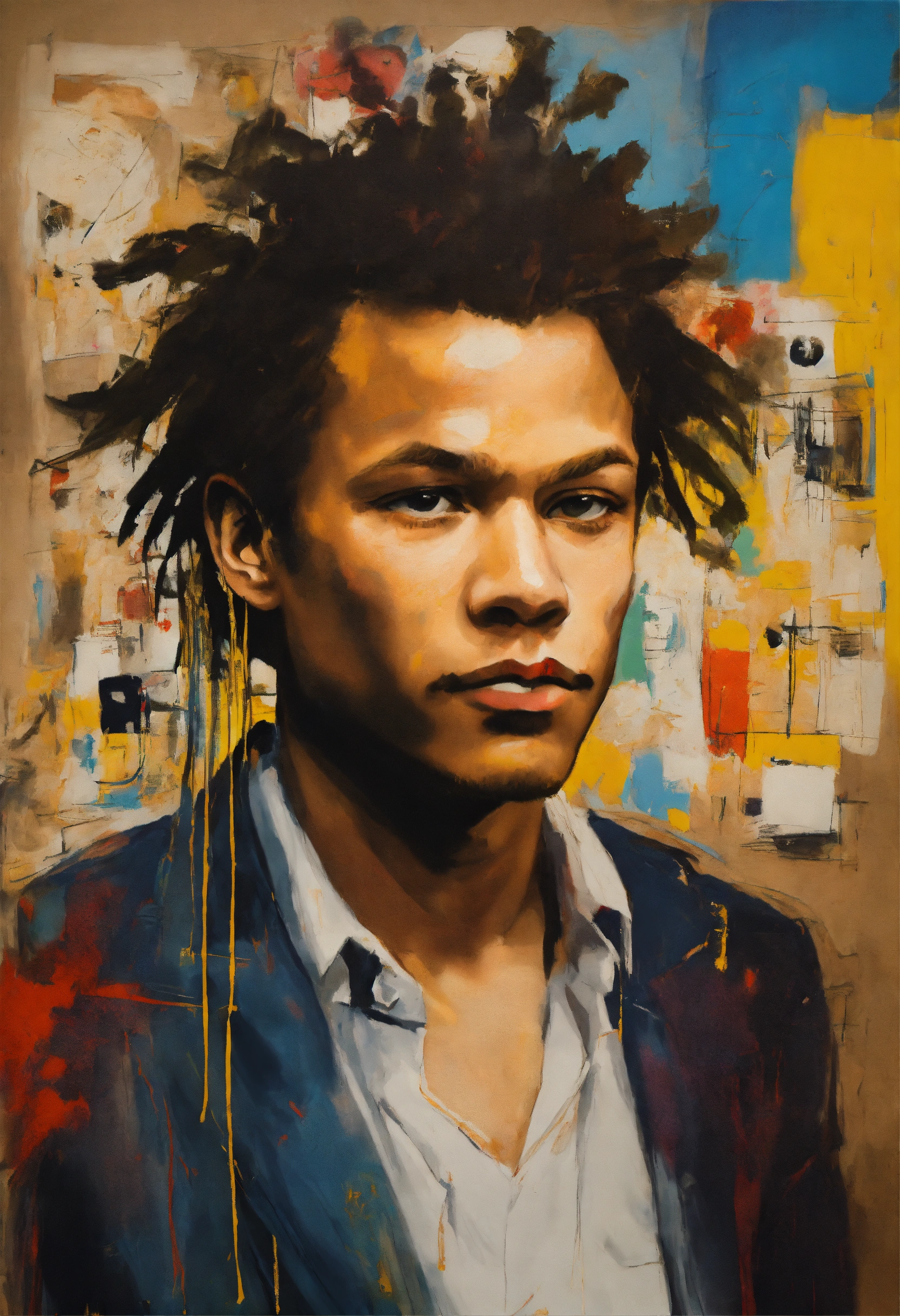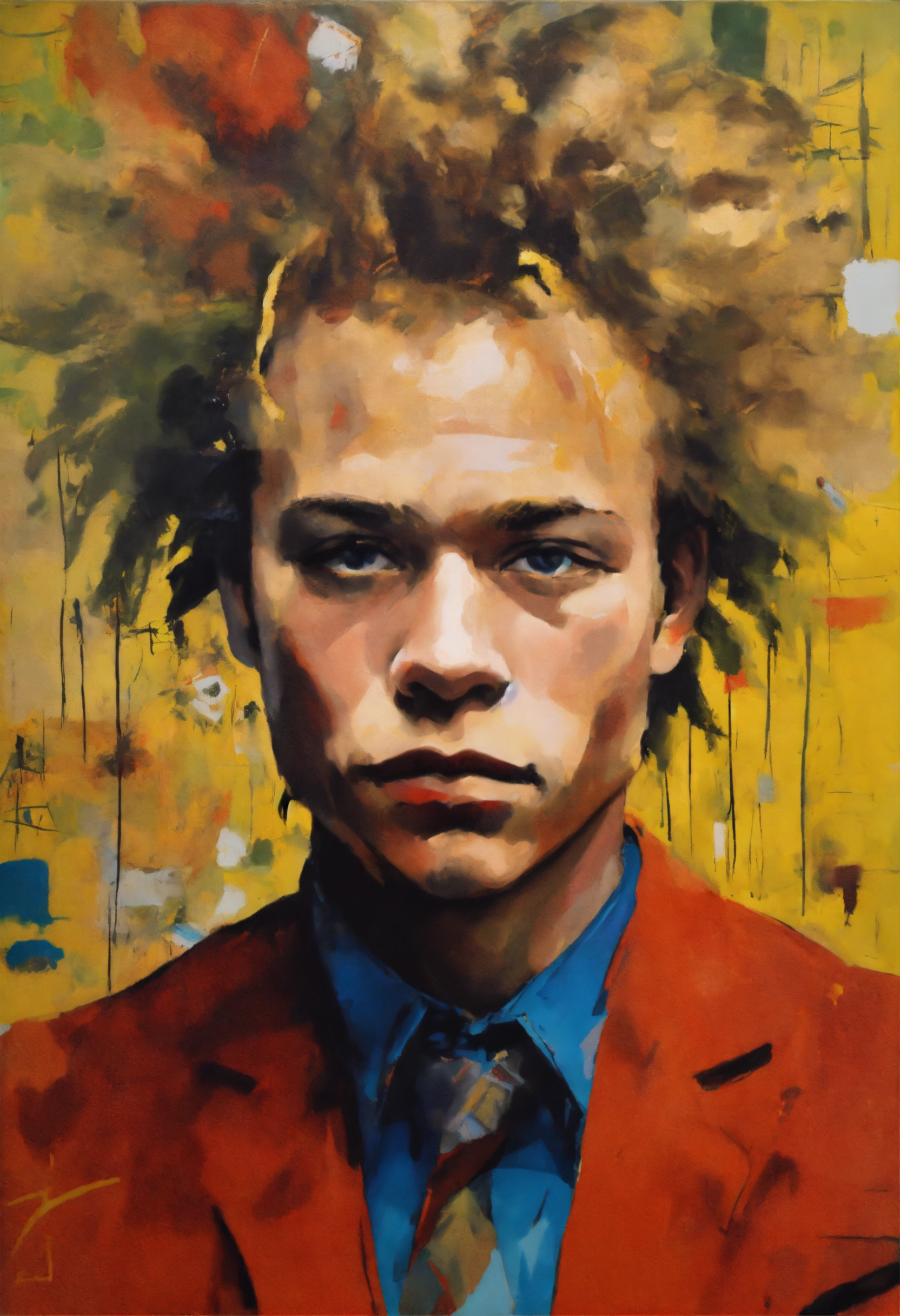 Create an neo-expressionist painting inspired by jean michael basquiat and blend it with the style of georges lepape drawings - create a painting of heath ledger