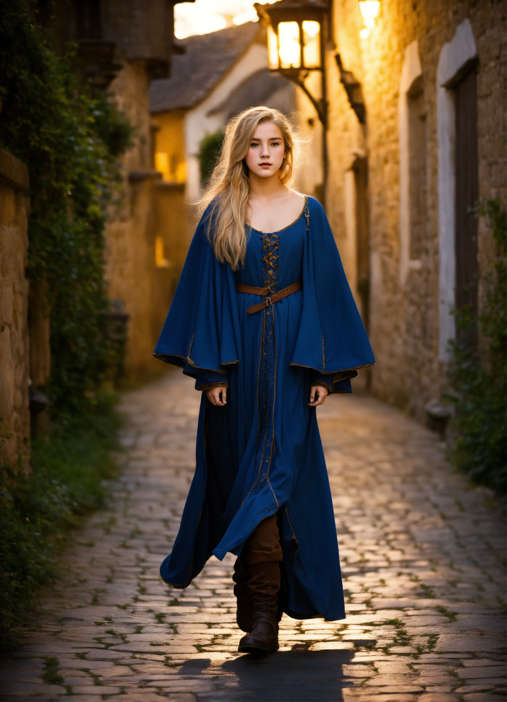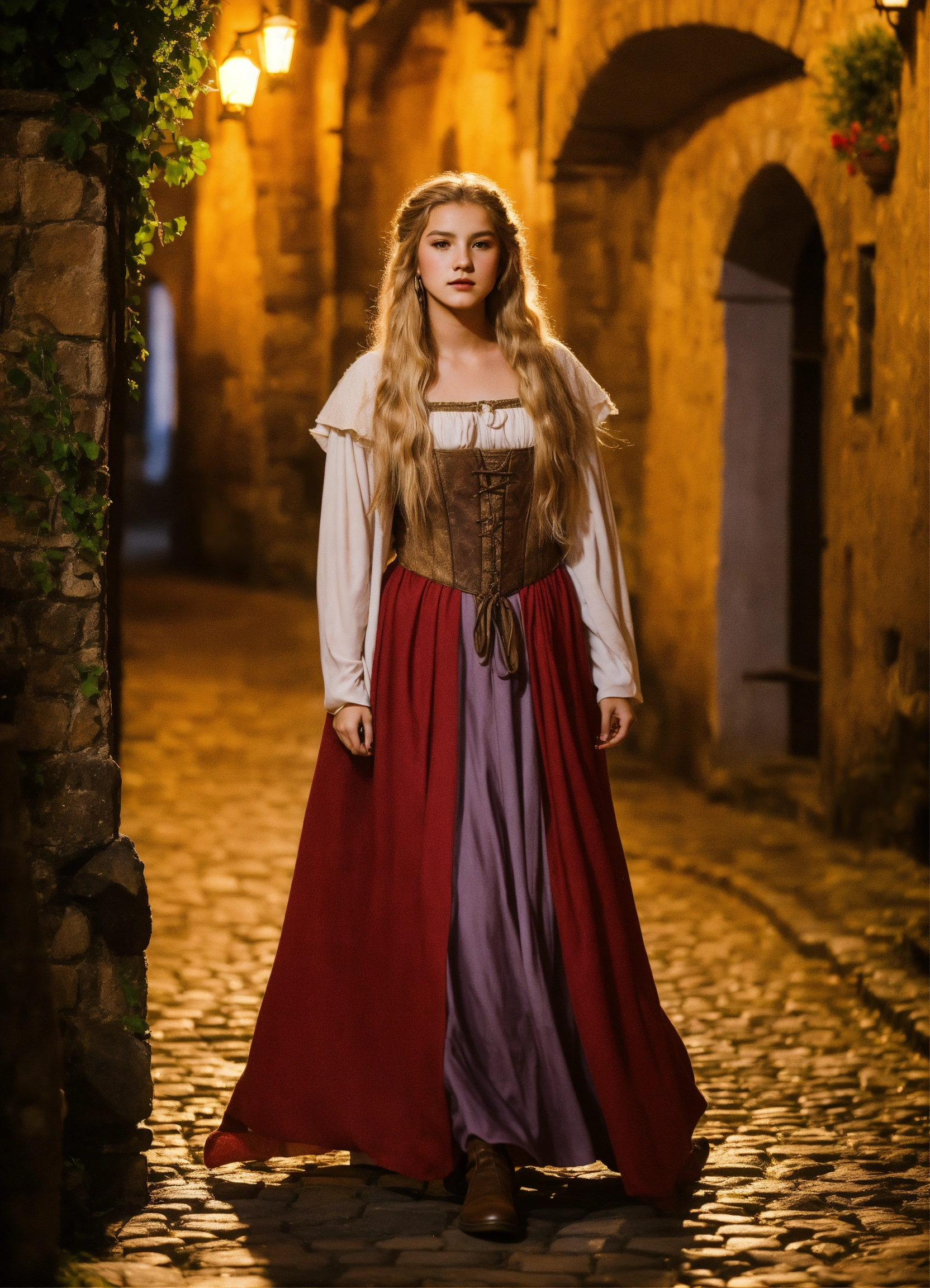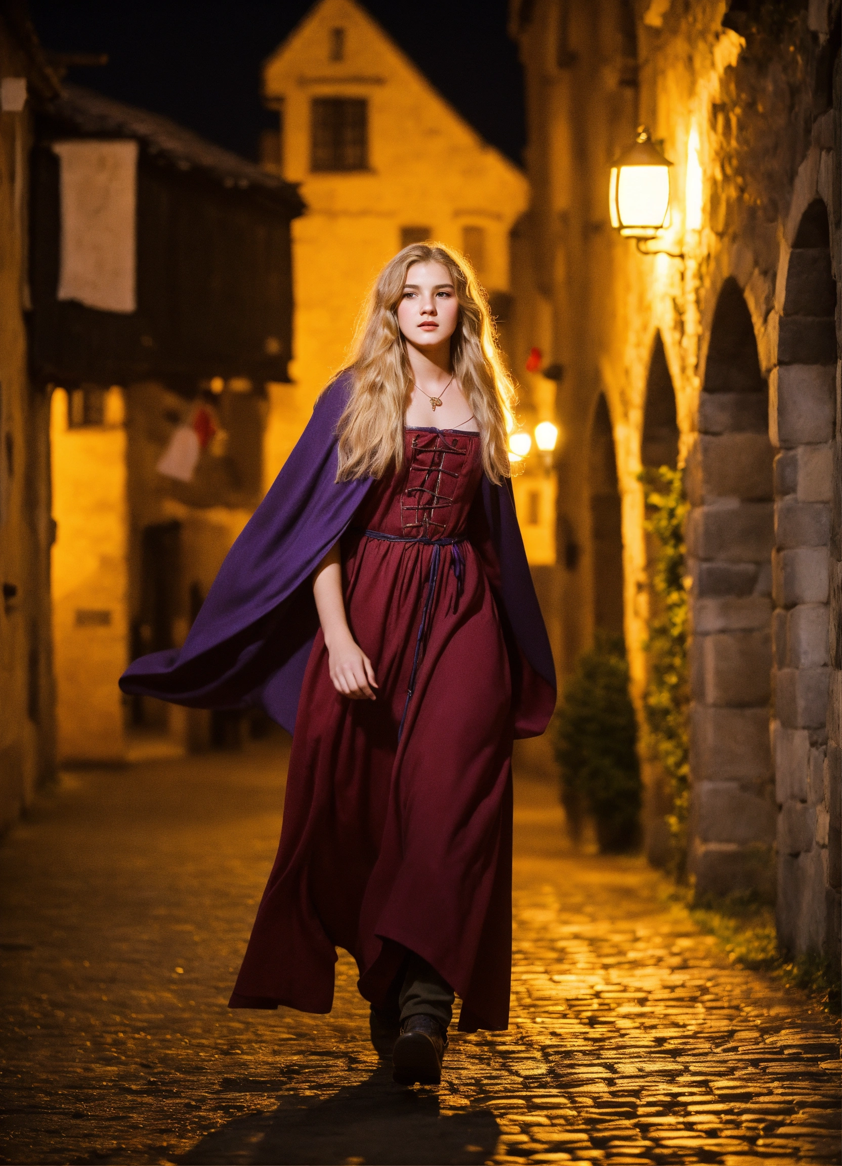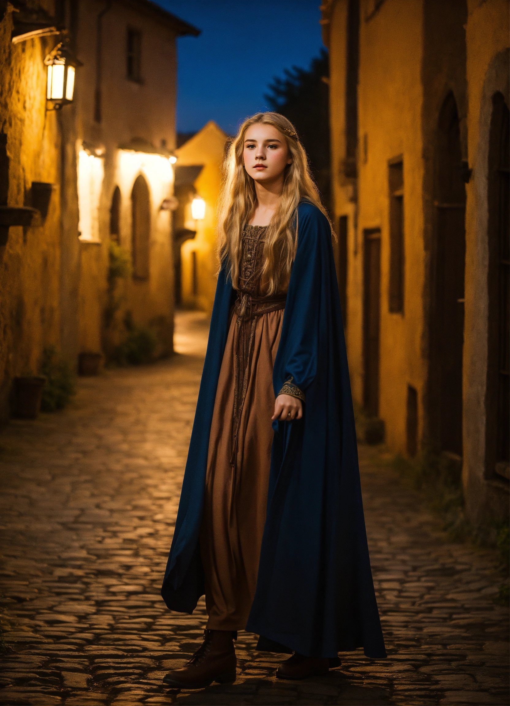 A beautiful genderqueer18-year-old boy walking nervously. feminine features, natural-looking feminine makeup, sculpted curves, long flowing blond hair, wearing a peasant dress and a cloak, set in a medieval town at night.k.