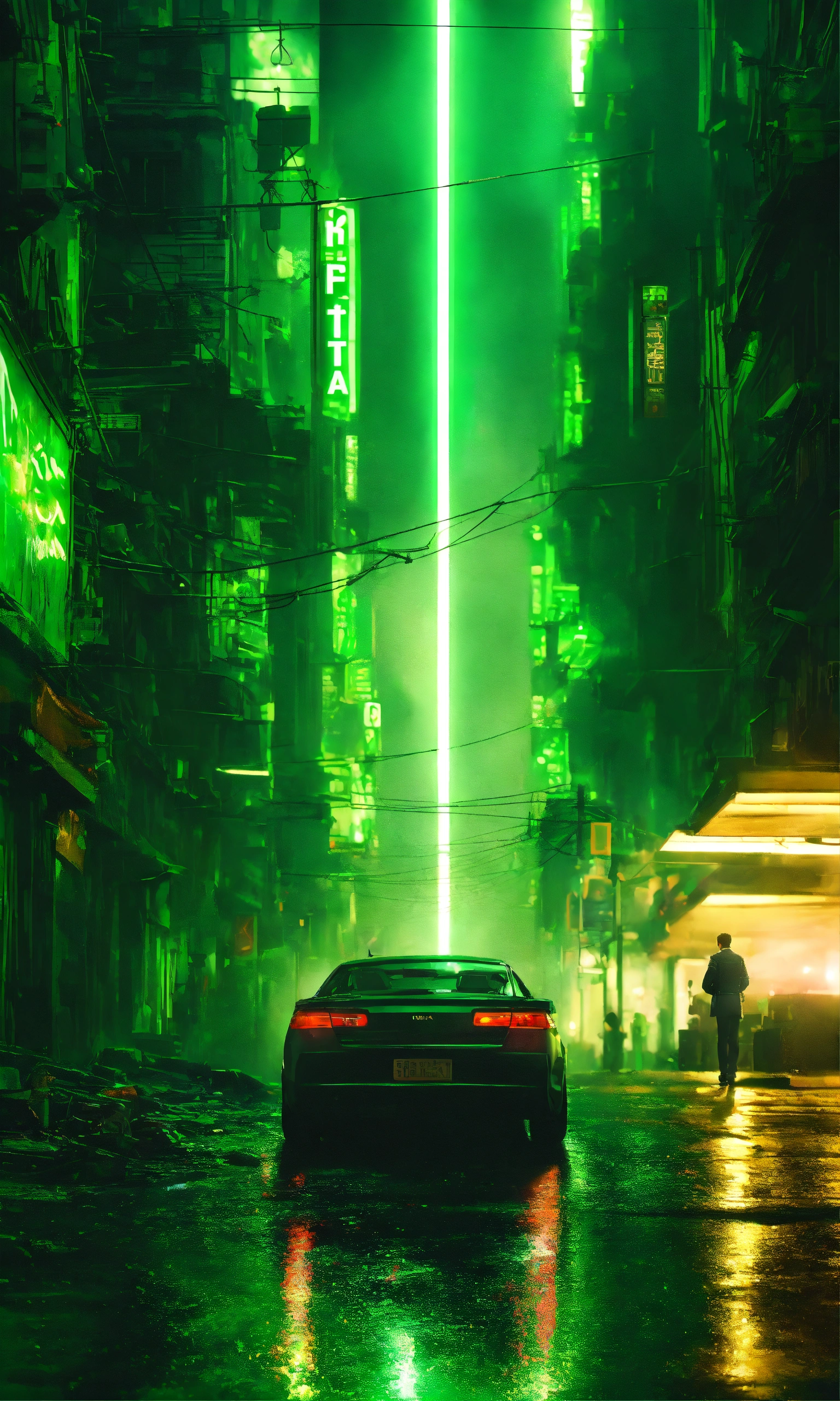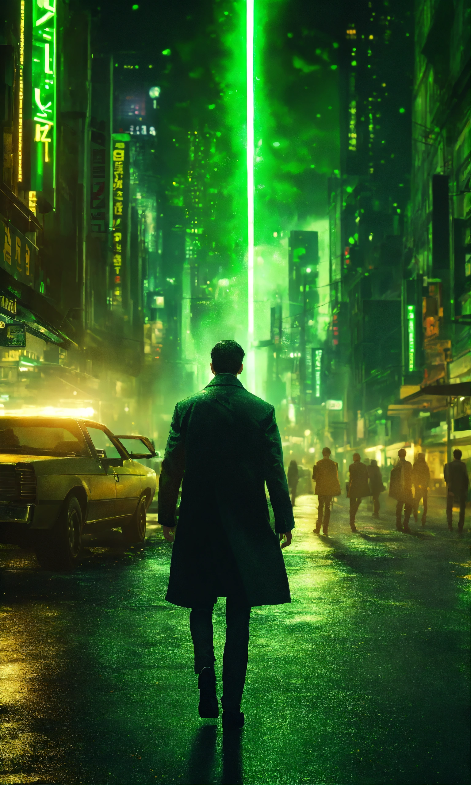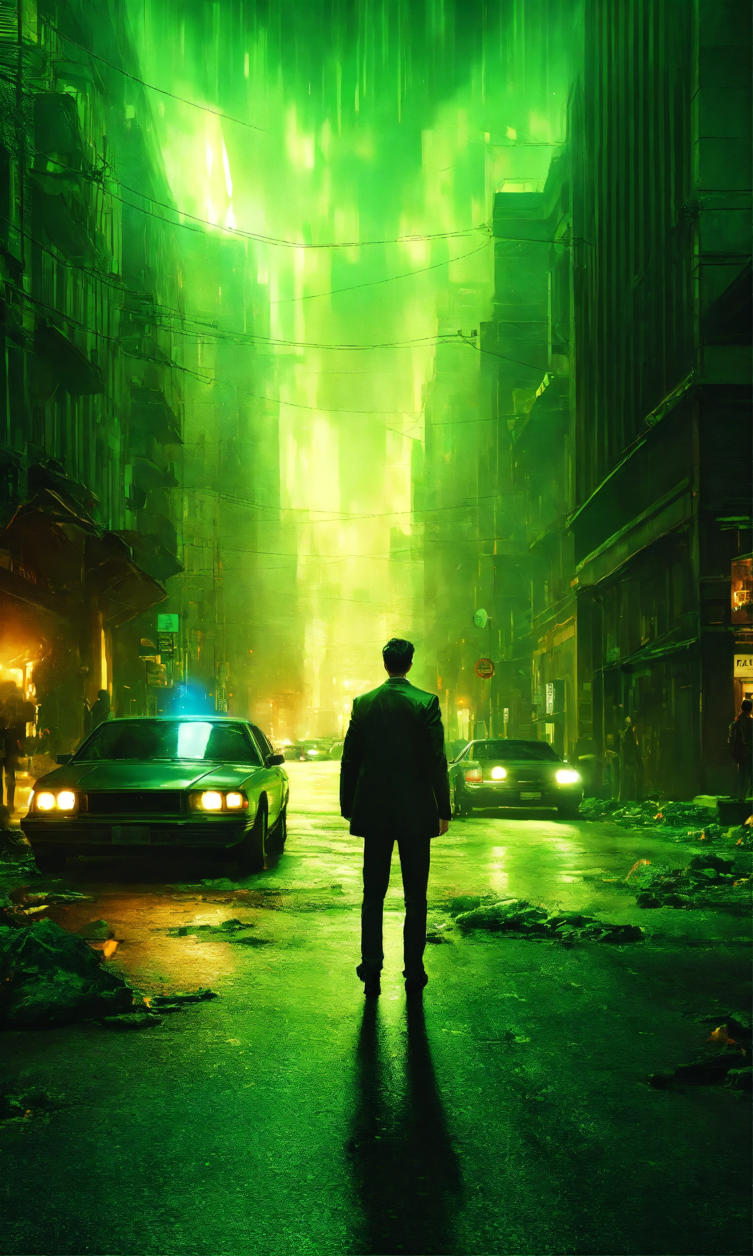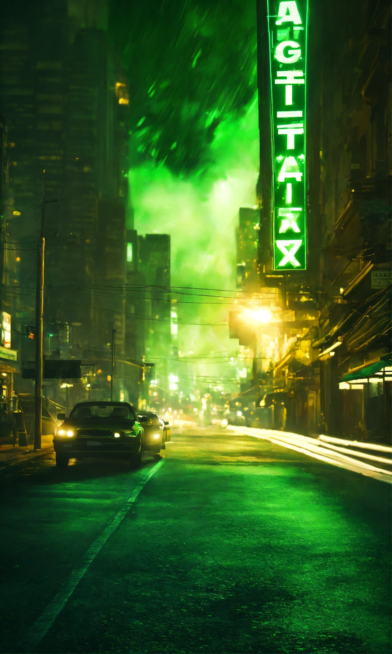 Night street, photo realistic, matrix ambience, big explosion in the background, green light, dark ambiance, hight detailed, matrix movie inspiration