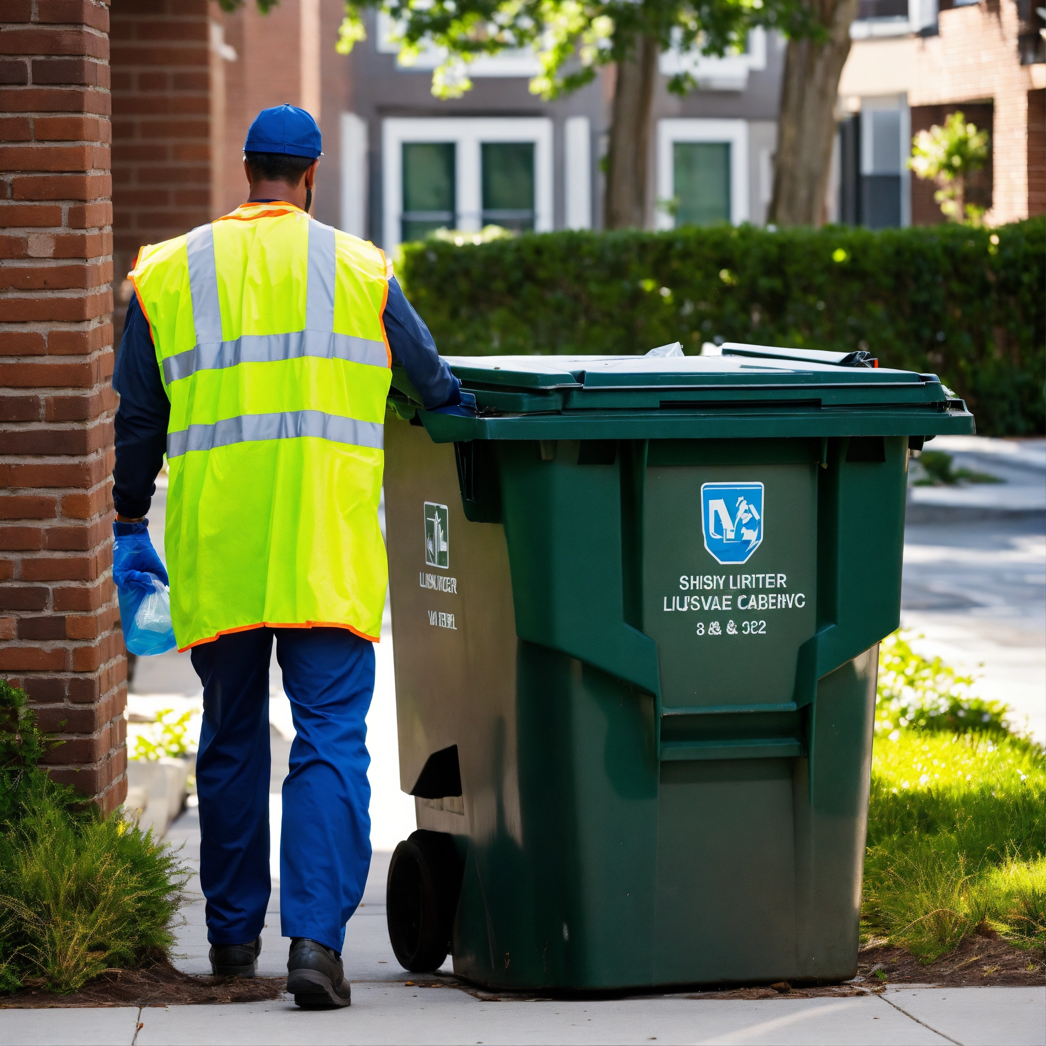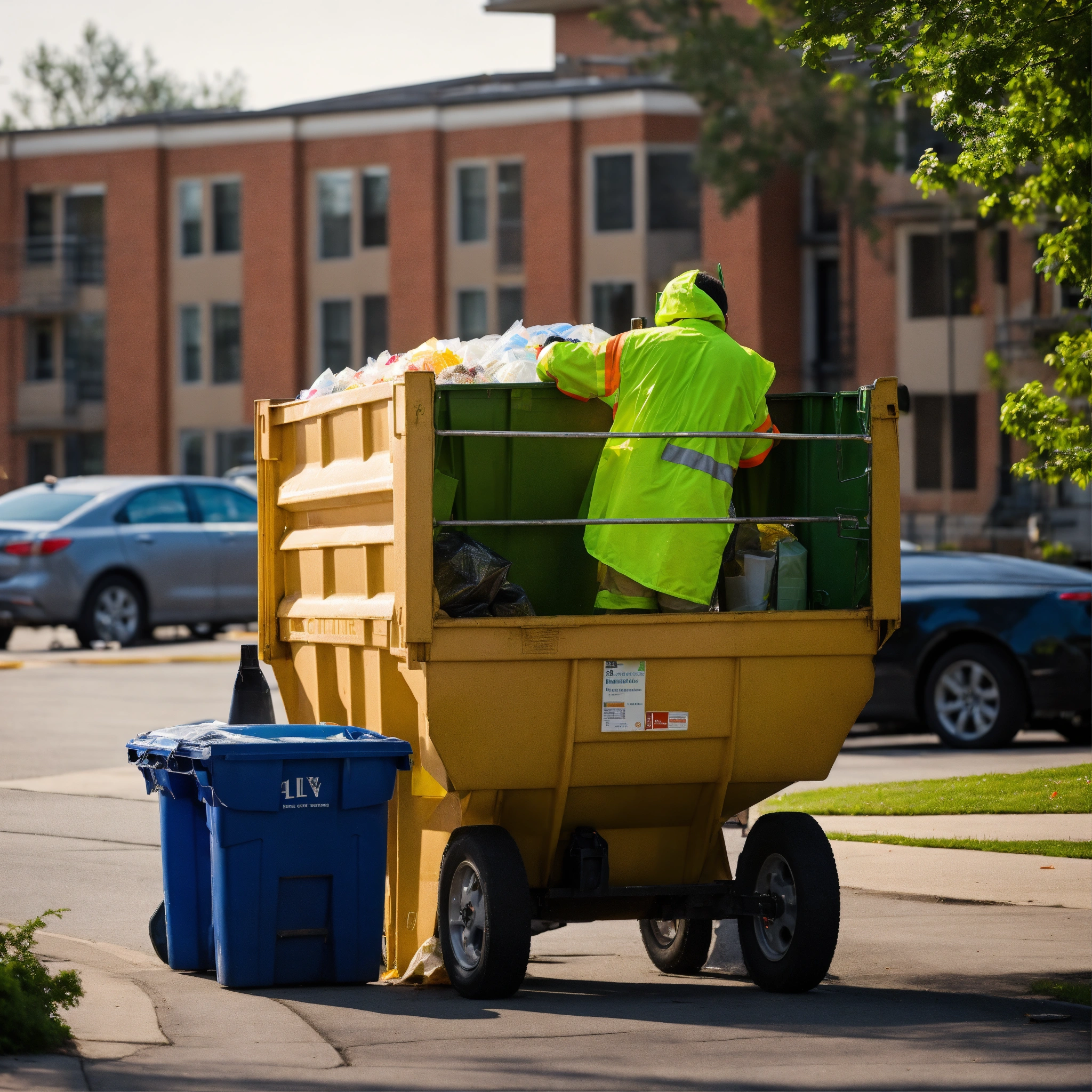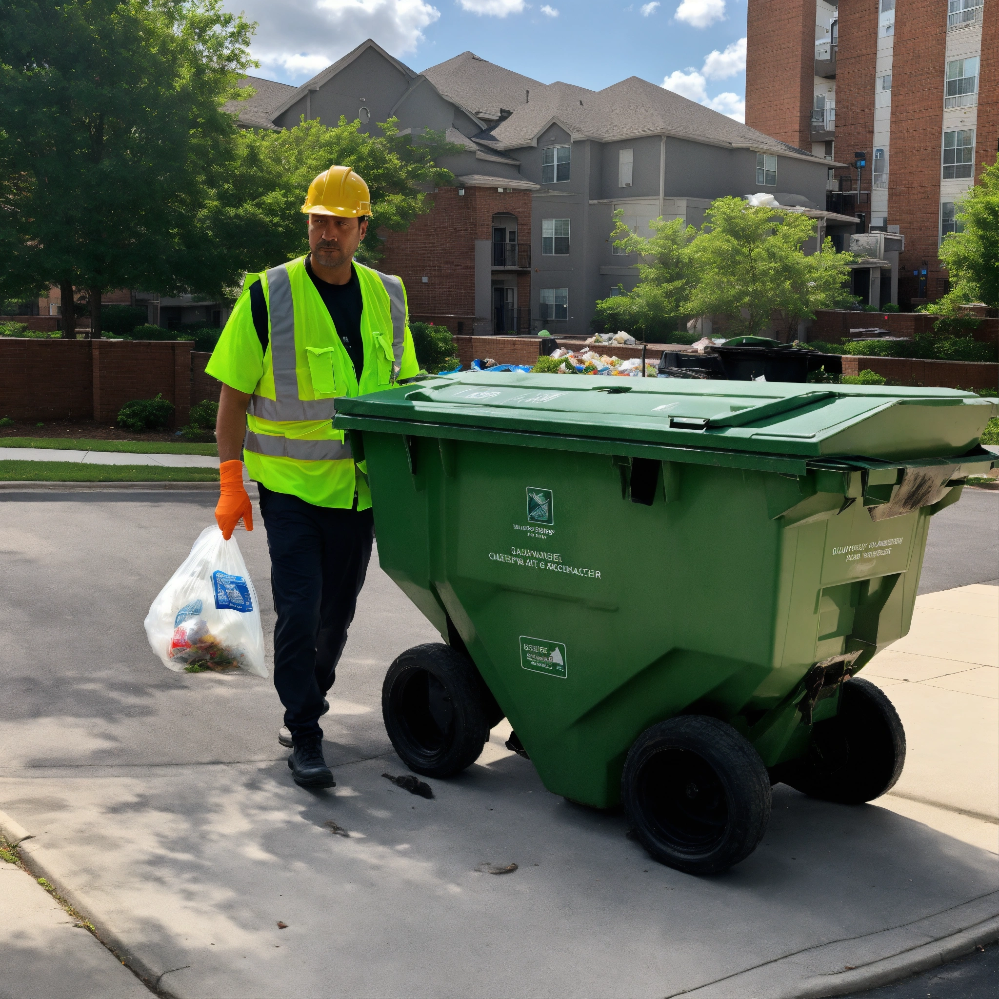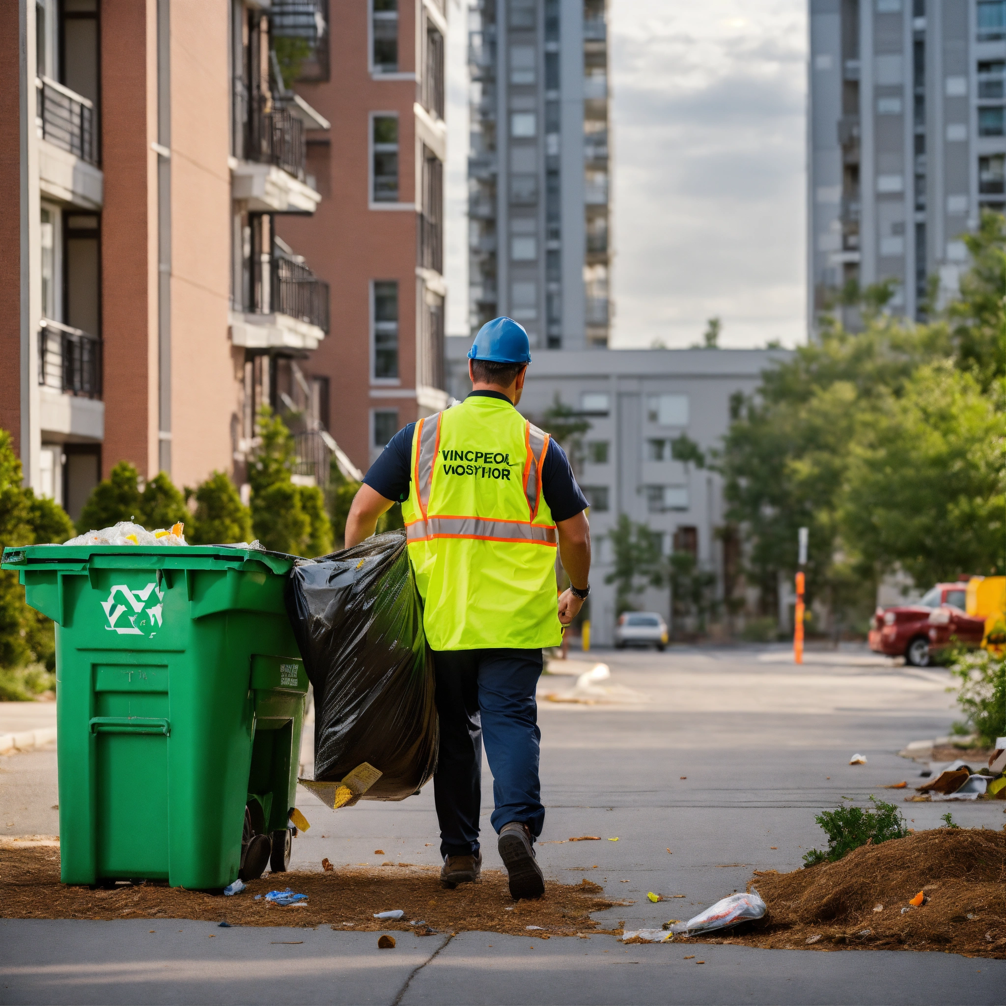 A photo of a man in a high-visibility vest taking out the garbage to a dumpster behind a luxury apartment complex