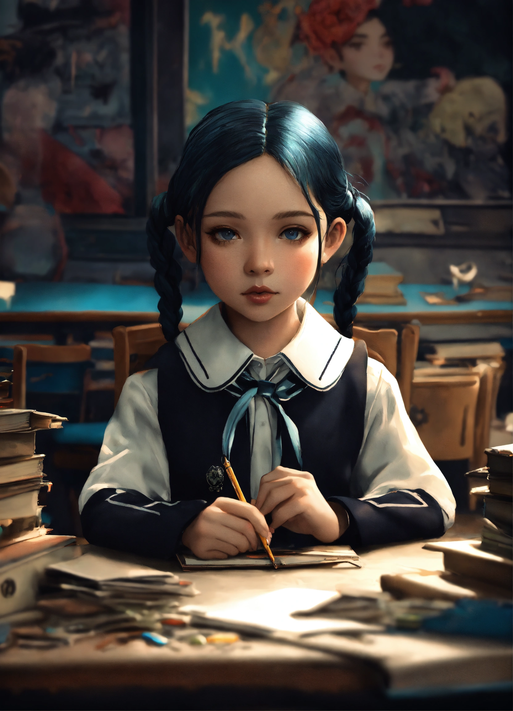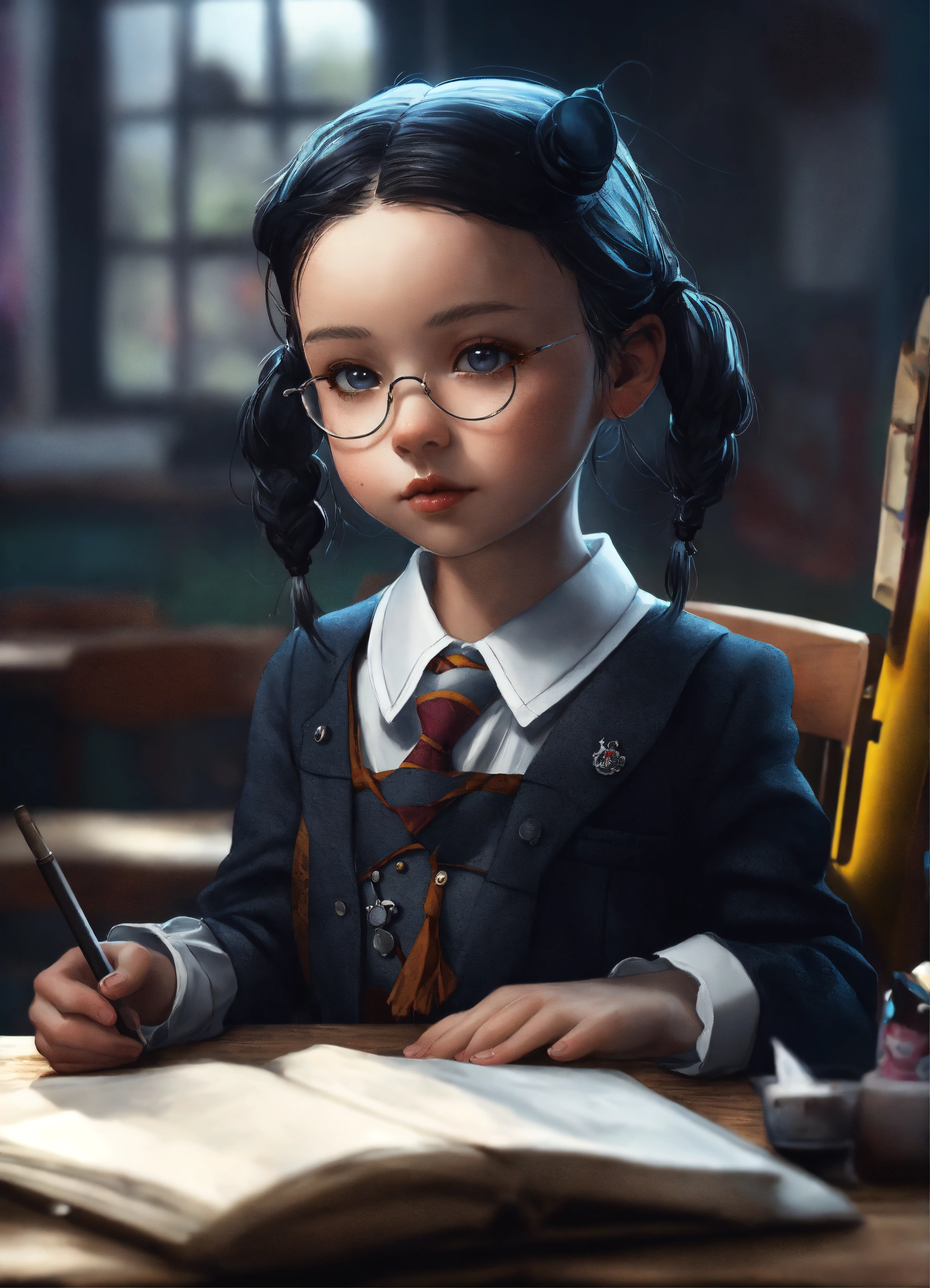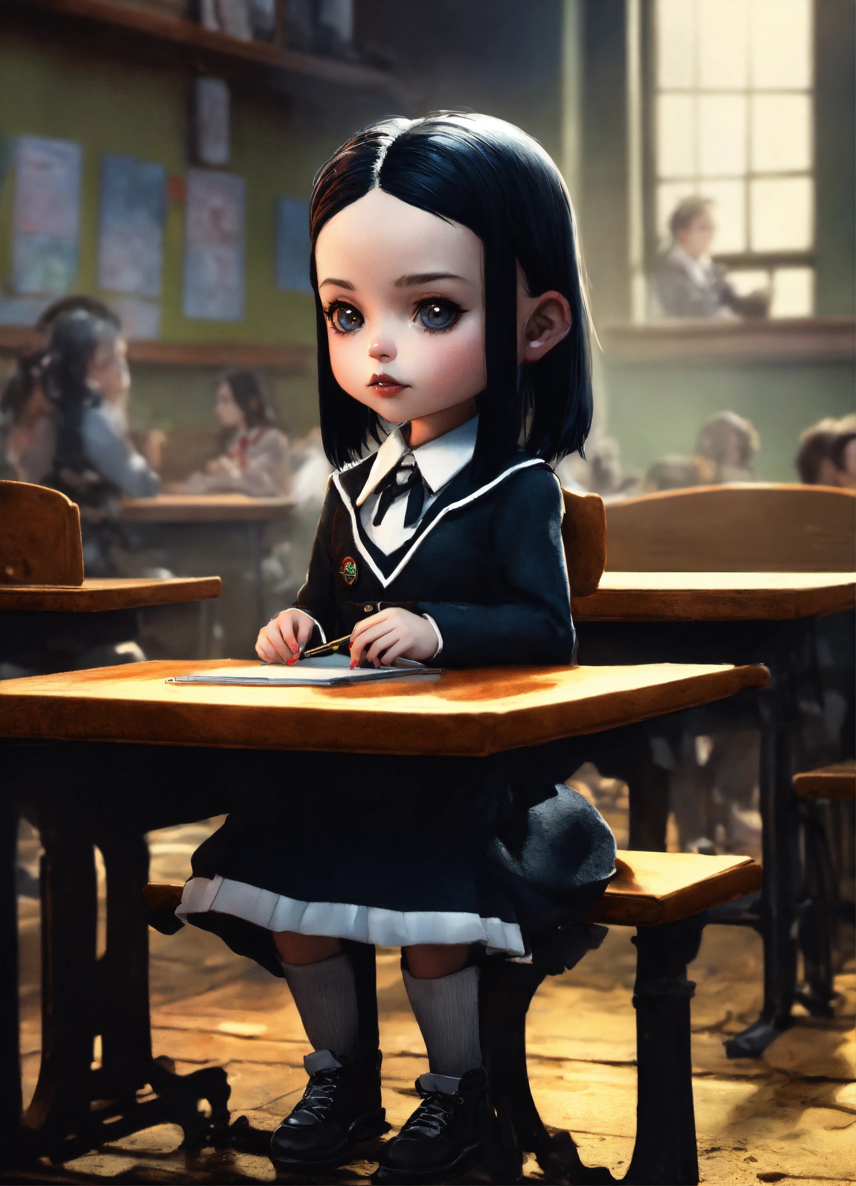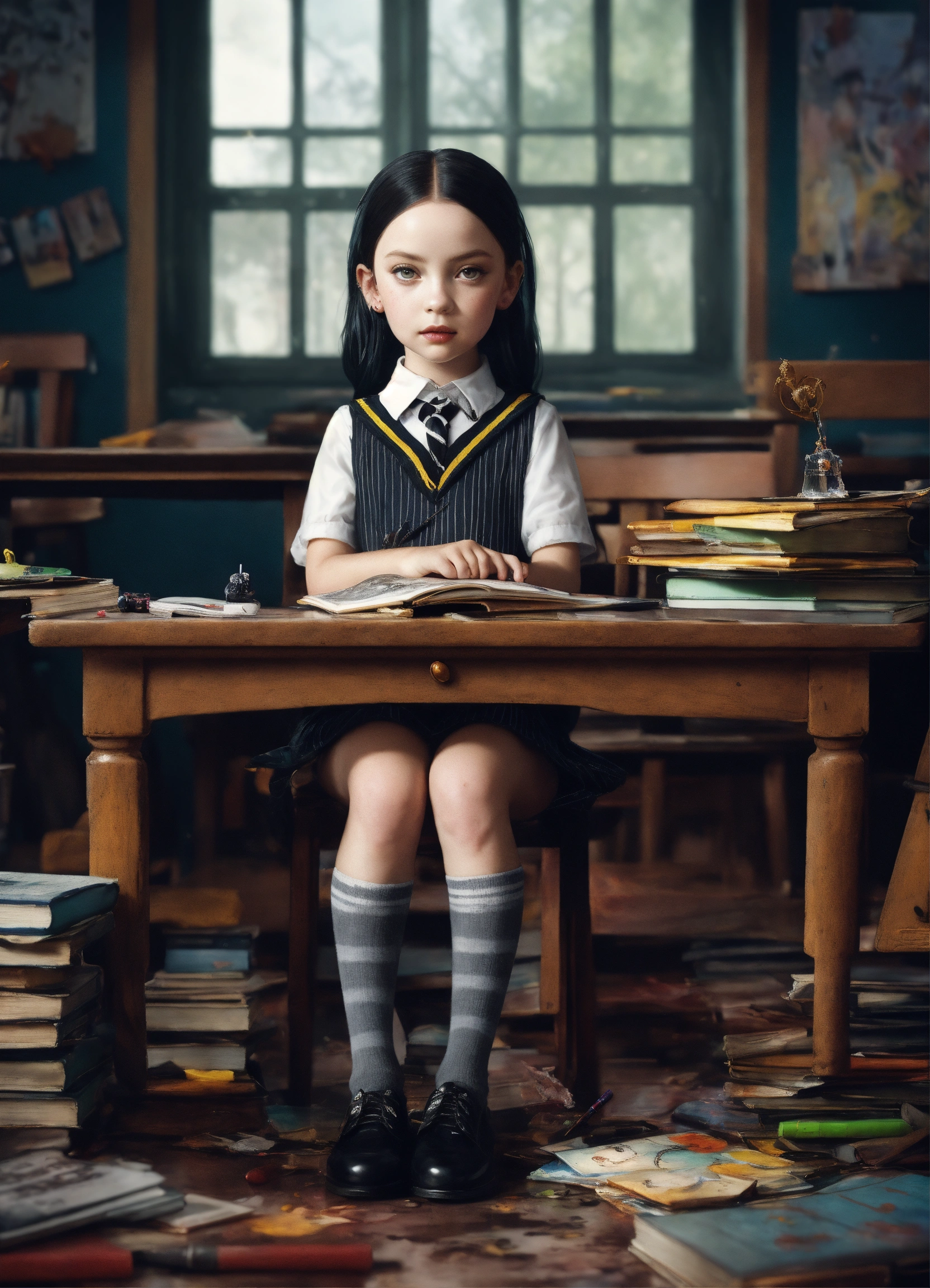 Epic greyscale portrait "adorable chibi wednesday addams in school uniform", colourful schoolyard, epic, breathtaking fantasycore artwork by android jones, jean baptiste monge, alberto seveso, erin hanson, jeremy mann. intricate photography, a masterpiece, 64k resolution artstation, unreal engine 5, cgsociety, octane, perfect compostion, epic natural lighting a whimsical hairy monster sitting at a school desk, perfect composition, whimsical, adorable, artstation, atmospheric, hdr, trending on artstation, wlop, polychromatic colors, high contrast, detailed, arthur rackham, jean baptiste monge, alberto seveso, erin hanson, jeremy mann, android jones