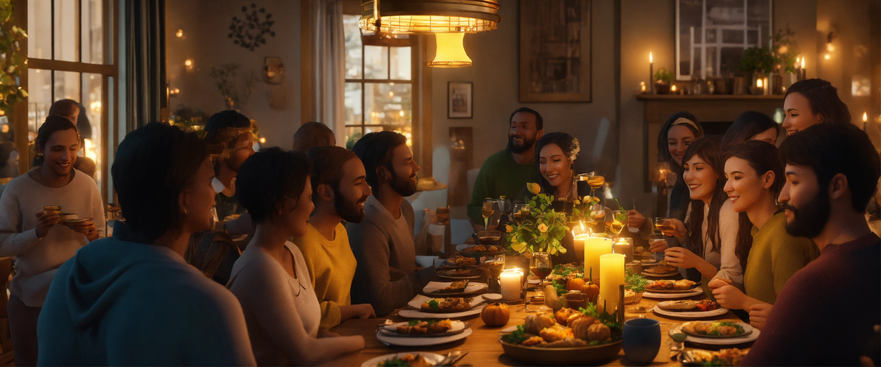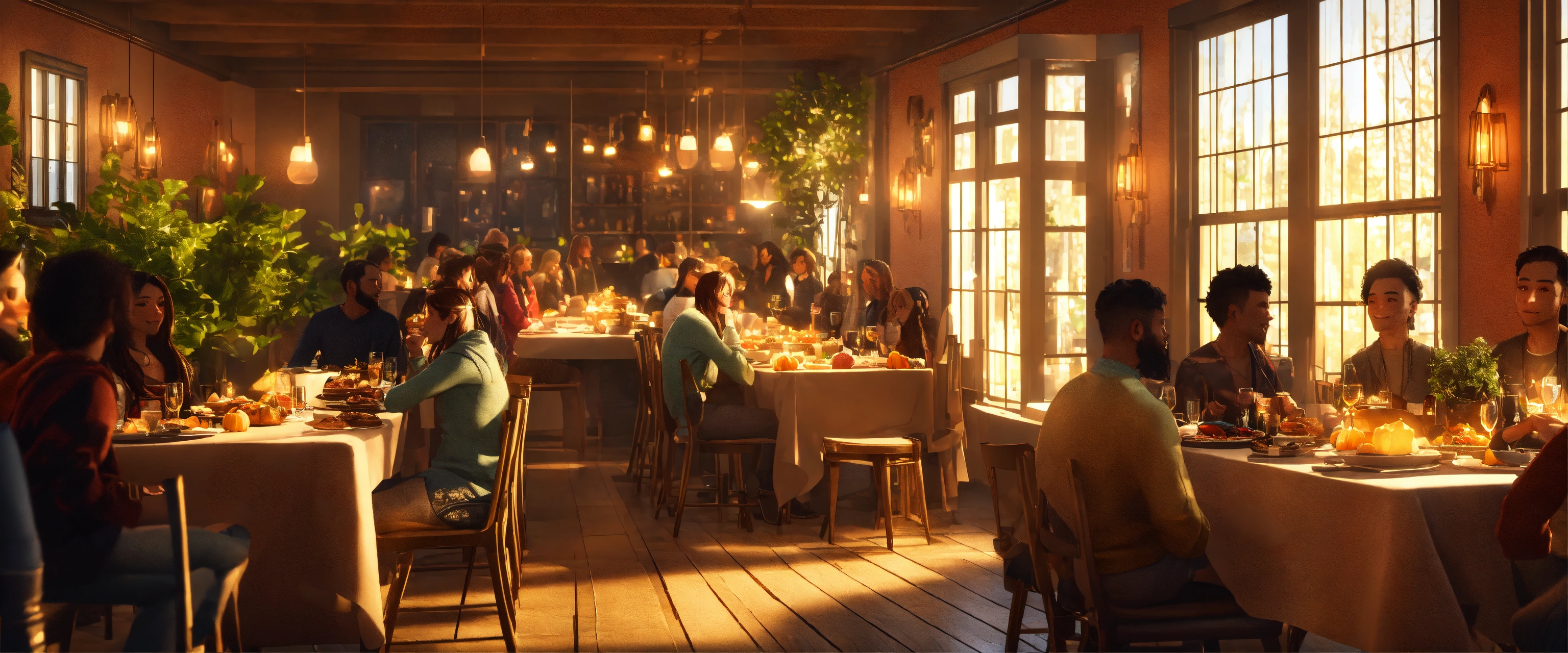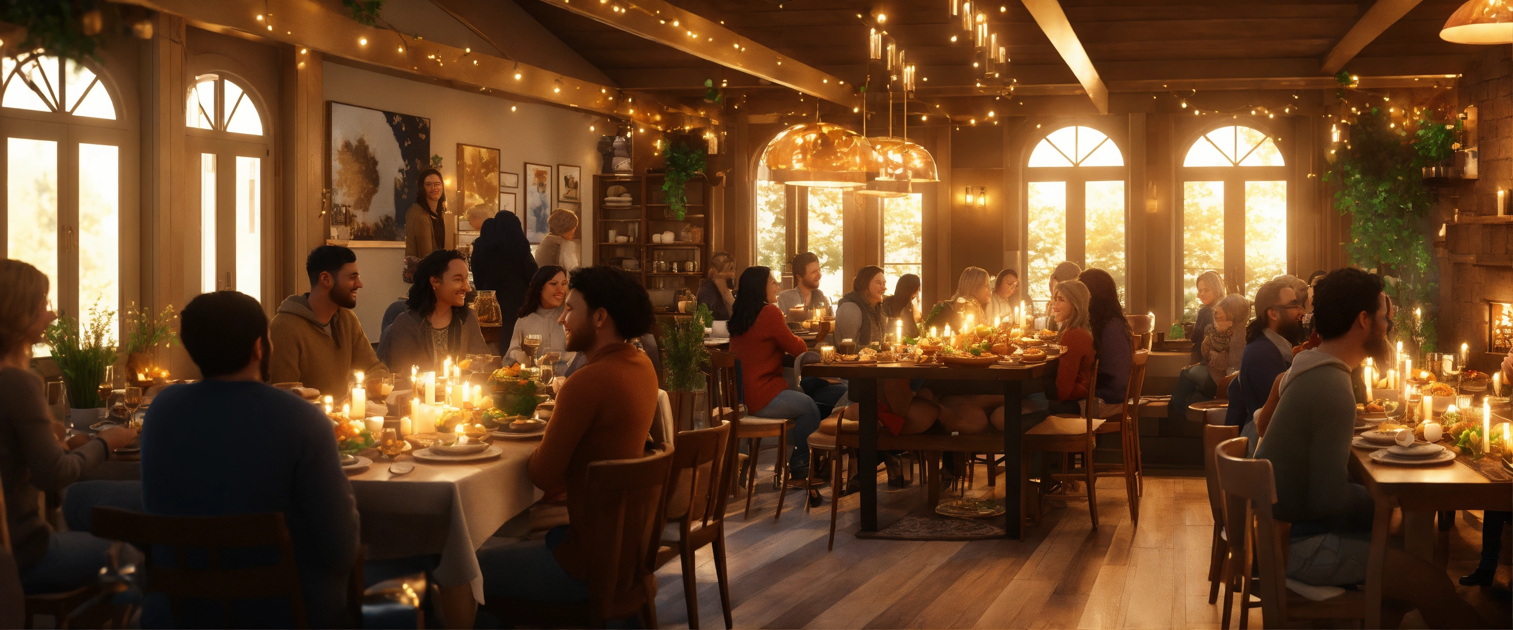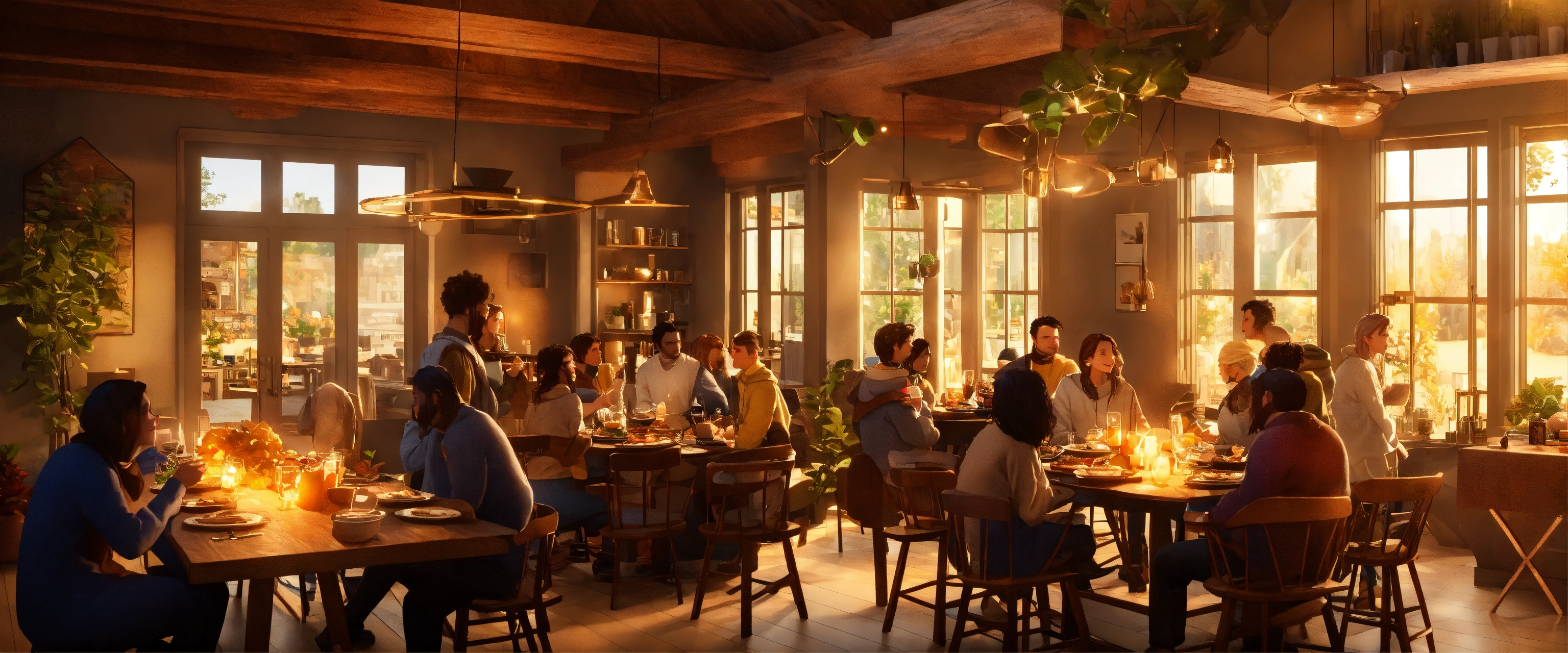 Casual multi-ethnic community, large gathering of good friends in cozy hygge style home cafe, eating dining together in thanksgiving-like scenario and dinner room with lots of detail, with golden lighting, with many people in the style of 3d generated ai digital art from midjourney, high resolution, highly detailed, 4k resolution, good natural golden lighting